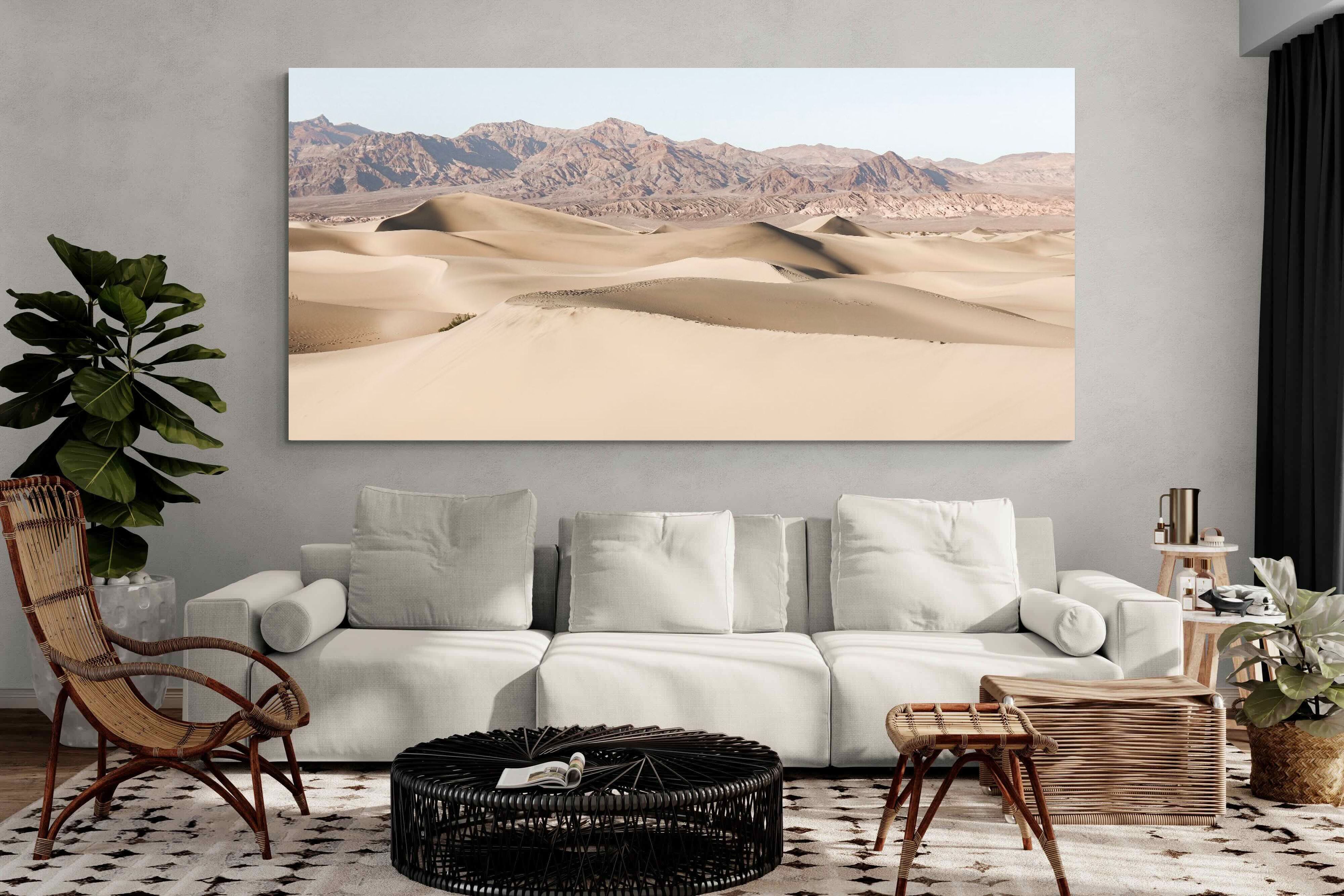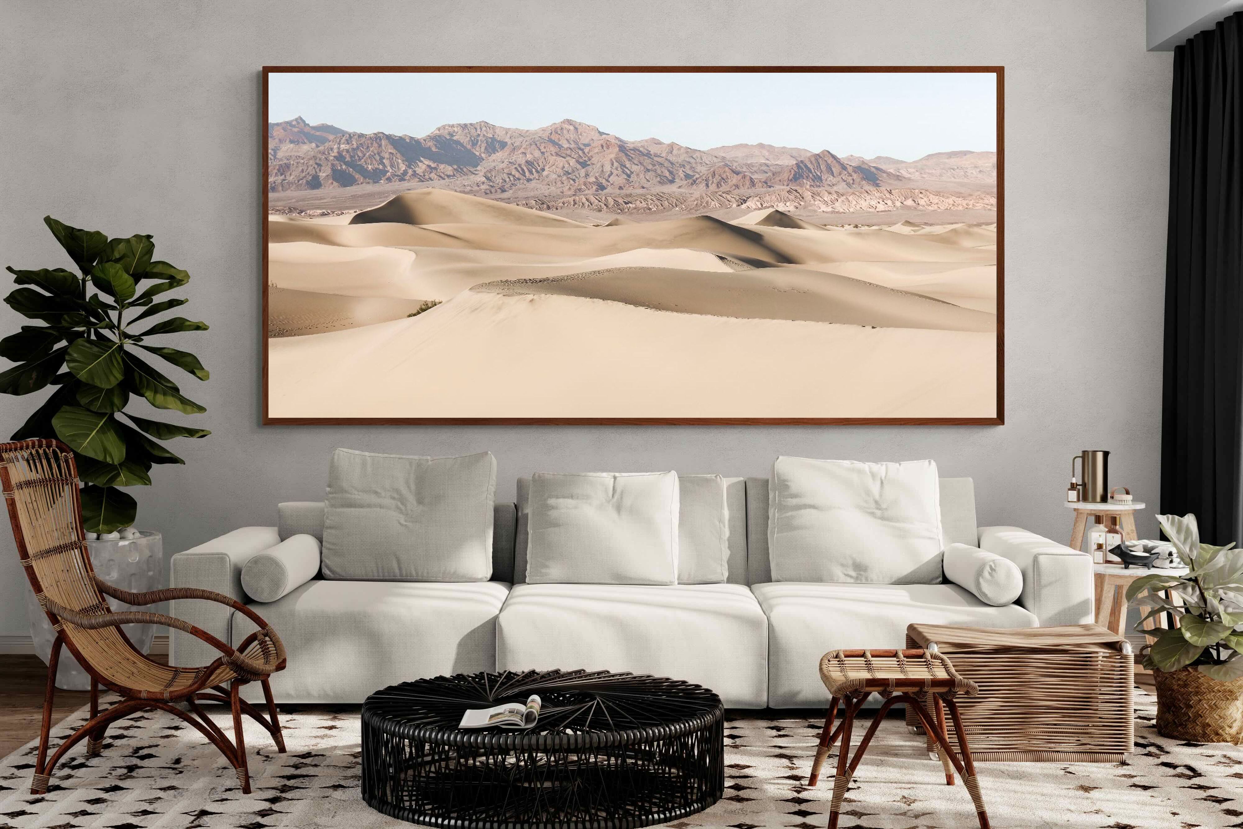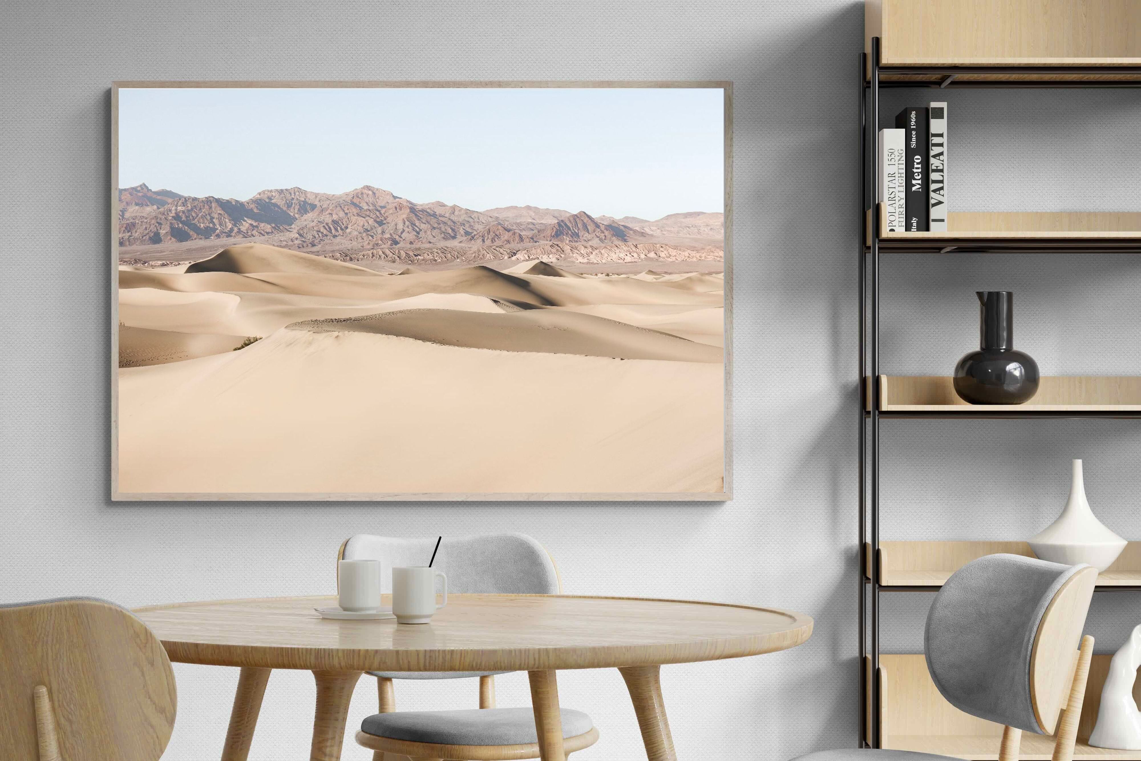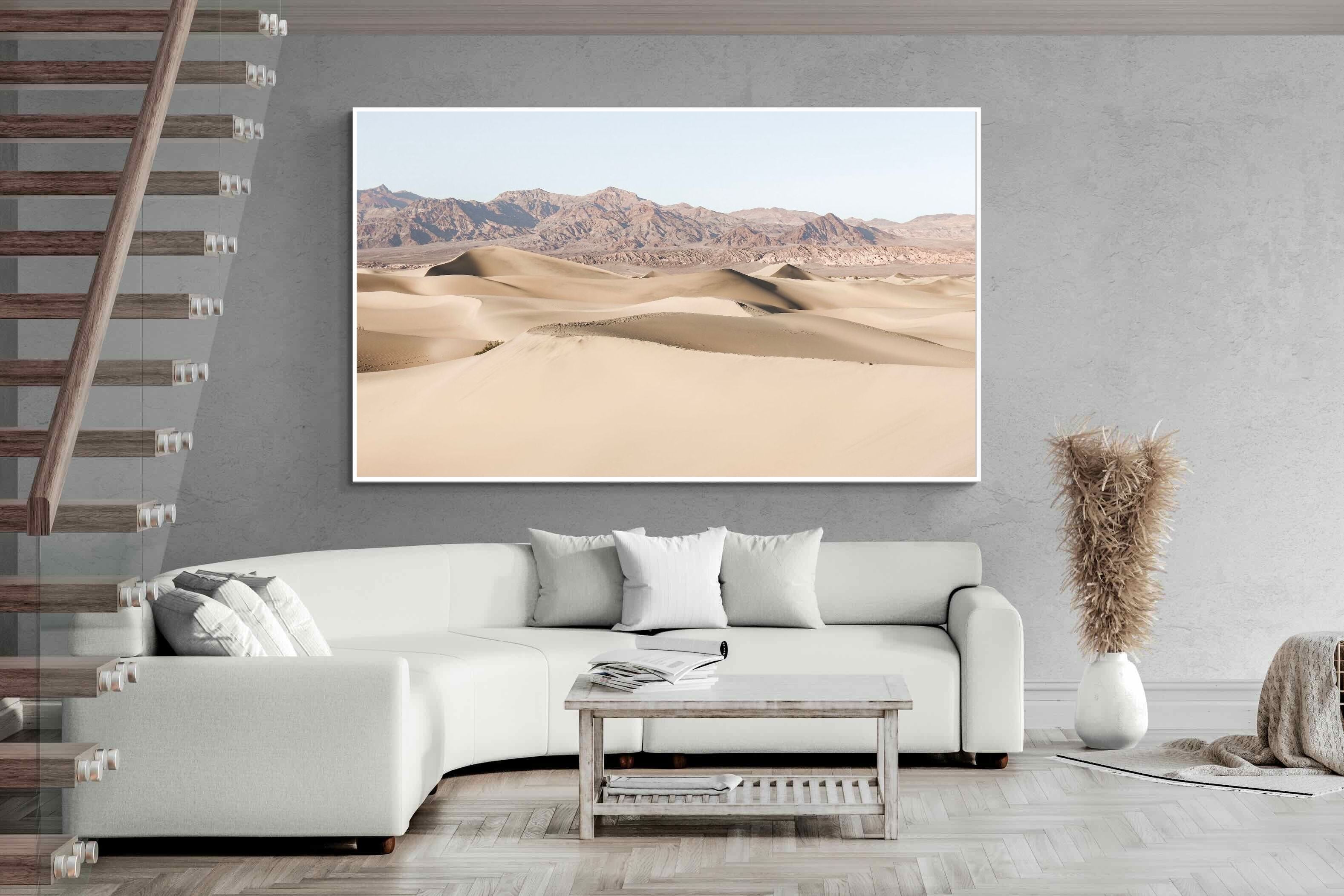 Rolling sand dunes sweep across the foreground, their sculptural curves set against distant mountain ridges beneath a clear sky. The restrained palette of beige, taupe and muted stone creates a calming, architectural aesthetic with strong negative space. Perfect for minimalist lounges, modern offices or neutral-toned interiors, this piece adds depth and quiet drama. Its simplicity allows it to anchor a room without overwhelming surrounding décor.