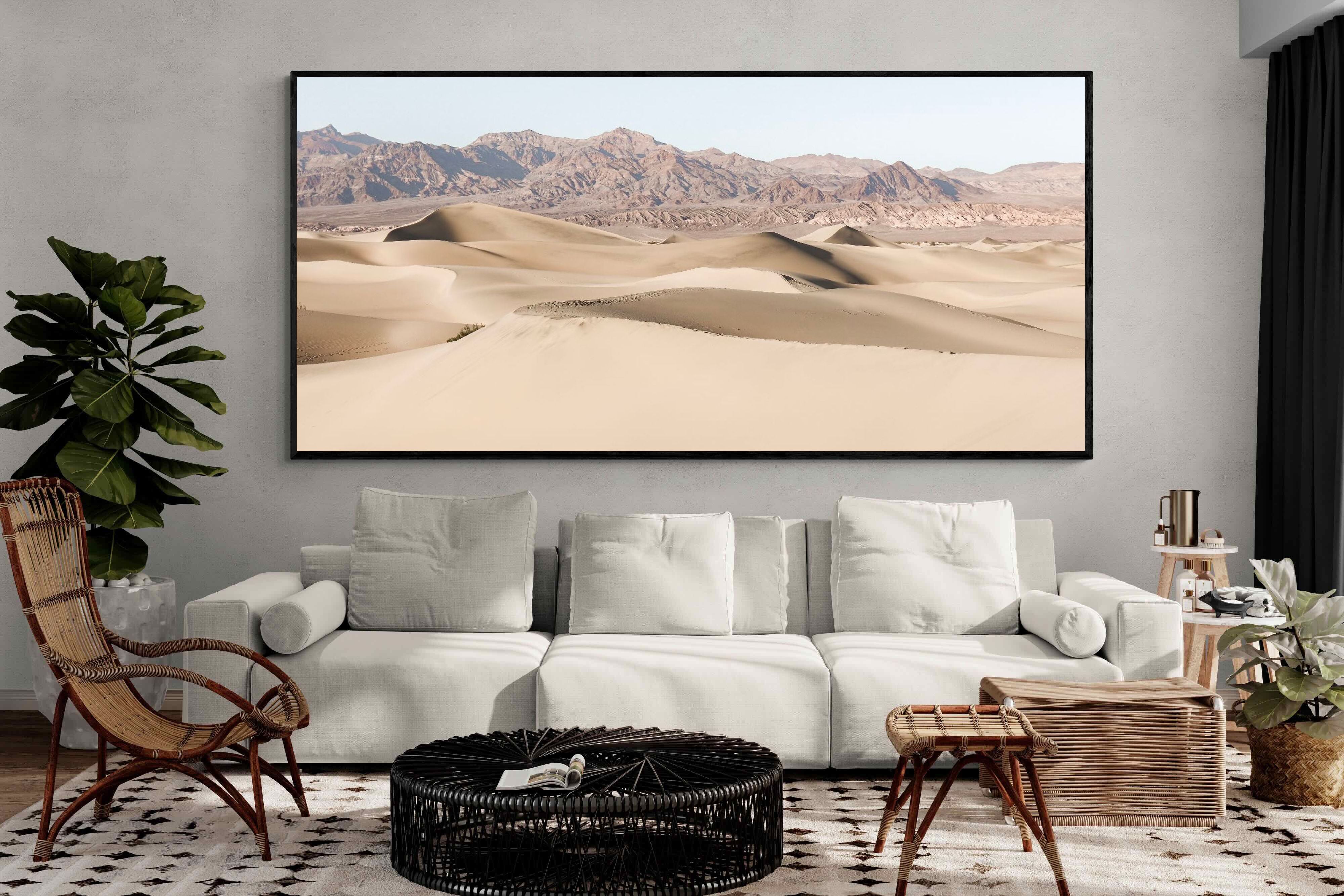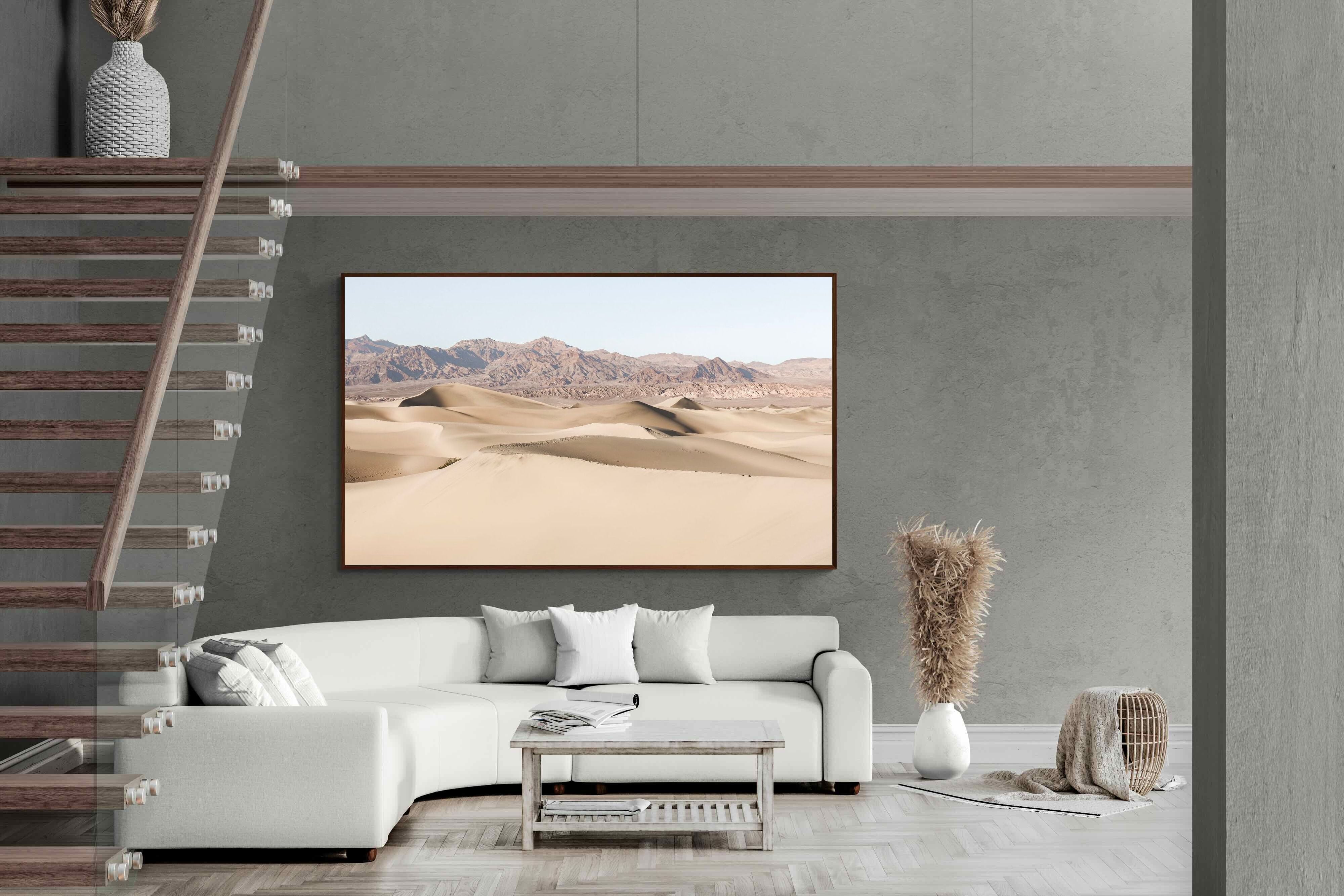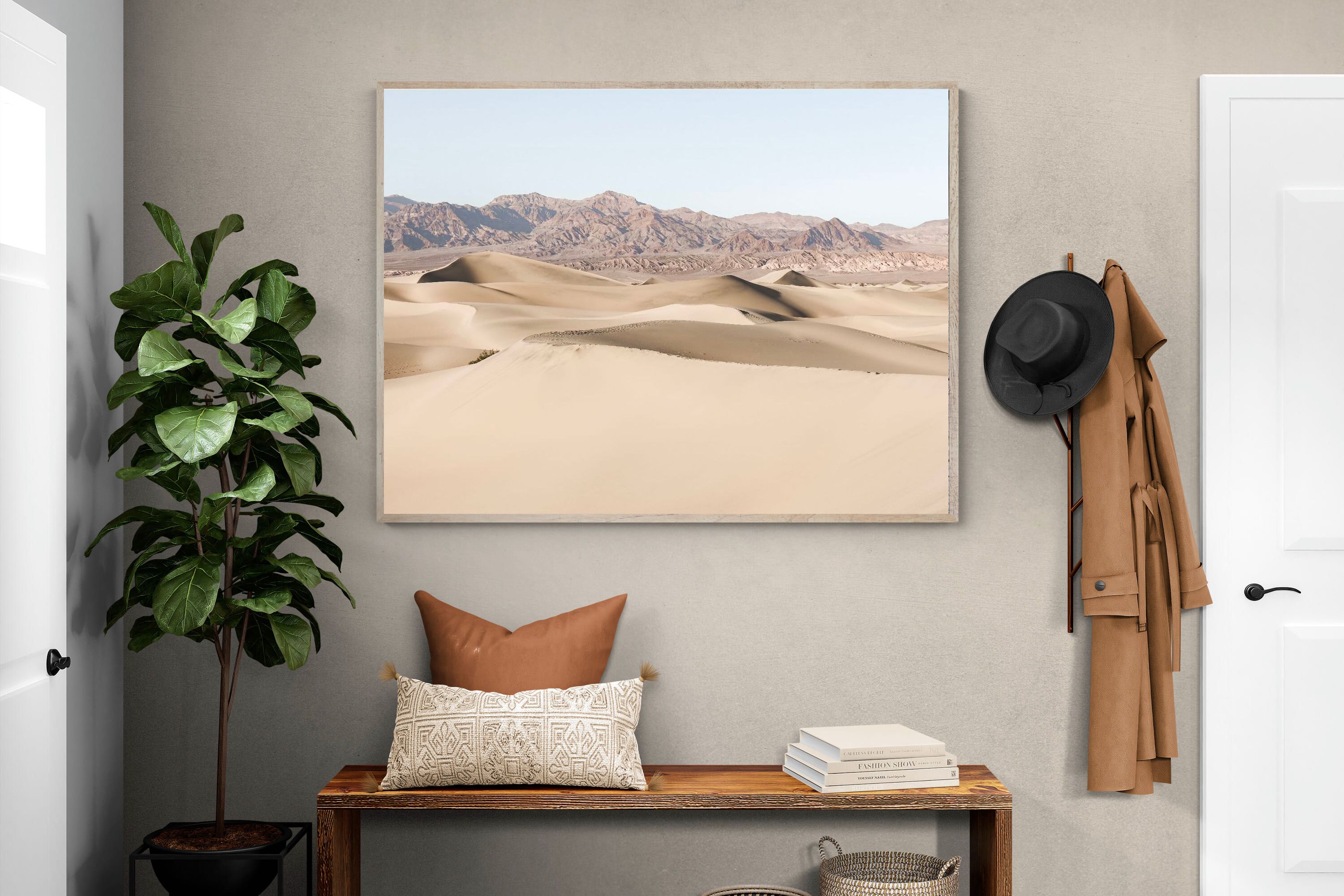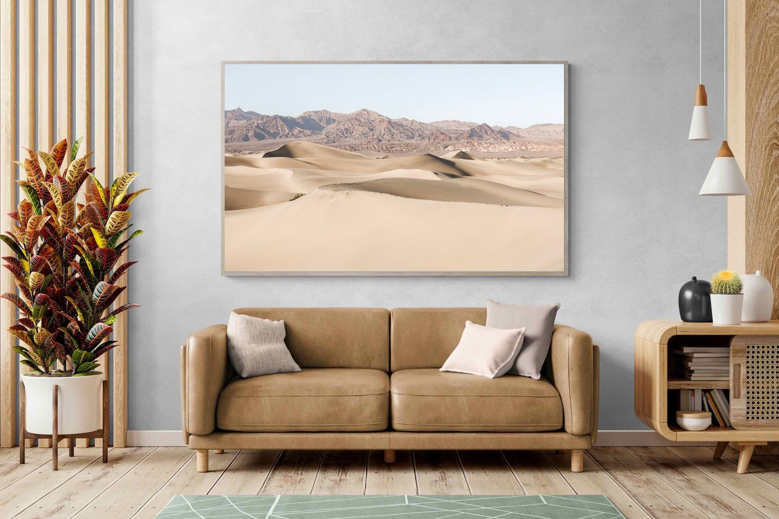 Rolling sand dunes sweep across the foreground, their sculptural curves set against distant mountain ridges beneath a clear sky. The restrained palette of beige, taupe and muted stone creates a calming, architectural aesthetic with strong negative space. Perfect for minimalist lounges, modern offices or neutral-toned interiors, this piece adds depth and quiet drama. Its simplicity allows it to anchor a room without overwhelming surrounding décor.