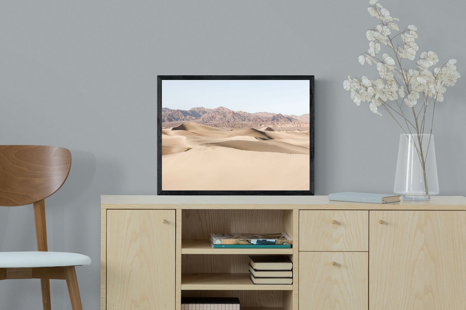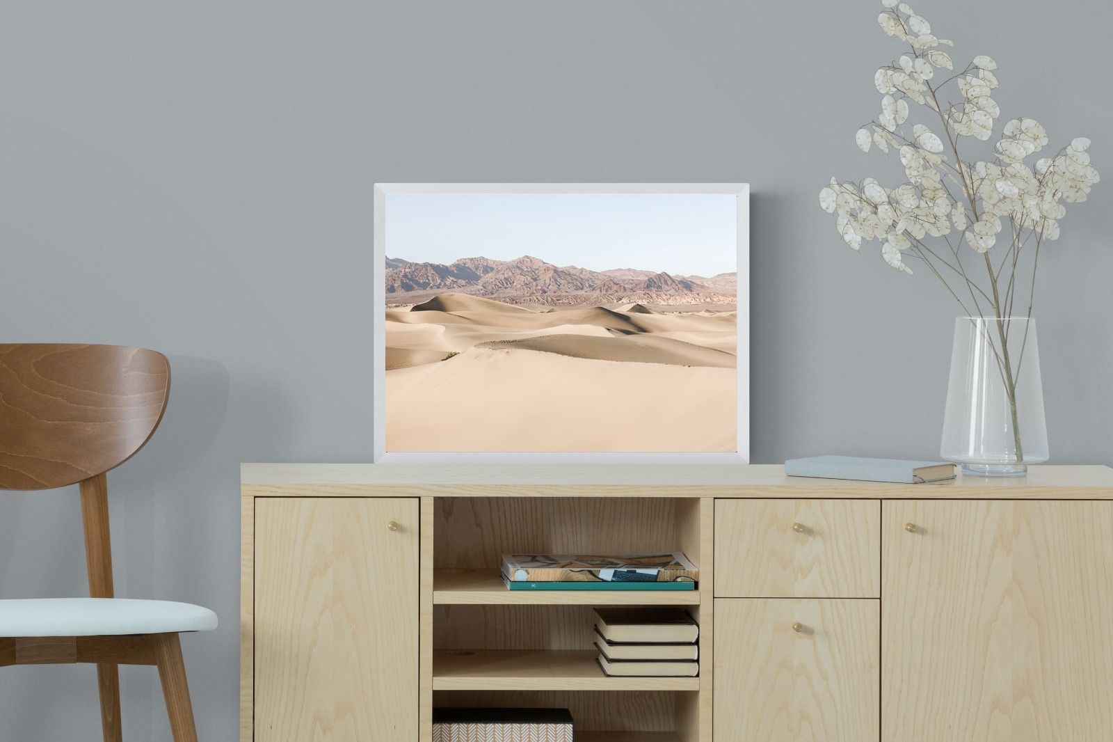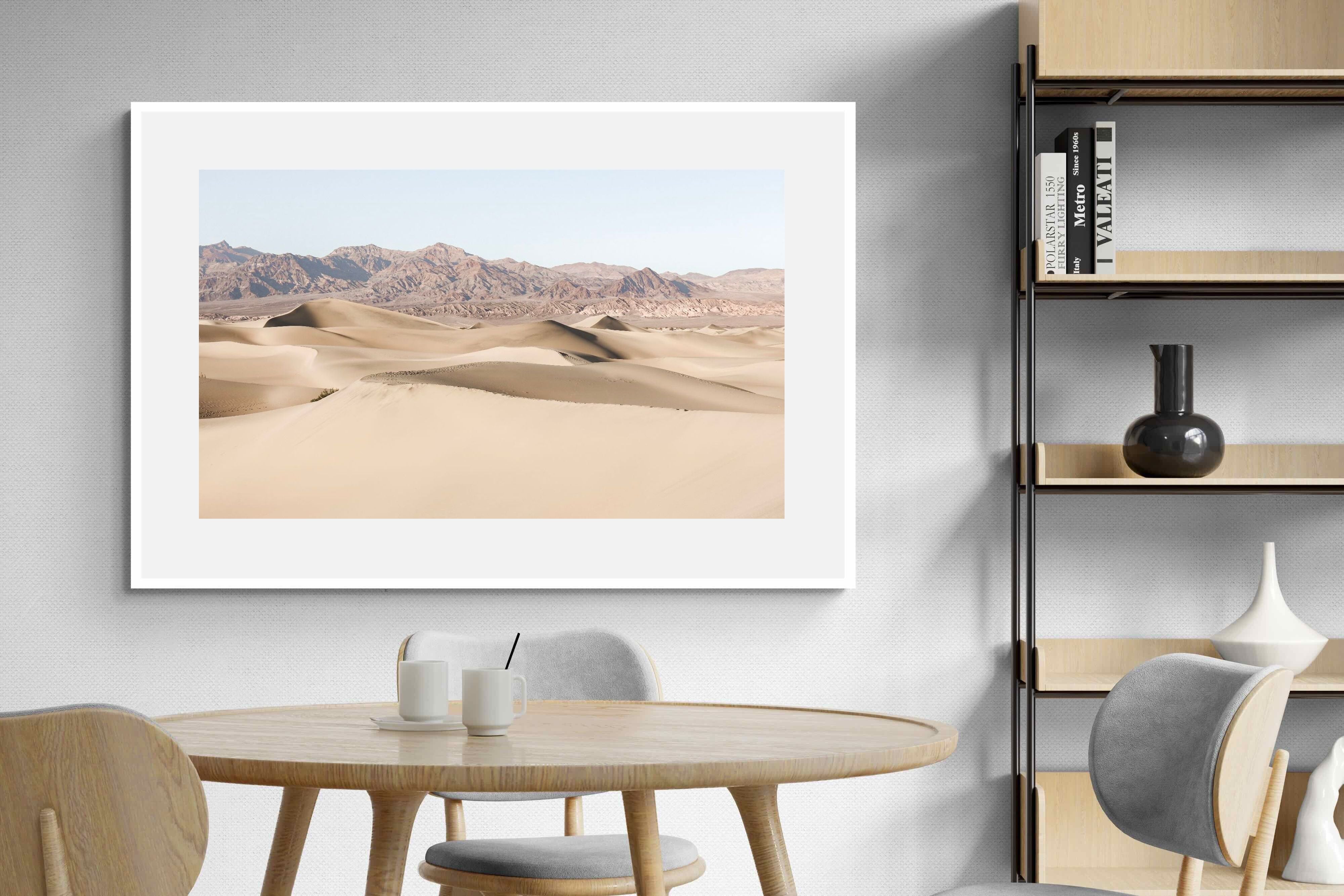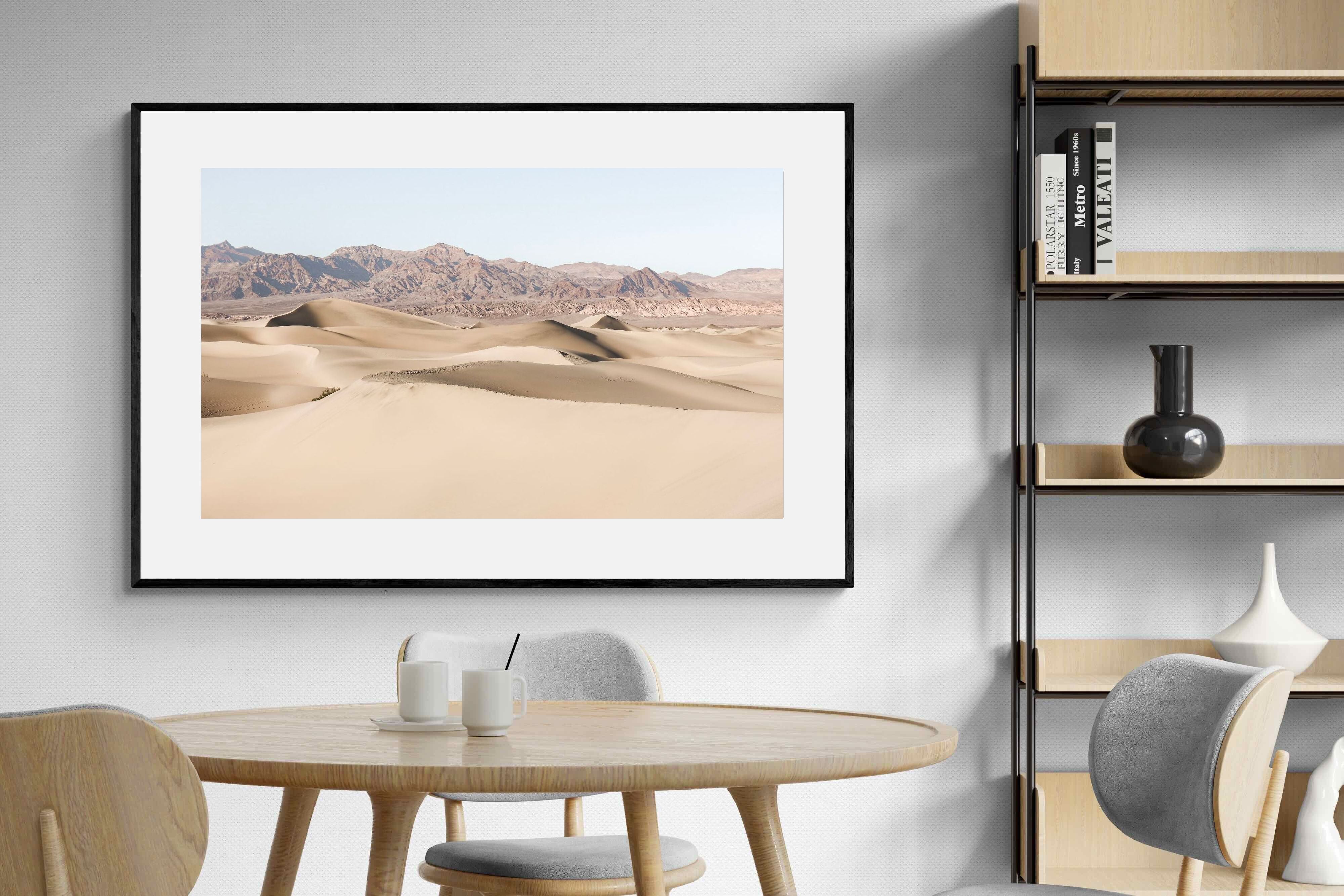 Rolling sand dunes sweep across the foreground, their sculptural curves set against distant mountain ridges beneath a clear sky. The restrained palette of beige, taupe and muted stone creates a calming, architectural aesthetic with strong negative space. Perfect for minimalist lounges, modern offices or neutral-toned interiors, this piece adds depth and quiet drama. Its simplicity allows it to anchor a room without overwhelming surrounding décor.