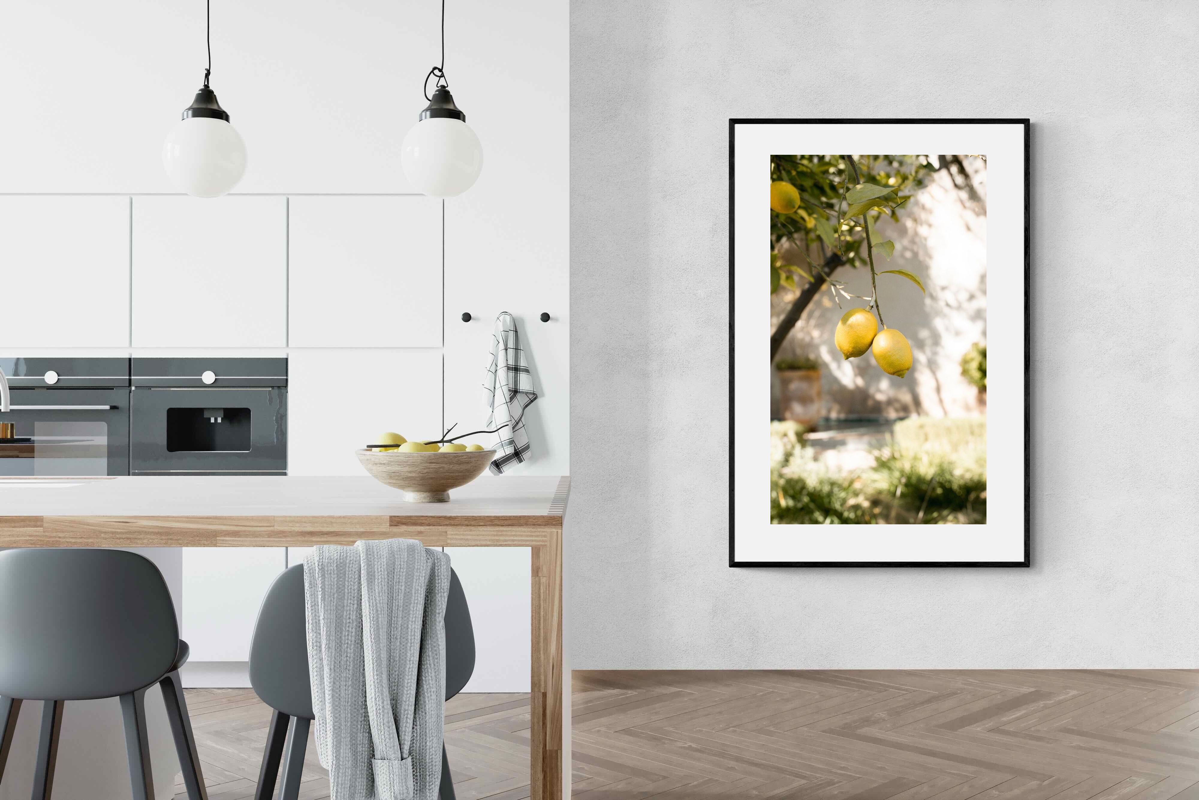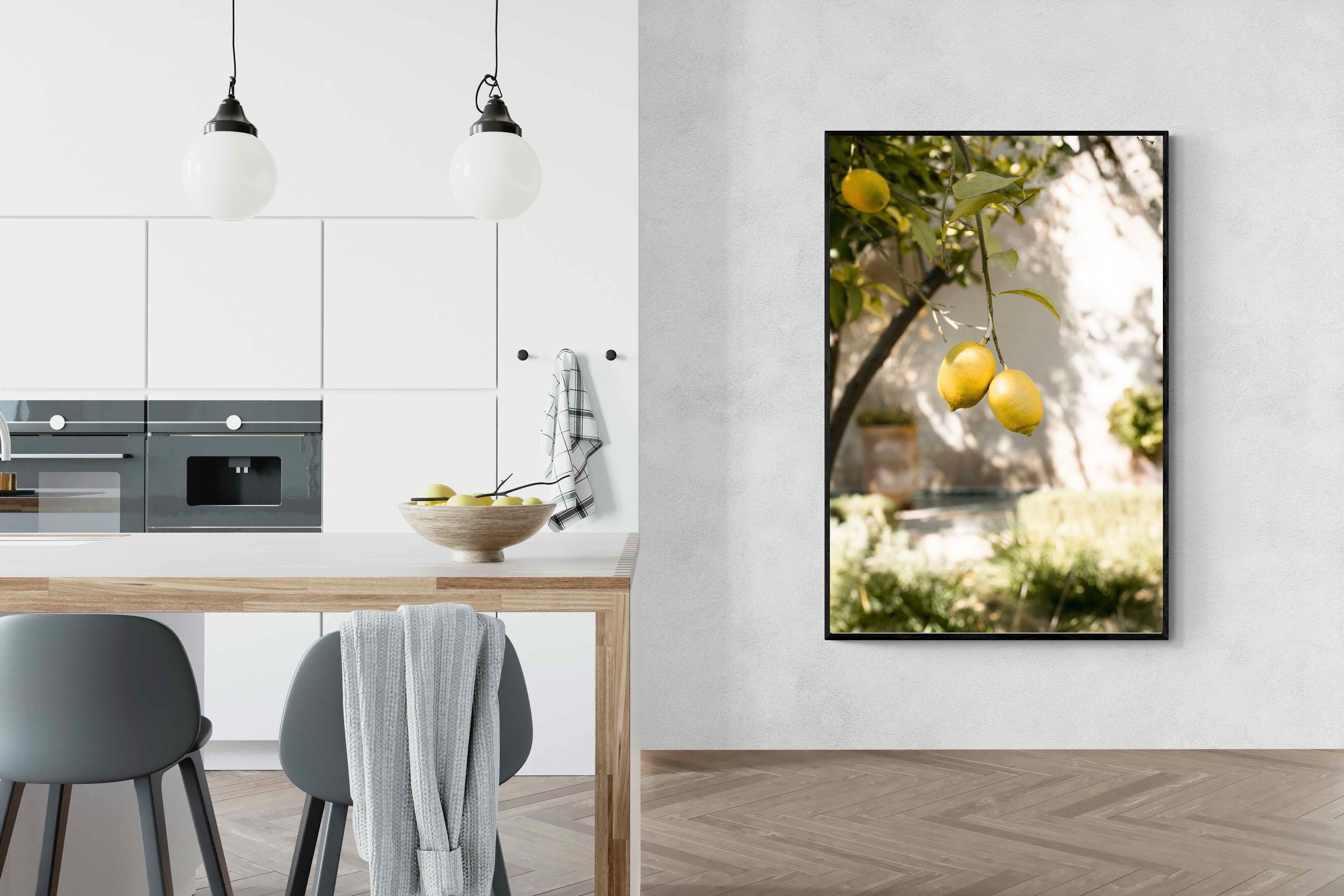 Golden lemons hang from slender branches against a softly blurred Mediterranean garden backdrop. Warm sunlight enhances the vibrant citrus tones while muted plaster walls add balance and depth. The composition feels fresh yet refined, capturing the essence of southern European living. Ideal for kitchens, dining areas or coastal-inspired interiors, this artwork introduces colour, warmth and timeless Mediterranean character.