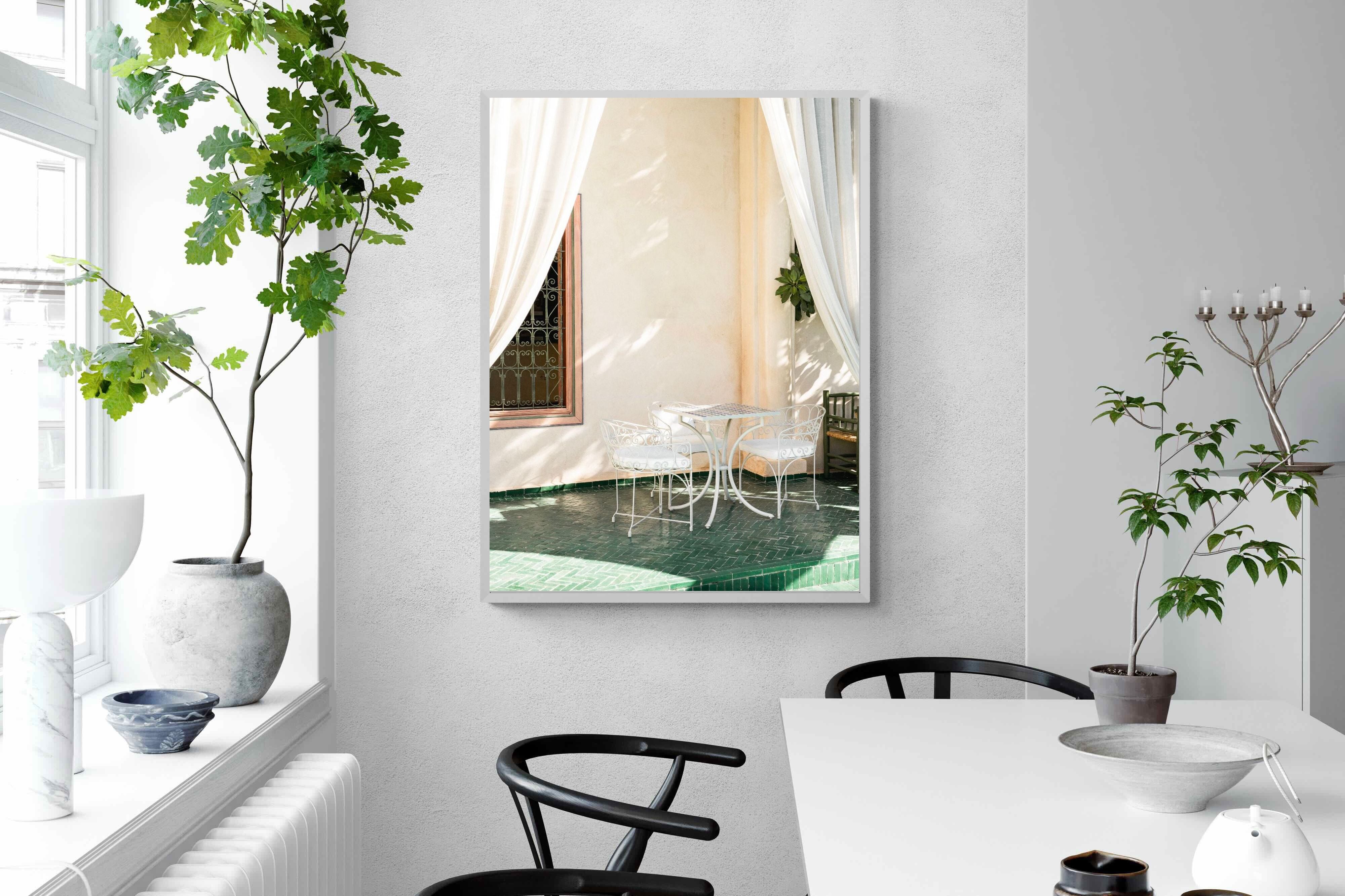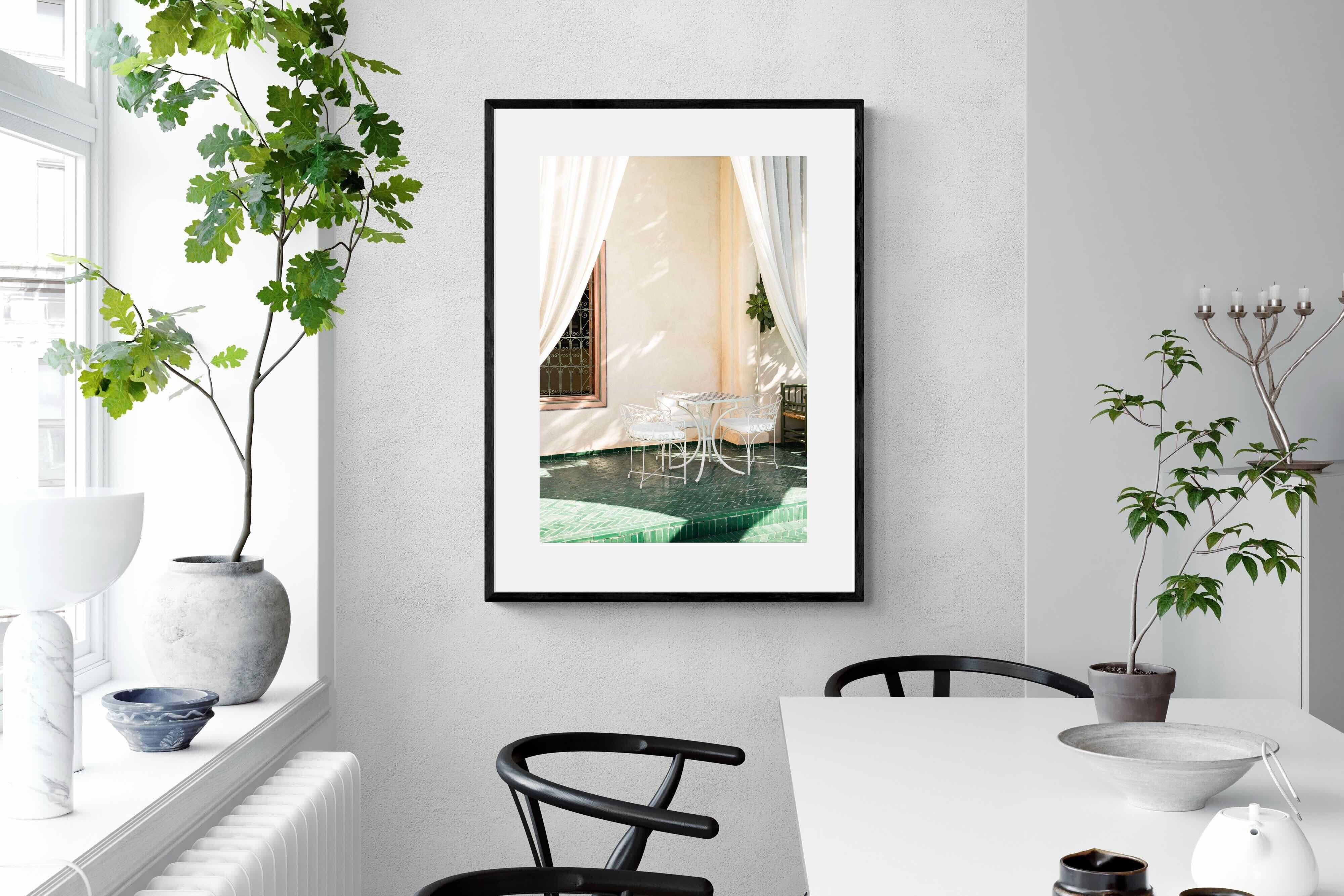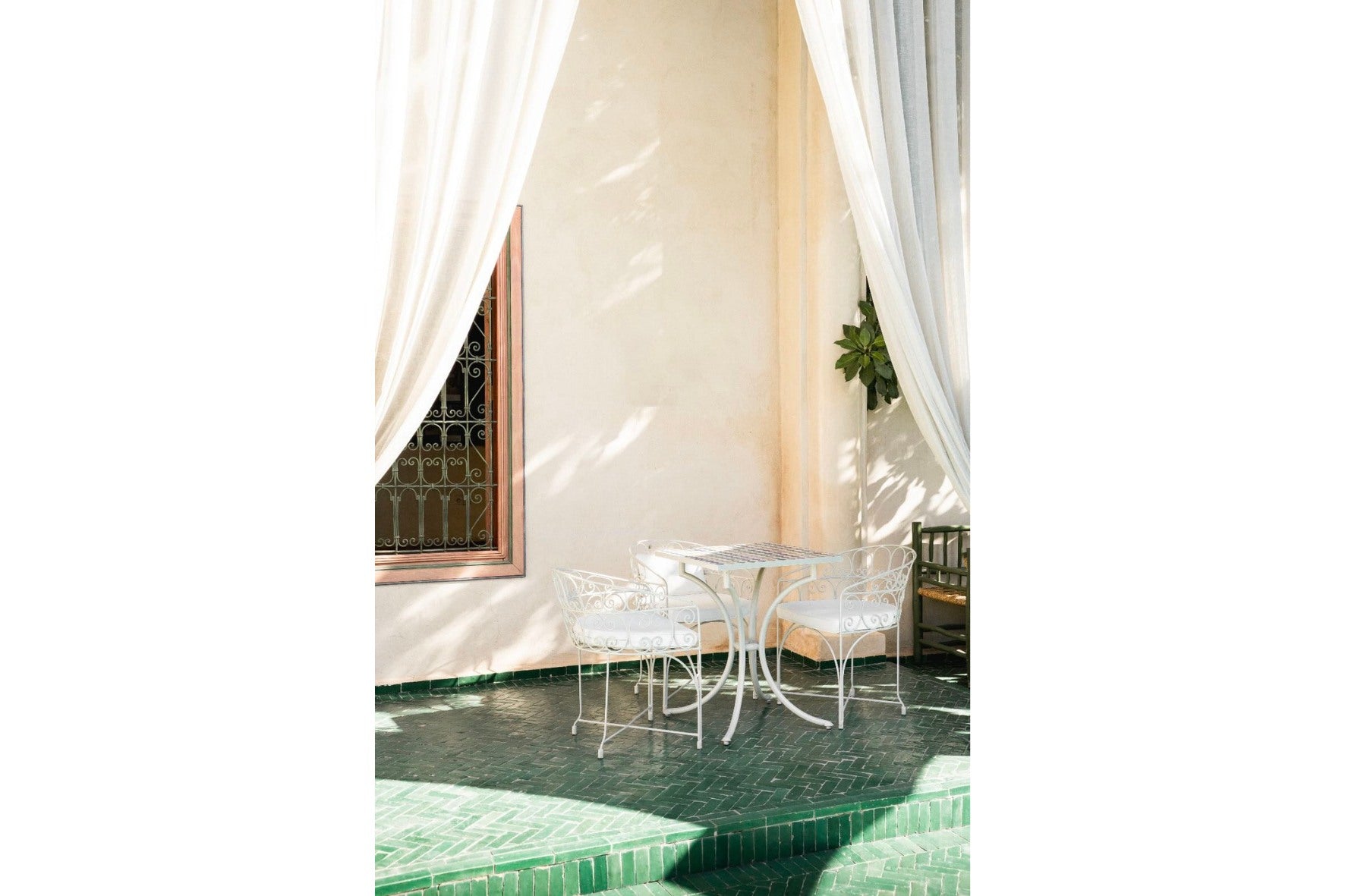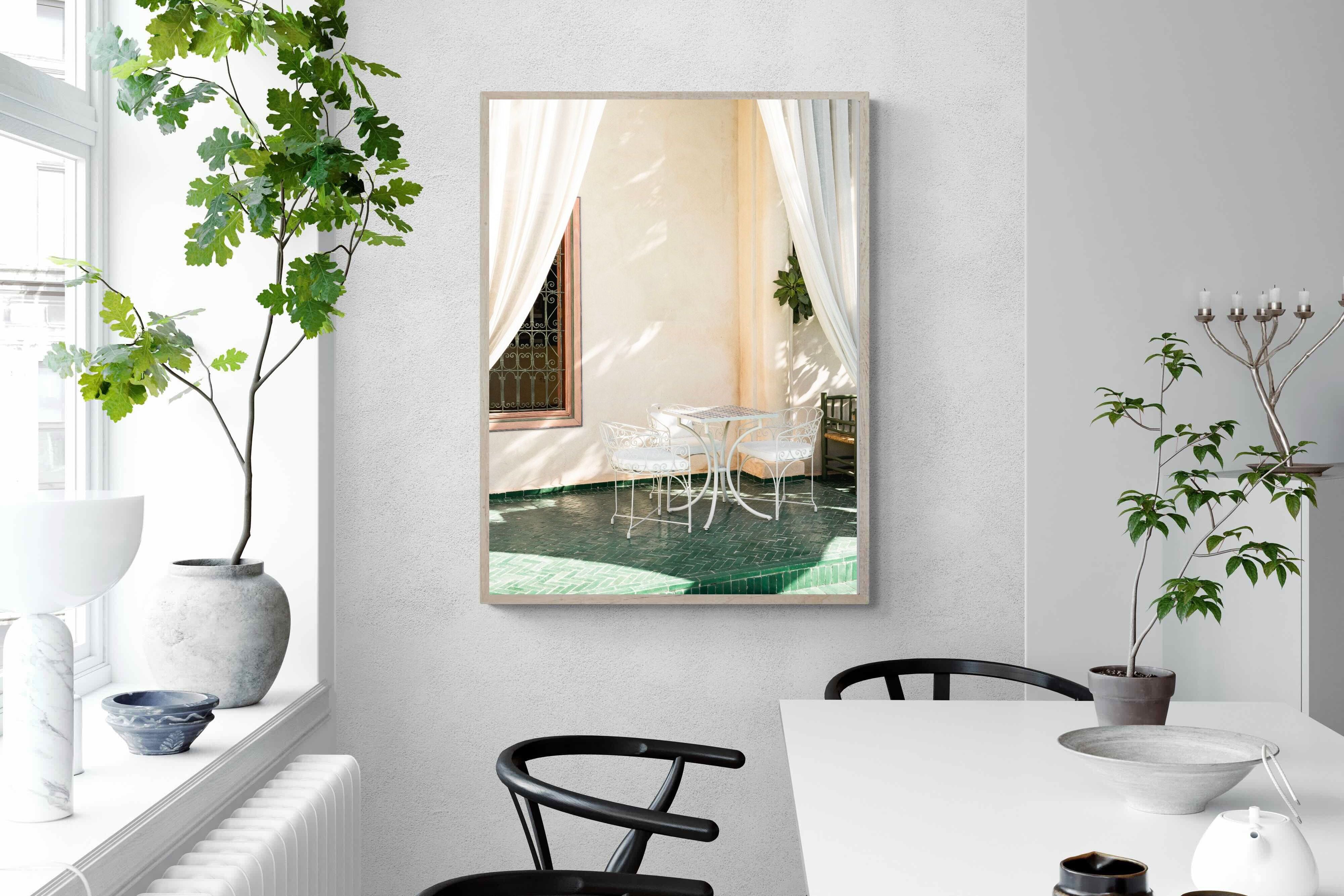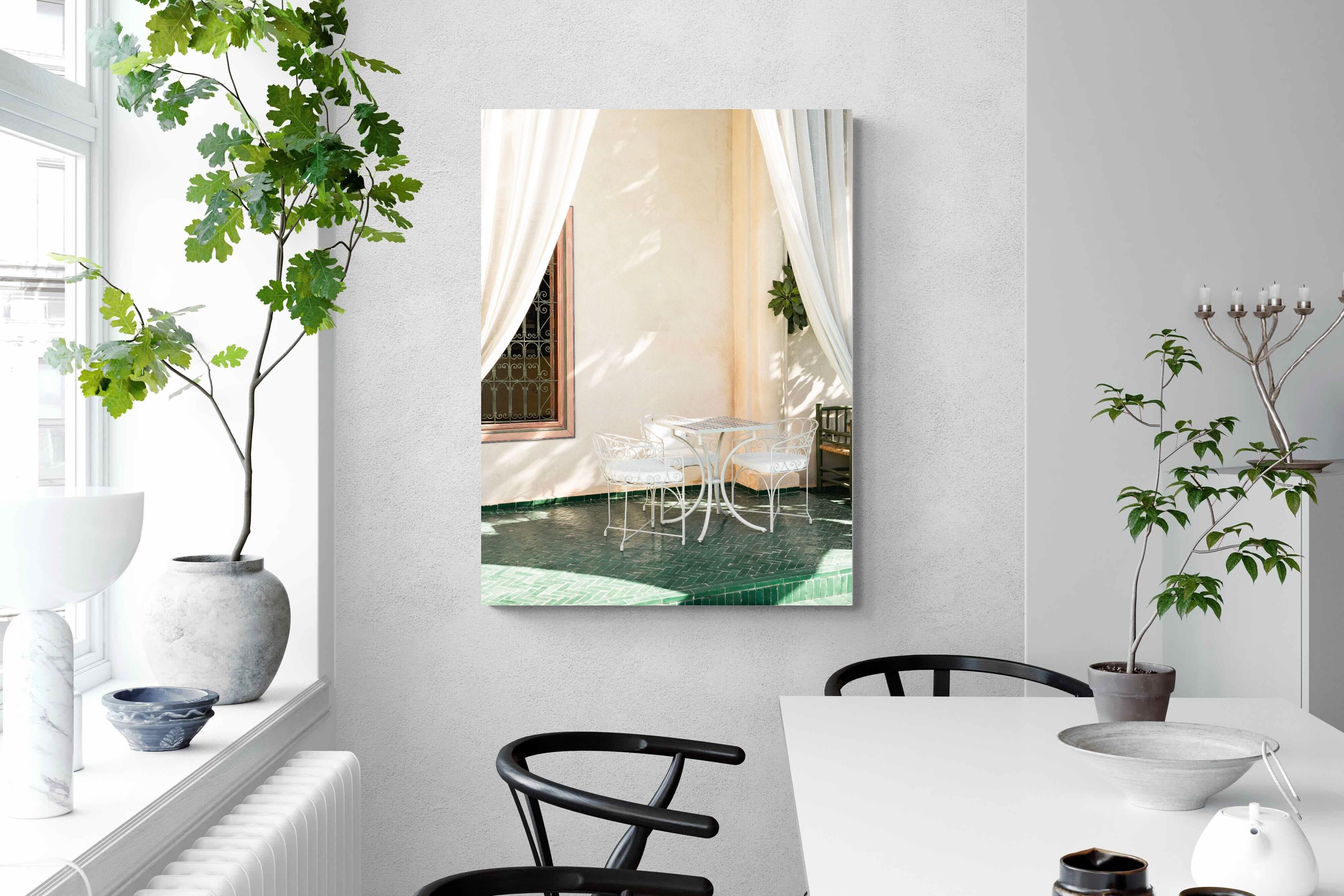 Soft white drapes frame a delicate wrought iron table set against warm plaster walls and deep green tiled floors. Dappled sunlight creates gentle shadows that enhance texture and architectural detail. The restrained palette of cream and green evokes relaxed courtyard living in southern Europe. Perfect for dining areas, kitchens or boutique-style interiors, this piece brings calm sophistication and refined outdoor charm indoors.