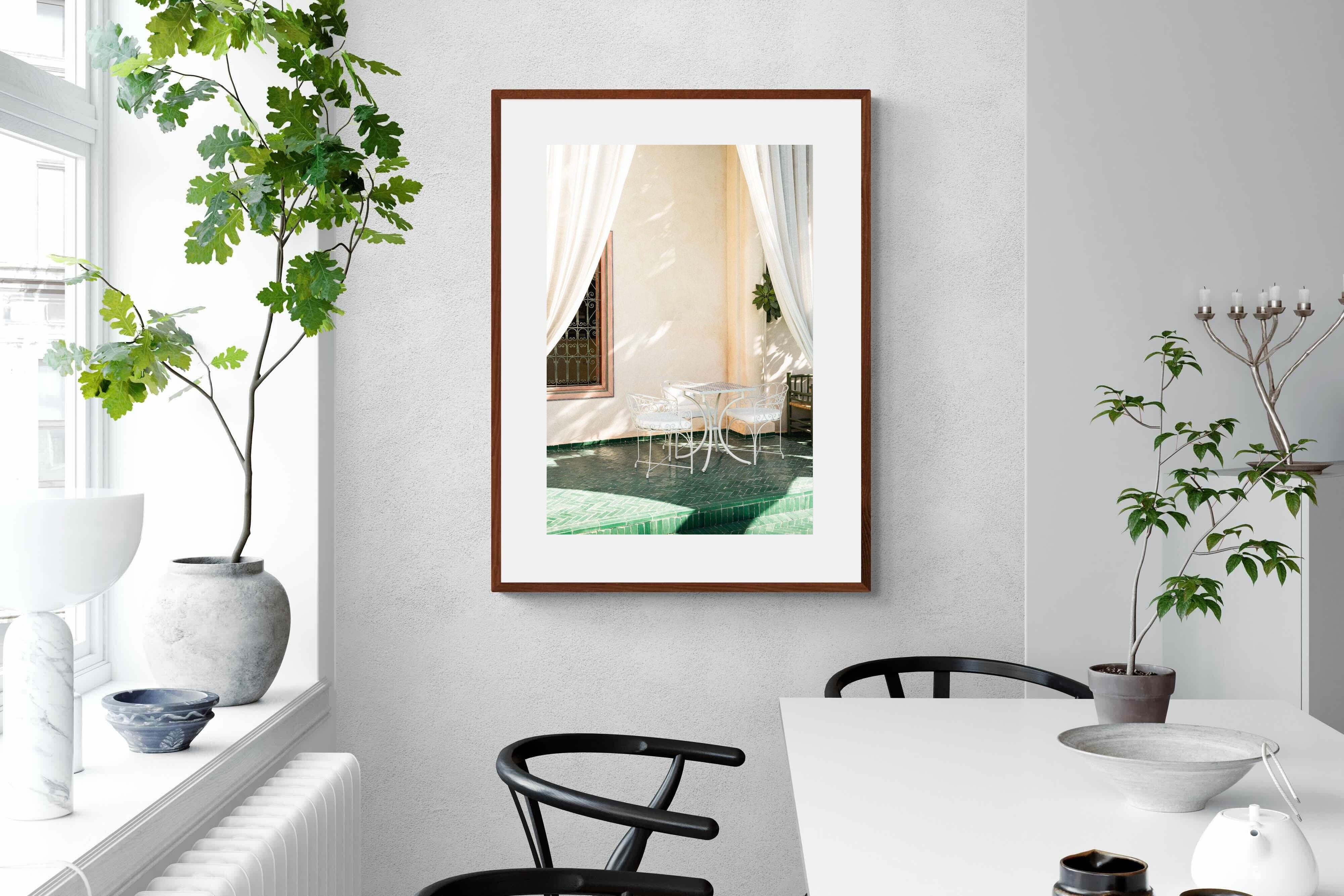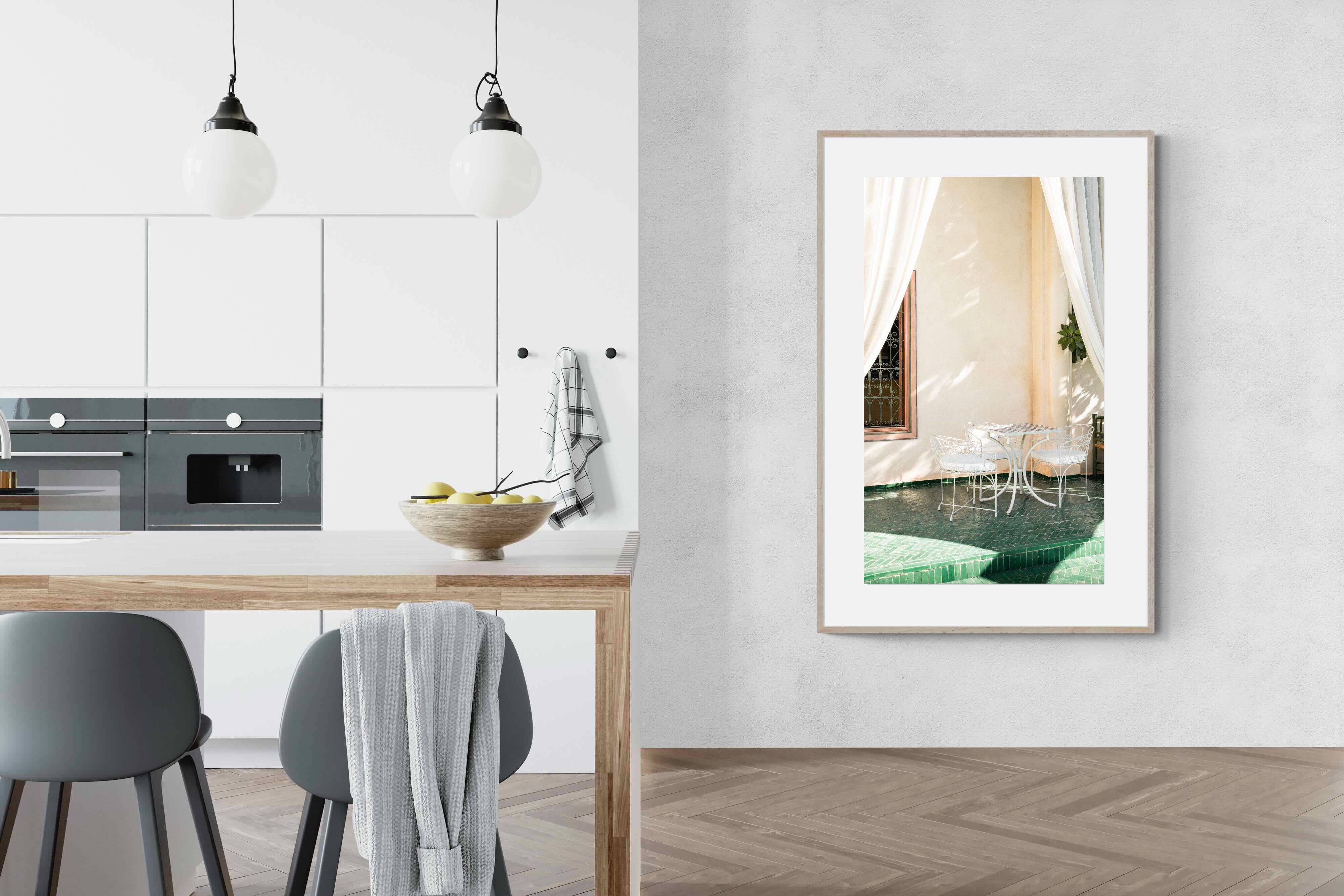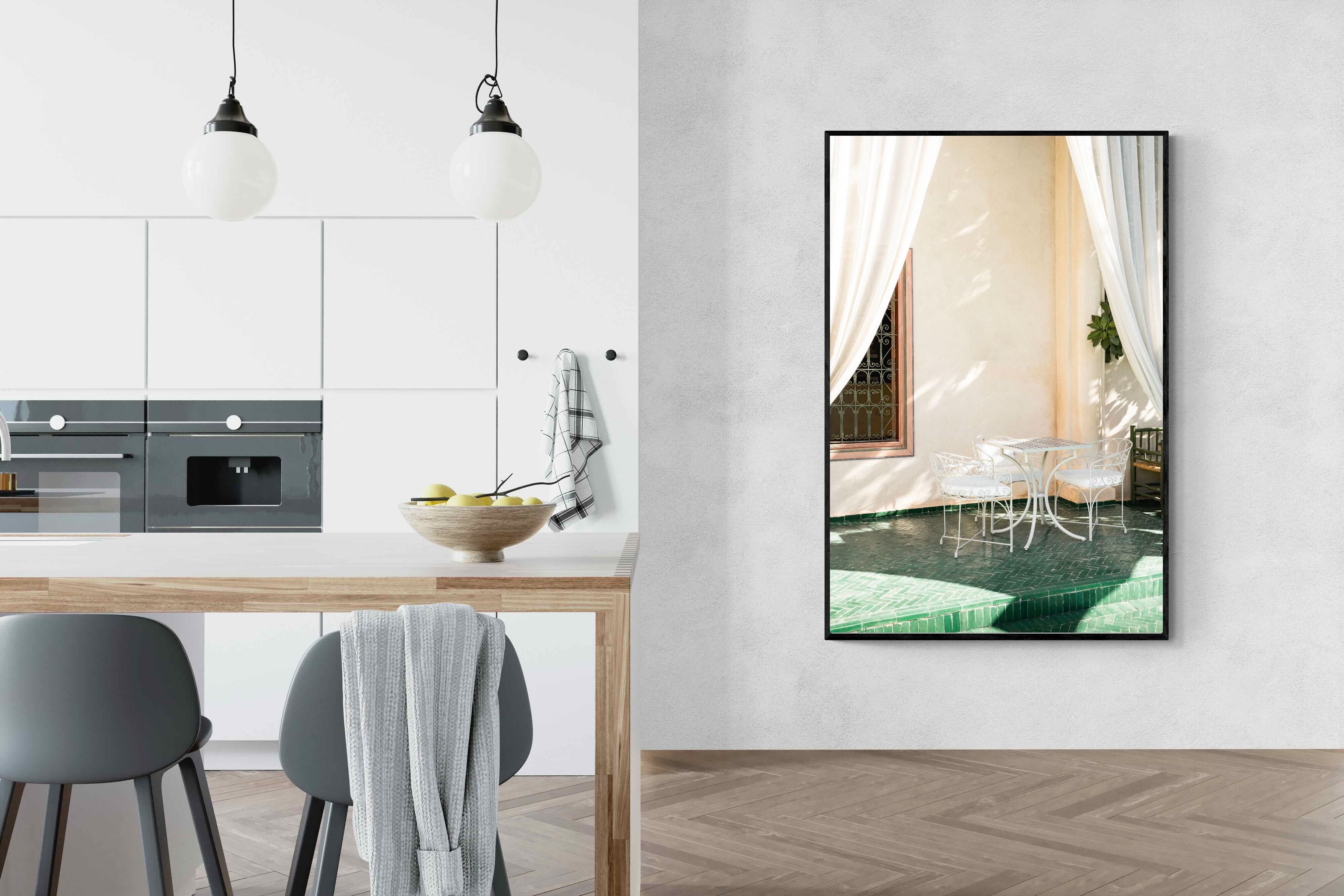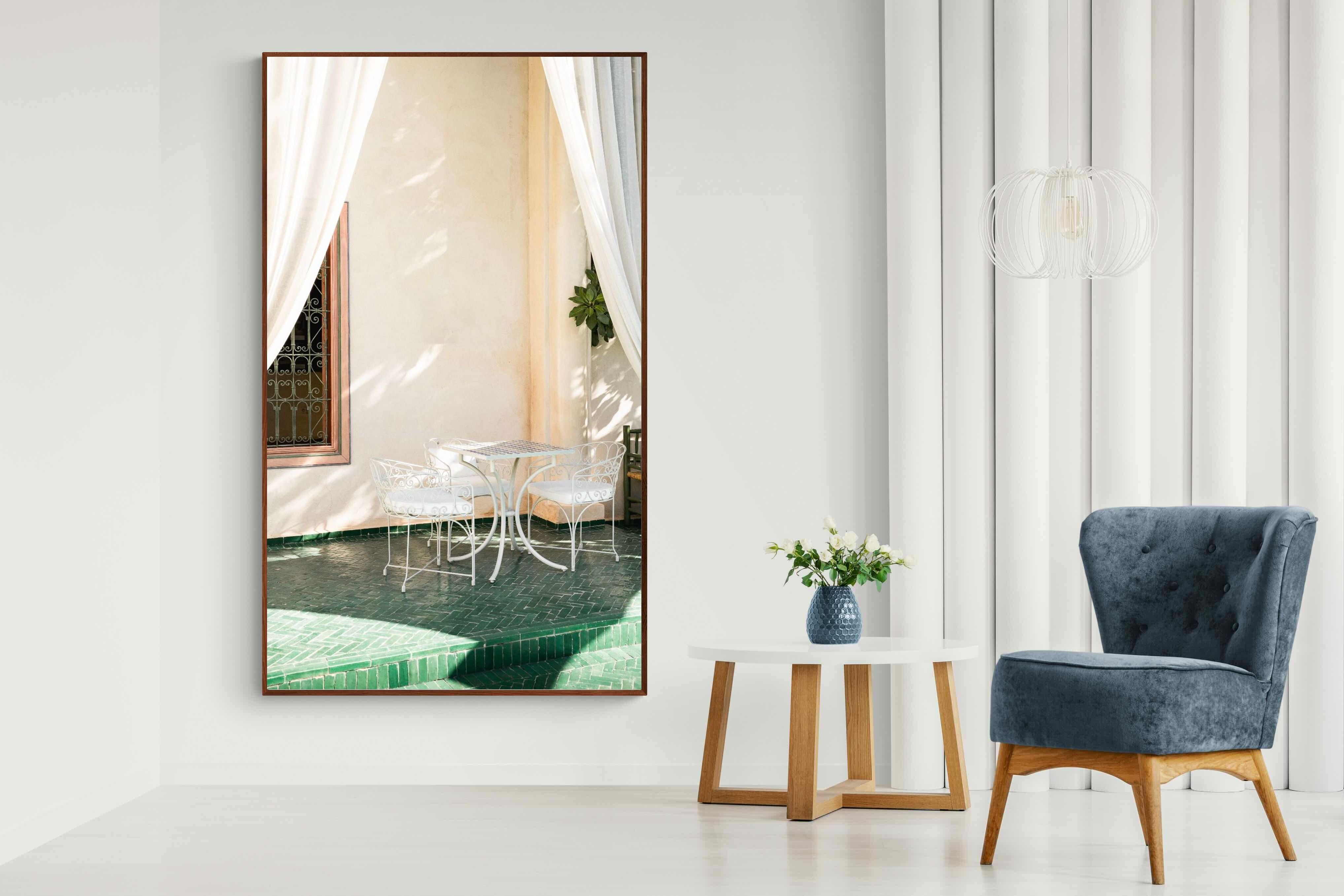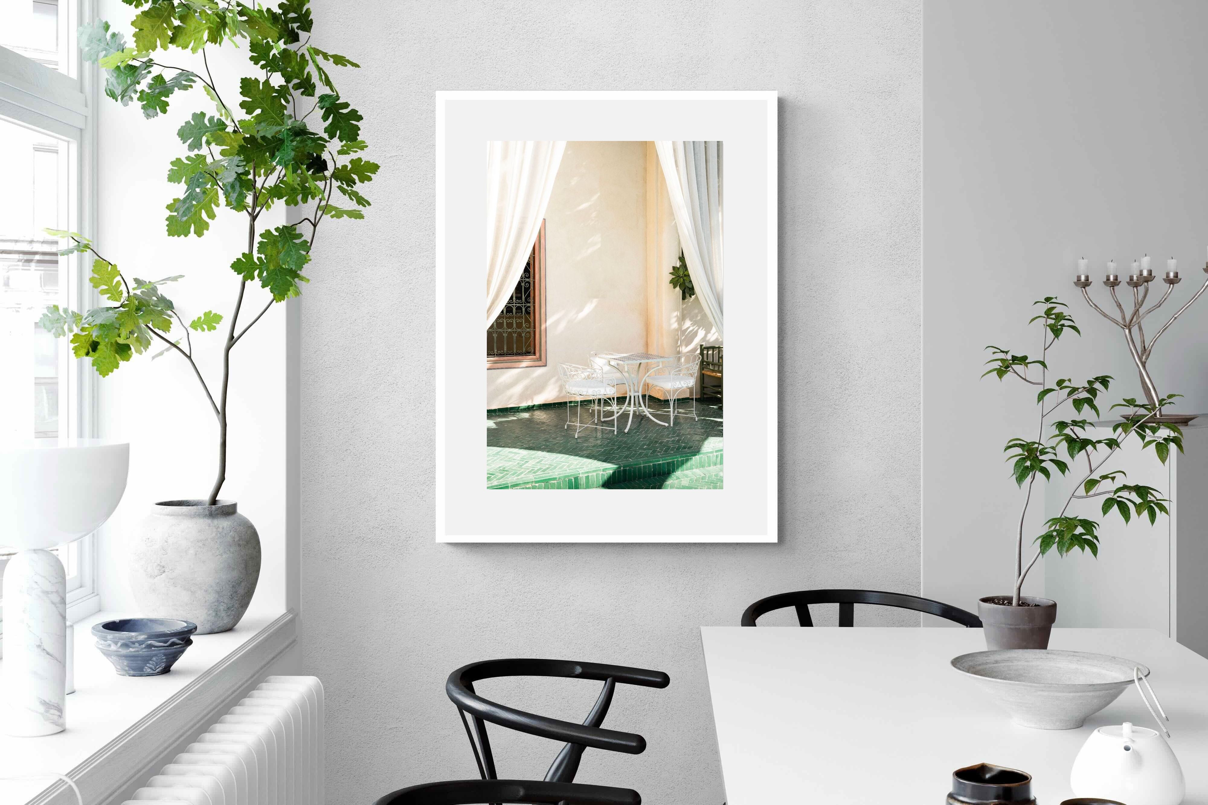 Soft white drapes frame a delicate wrought iron table set against warm plaster walls and deep green tiled floors. Dappled sunlight creates gentle shadows that enhance texture and architectural detail. The restrained palette of cream and green evokes relaxed courtyard living in southern Europe. Perfect for dining areas, kitchens or boutique-style interiors, this piece brings calm sophistication and refined outdoor charm indoors.