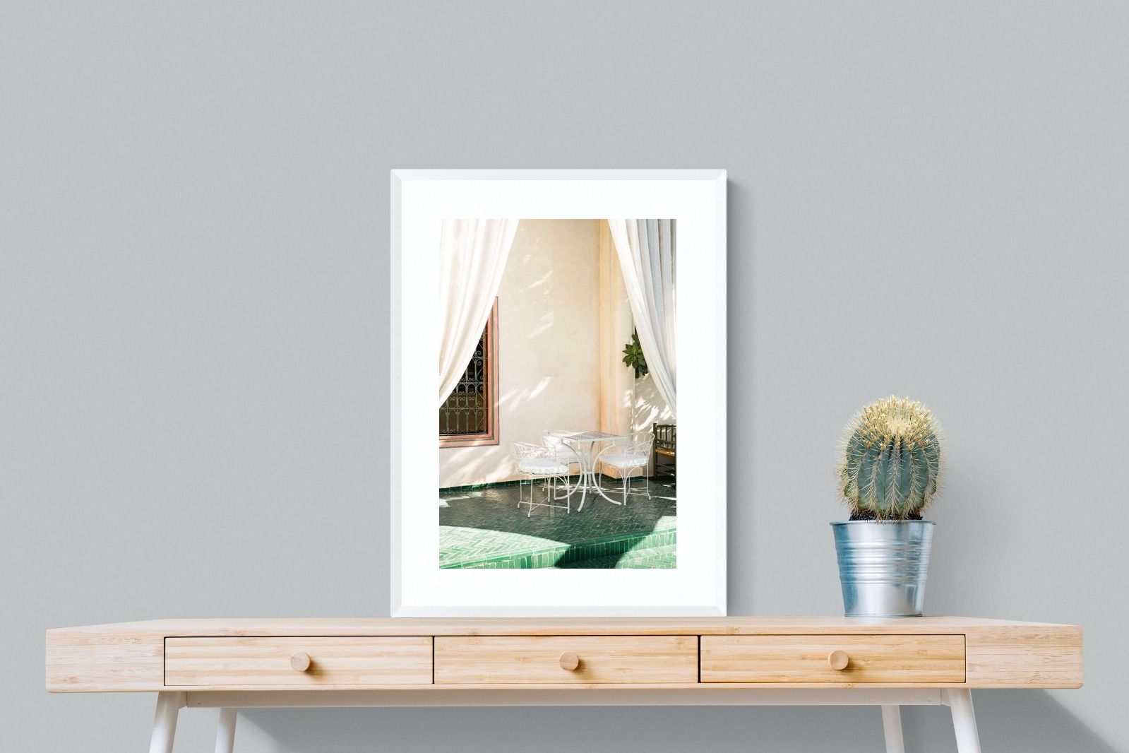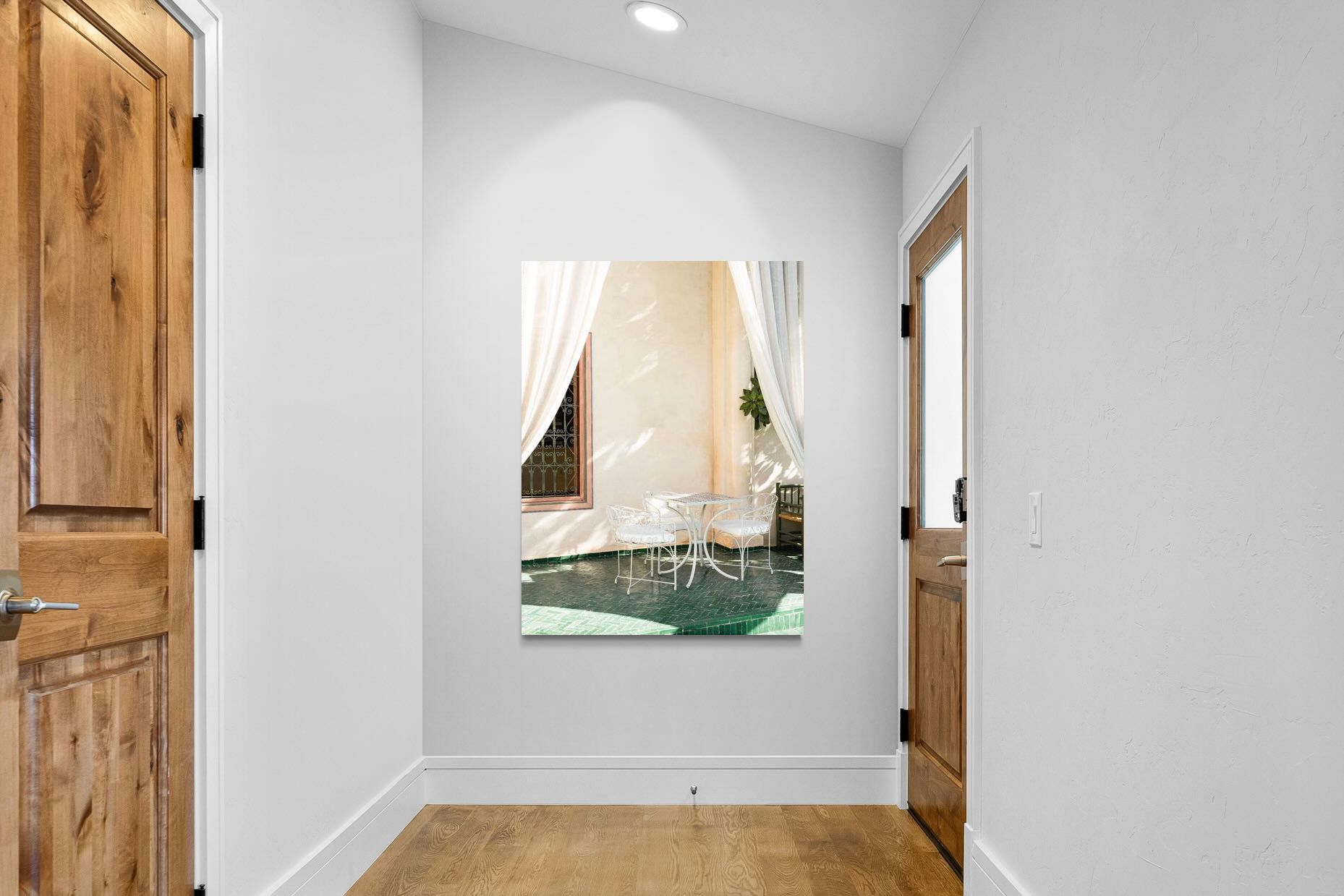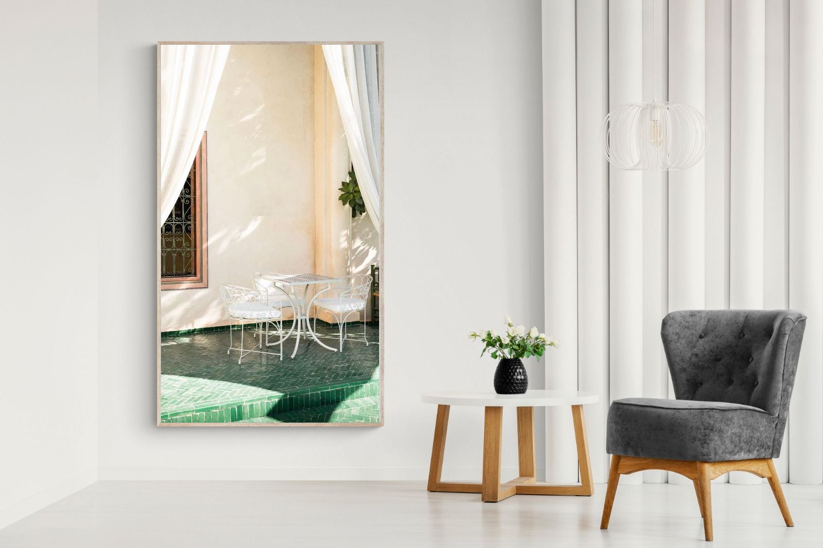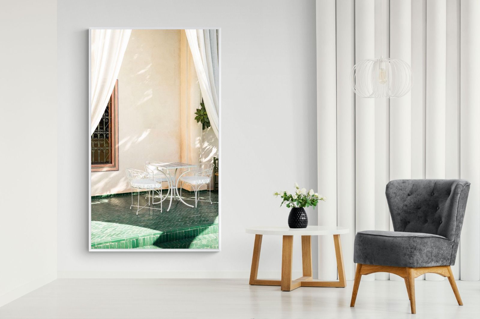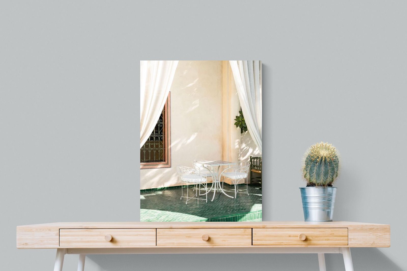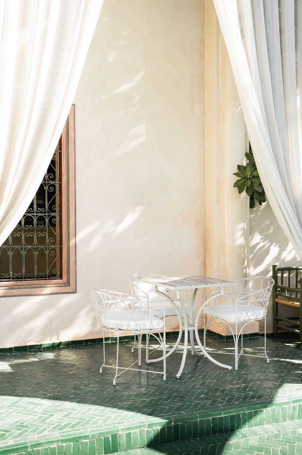 Soft white drapes frame a delicate wrought iron table set against warm plaster walls and deep green tiled floors. Dappled sunlight creates gentle shadows that enhance texture and architectural detail. The restrained palette of cream and green evokes relaxed courtyard living in southern Europe. Perfect for dining areas, kitchens or boutique-style interiors, this piece brings calm sophistication and refined outdoor charm indoors.