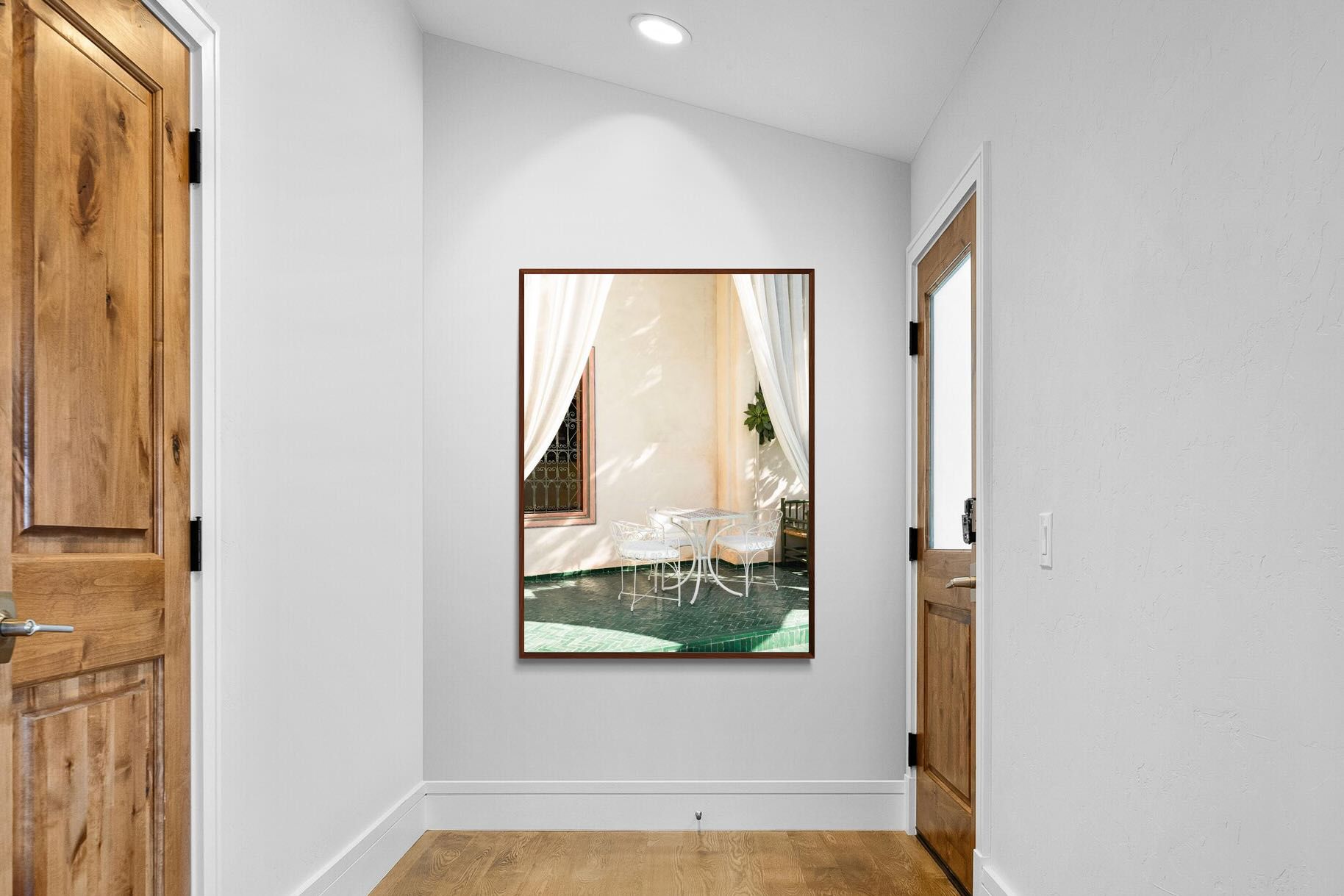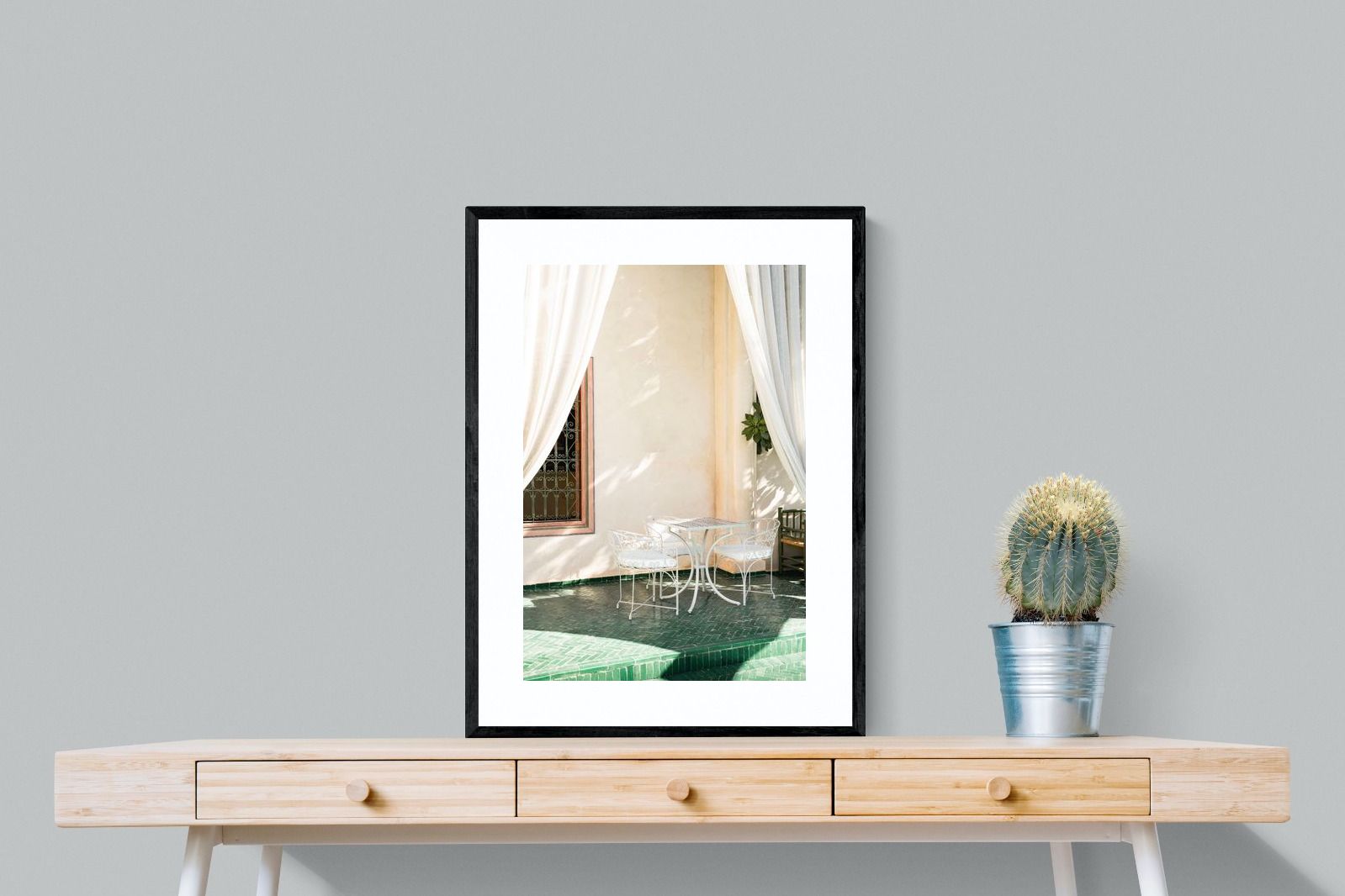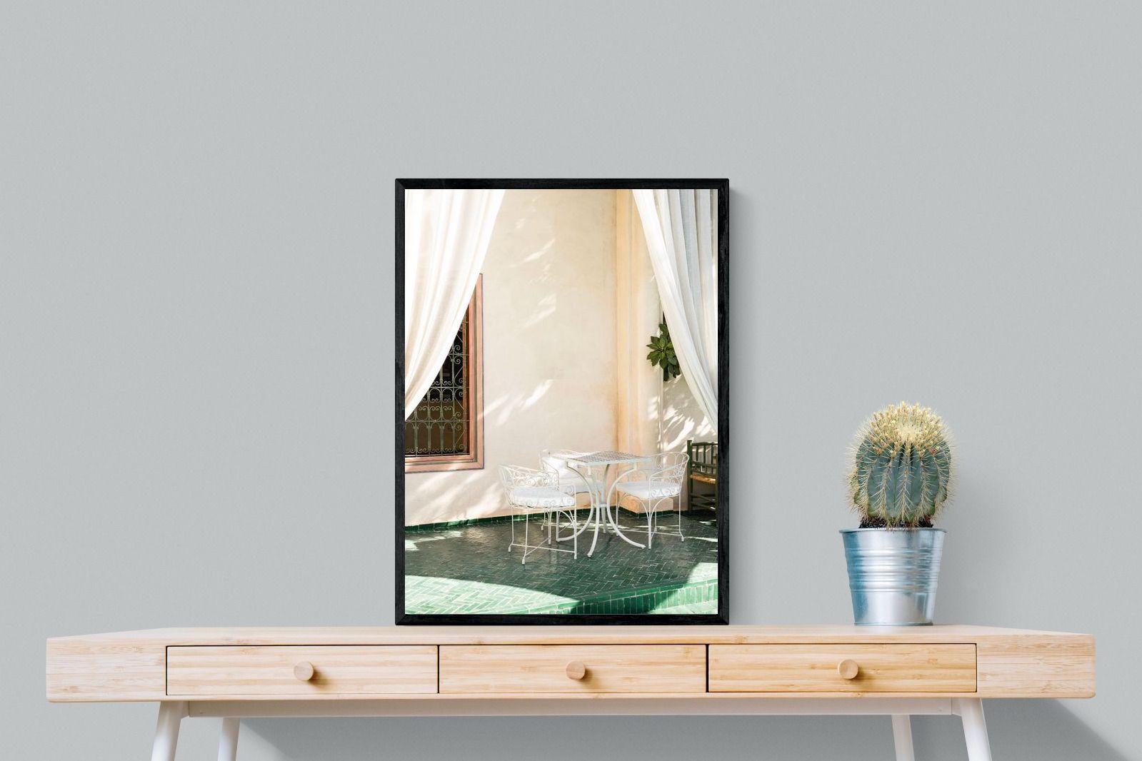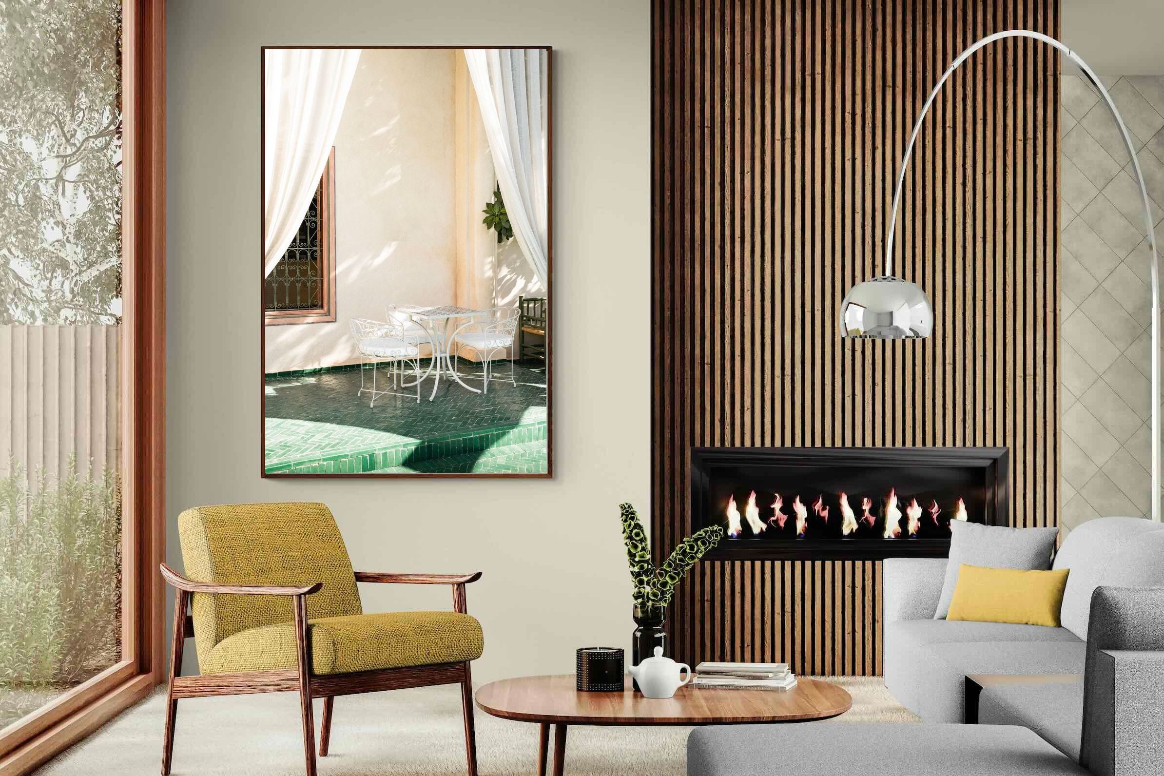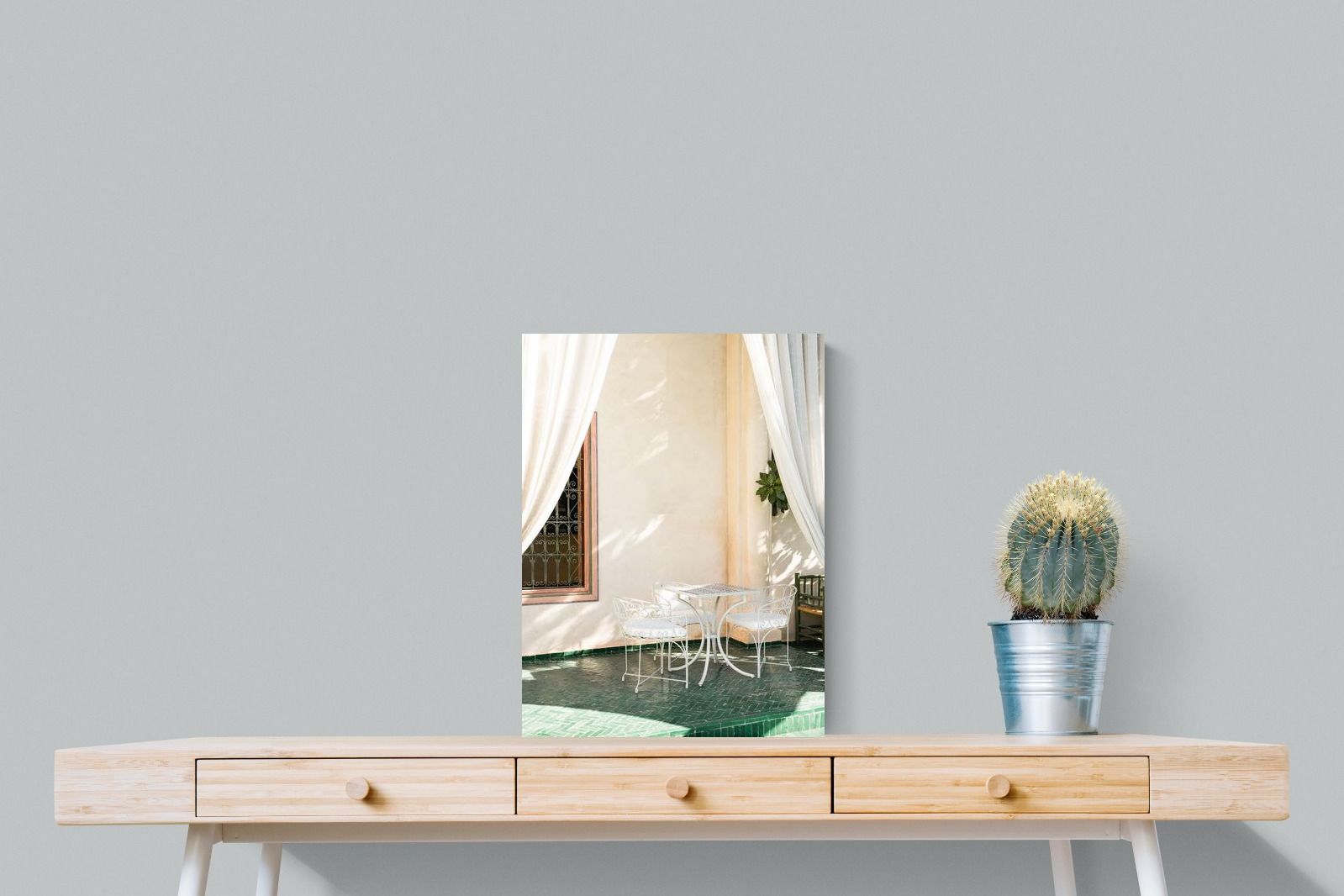 Soft white drapes frame a delicate wrought iron table set against warm plaster walls and deep green tiled floors. Dappled sunlight creates gentle shadows that enhance texture and architectural detail. The restrained palette of cream and green evokes relaxed courtyard living in southern Europe. Perfect for dining areas, kitchens or boutique-style interiors, this piece brings calm sophistication and refined outdoor charm indoors.