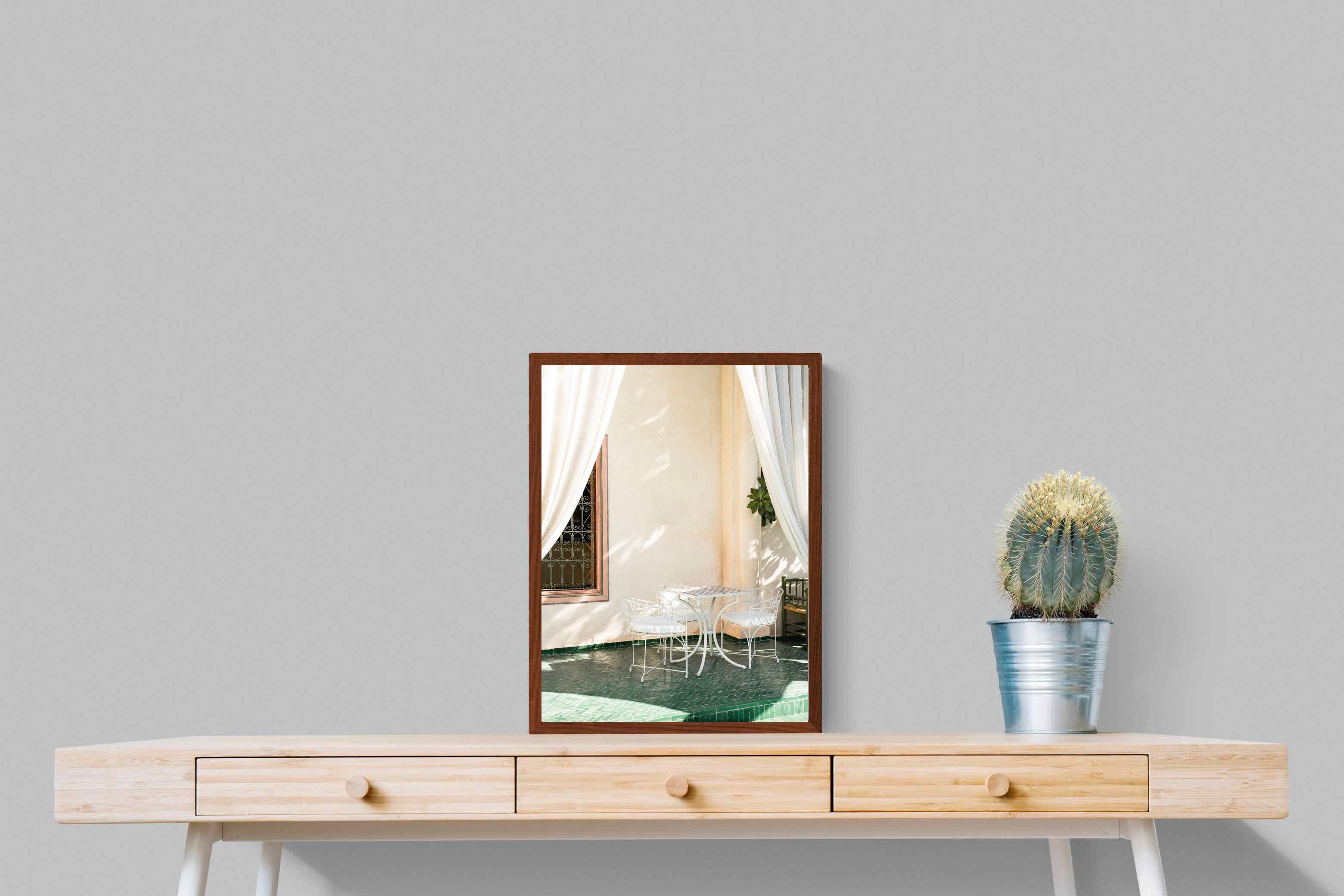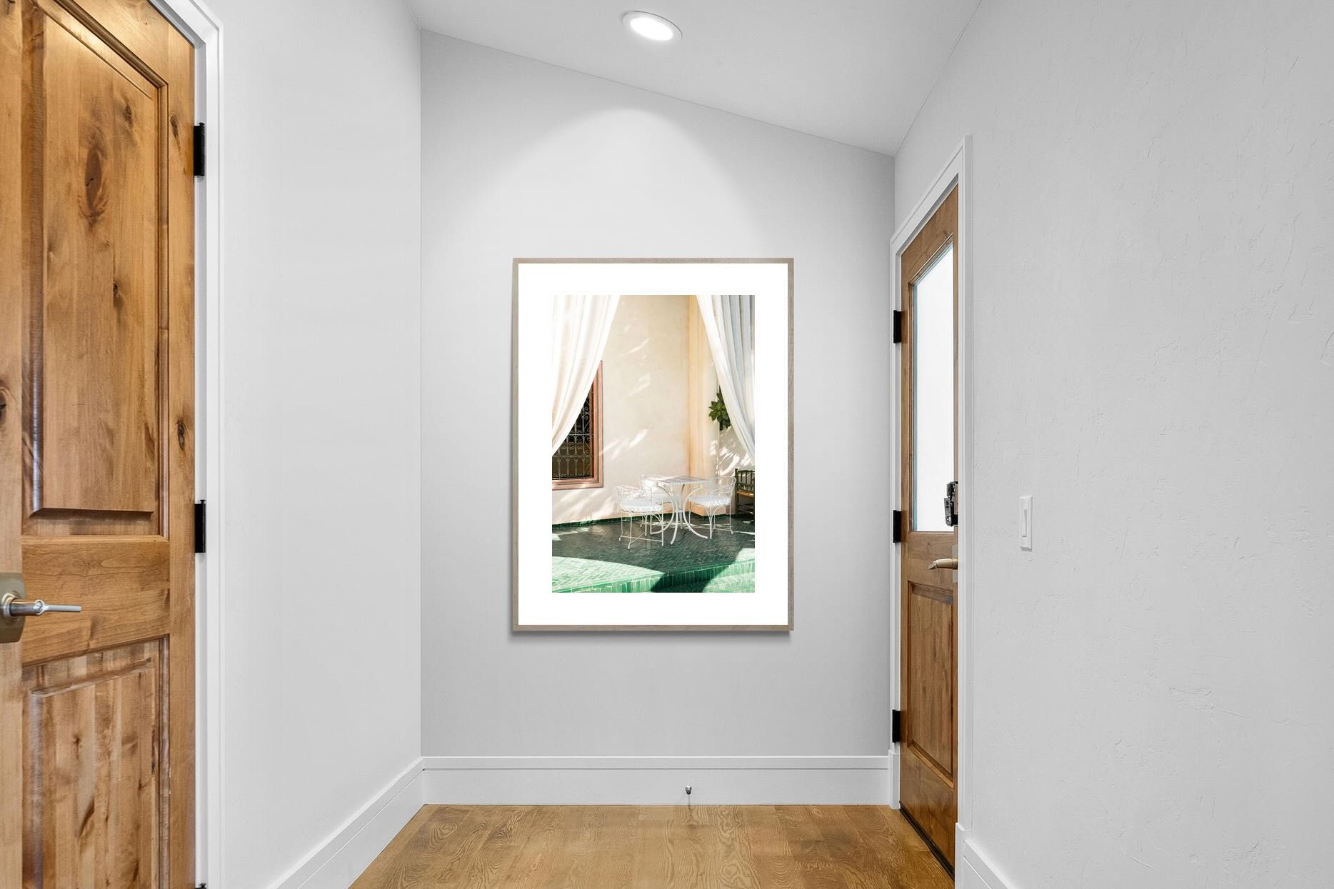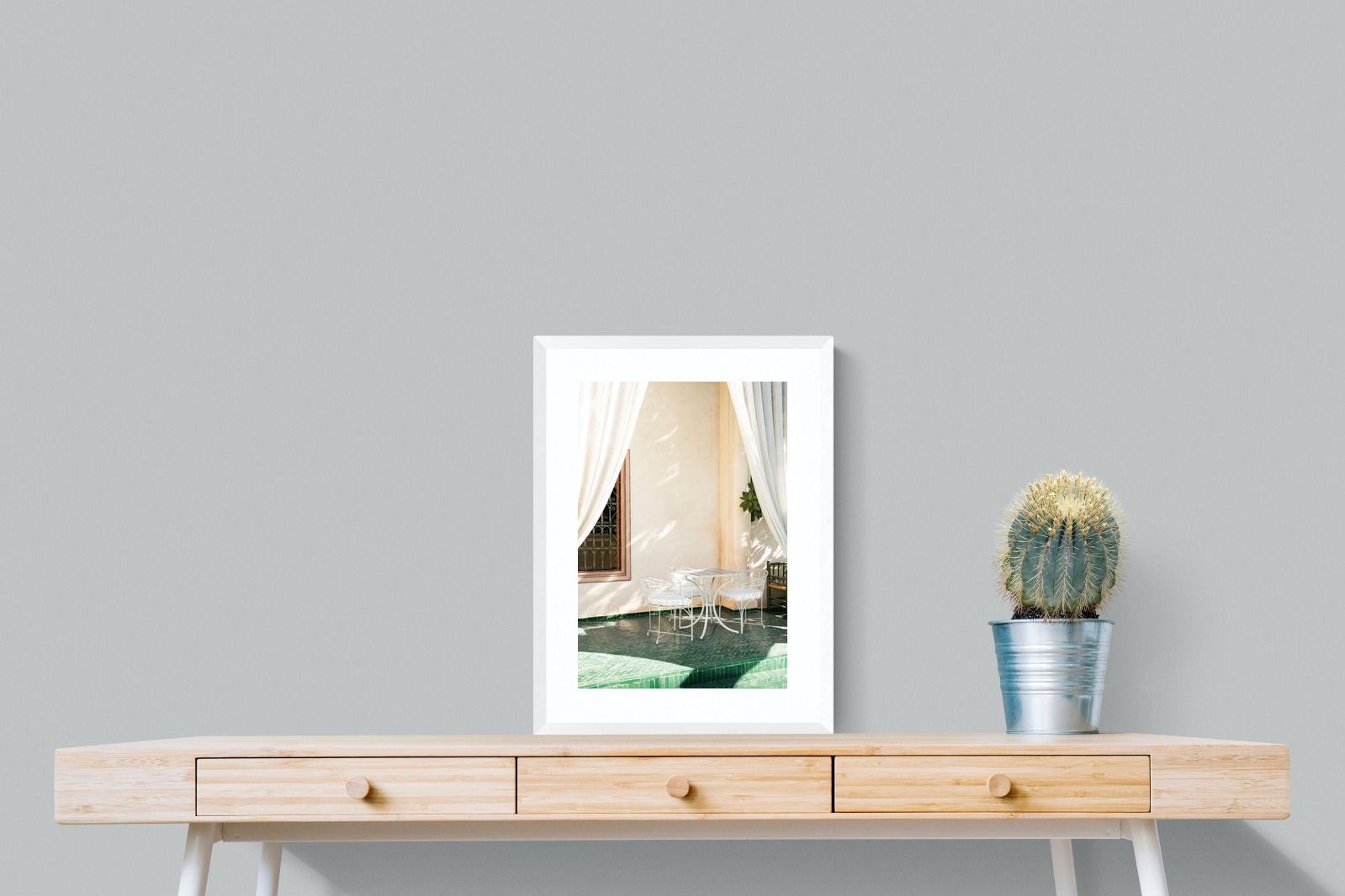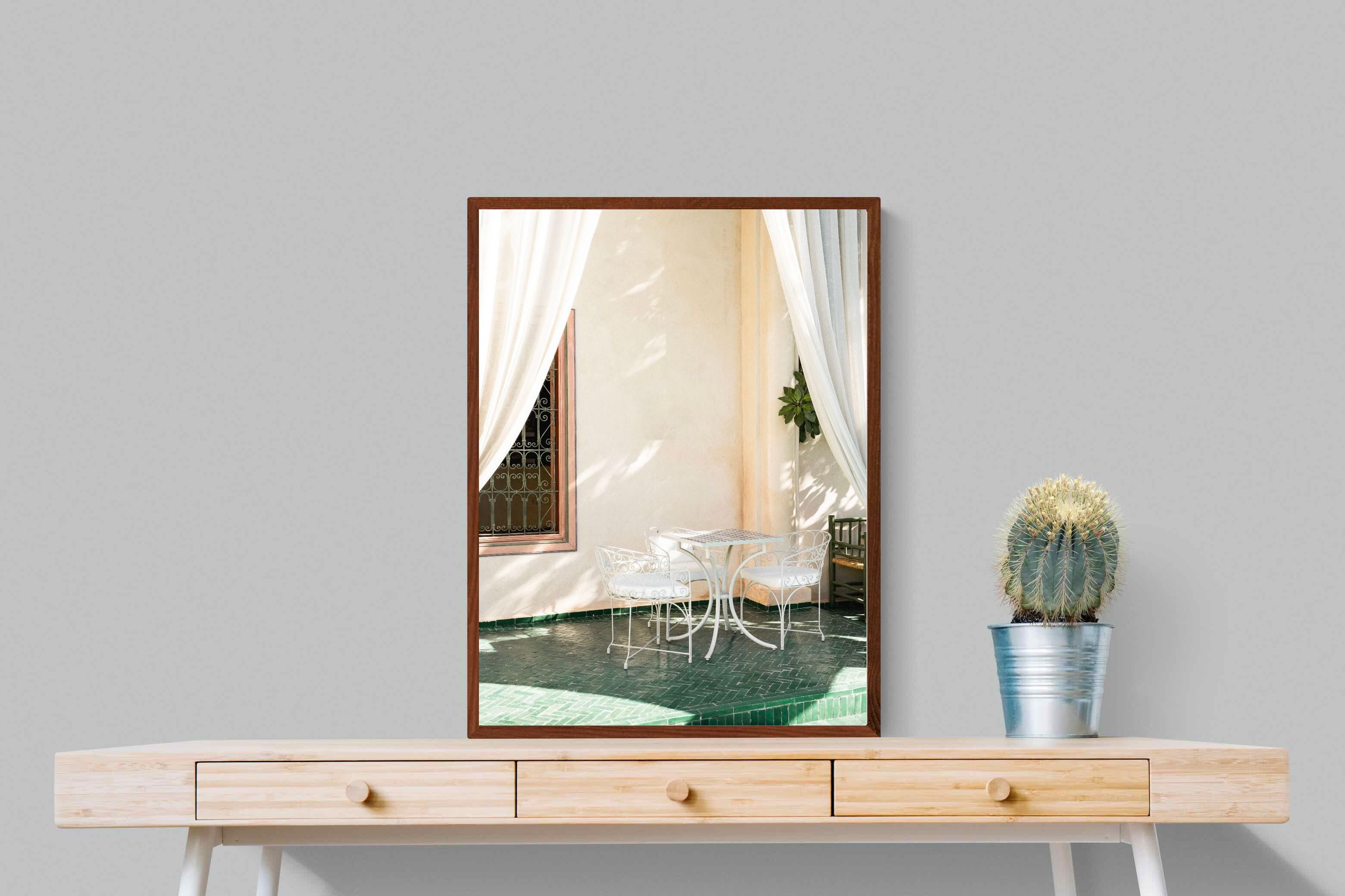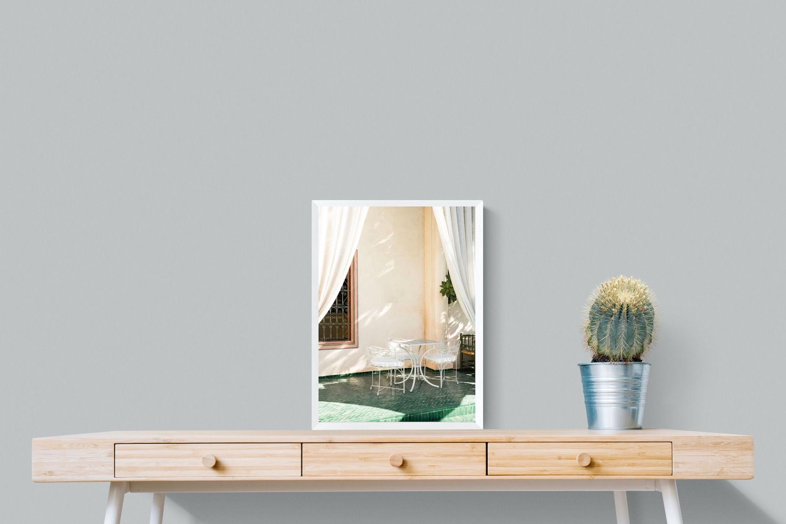 Soft white drapes frame a delicate wrought iron table set against warm plaster walls and deep green tiled floors. Dappled sunlight creates gentle shadows that enhance texture and architectural detail. The restrained palette of cream and green evokes relaxed courtyard living in southern Europe. Perfect for dining areas, kitchens or boutique-style interiors, this piece brings calm sophistication and refined outdoor charm indoors.