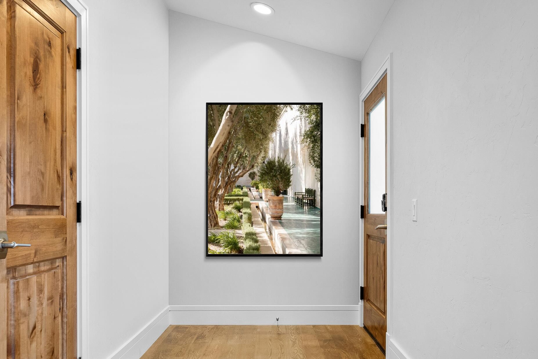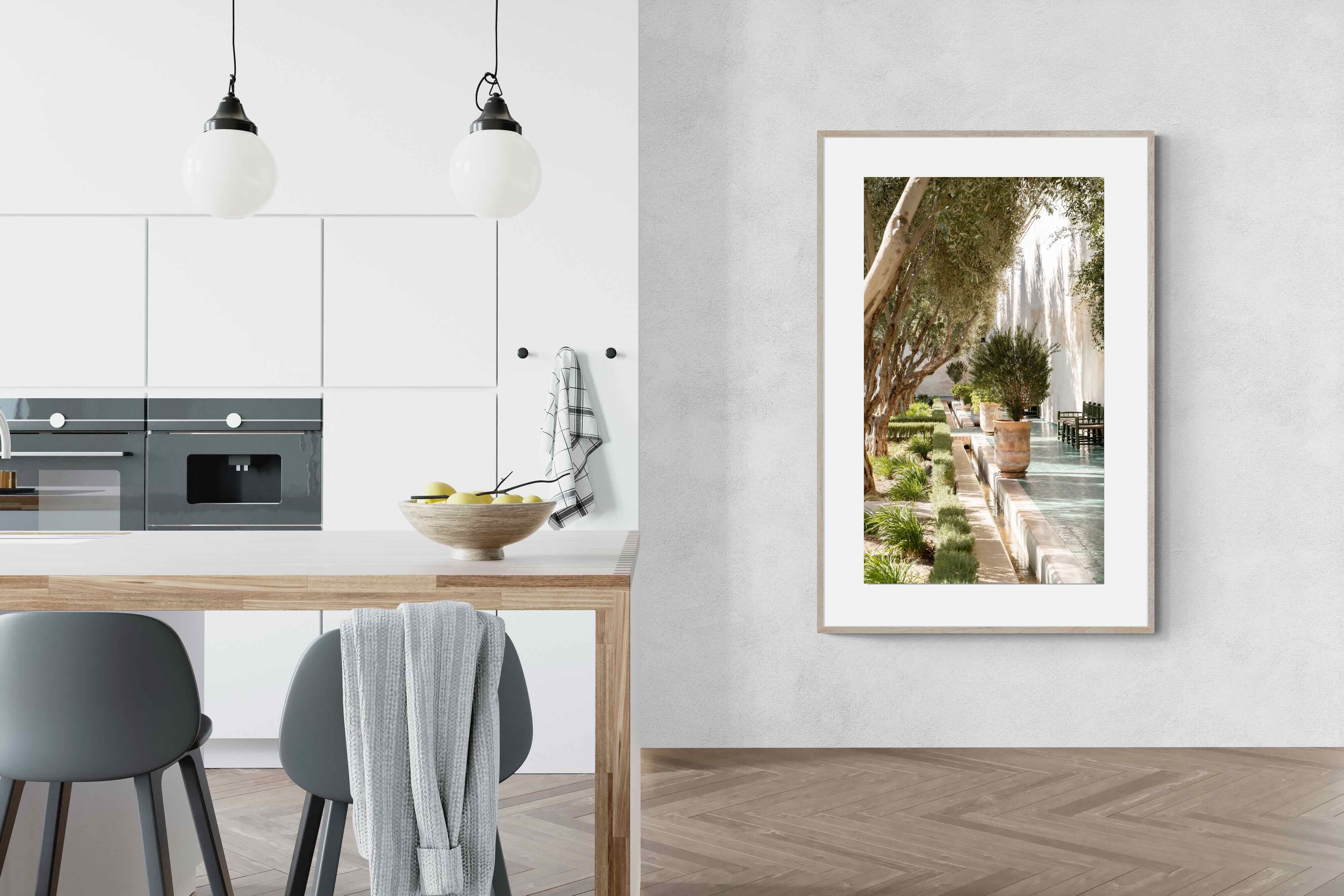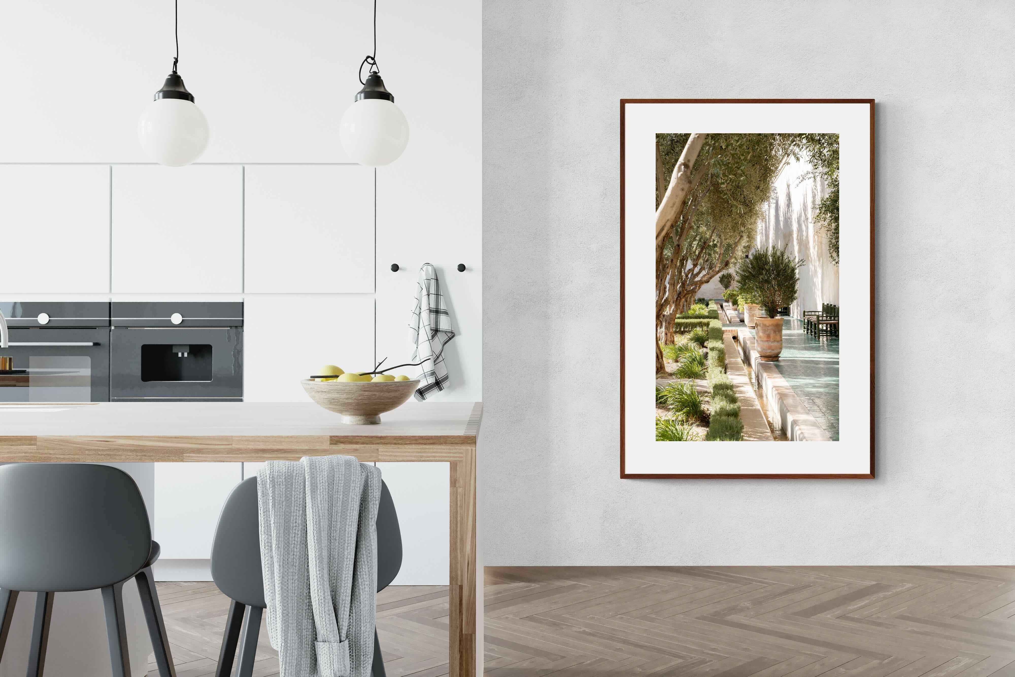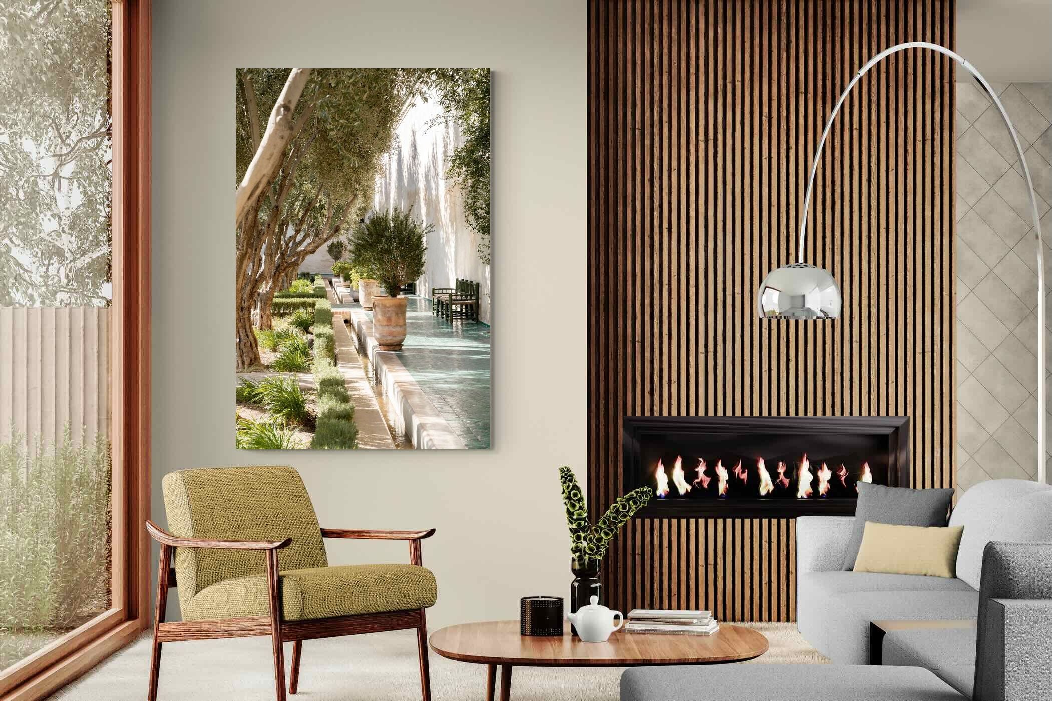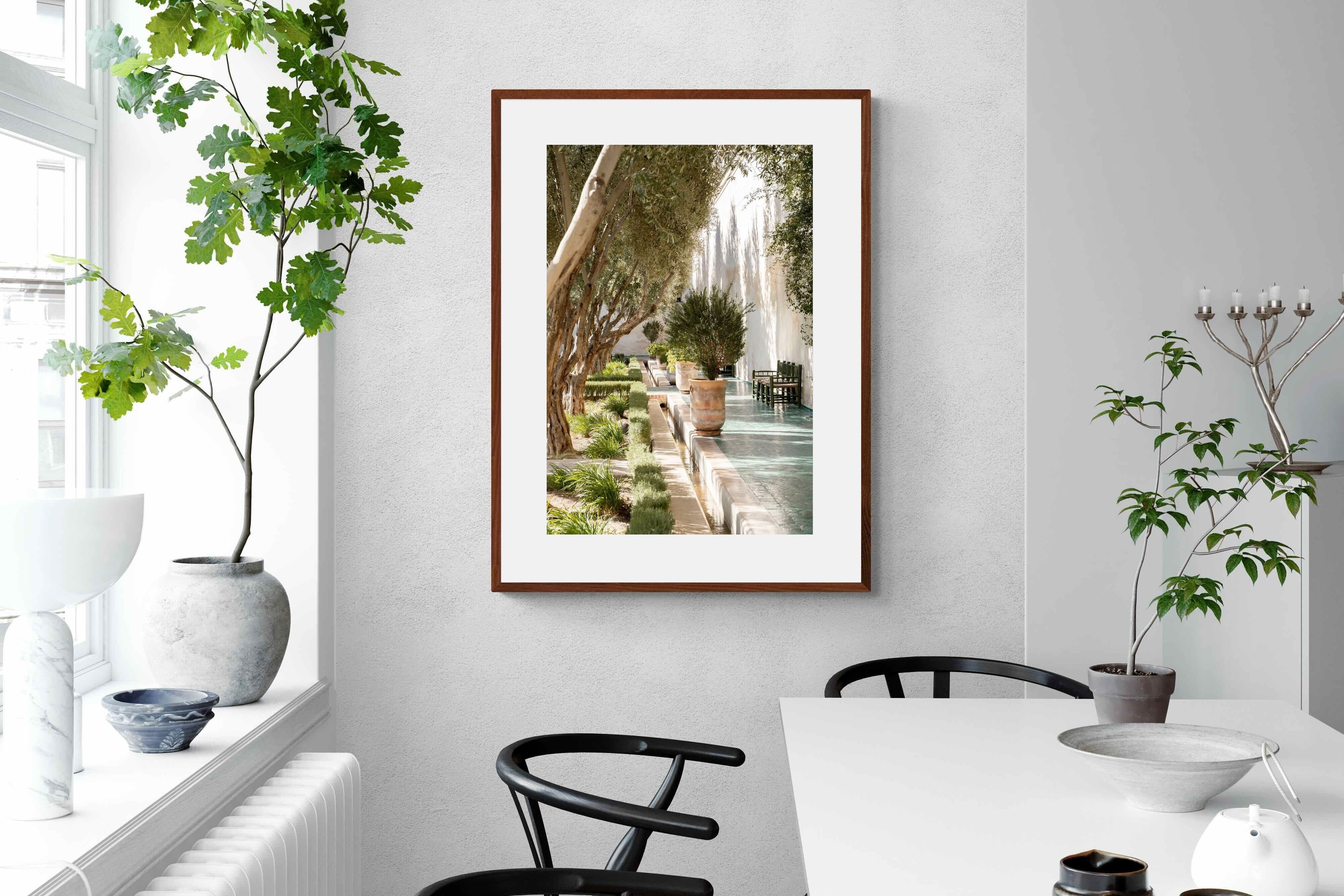 A row of sculptural olive trees lines a tiled walkway, bordered by clipped hedges and terracotta pots. The interplay of light and shadow across green tiles and pale walls creates depth and tranquillity. Natural textures balance architectural precision, resulting in a composition that feels both structured and organic. Ideal for hallways, lounges or serene interiors, this artwork introduces understated luxury and timeless European garden style.