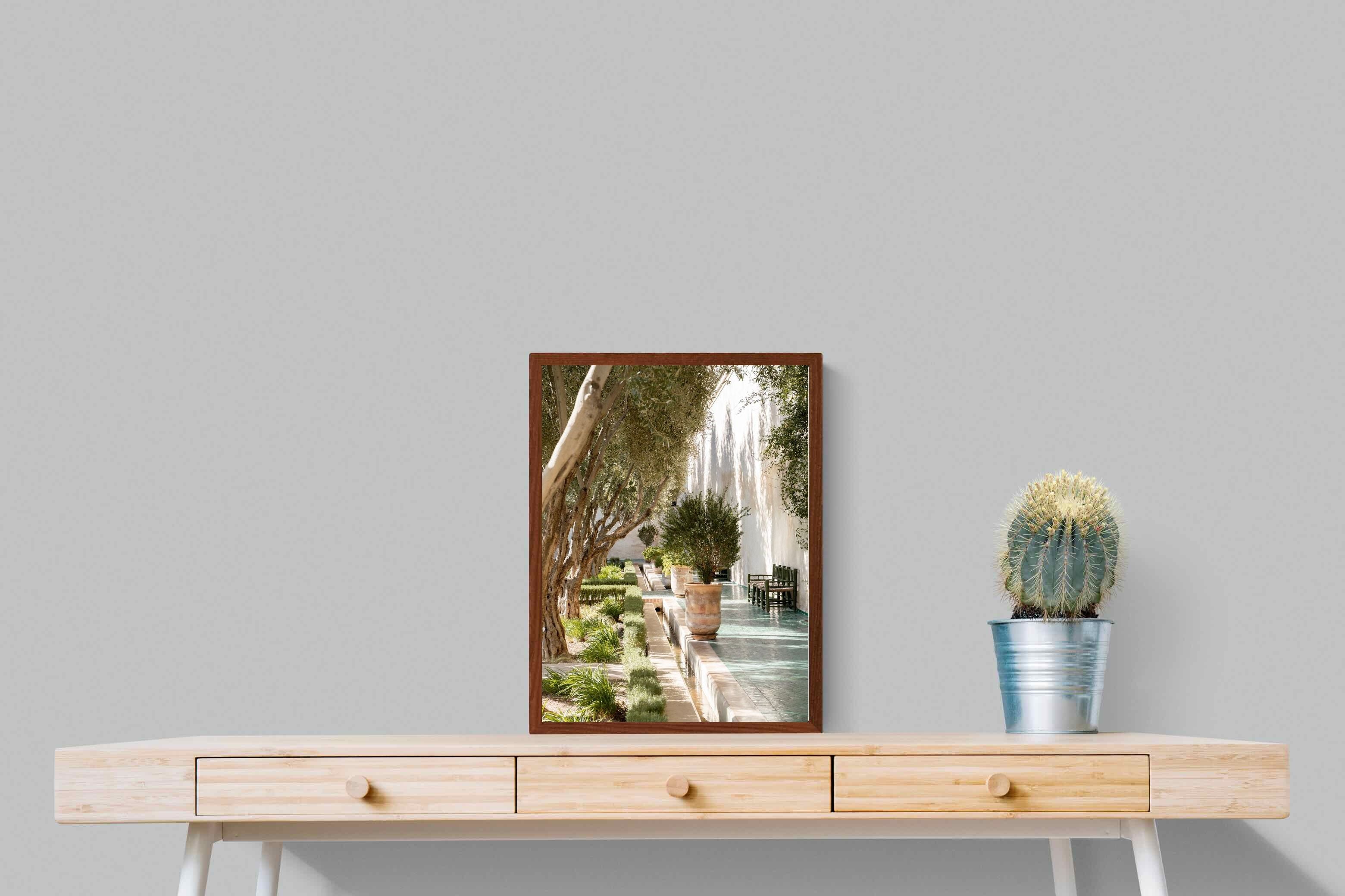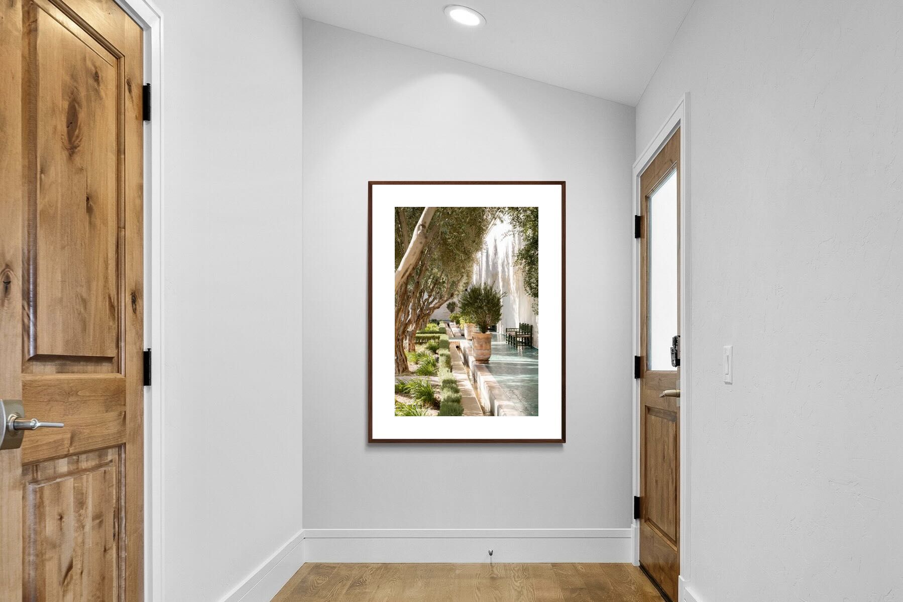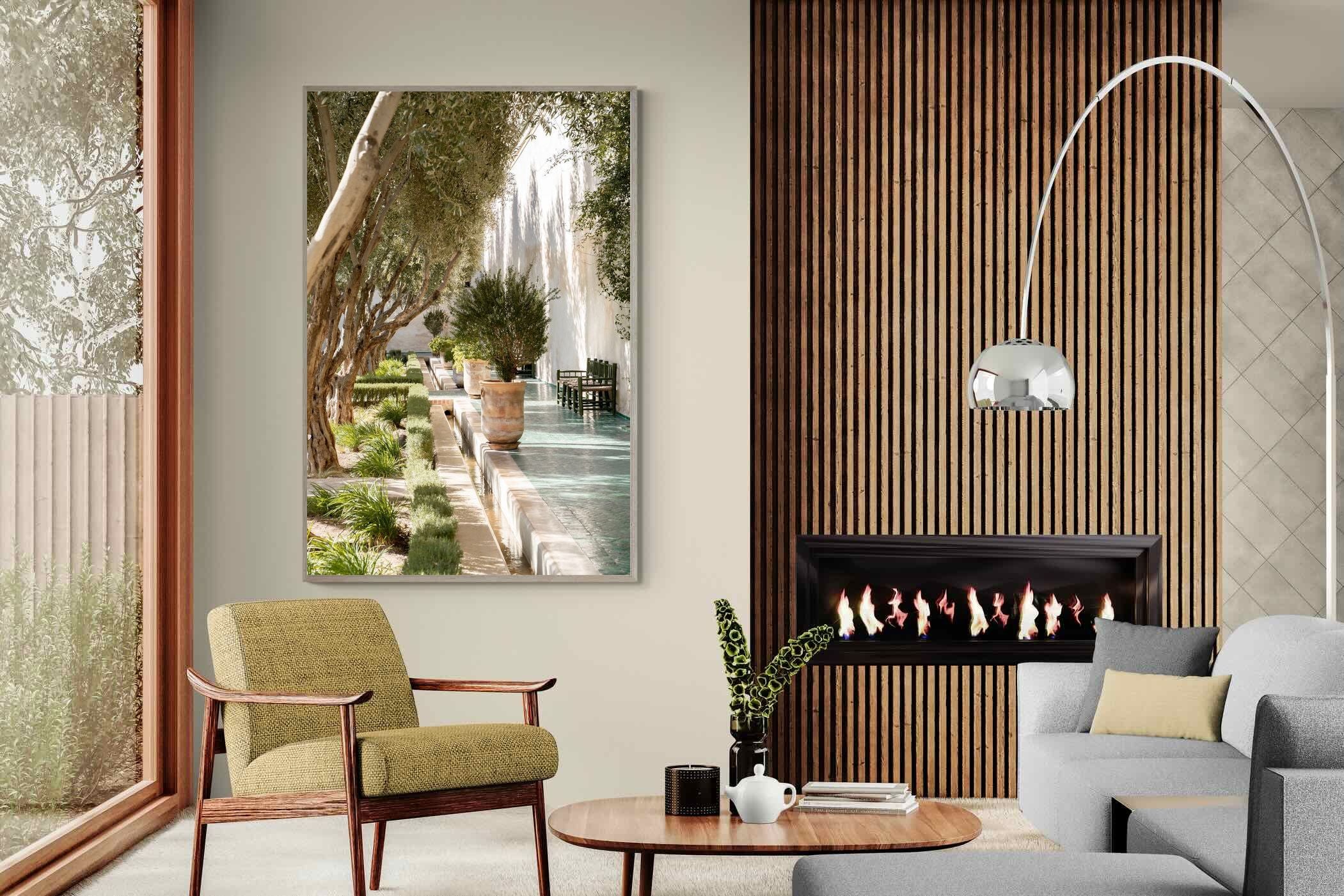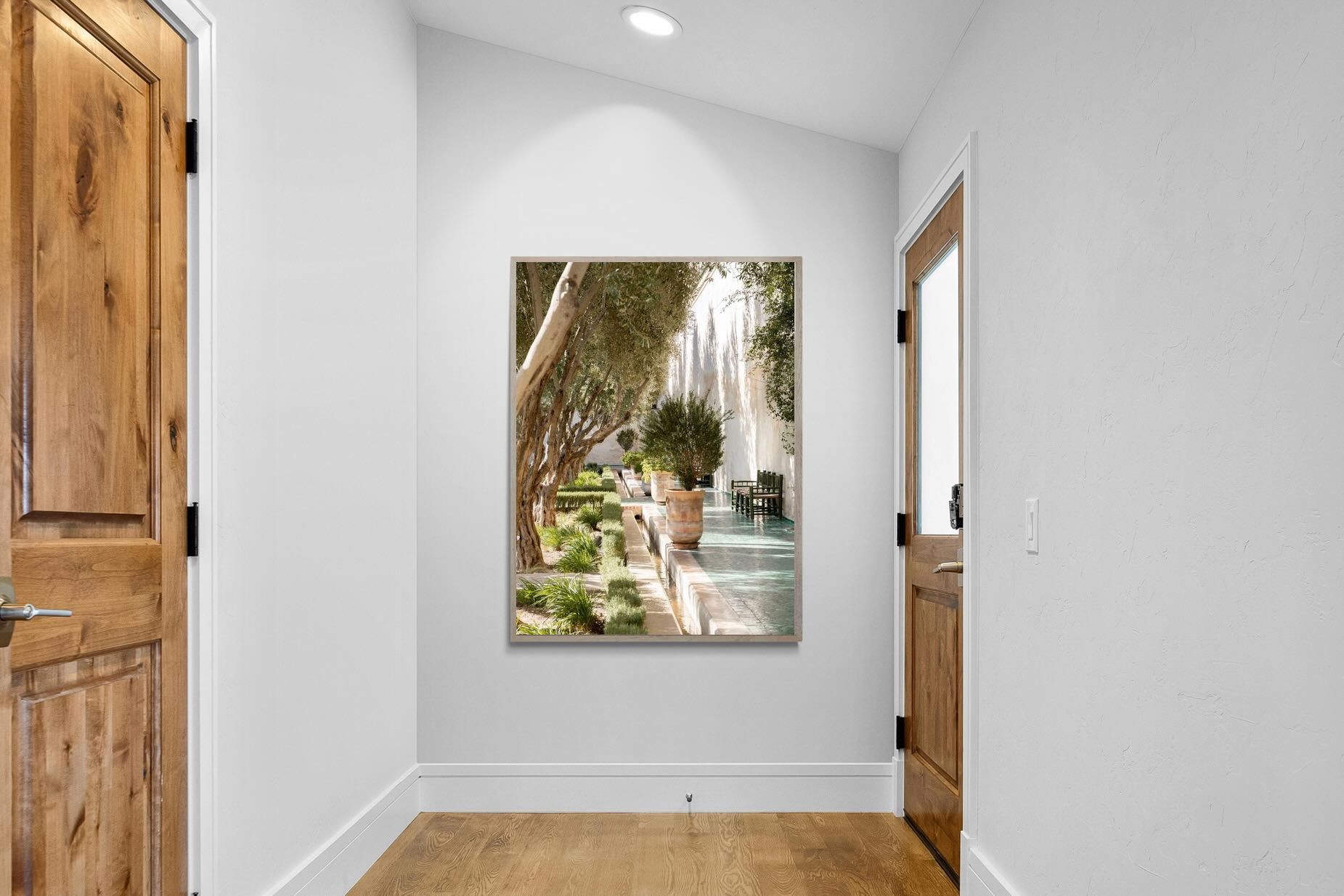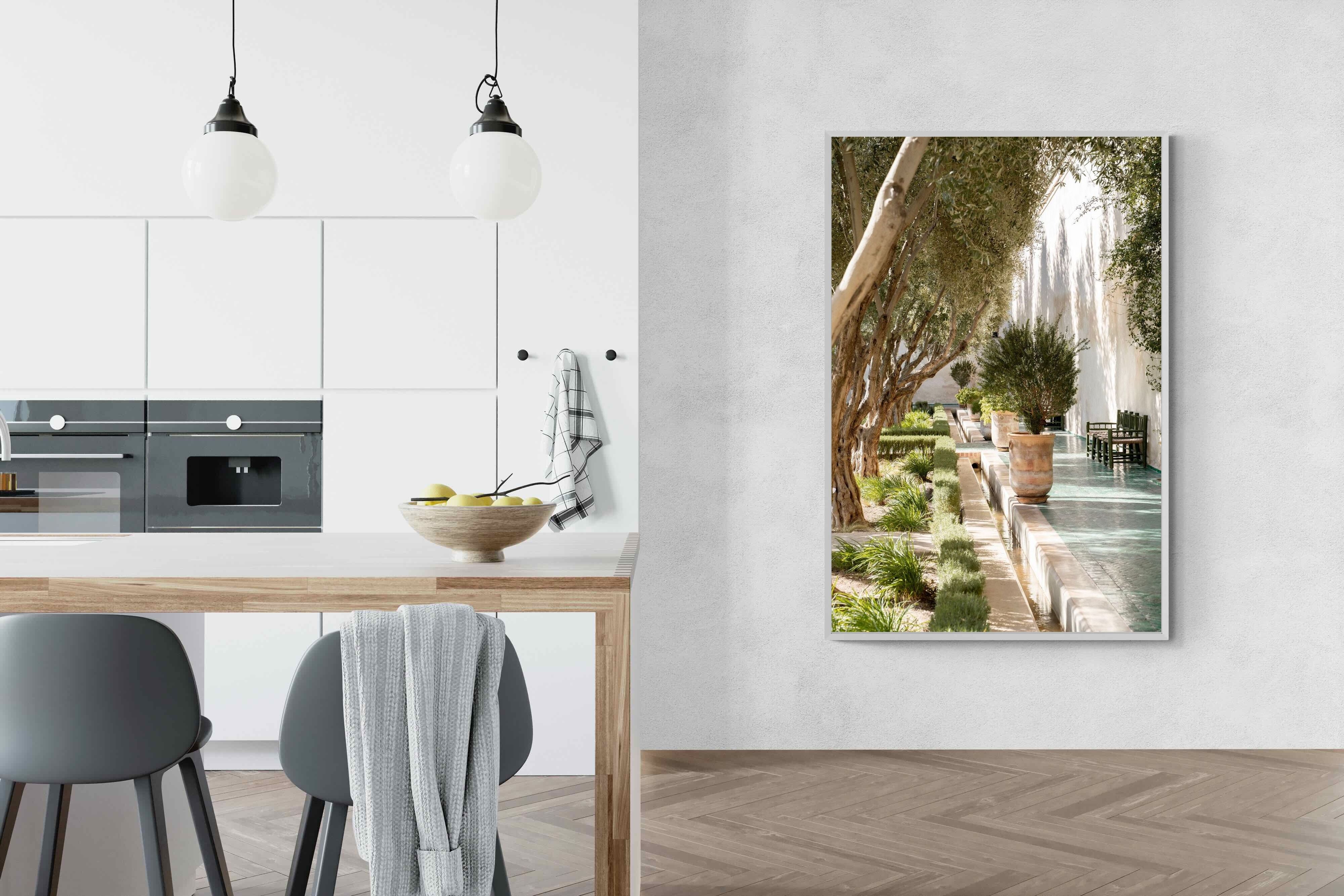 A row of sculptural olive trees lines a tiled walkway, bordered by clipped hedges and terracotta pots. The interplay of light and shadow across green tiles and pale walls creates depth and tranquillity. Natural textures balance architectural precision, resulting in a composition that feels both structured and organic. Ideal for hallways, lounges or serene interiors, this artwork introduces understated luxury and timeless European garden style.