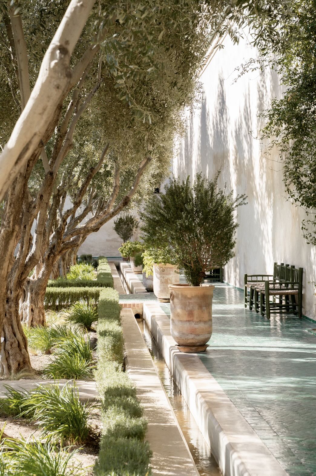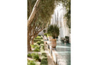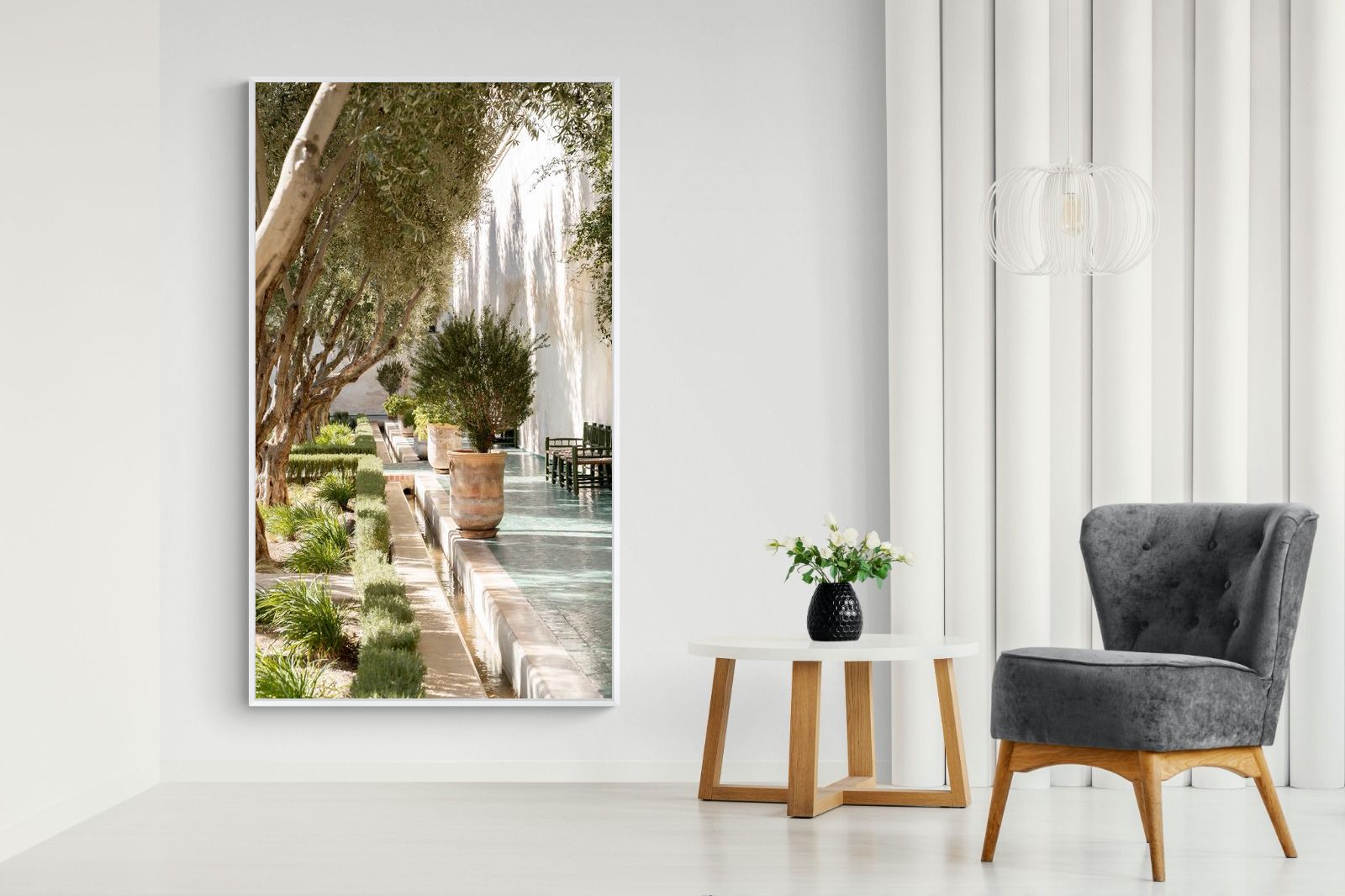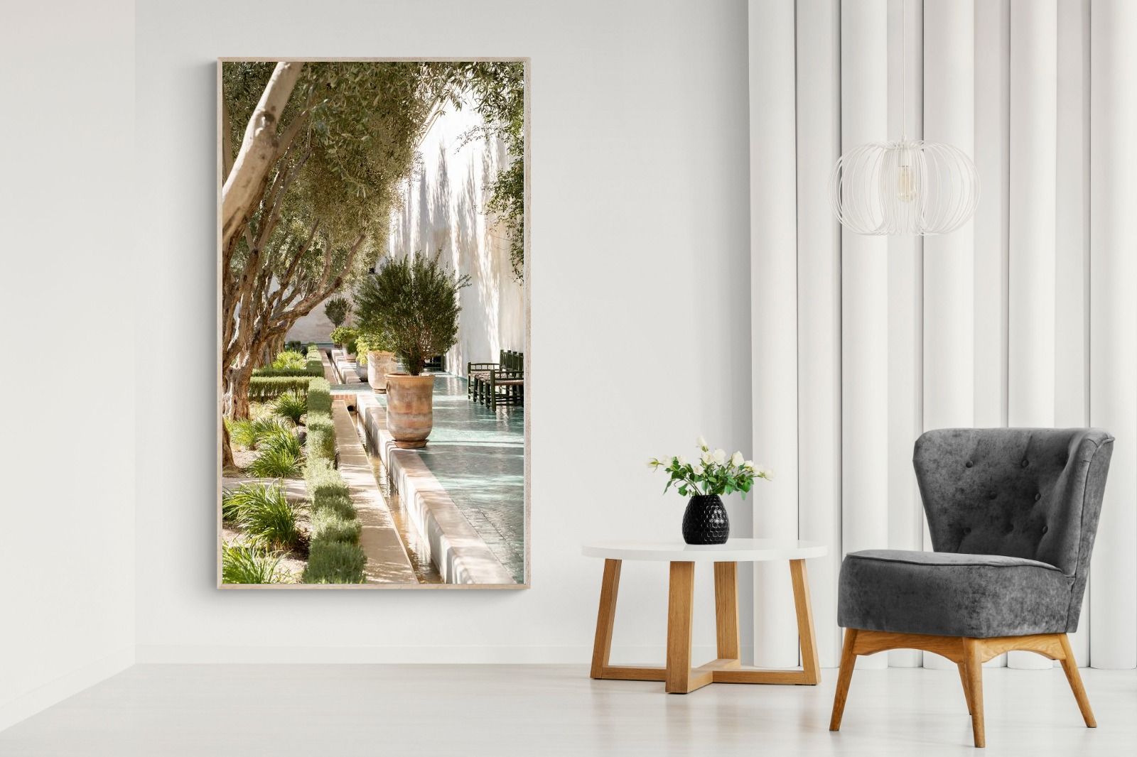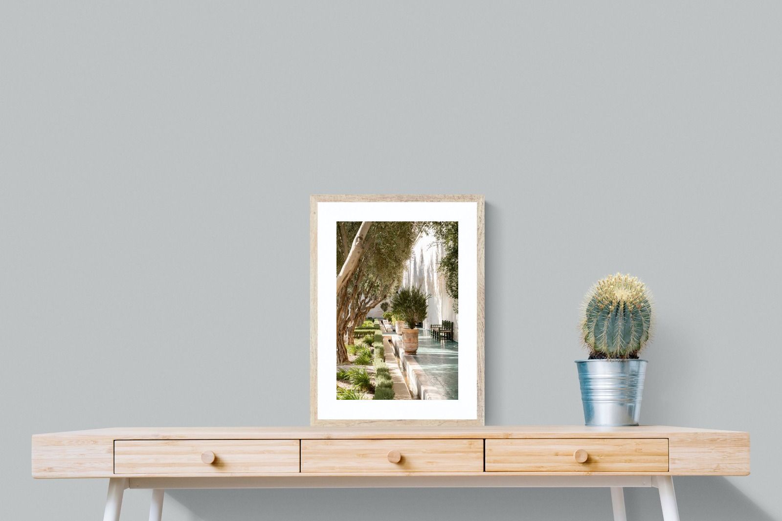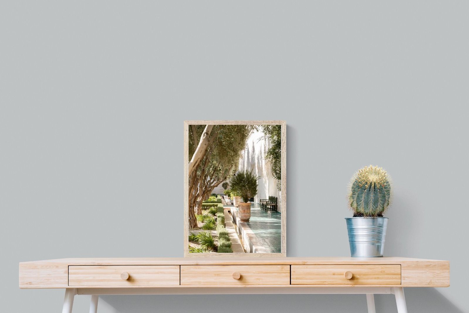 A row of sculptural olive trees lines a tiled walkway, bordered by clipped hedges and terracotta pots. The interplay of light and shadow across green tiles and pale walls creates depth and tranquillity. Natural textures balance architectural precision, resulting in a composition that feels both structured and organic. Ideal for hallways, lounges or serene interiors, this artwork introduces understated luxury and timeless European garden style.