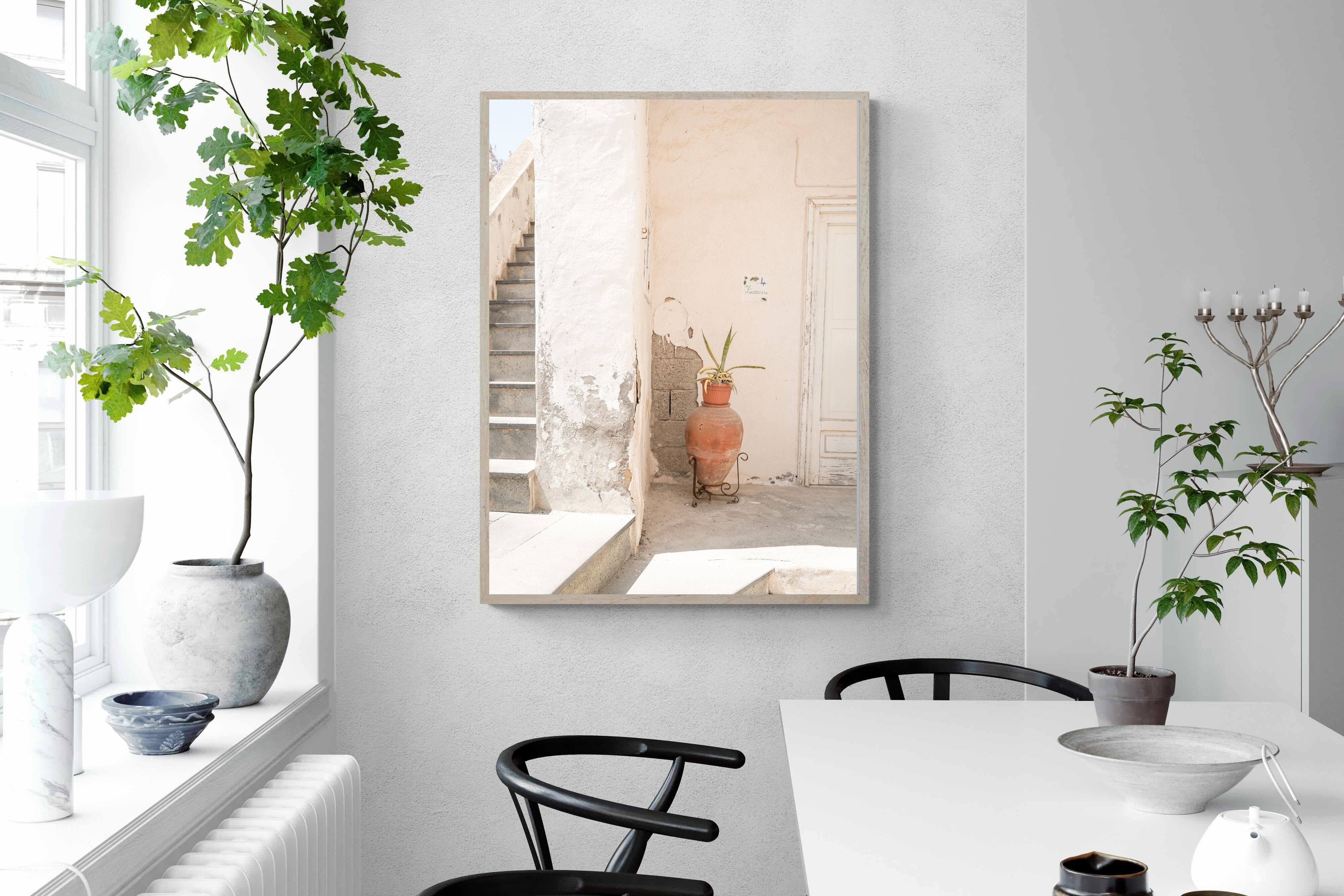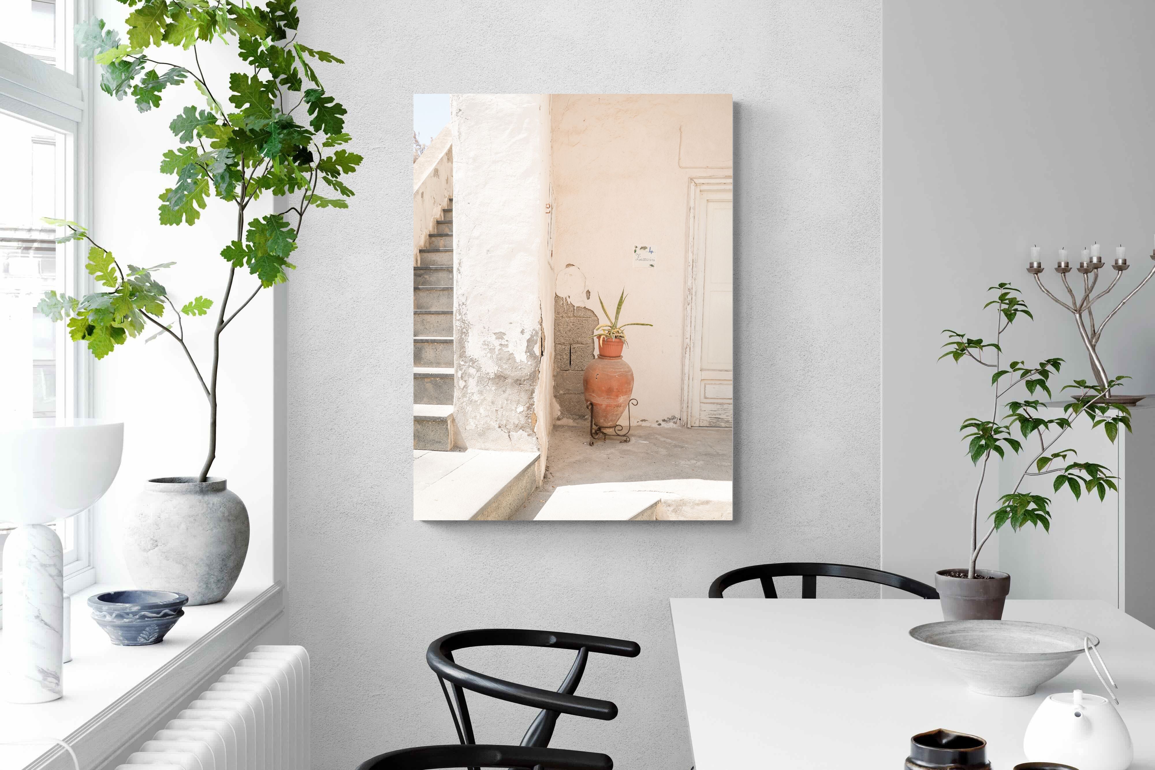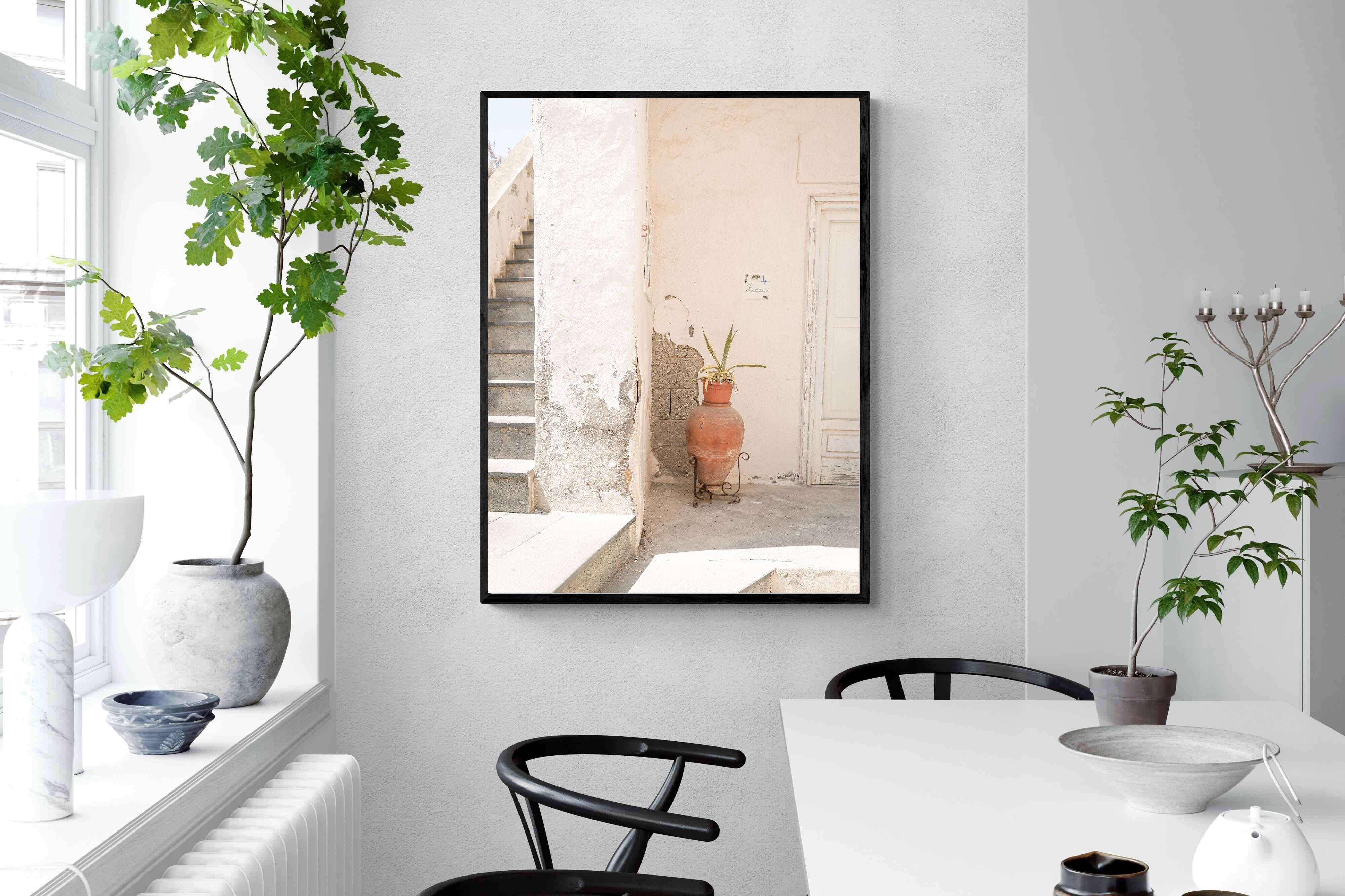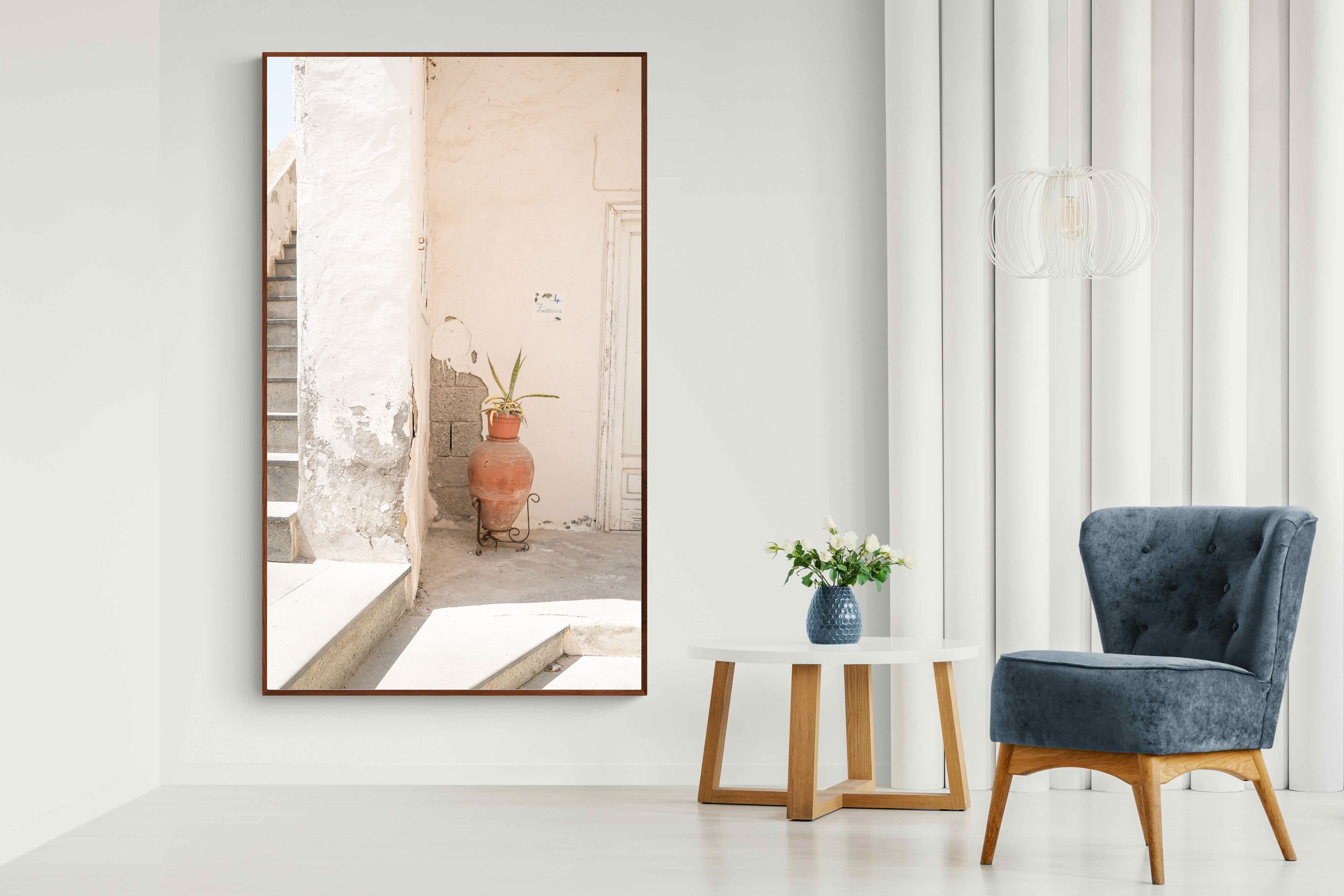 Terracotta Pot celebrates sunlit architectural detail, pairing textured plaster walls with a classic clay urn and soft green foliage. The interplay of warm neutrals and natural materials evokes relaxed Mediterranean living. Subtle light and shadow enhance the aged surfaces, creating a refined yet informal composition. Perfect for kitchens, entryways or modern rustic interiors, this artwork brings warmth, authenticity and effortless European charm into any thoughtfully styled space.