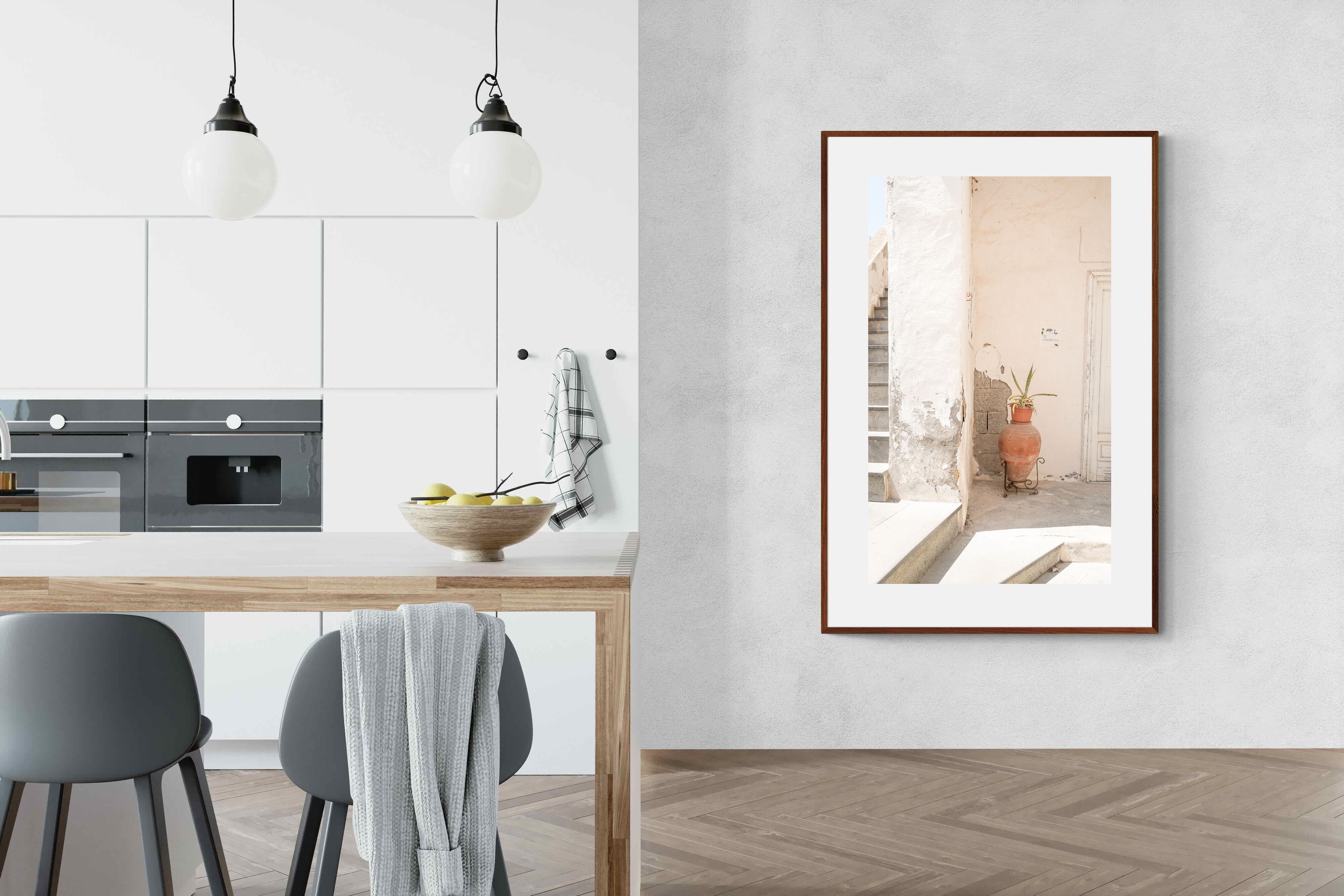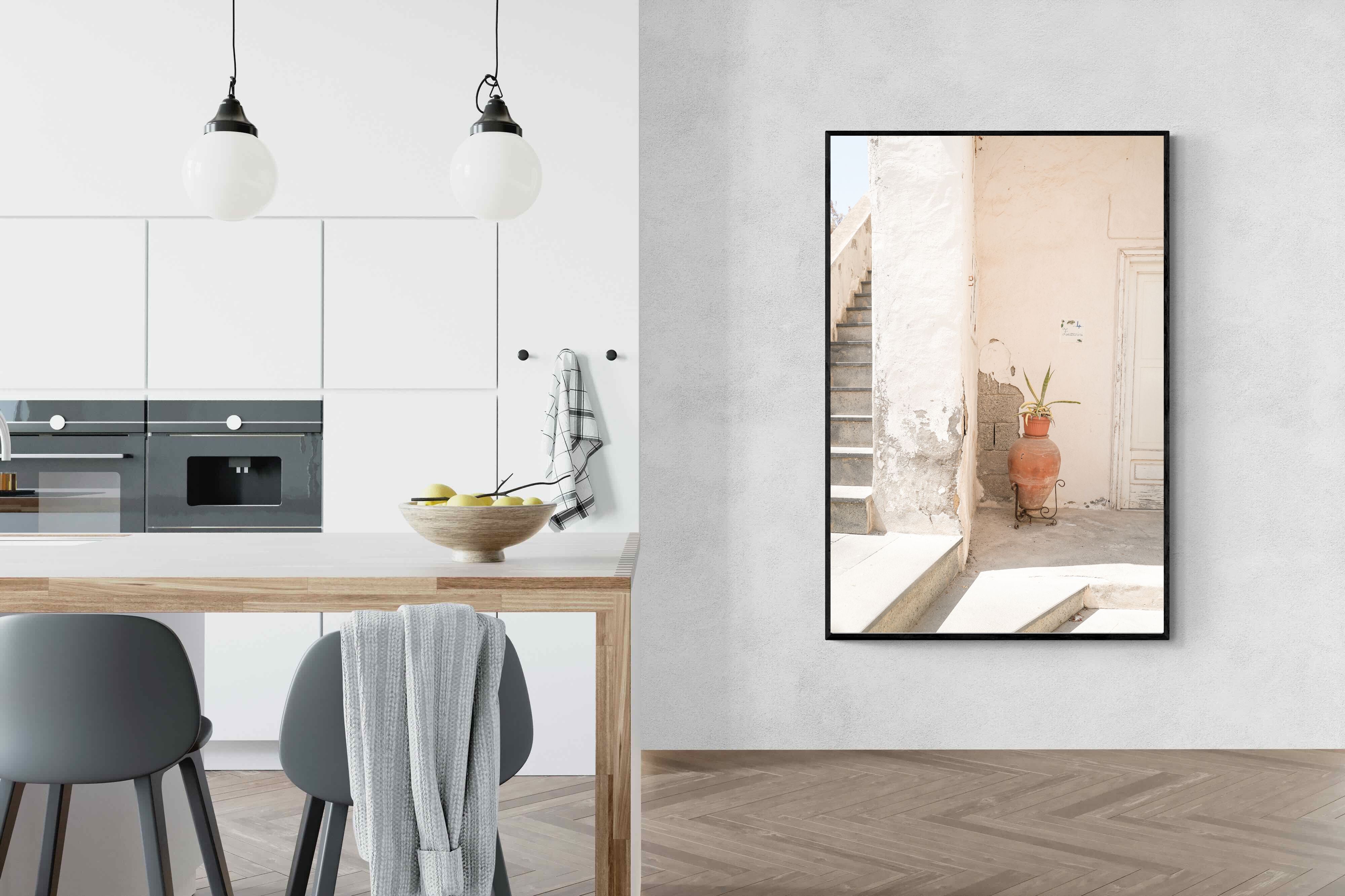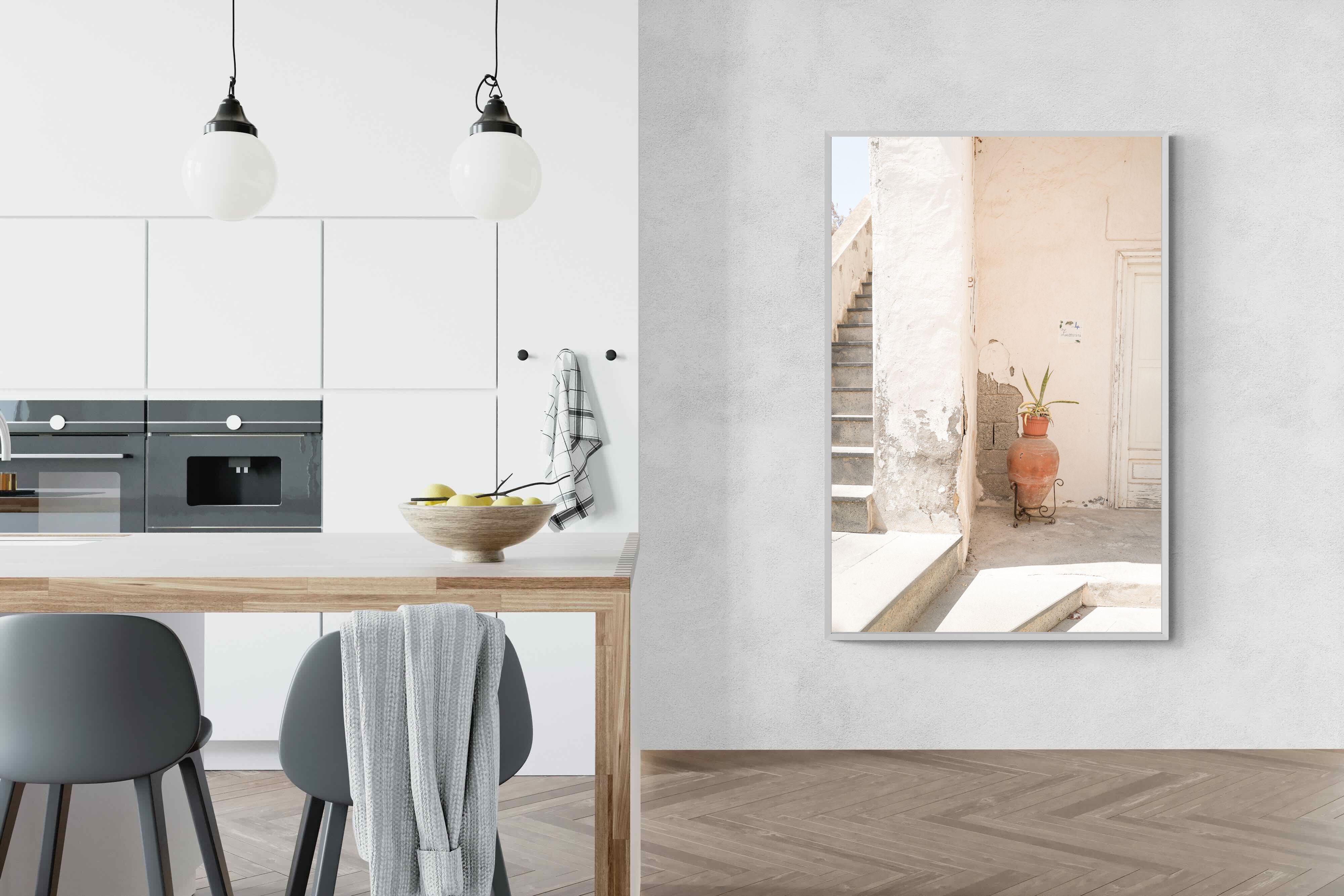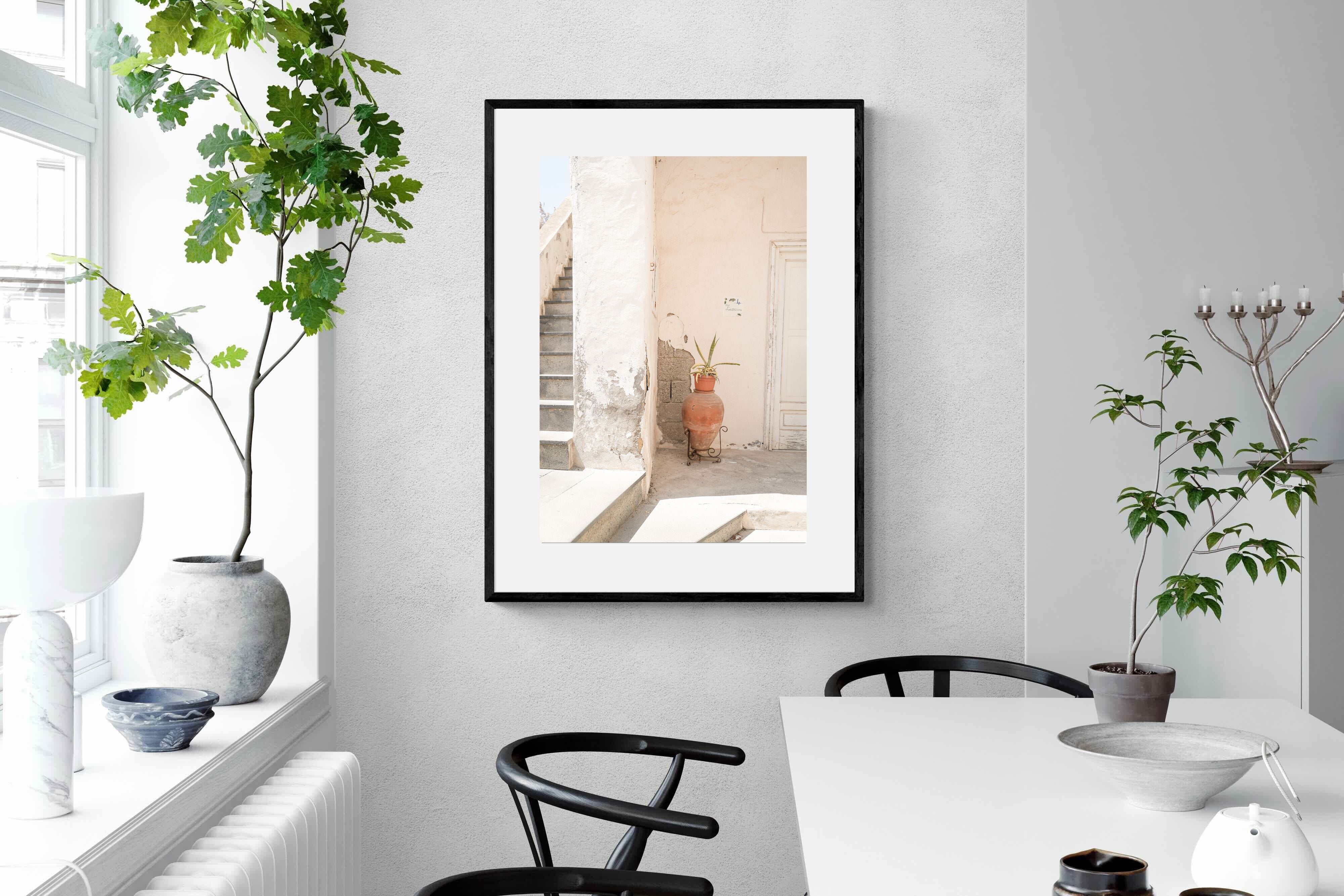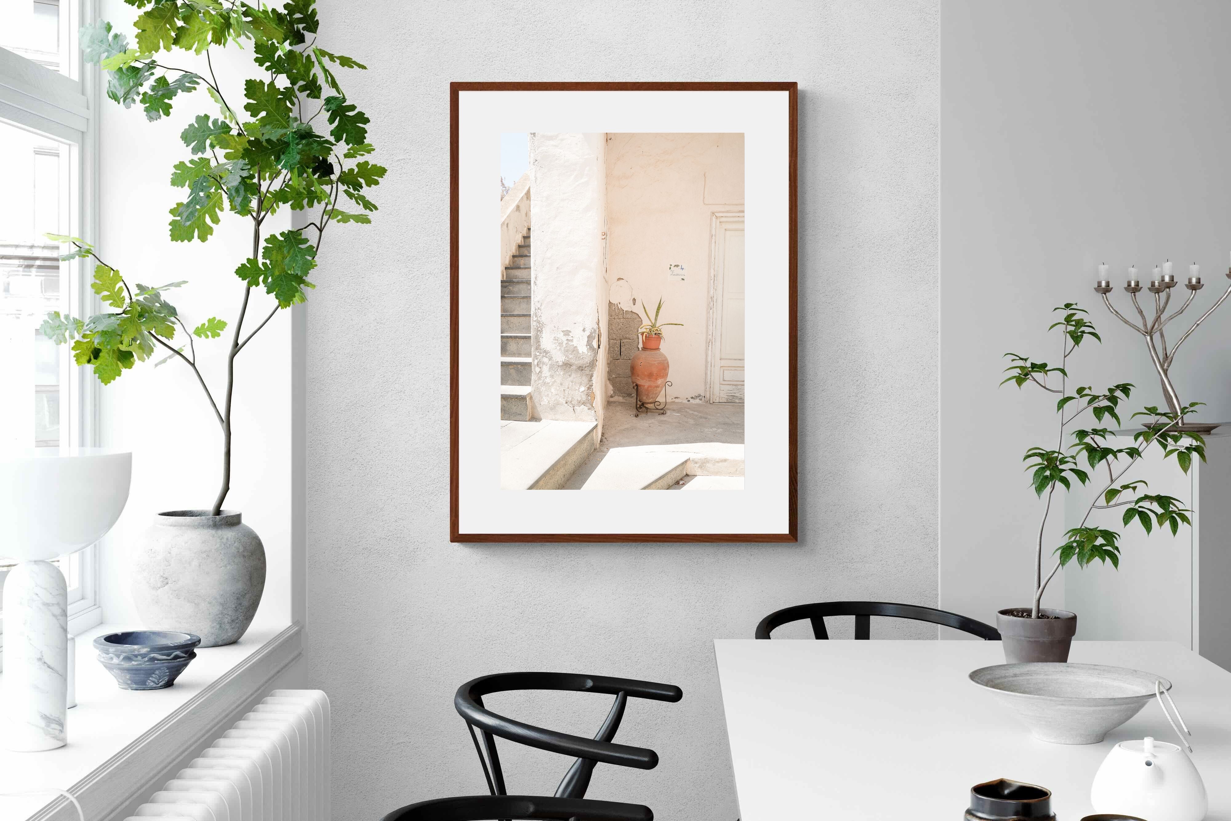 Terracotta Pot celebrates sunlit architectural detail, pairing textured plaster walls with a classic clay urn and soft green foliage. The interplay of warm neutrals and natural materials evokes relaxed Mediterranean living. Subtle light and shadow enhance the aged surfaces, creating a refined yet informal composition. Perfect for kitchens, entryways or modern rustic interiors, this artwork brings warmth, authenticity and effortless European charm into any thoughtfully styled space.