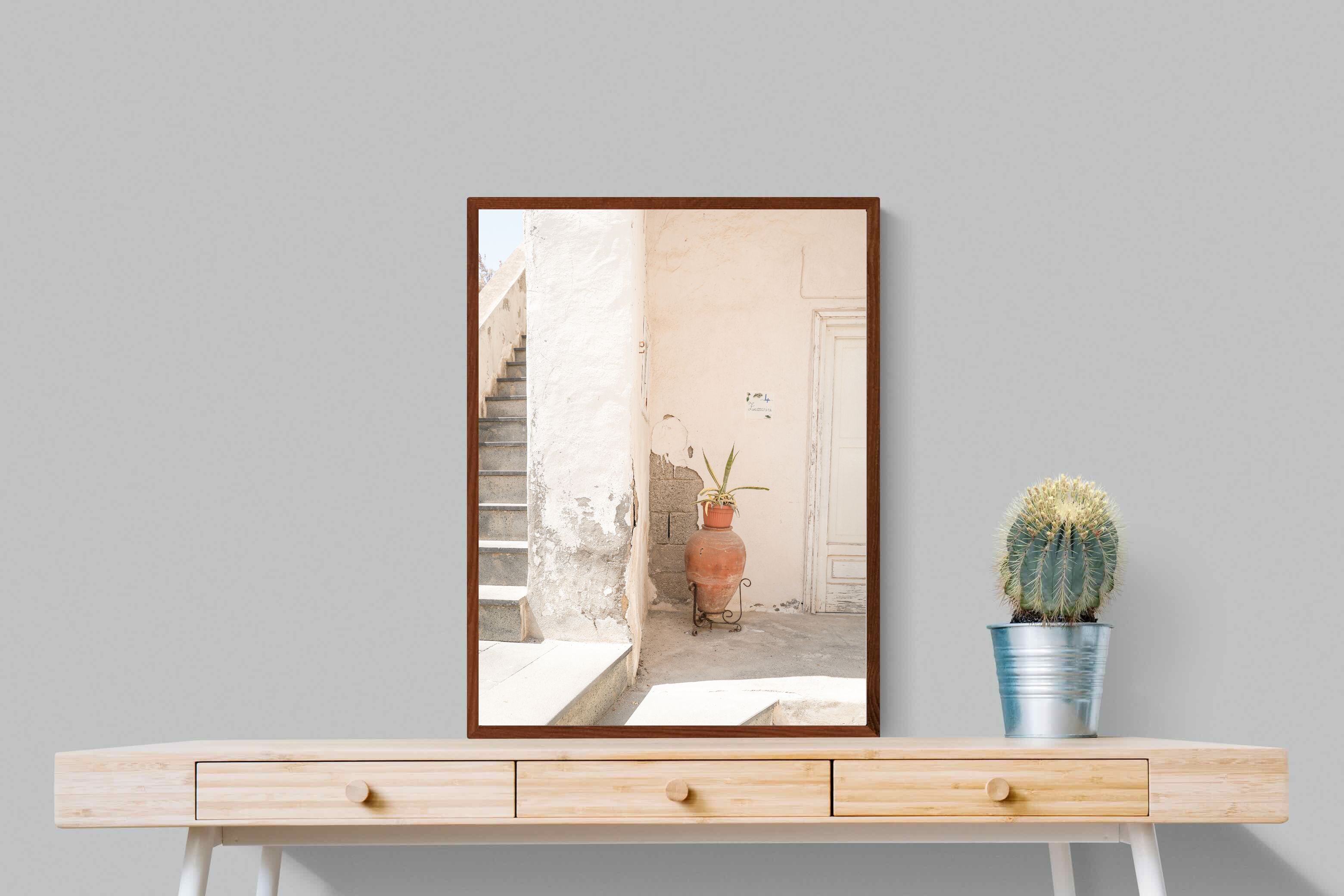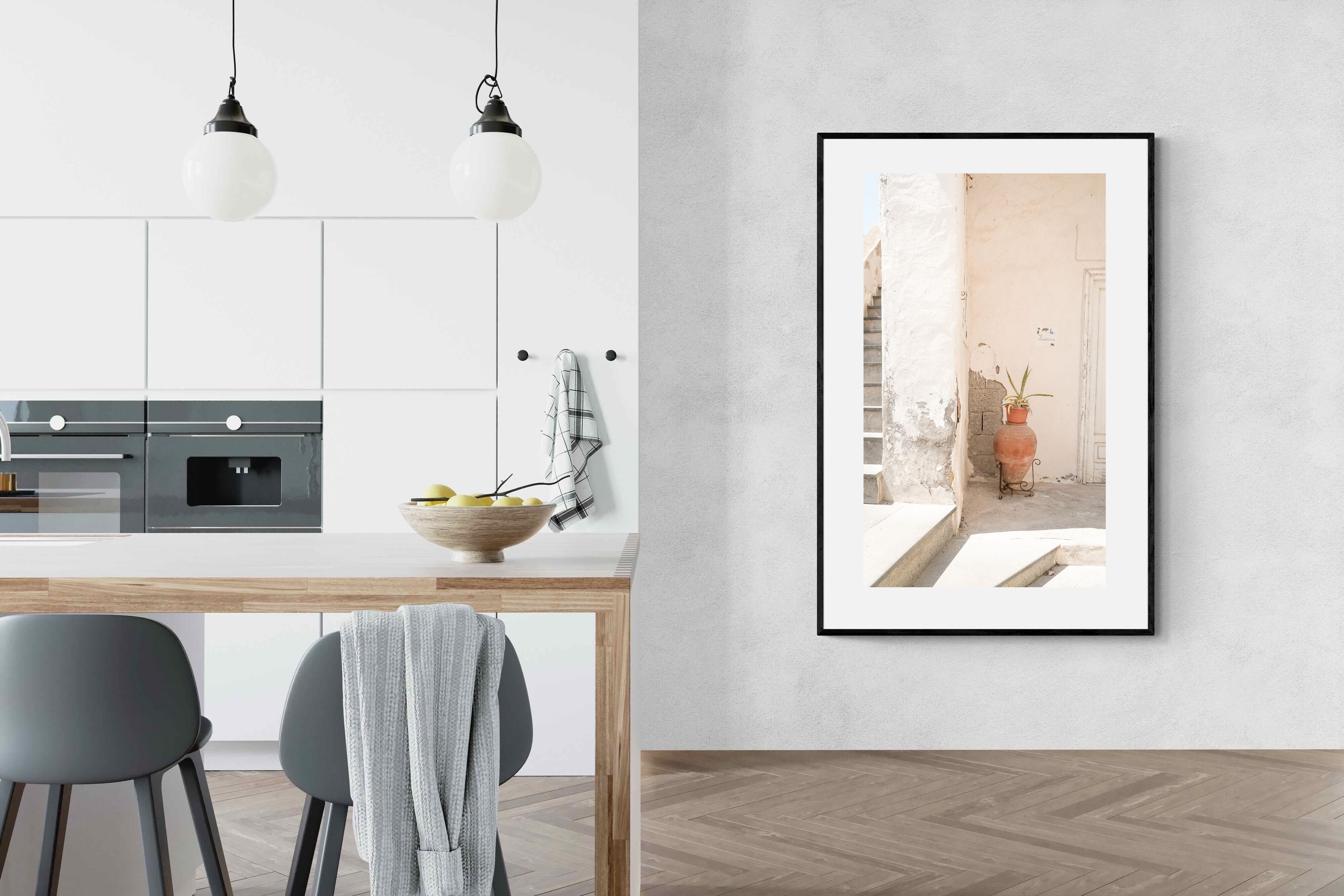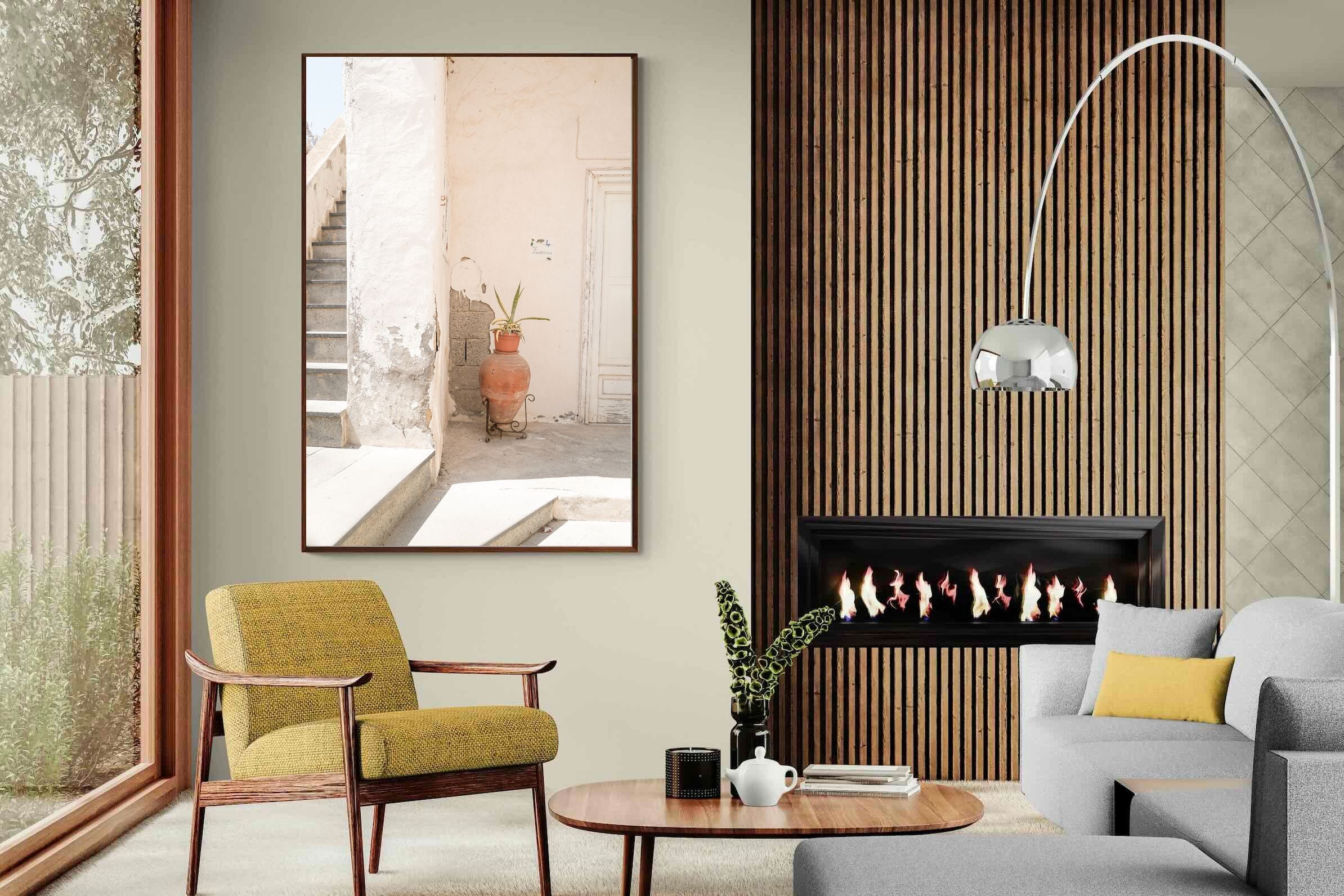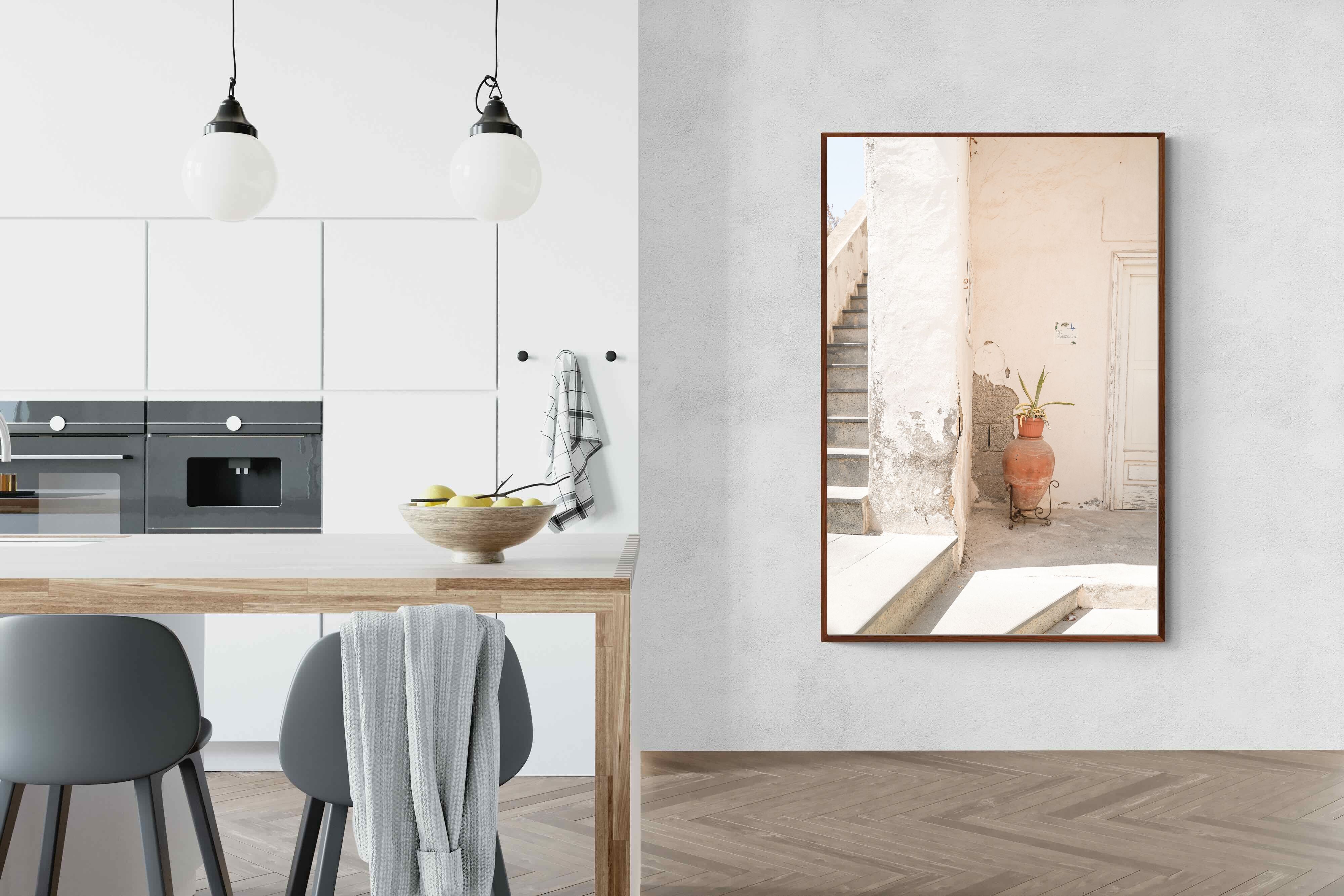 Terracotta Pot celebrates sunlit architectural detail, pairing textured plaster walls with a classic clay urn and soft green foliage. The interplay of warm neutrals and natural materials evokes relaxed Mediterranean living. Subtle light and shadow enhance the aged surfaces, creating a refined yet informal composition. Perfect for kitchens, entryways or modern rustic interiors, this artwork brings warmth, authenticity and effortless European charm into any thoughtfully styled space.