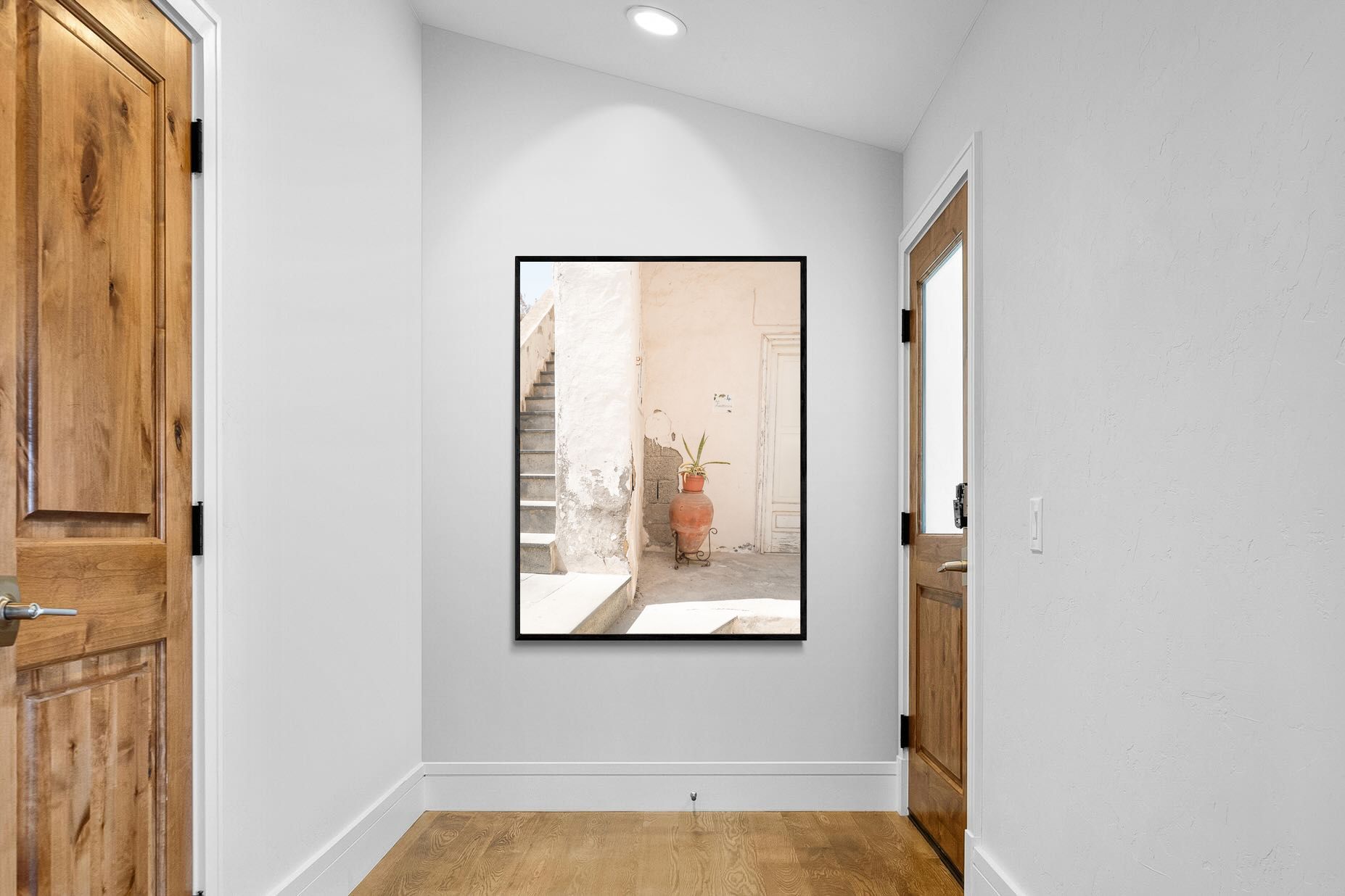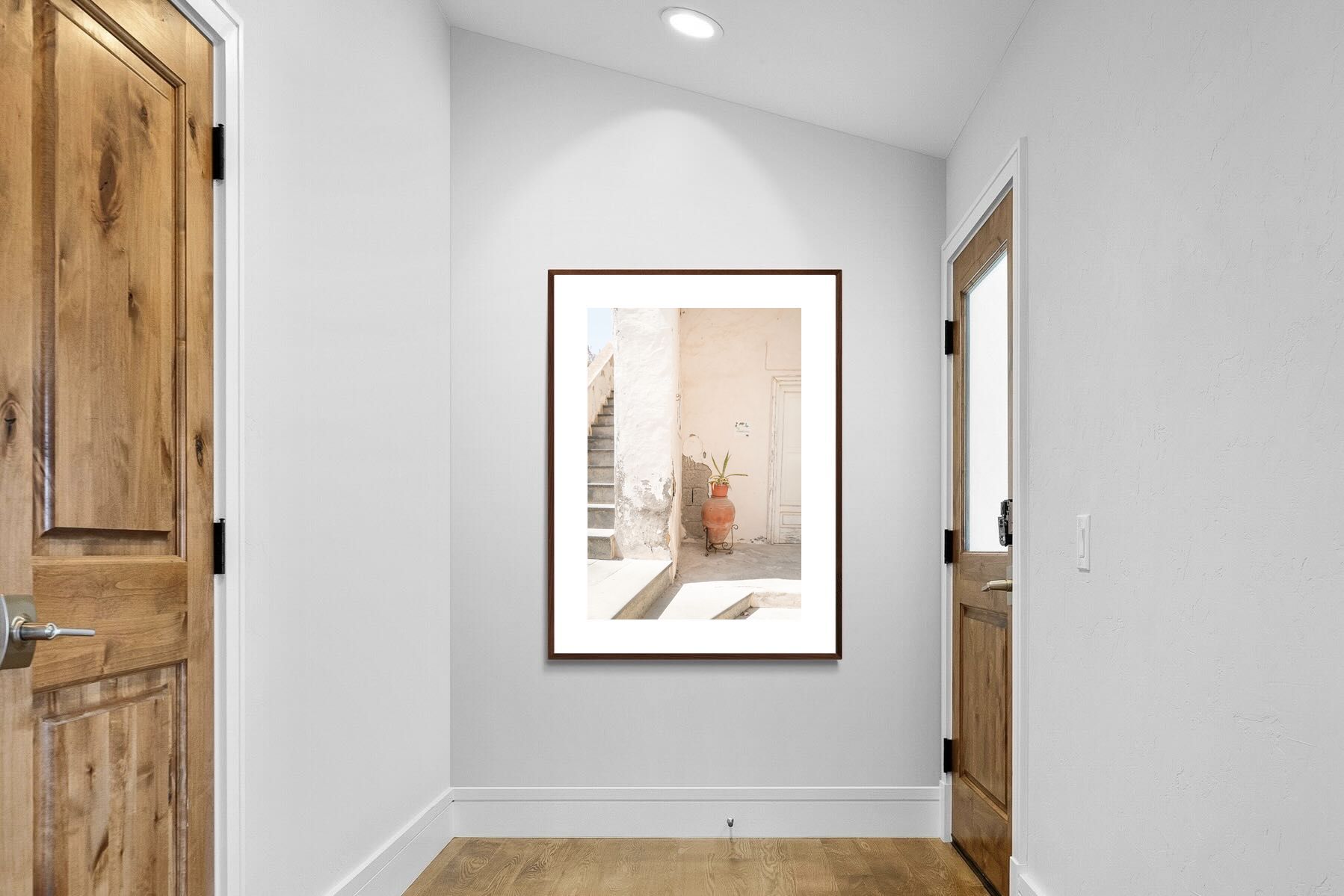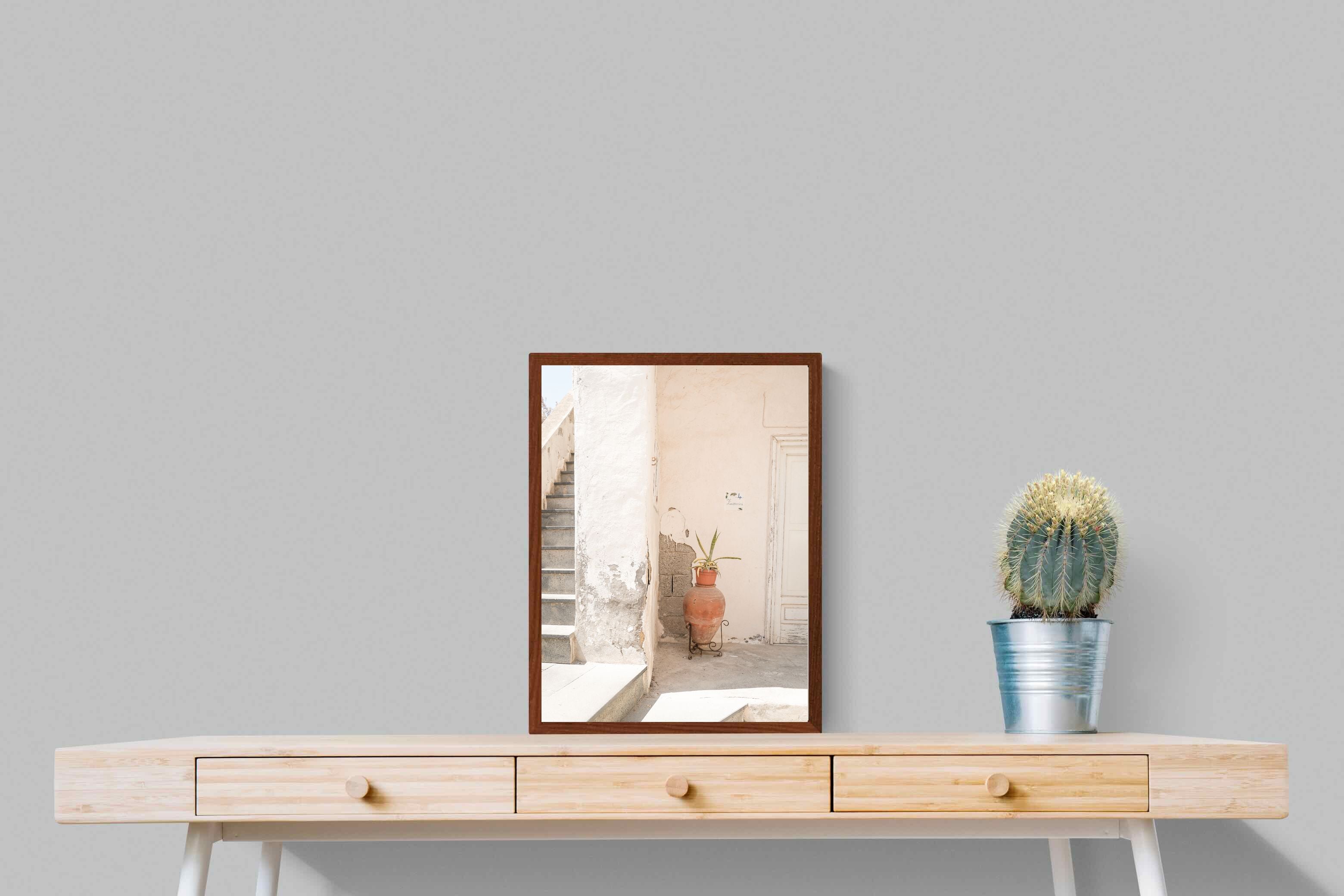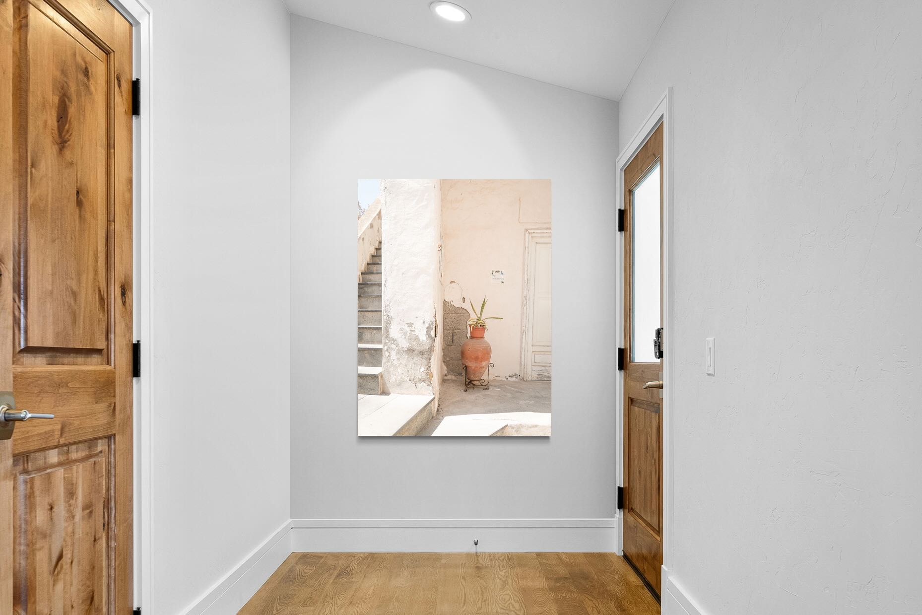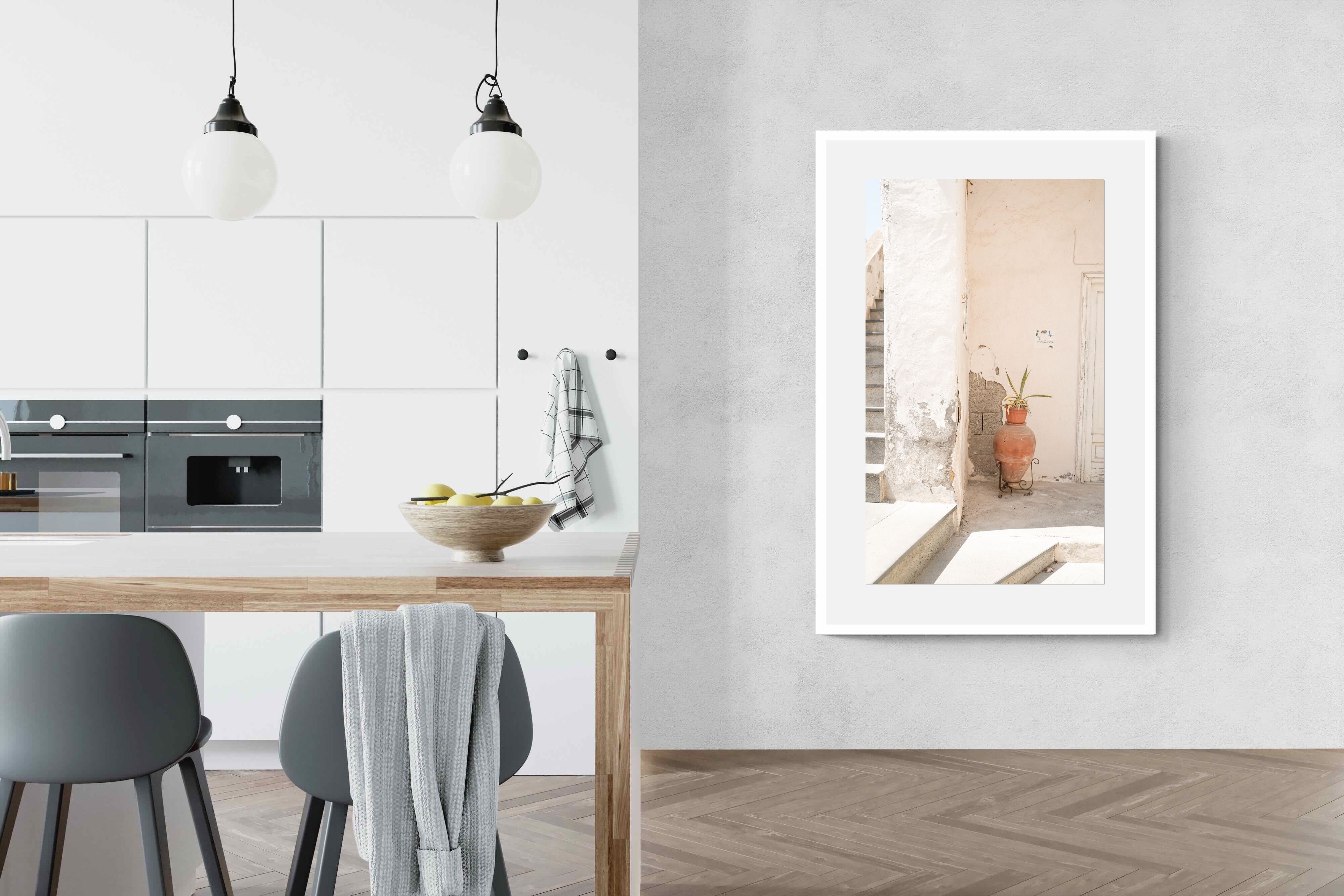 Terracotta Pot celebrates sunlit architectural detail, pairing textured plaster walls with a classic clay urn and soft green foliage. The interplay of warm neutrals and natural materials evokes relaxed Mediterranean living. Subtle light and shadow enhance the aged surfaces, creating a refined yet informal composition. Perfect for kitchens, entryways or modern rustic interiors, this artwork brings warmth, authenticity and effortless European charm into any thoughtfully styled space.