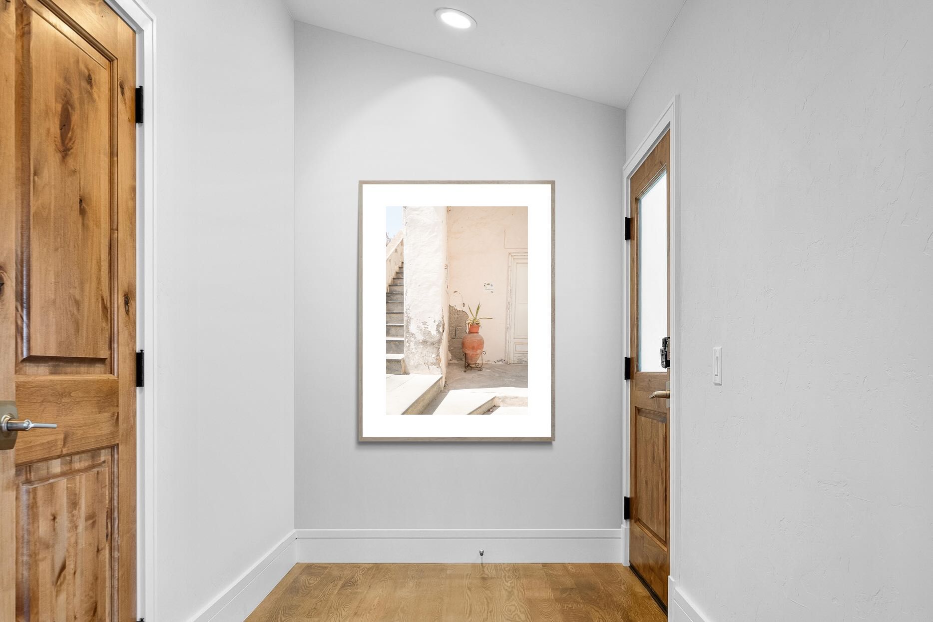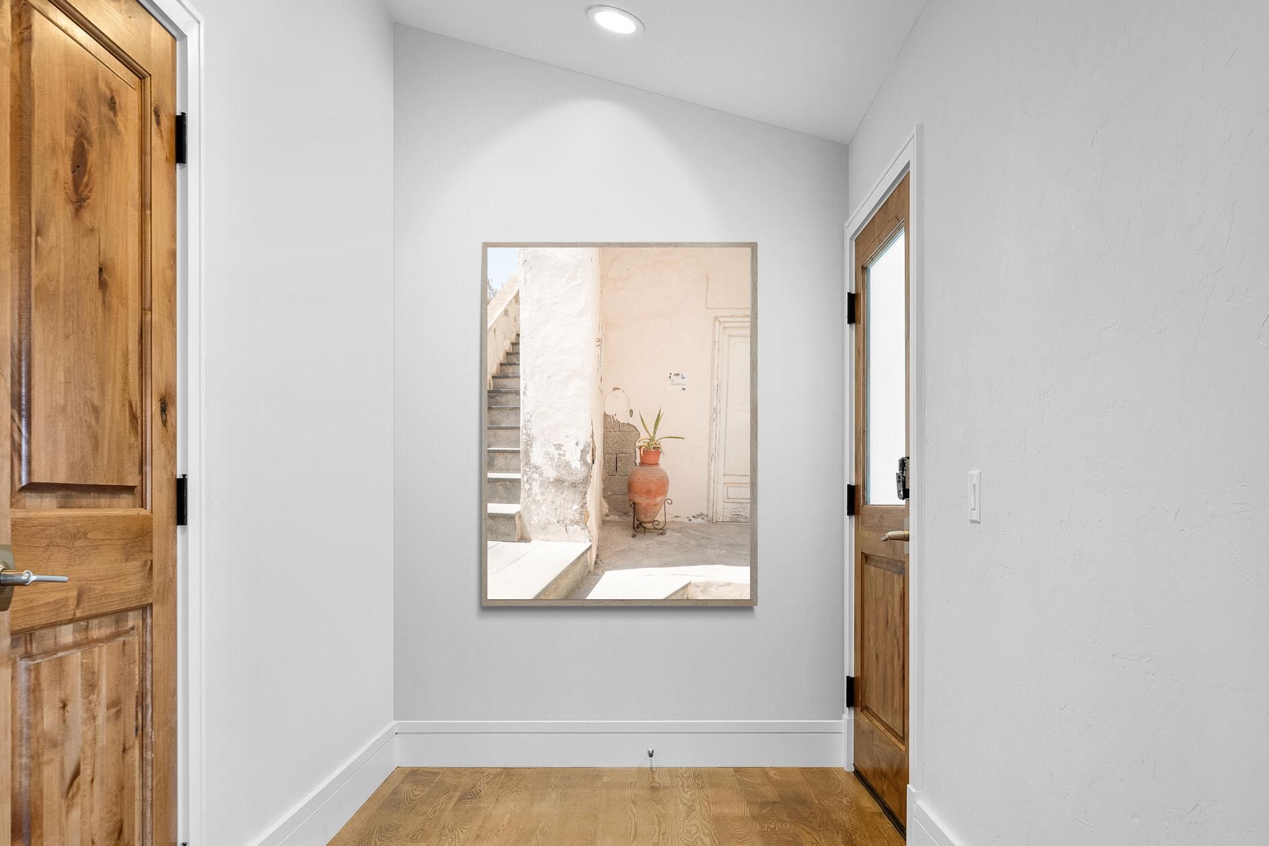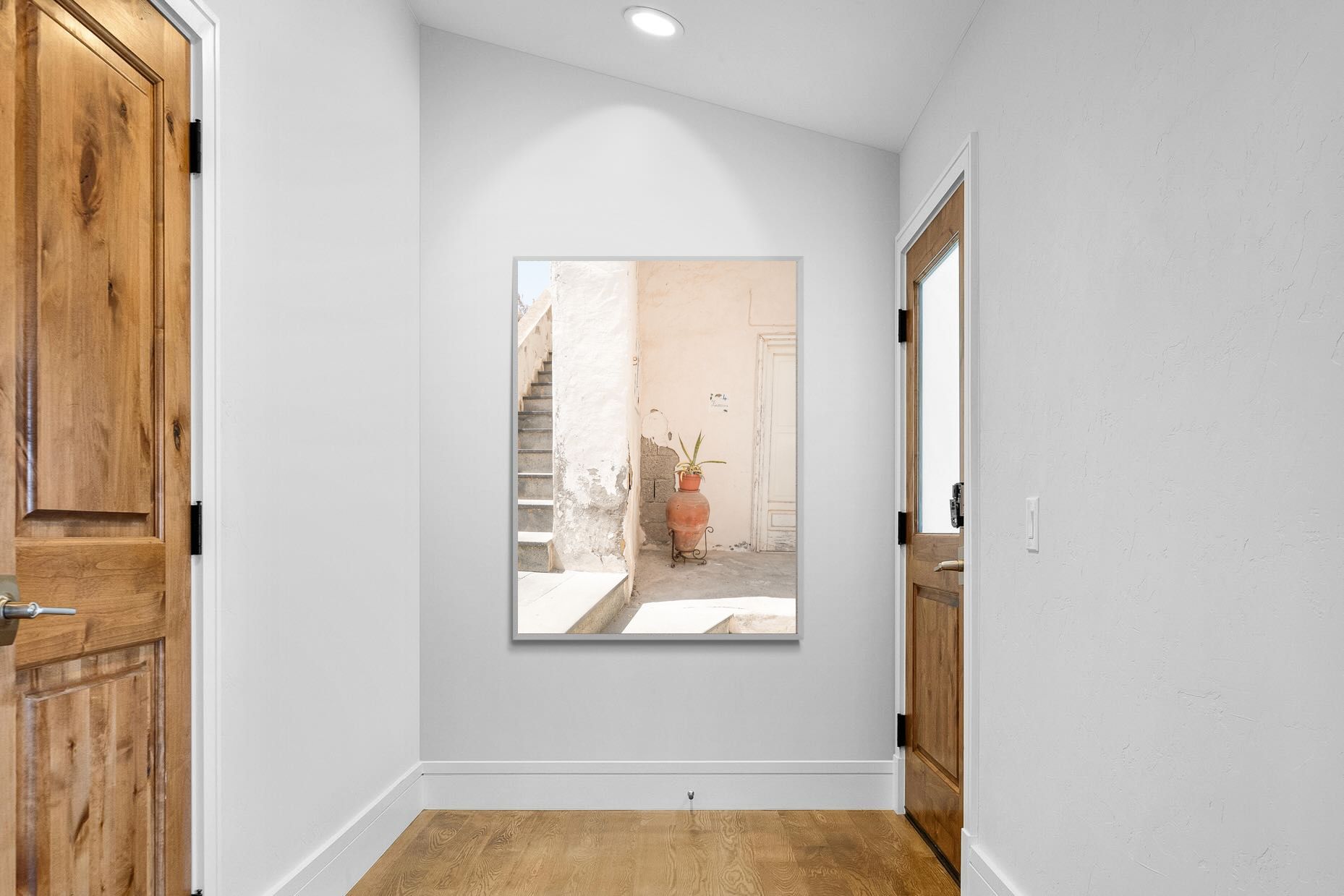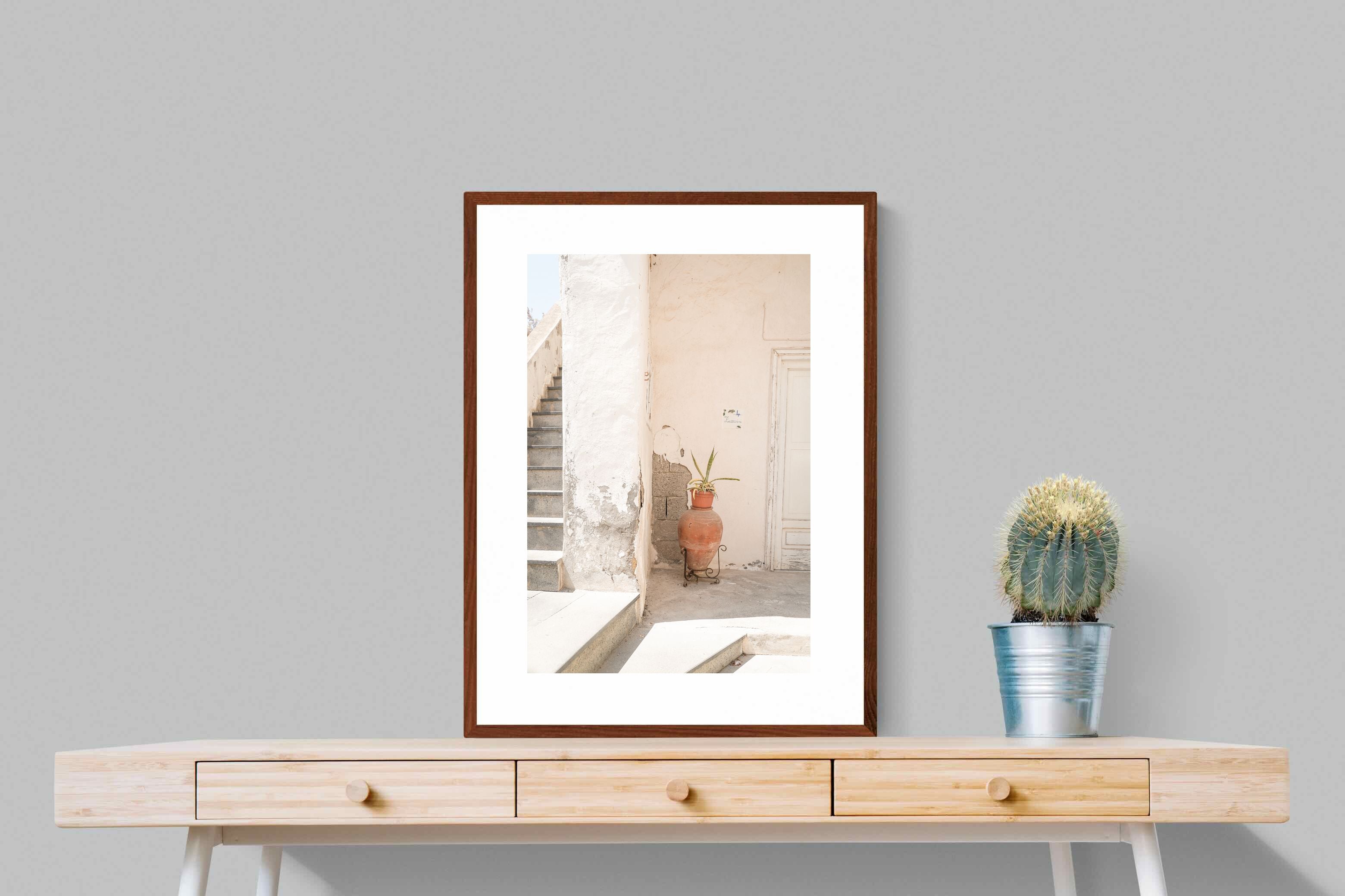 Terracotta Pot celebrates sunlit architectural detail, pairing textured plaster walls with a classic clay urn and soft green foliage. The interplay of warm neutrals and natural materials evokes relaxed Mediterranean living. Subtle light and shadow enhance the aged surfaces, creating a refined yet informal composition. Perfect for kitchens, entryways or modern rustic interiors, this artwork brings warmth, authenticity and effortless European charm into any thoughtfully styled space.