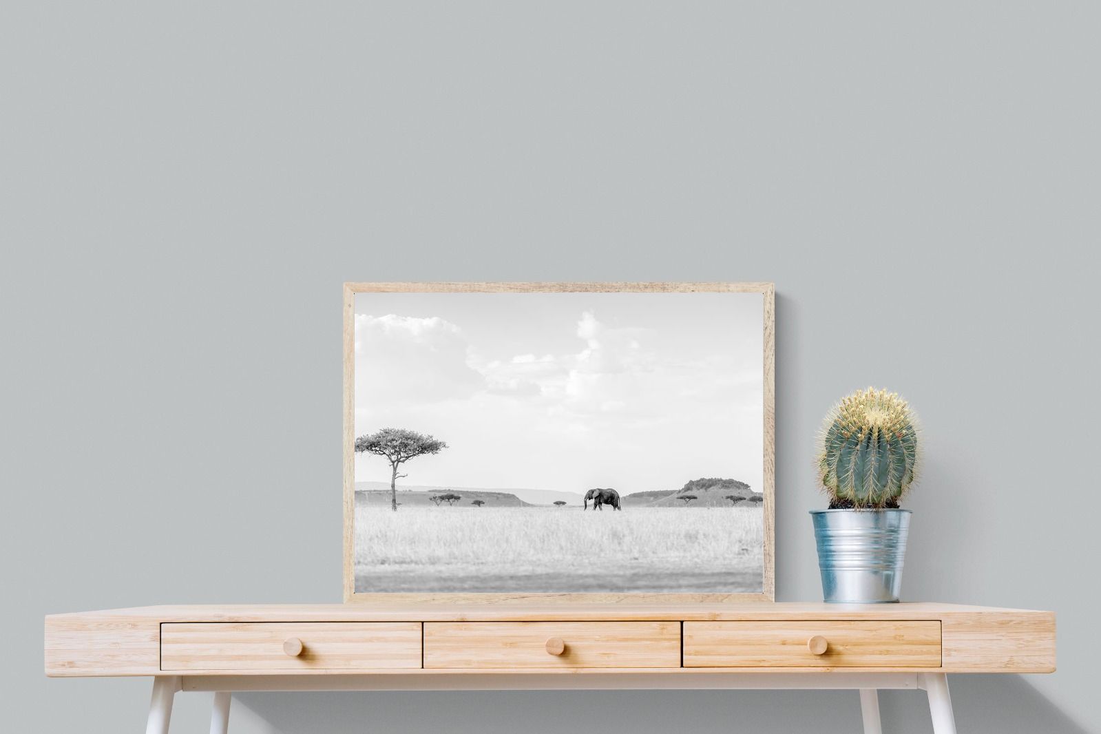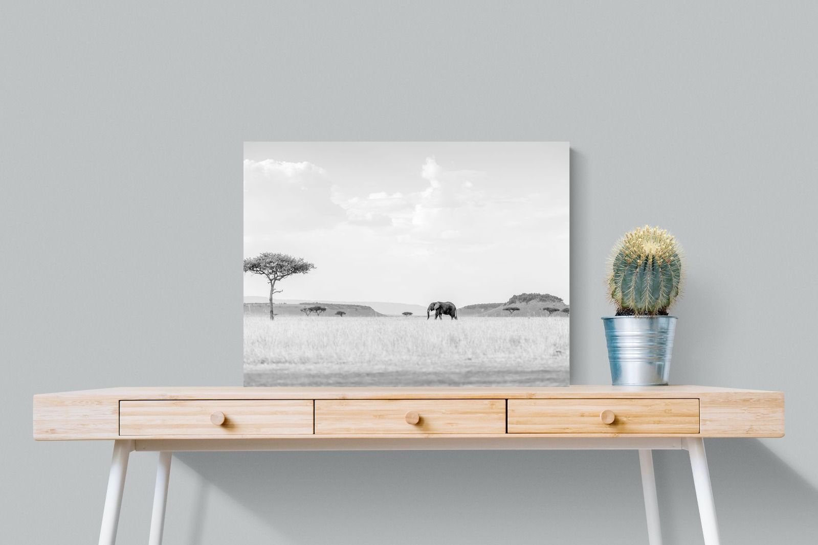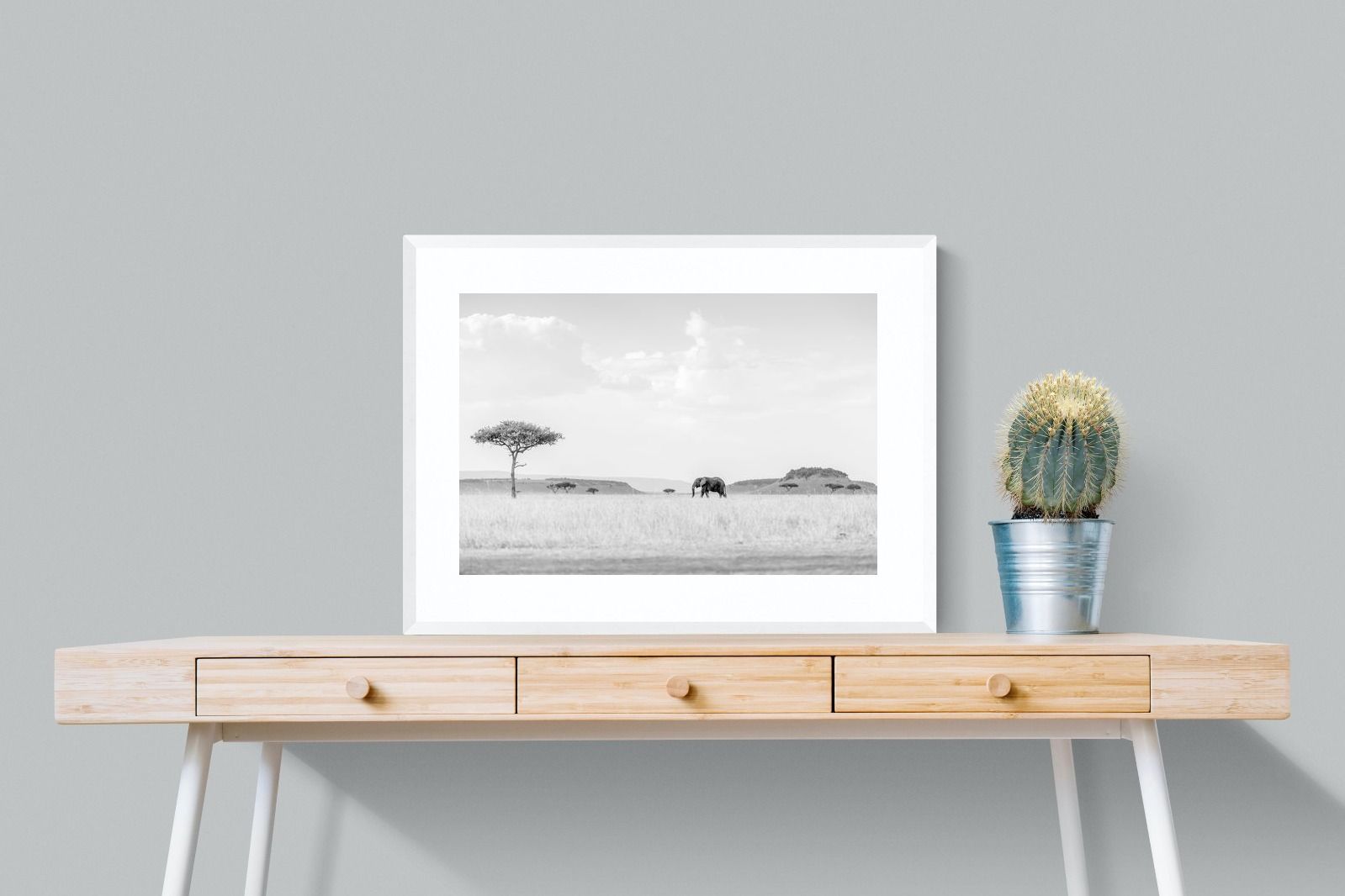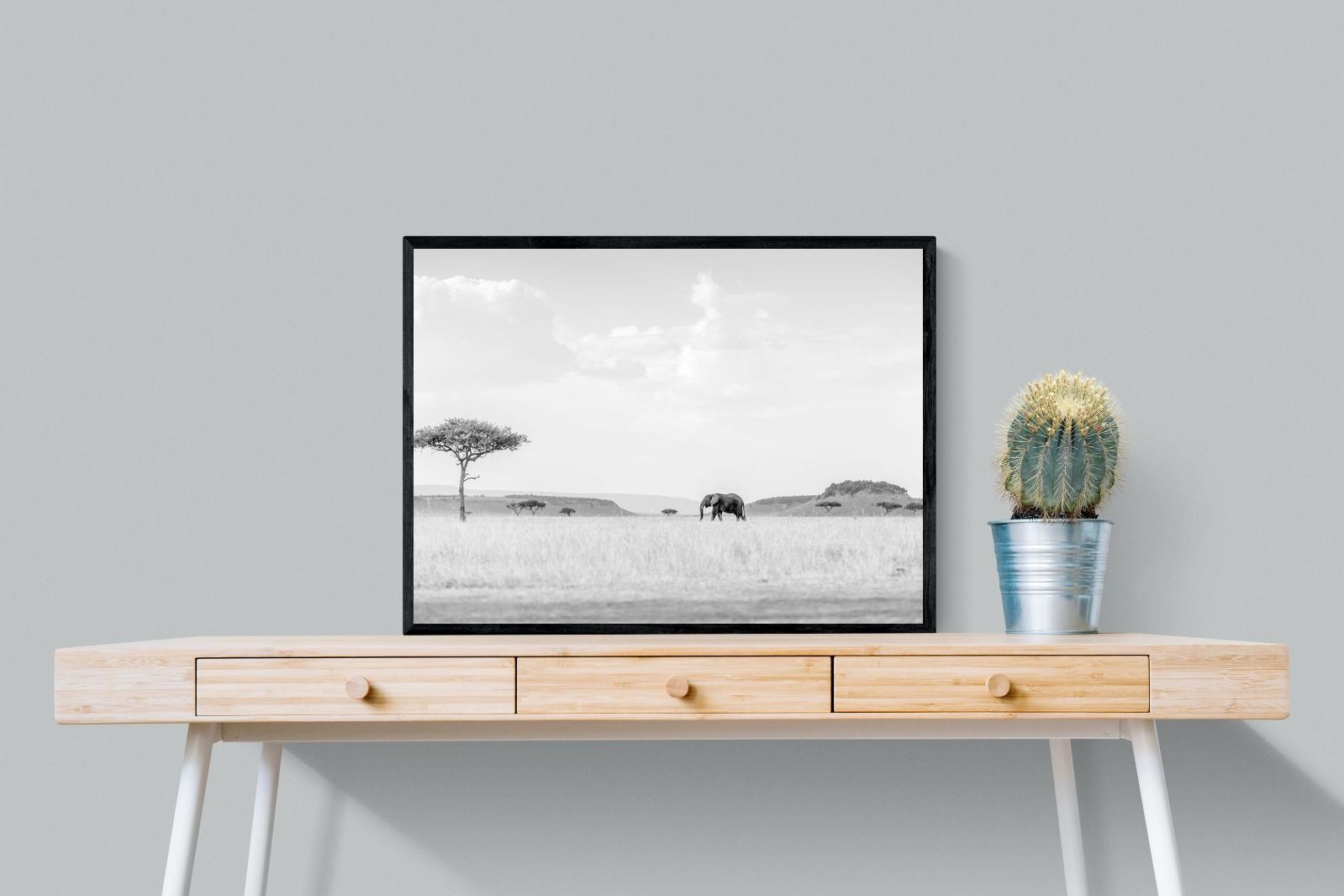 High Key Savannah Elephant Wall Art – Black and White African Landscape Print