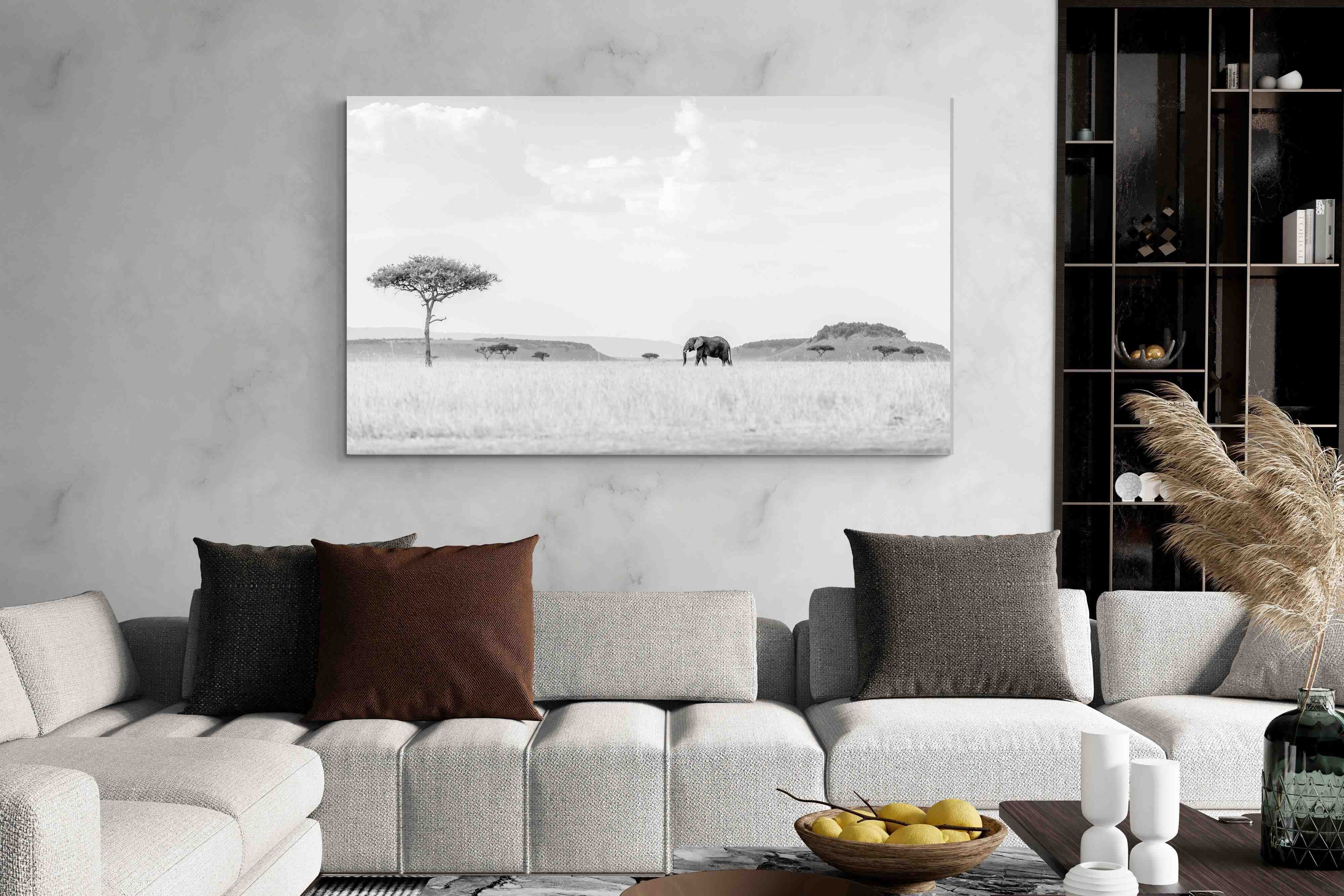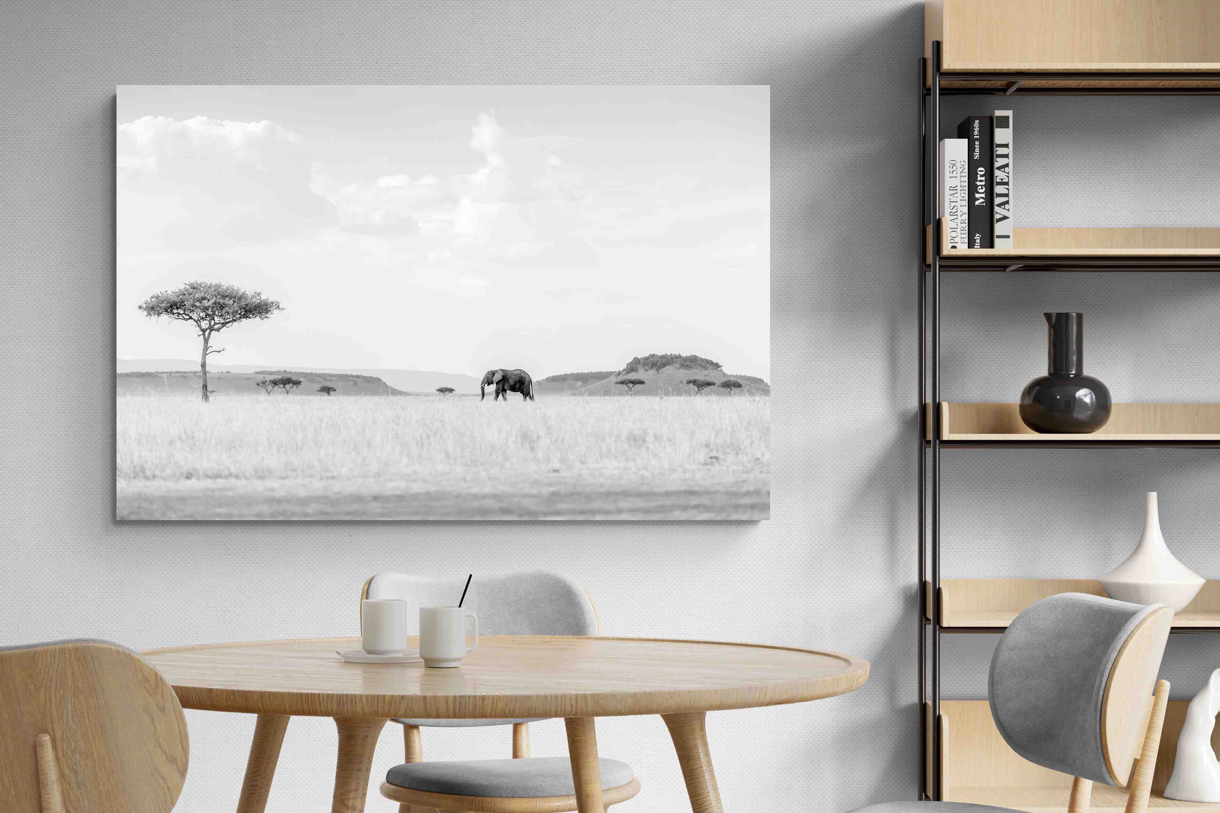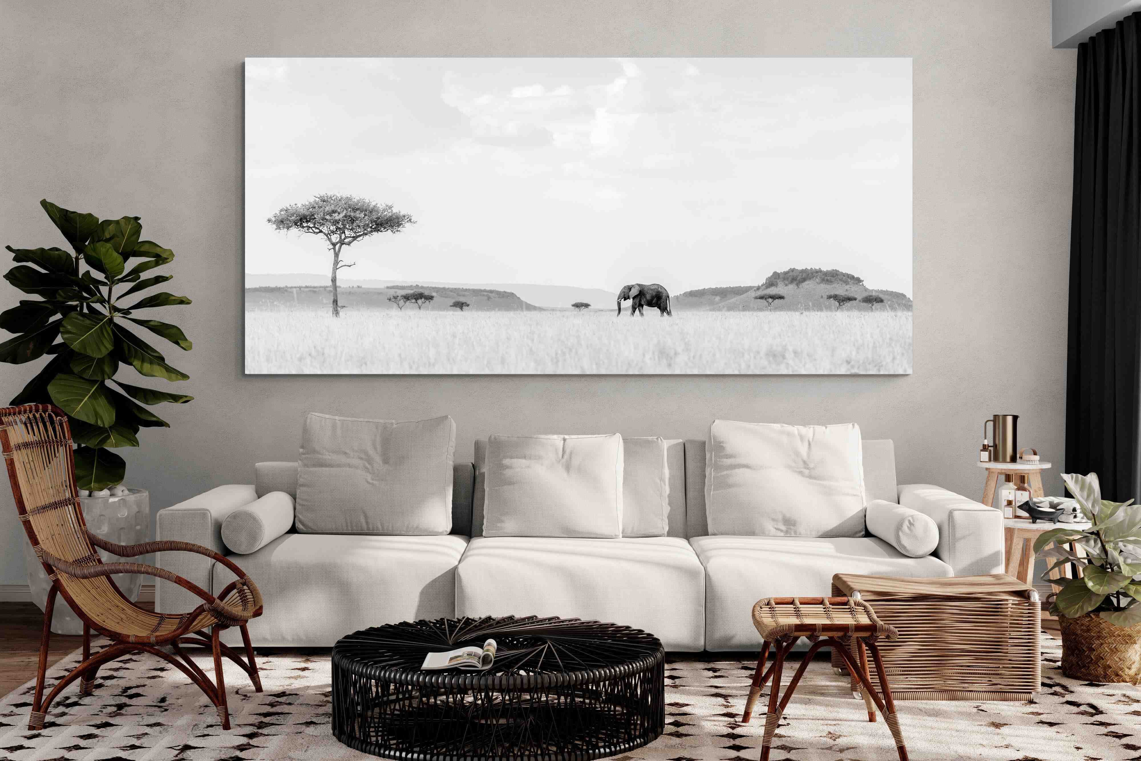This high-key black and white photograph captures a lone elephant moving quietly across open savannah, framed by scattered acacia trees and distant rolling hills. The soft tonal palette and expansive negative space create a calm, minimalist composition with powerful presence. Ideal for contemporary interiors, safari-inspired spaces or monochrome décor schemes, this piece brings scale, serenity and understated African drama to a feature wall. A refined wildlife statement with timeless appeal.