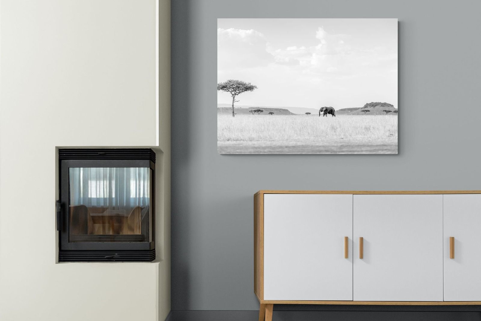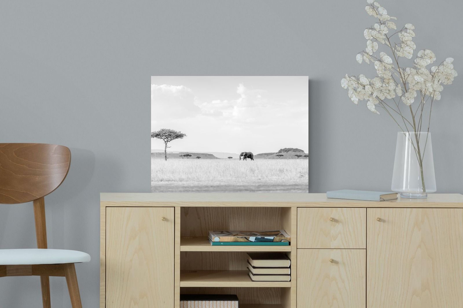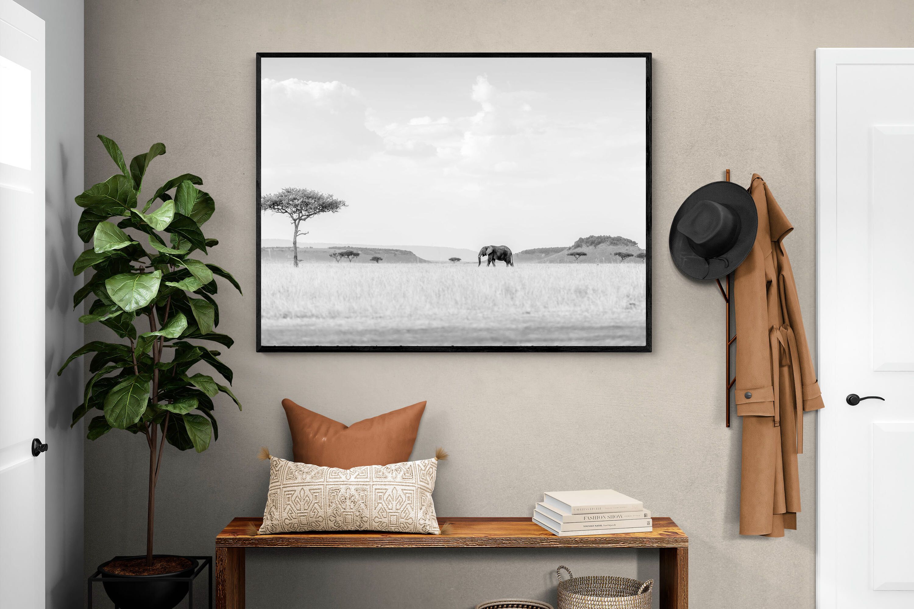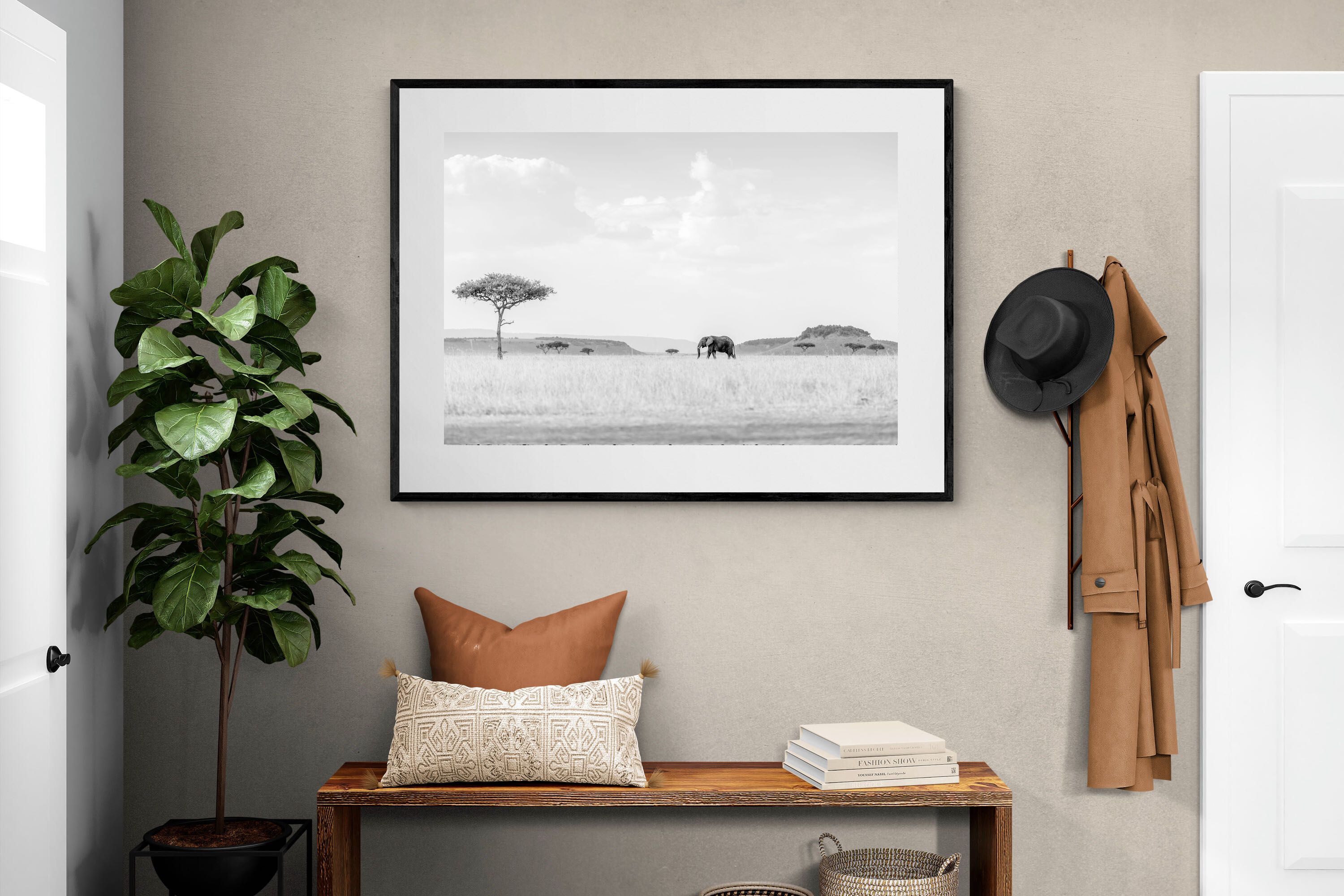 This high-key black and white photograph captures a lone elephant moving quietly across open savannah, framed by scattered acacia trees and distant rolling hills. The soft tonal palette and expansive negative space create a calm, minimalist composition with powerful presence. Ideal for contemporary interiors, safari-inspired spaces or monochrome décor schemes, this piece brings scale, serenity and understated African drama to a feature wall. A refined wildlife statement with timeless appeal.