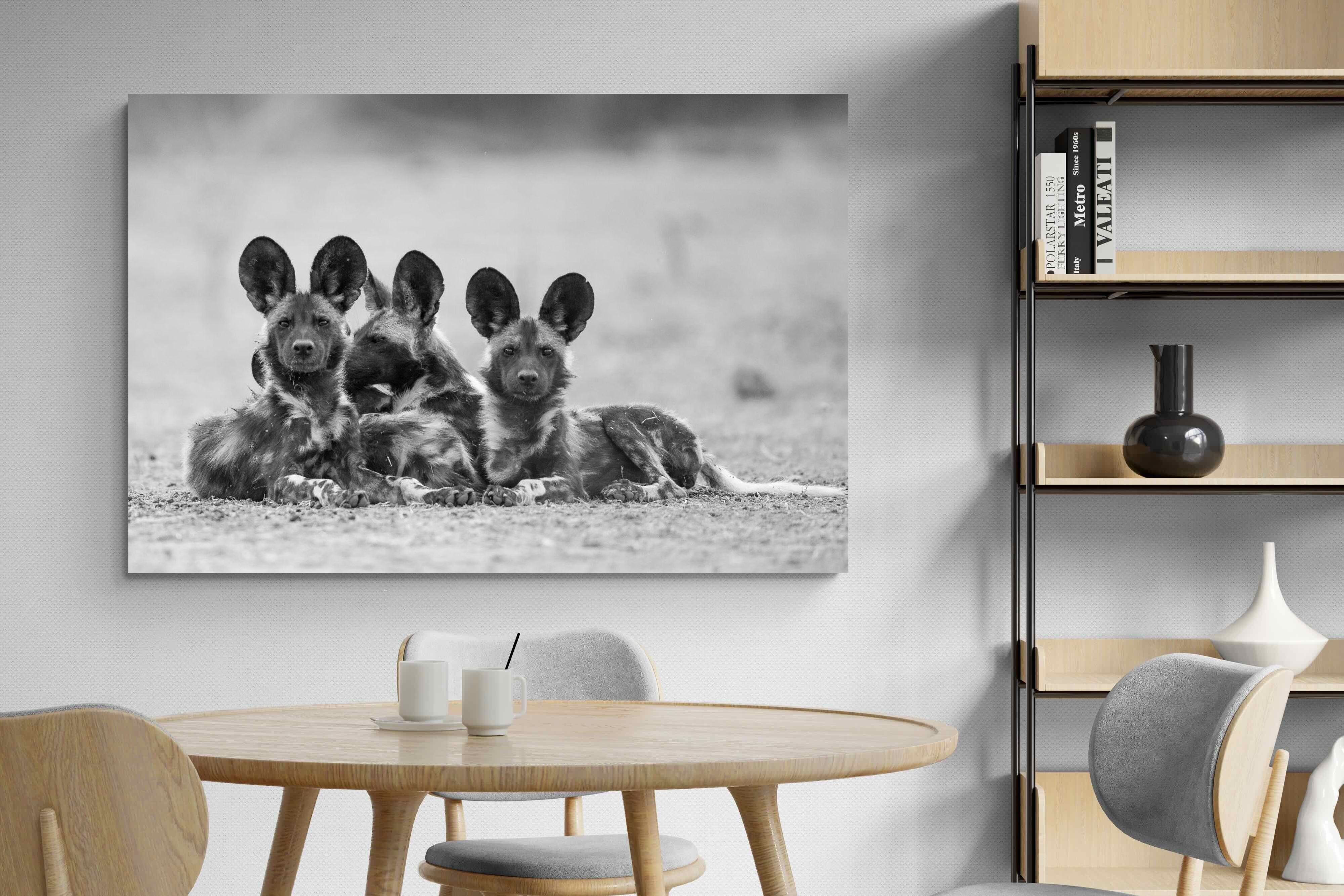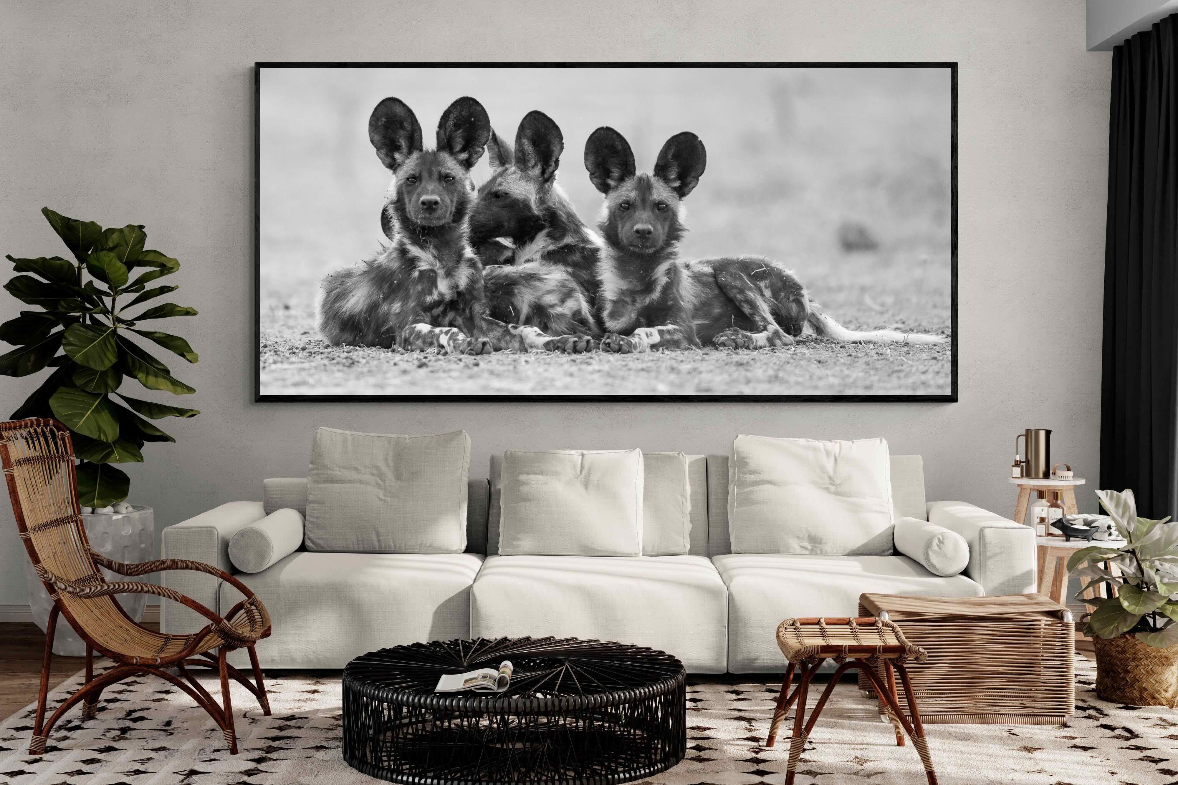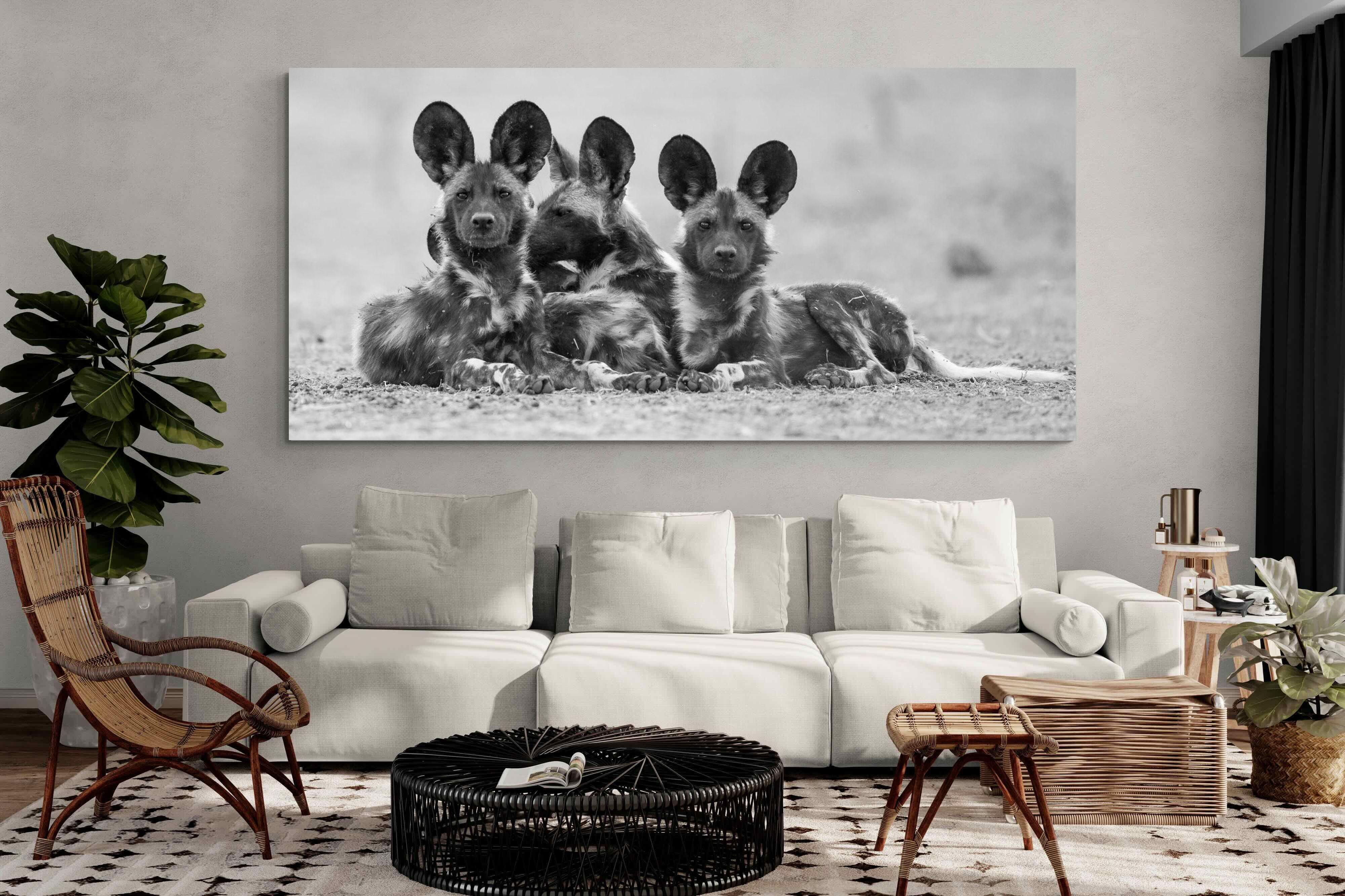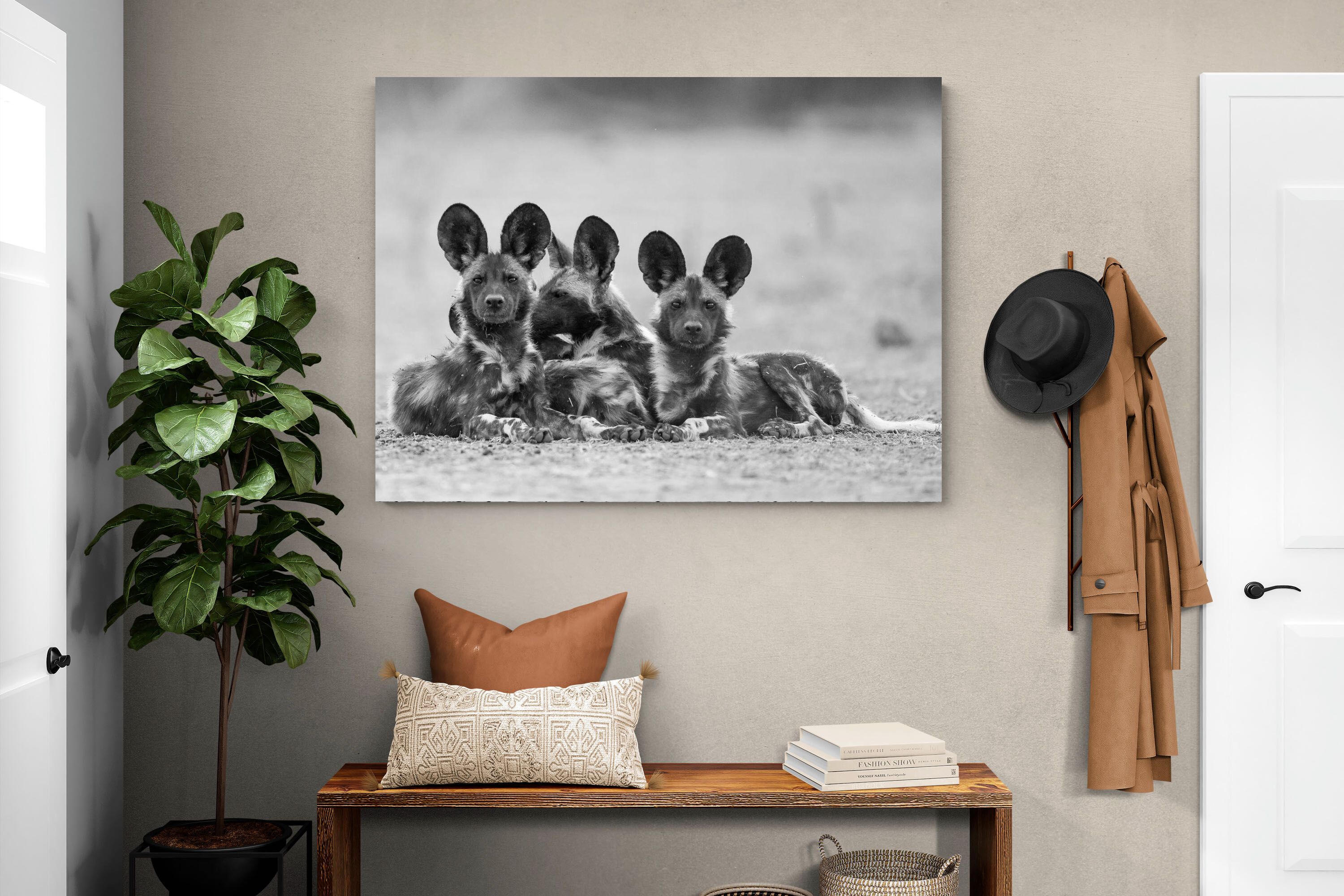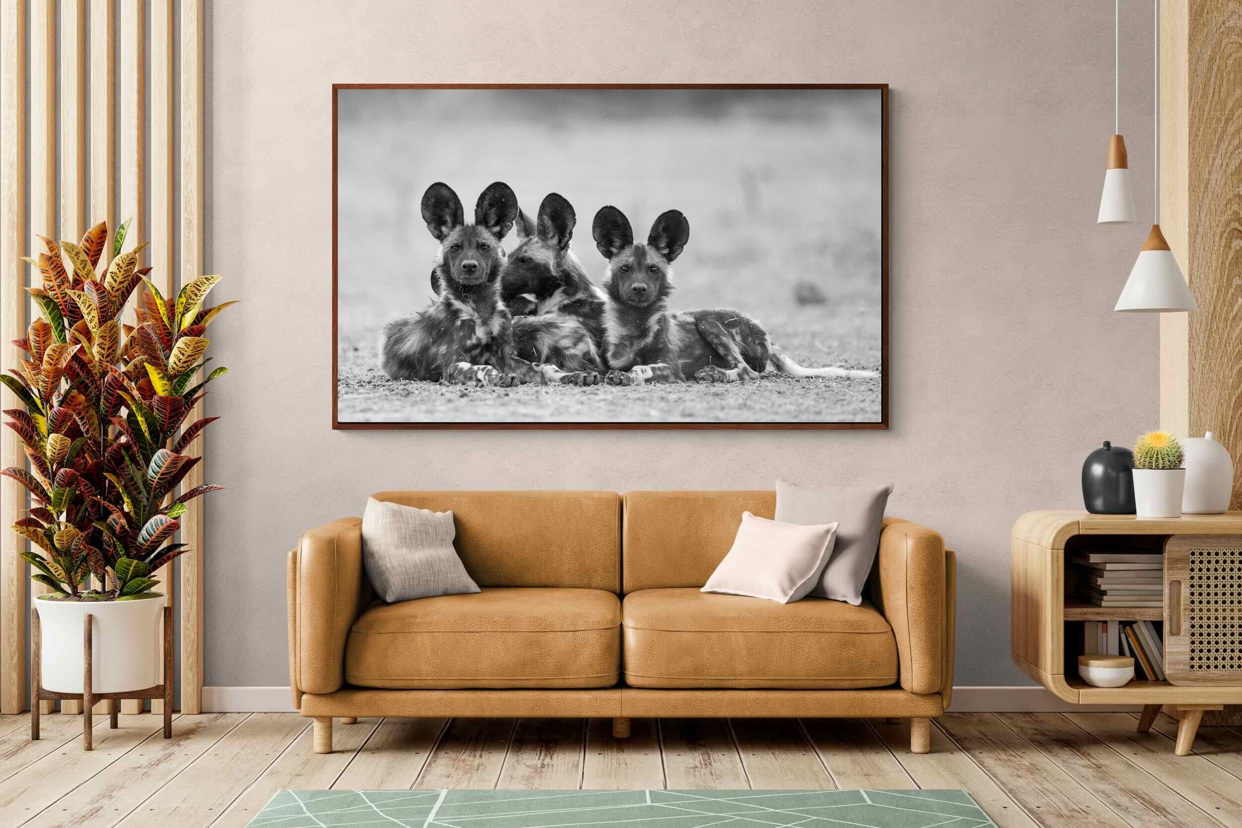 Wild Kin presents three African wild dogs in a beautifully balanced black and white composition. Their alert expressions and distinctive markings create both intimacy and strength. The monochrome palette enhances texture and detail, making this wildlife portrait refined and timeless. Ideal for safari-inspired interiors, modern spaces, studies or nature-led homes wanting understated yet powerful African character.