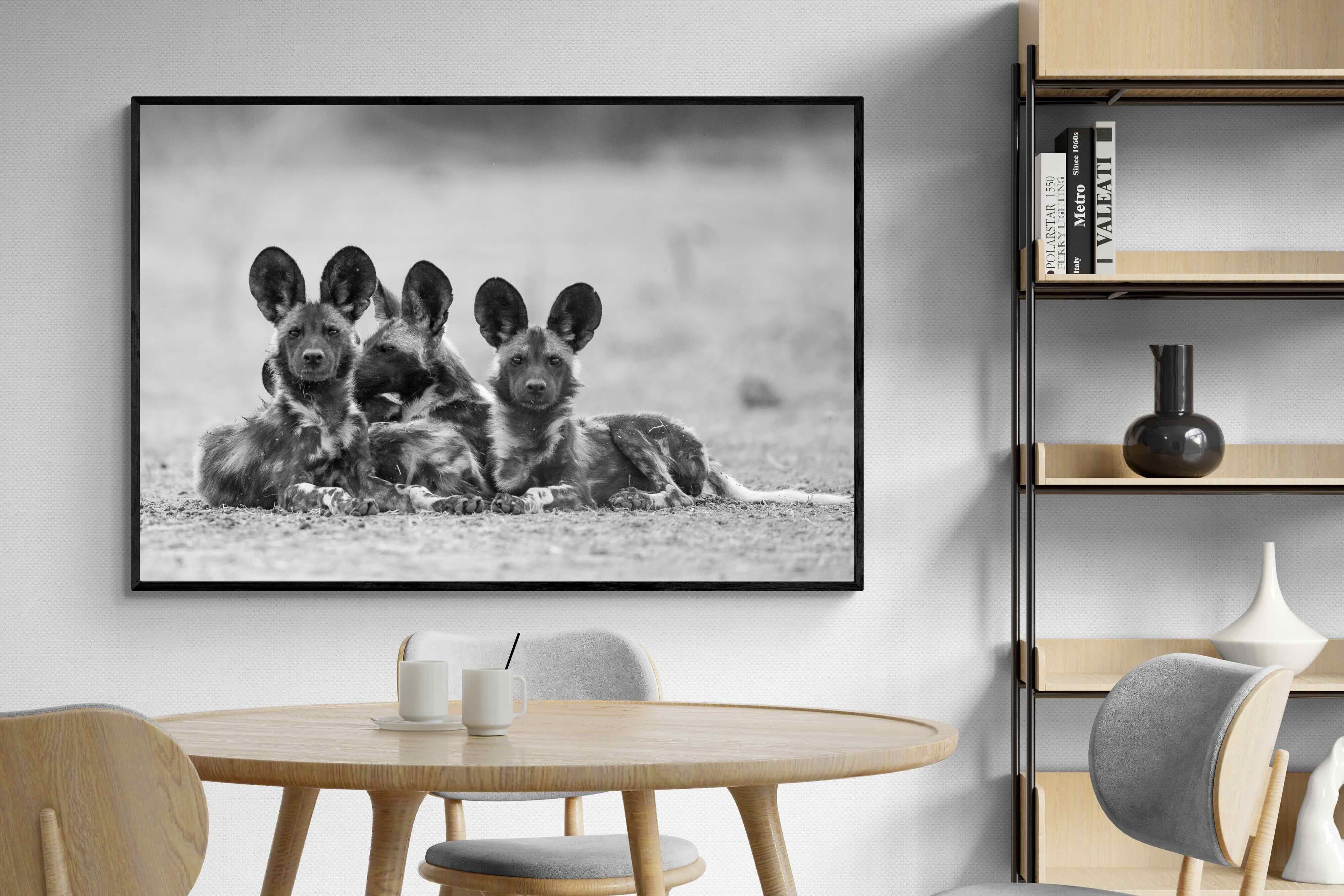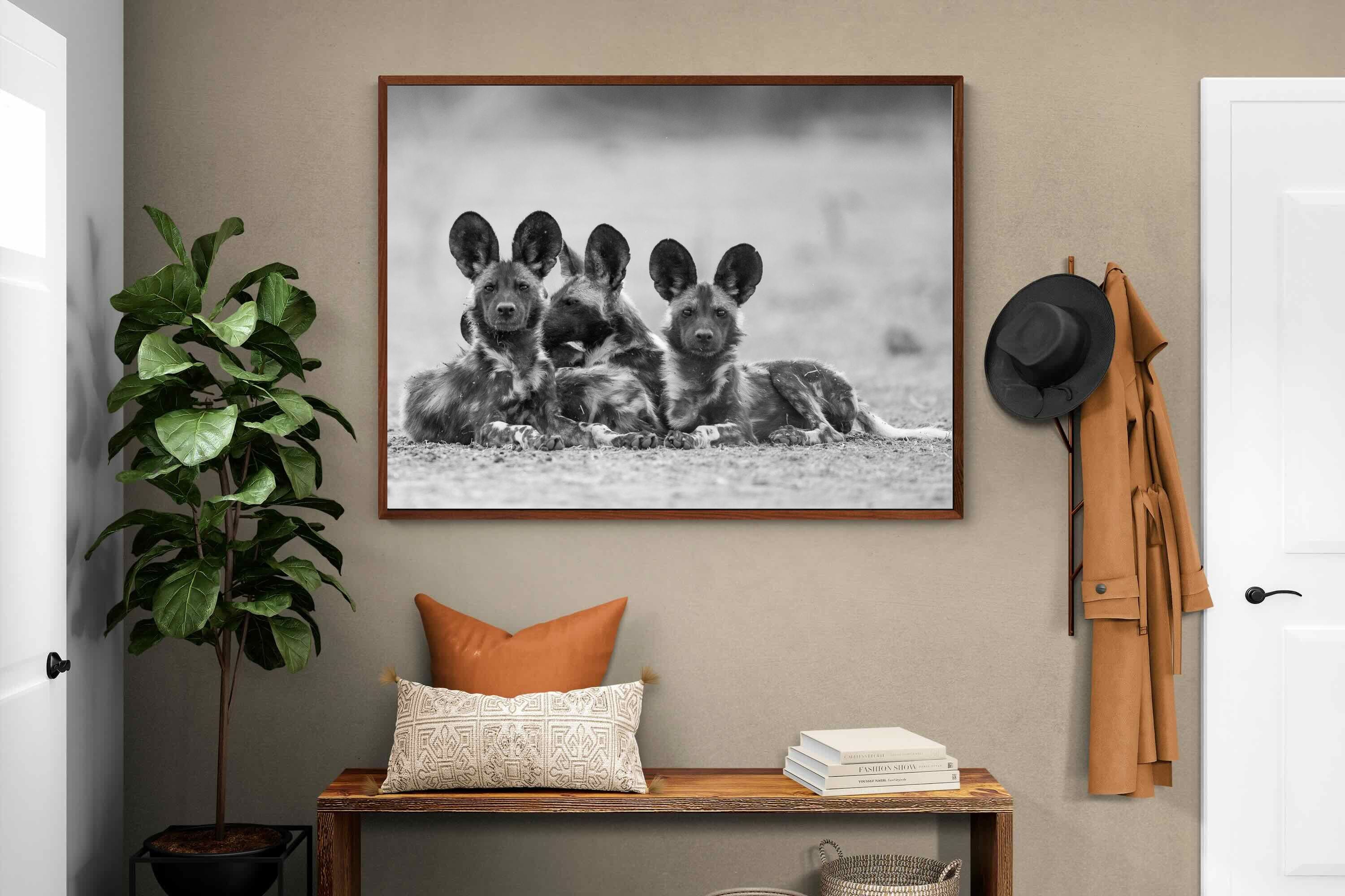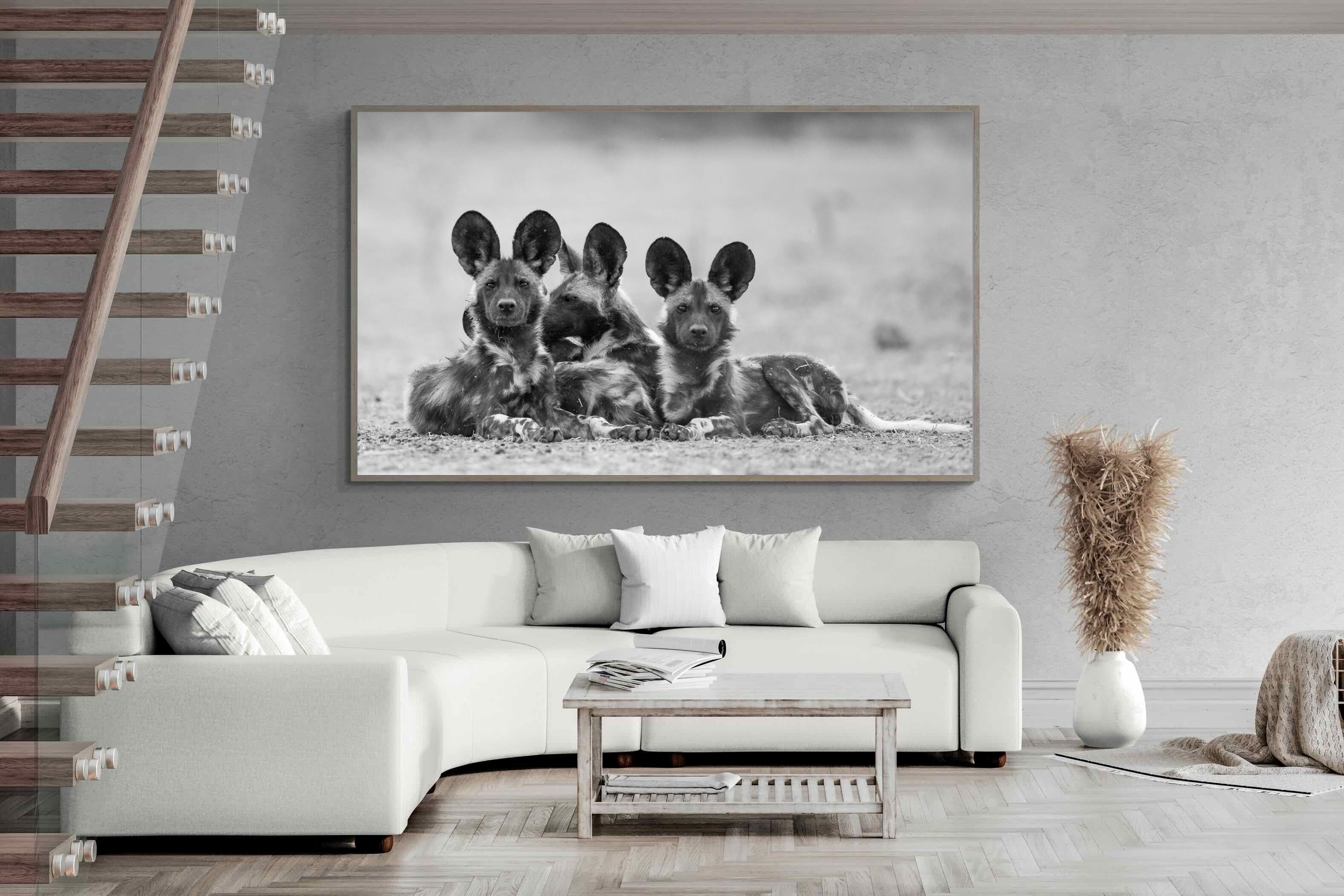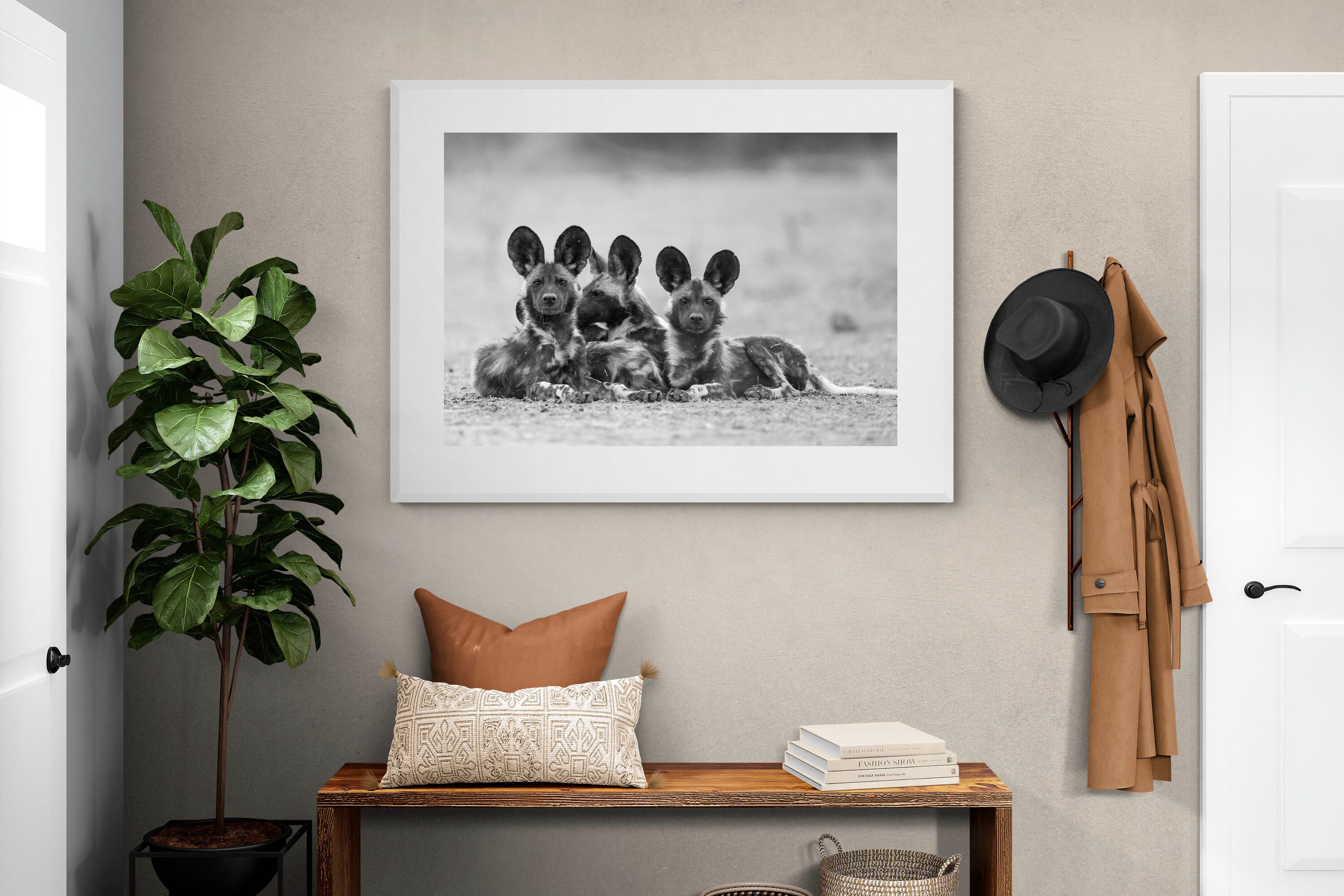 Wild Kin presents three African wild dogs in a beautifully balanced black and white composition. Their alert expressions and distinctive markings create both intimacy and strength. The monochrome palette enhances texture and detail, making this wildlife portrait refined and timeless. Ideal for safari-inspired interiors, modern spaces, studies or nature-led homes wanting understated yet powerful African character.