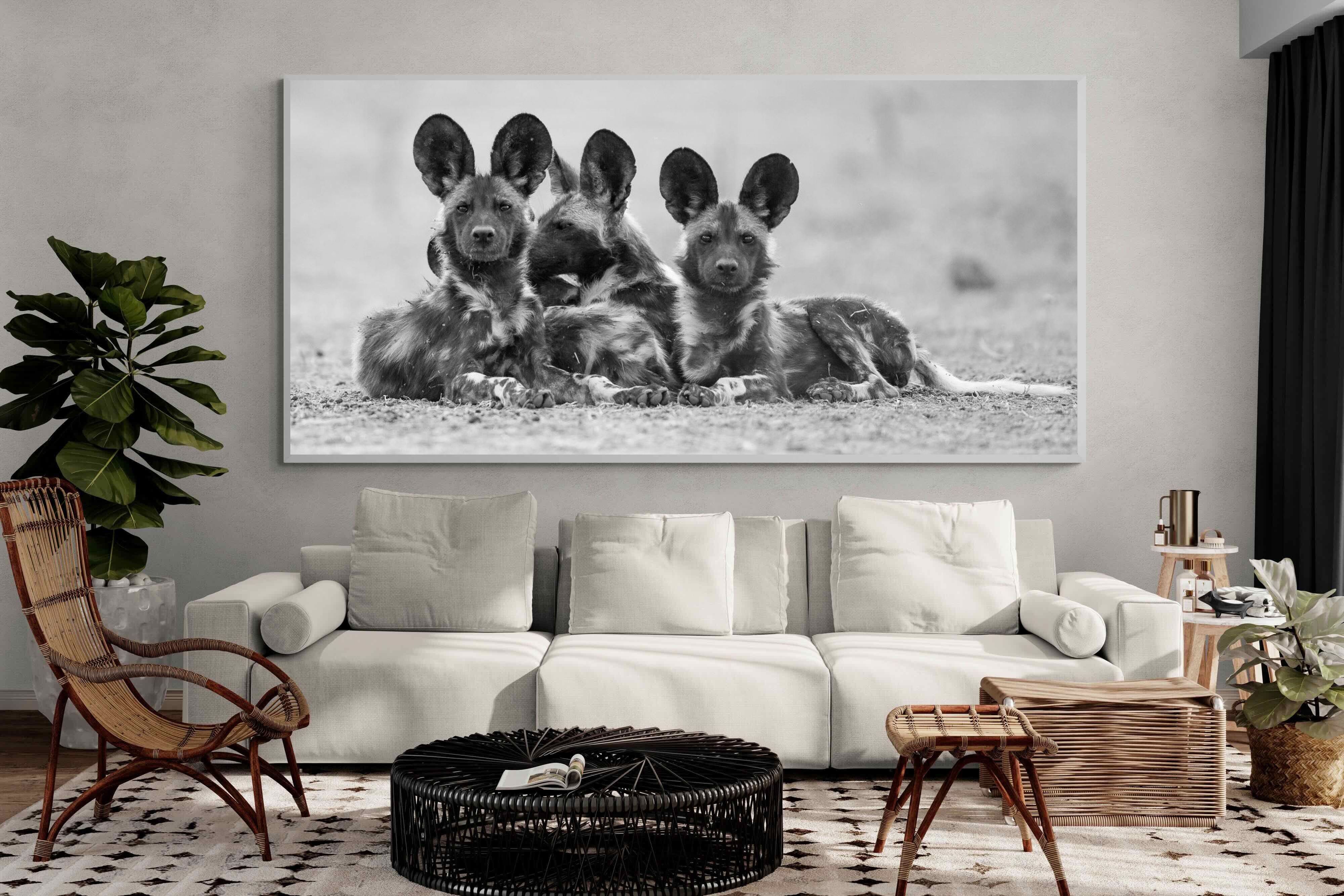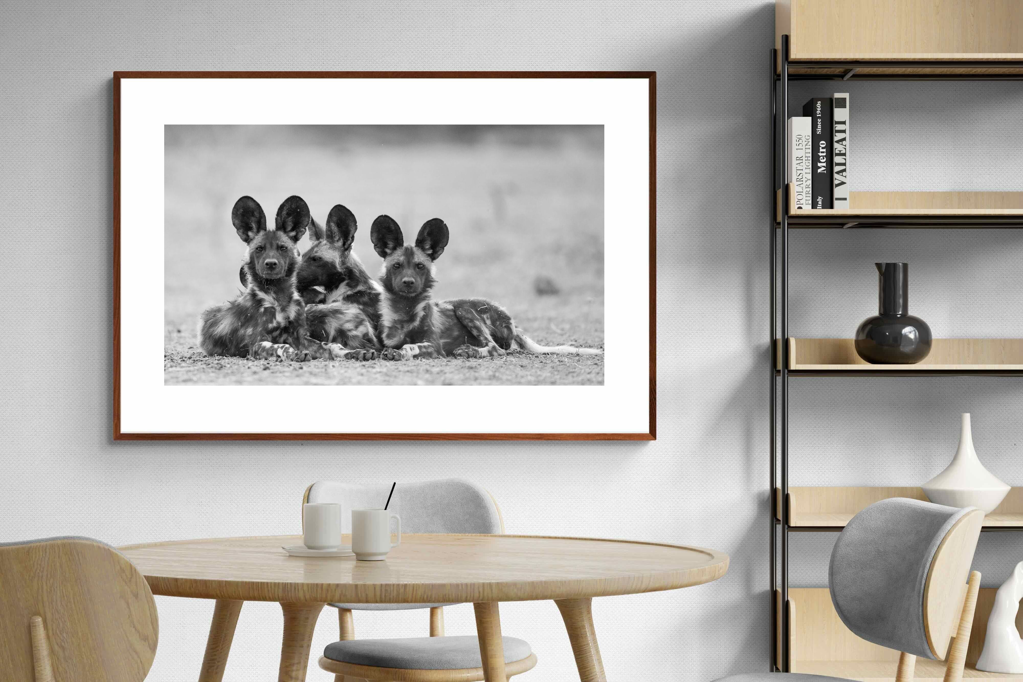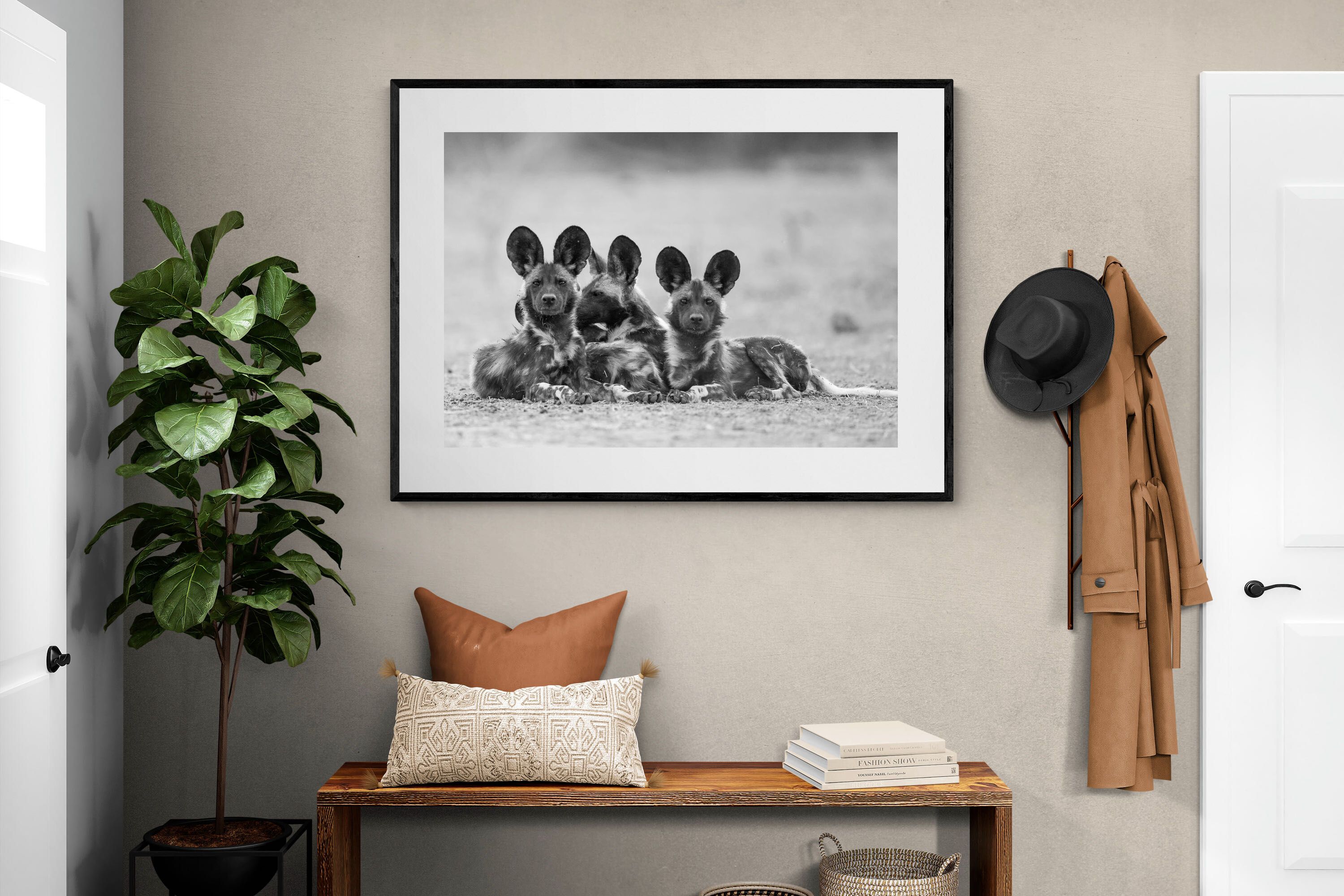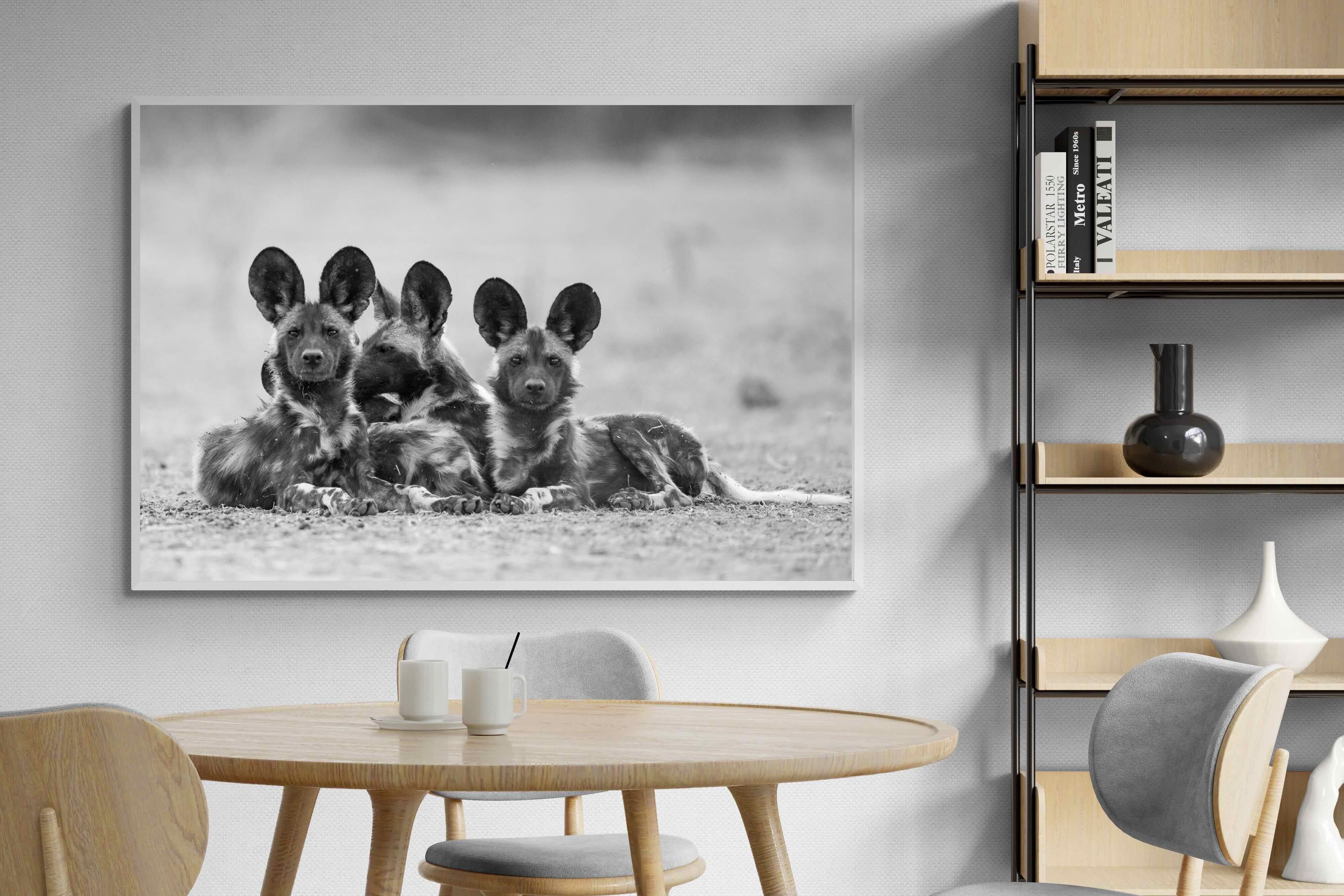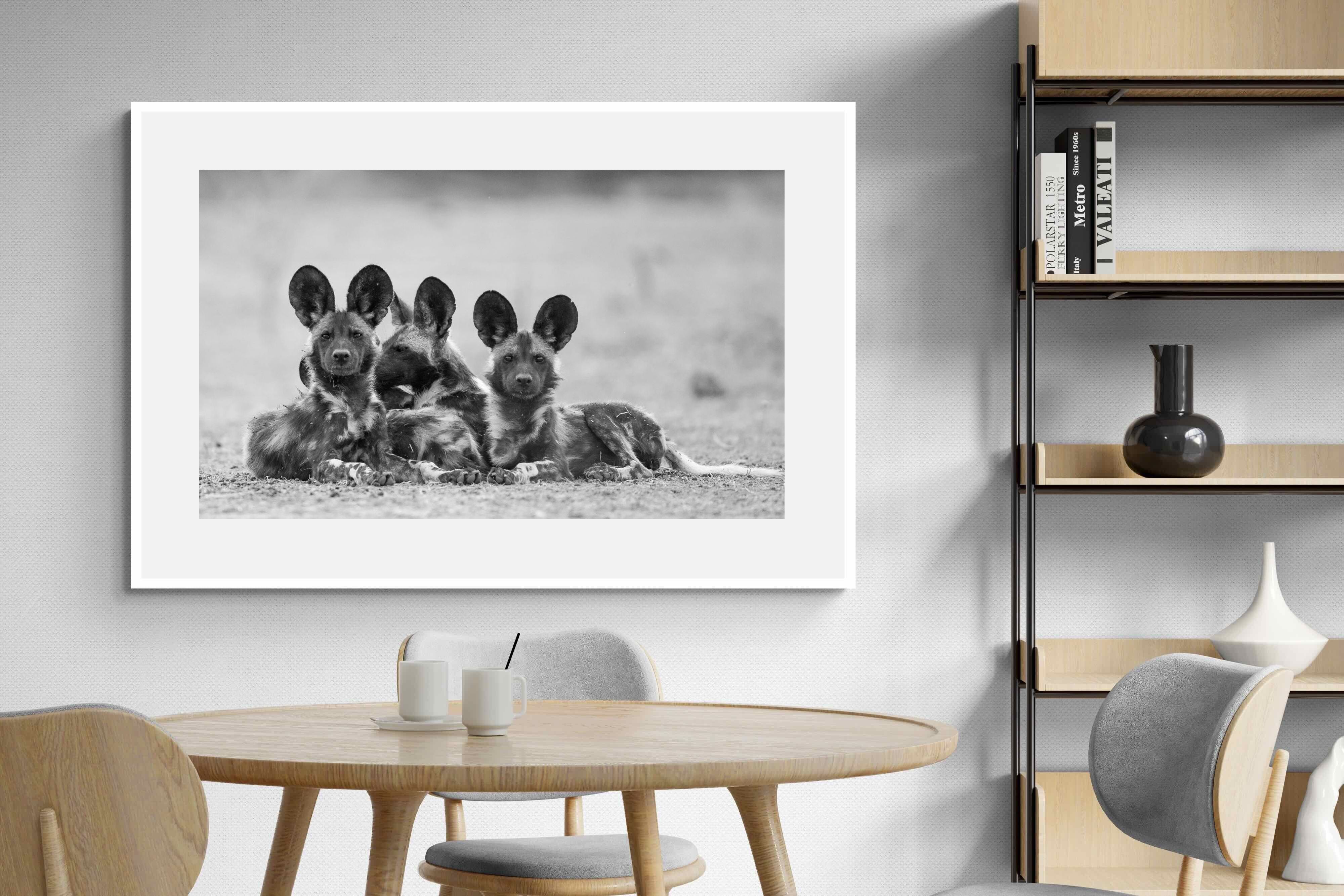 Wild Kin presents three African wild dogs in a beautifully balanced black and white composition. Their alert expressions and distinctive markings create both intimacy and strength. The monochrome palette enhances texture and detail, making this wildlife portrait refined and timeless. Ideal for safari-inspired interiors, modern spaces, studies or nature-led homes wanting understated yet powerful African character.