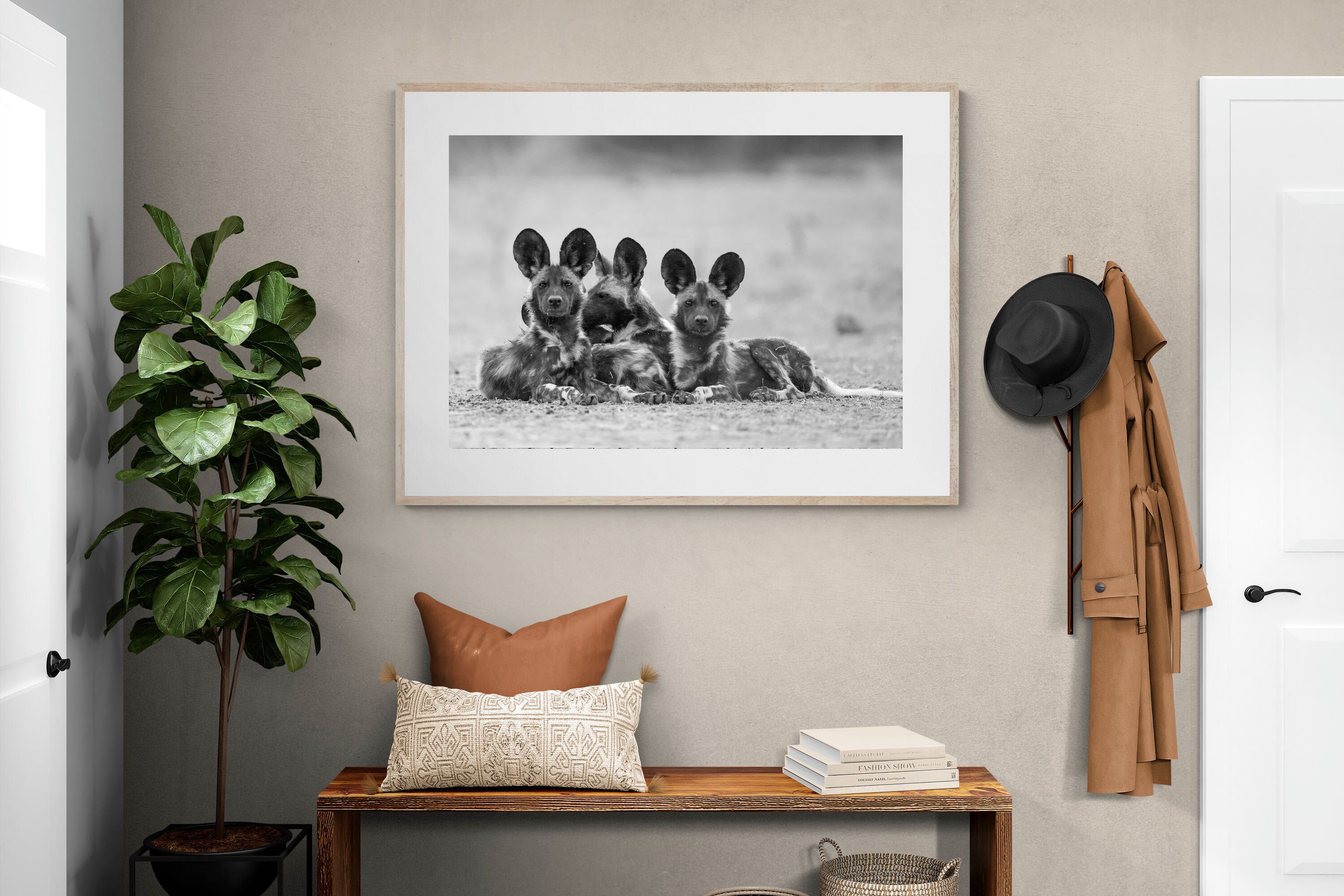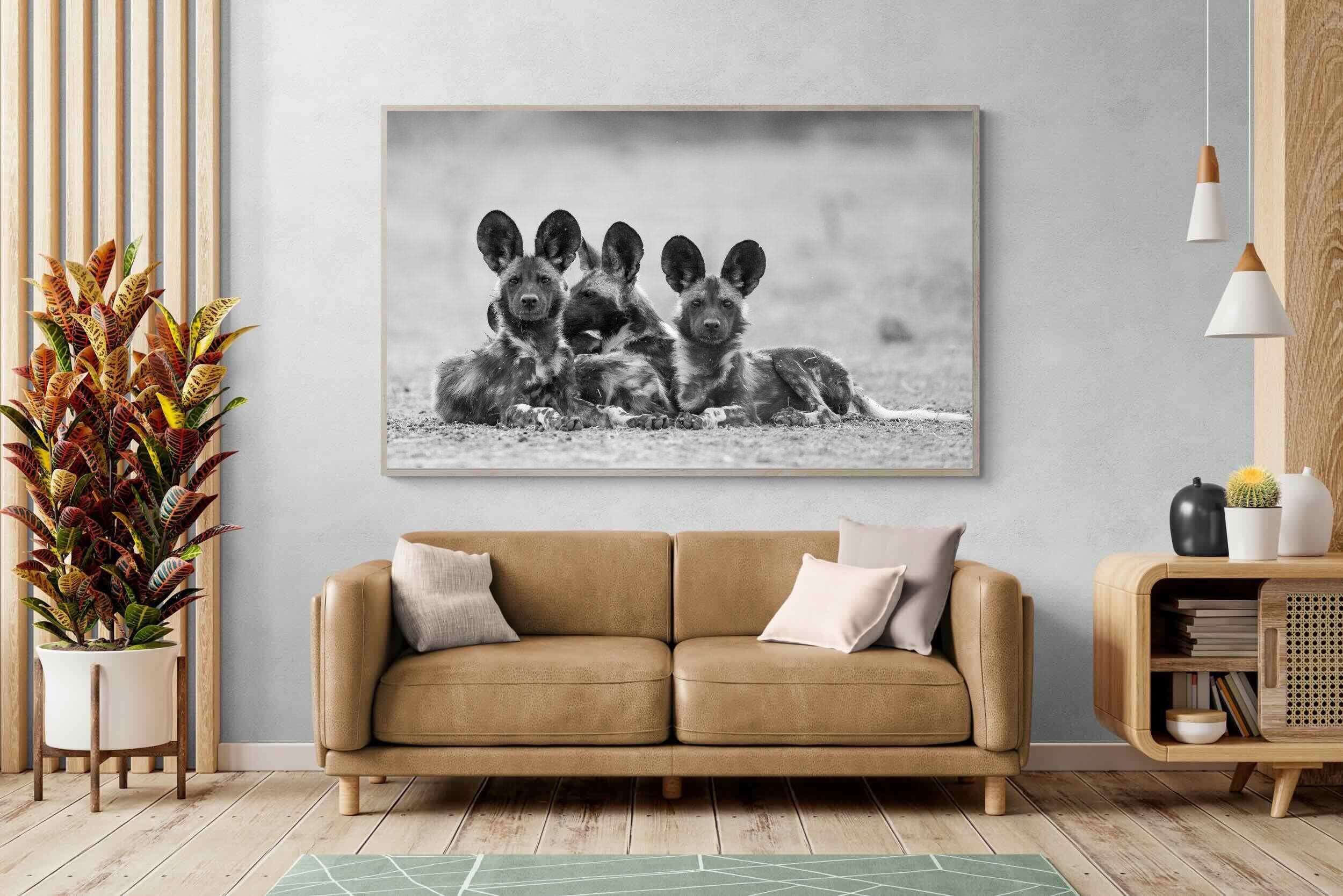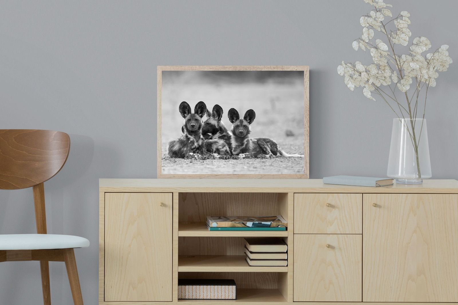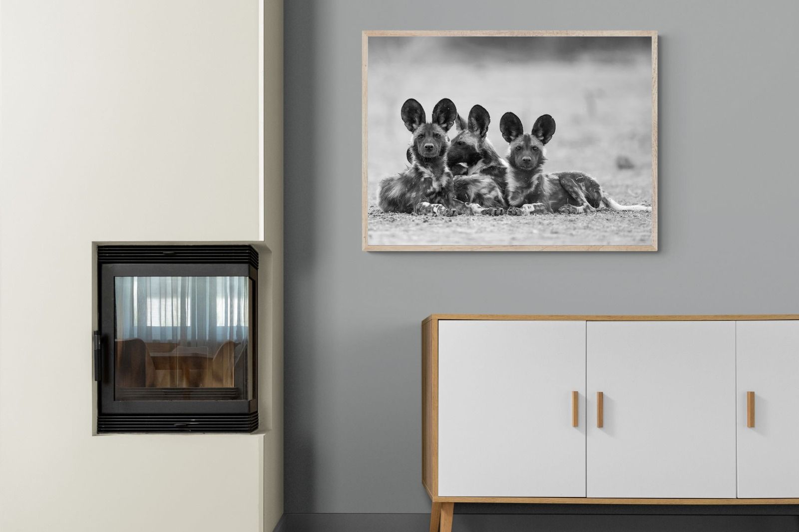Wild Kin presents three African wild dogs in a beautifully balanced black and white composition. Their alert expressions and distinctive markings create both intimacy and strength. The monochrome palette enhances texture and detail, making this wildlife portrait refined and timeless. Ideal for safari-inspired interiors, modern spaces, studies or nature-led homes wanting understated yet powerful African character.