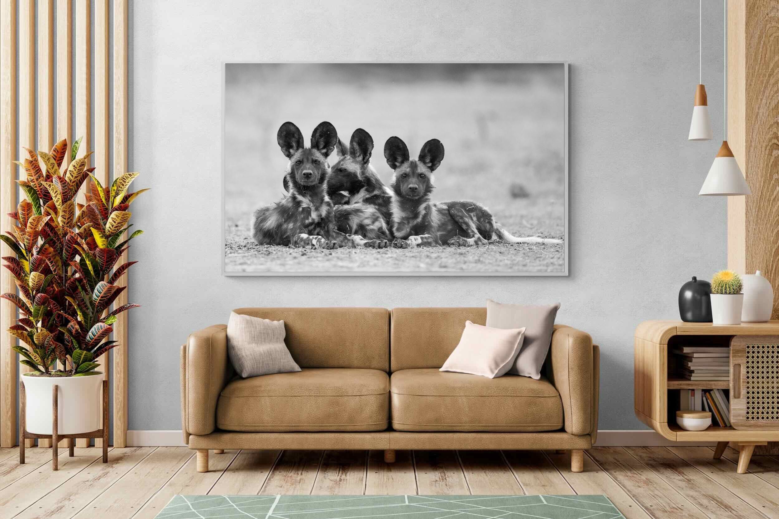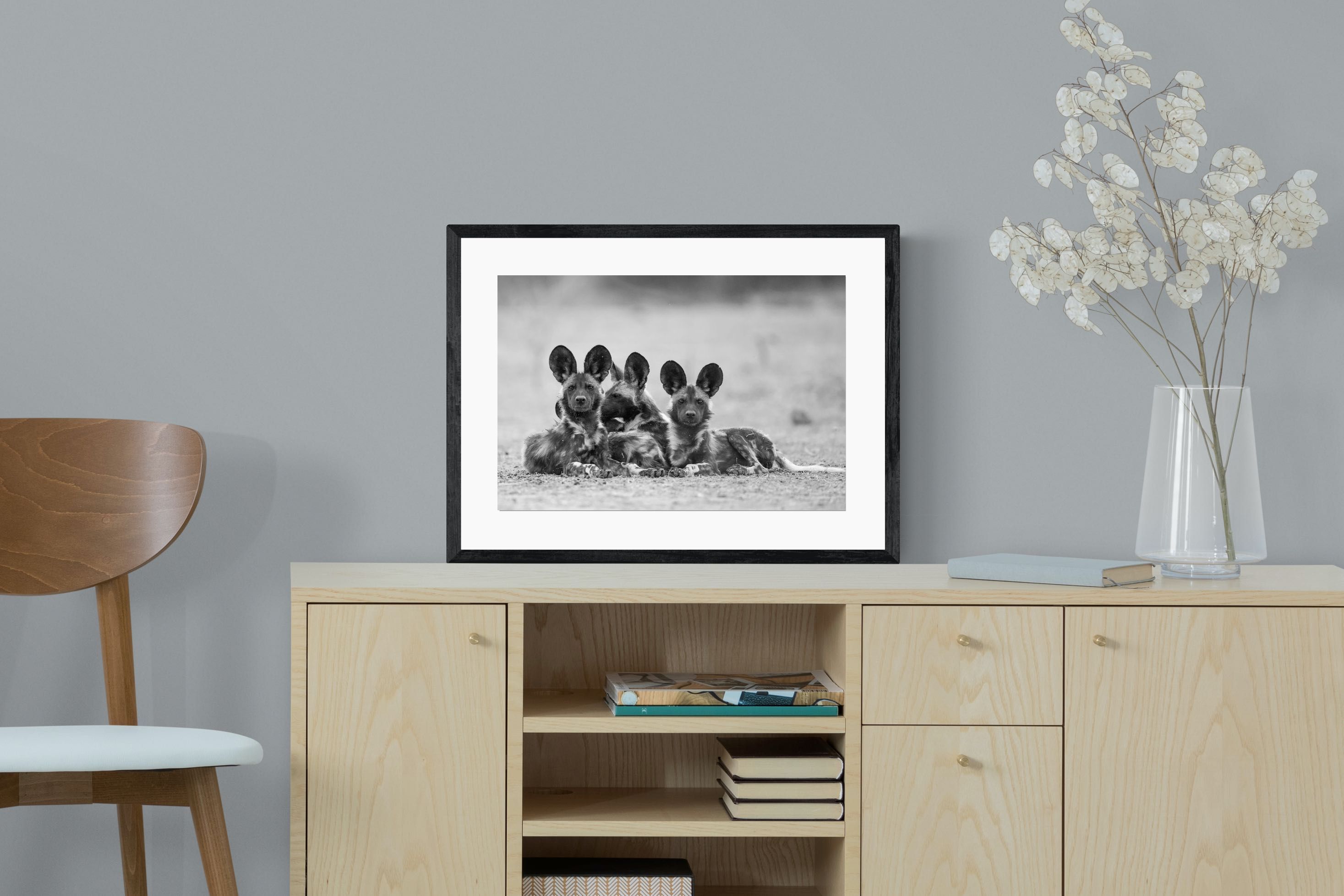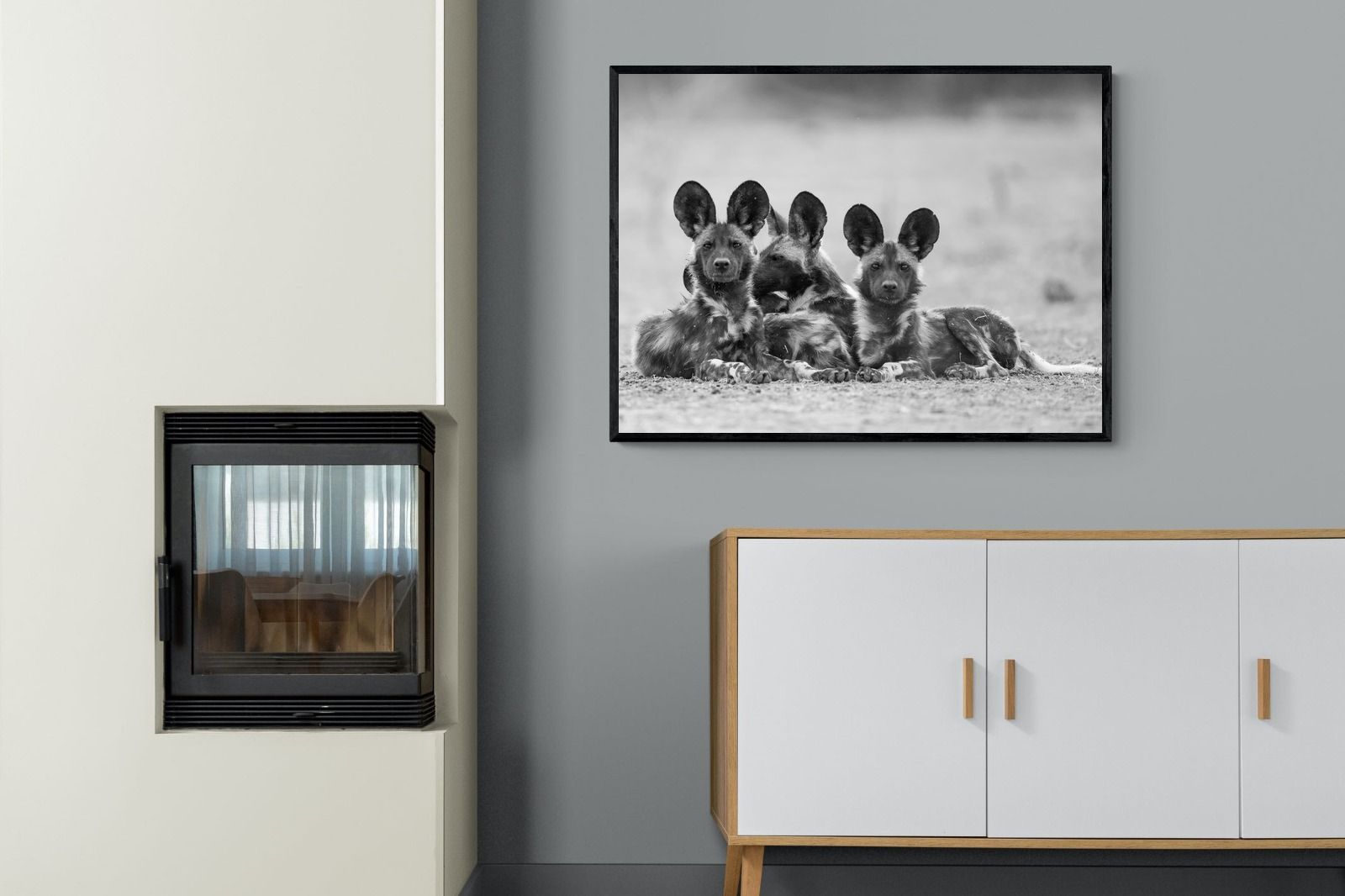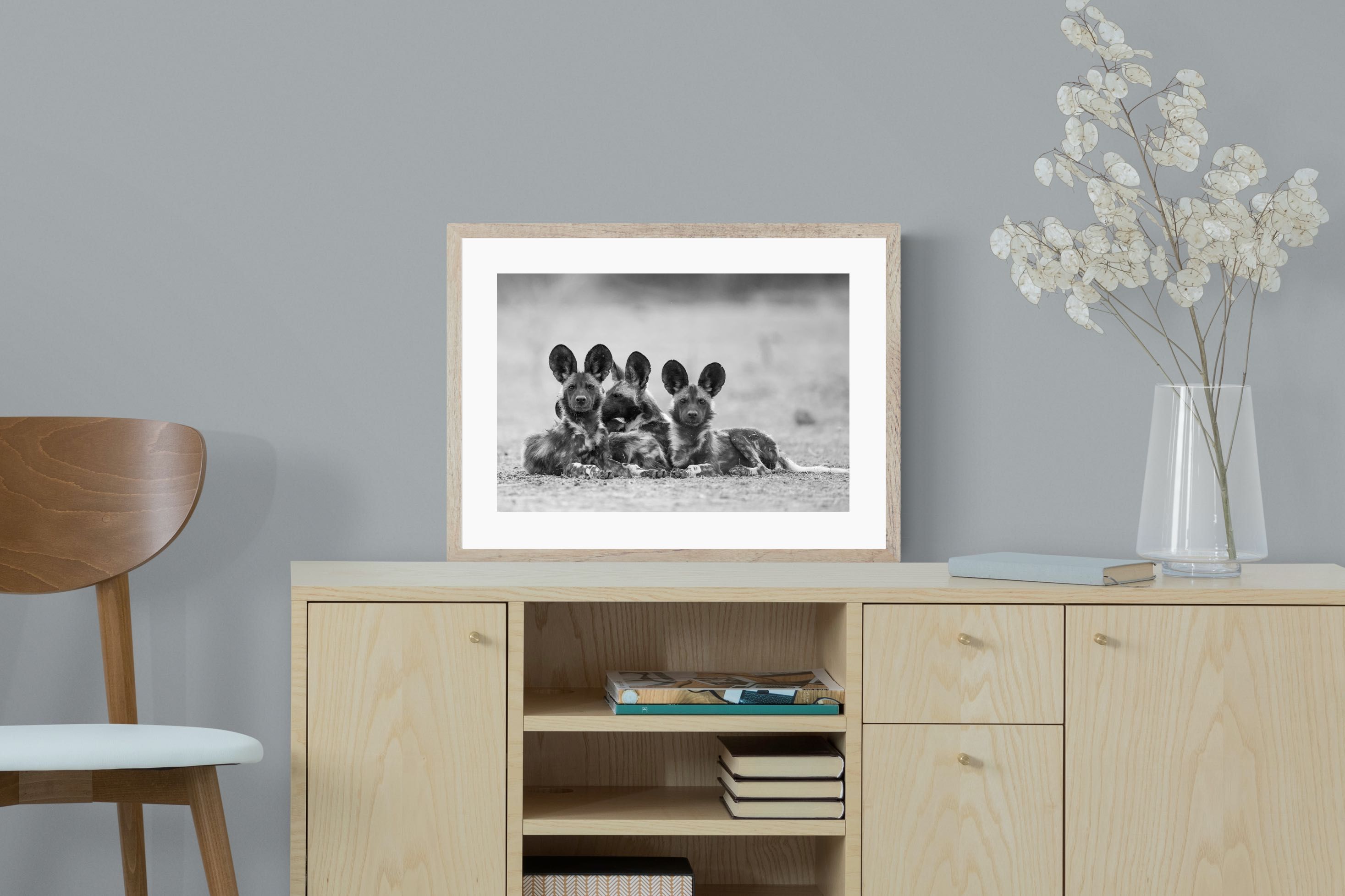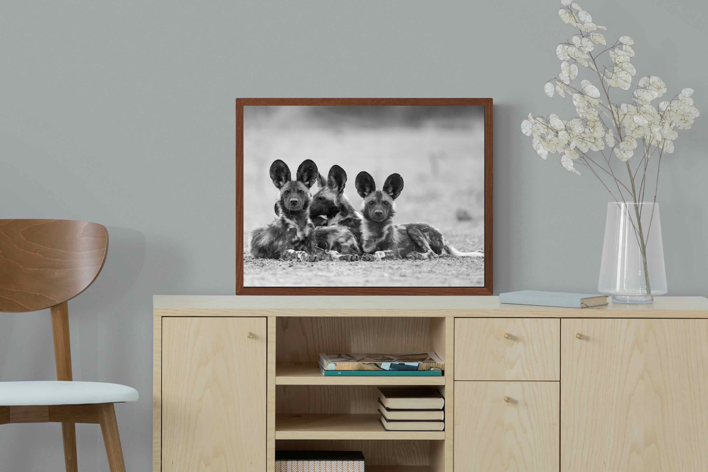 Wild Kin presents three African wild dogs in a beautifully balanced black and white composition. Their alert expressions and distinctive markings create both intimacy and strength. The monochrome palette enhances texture and detail, making this wildlife portrait refined and timeless. Ideal for safari-inspired interiors, modern spaces, studies or nature-led homes wanting understated yet powerful African character.