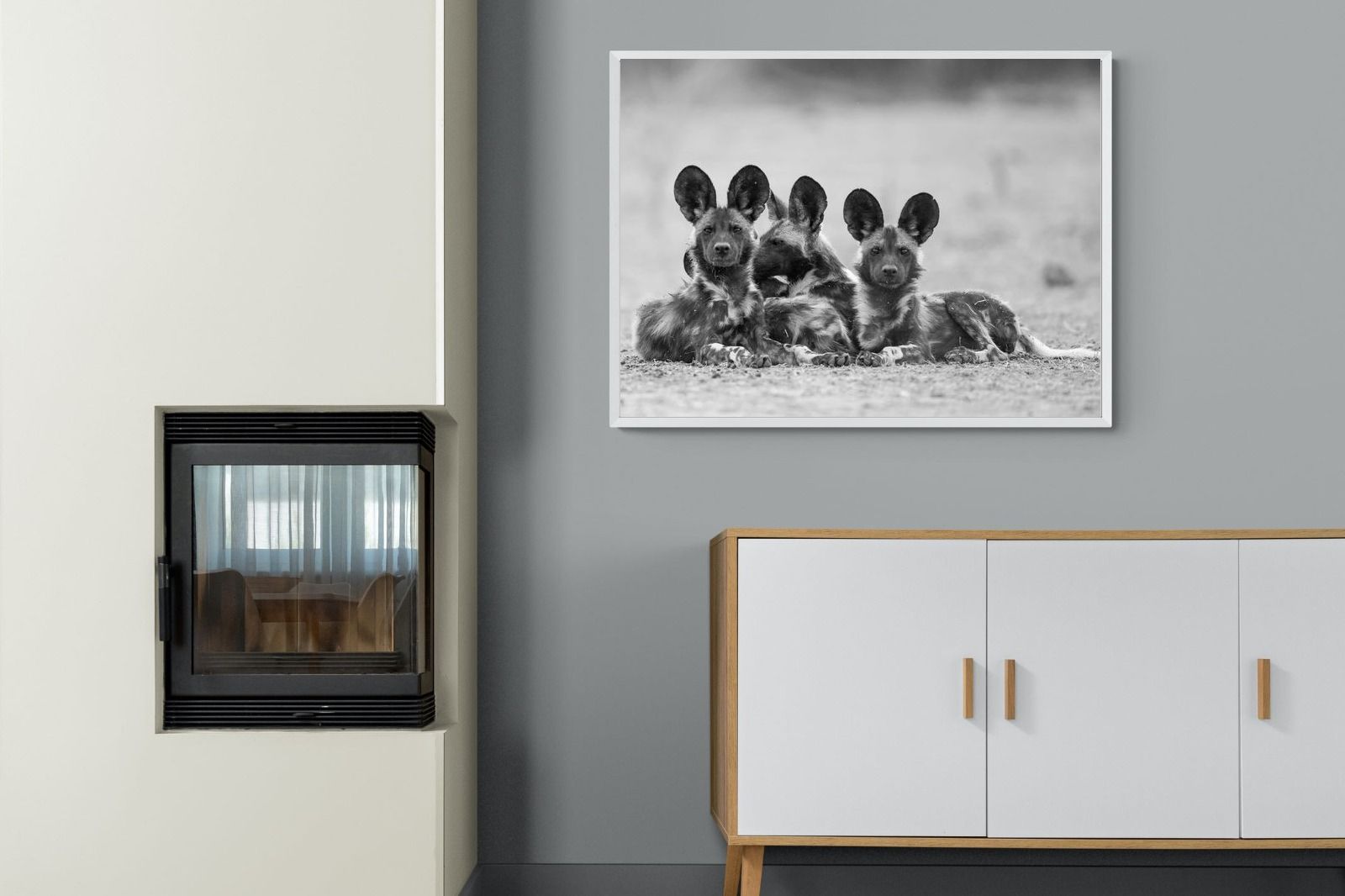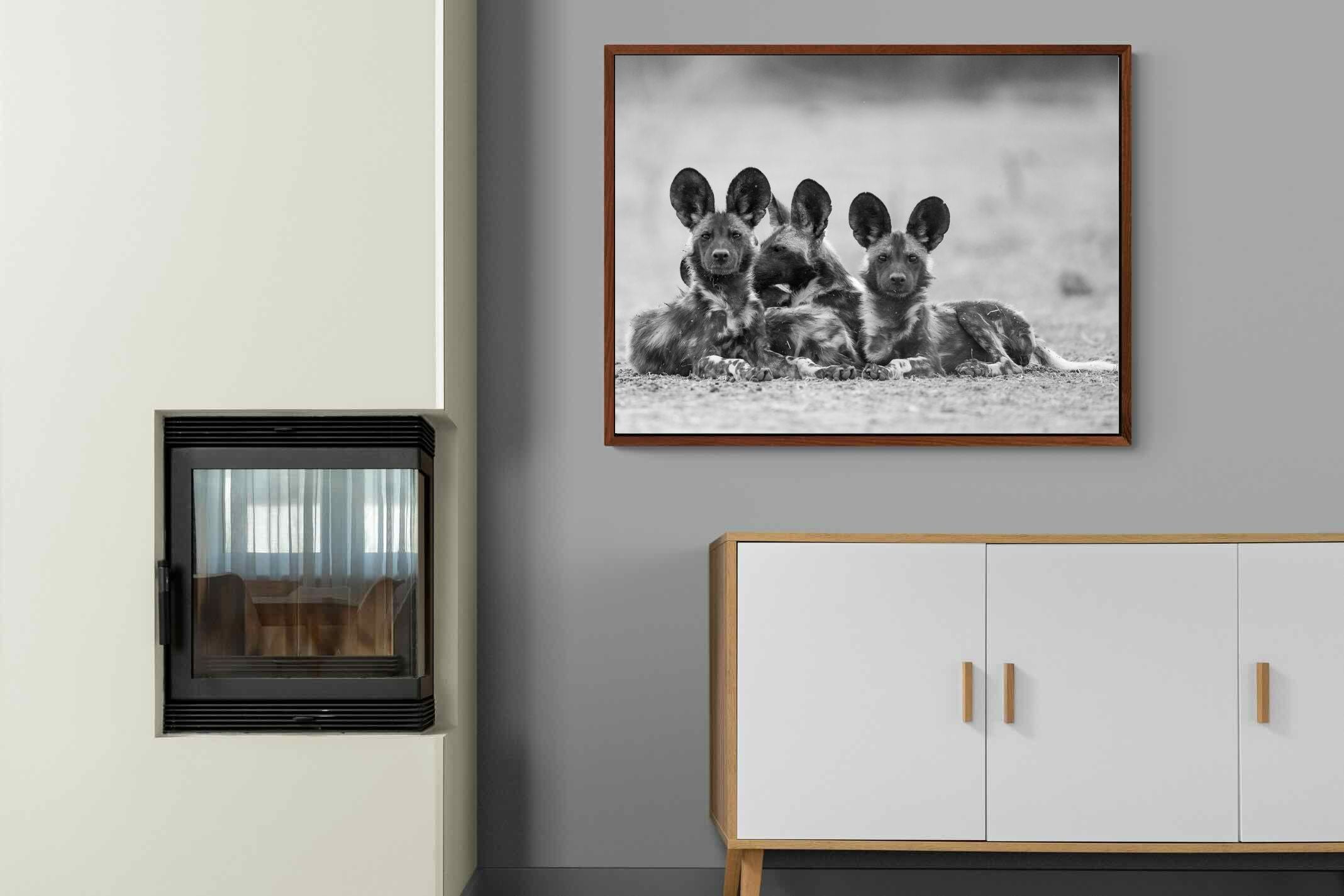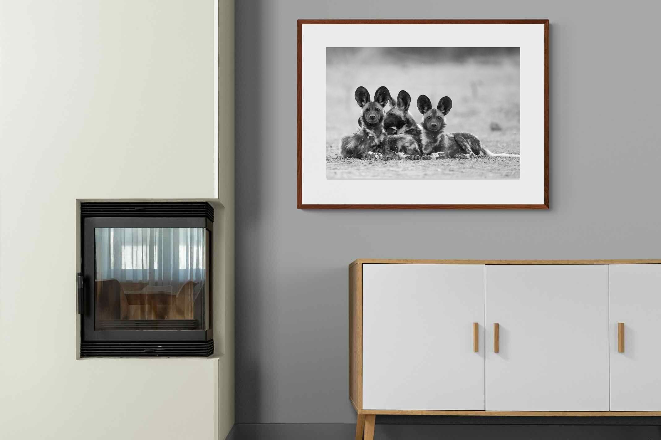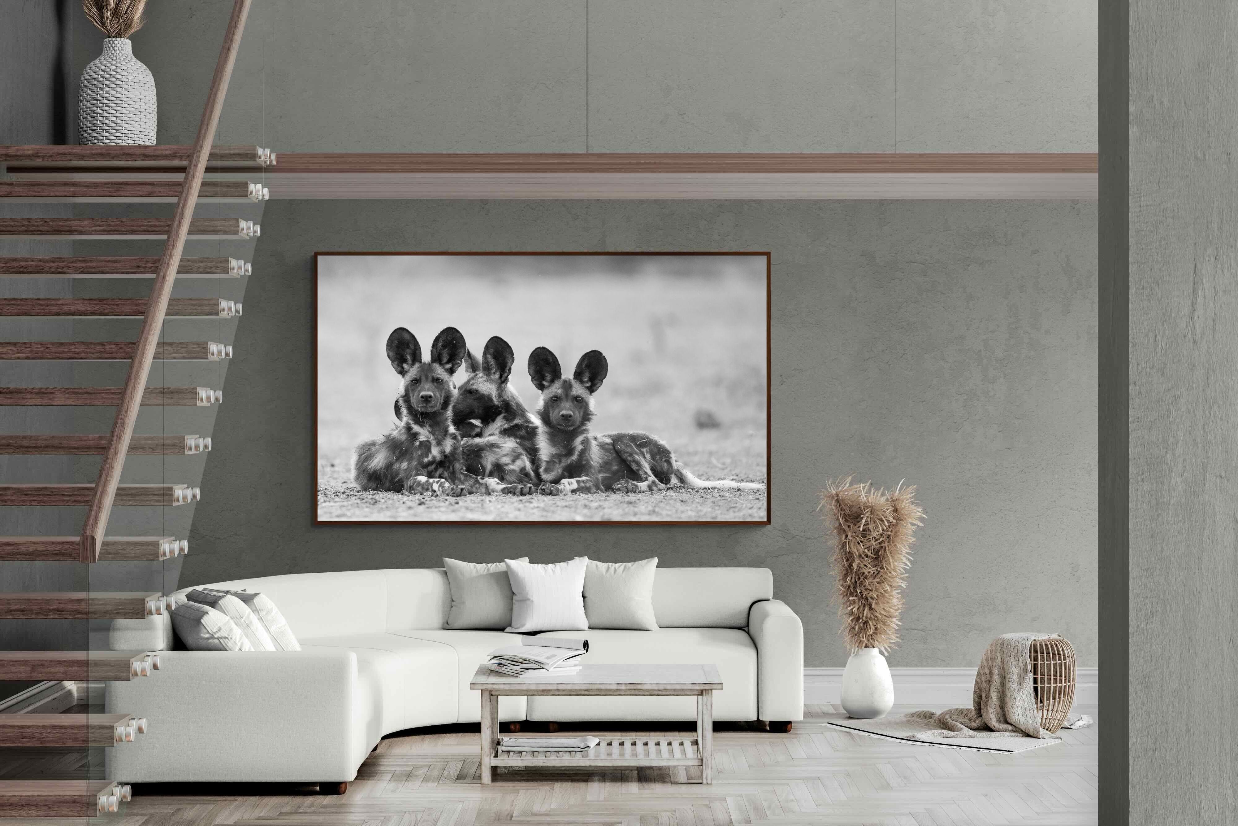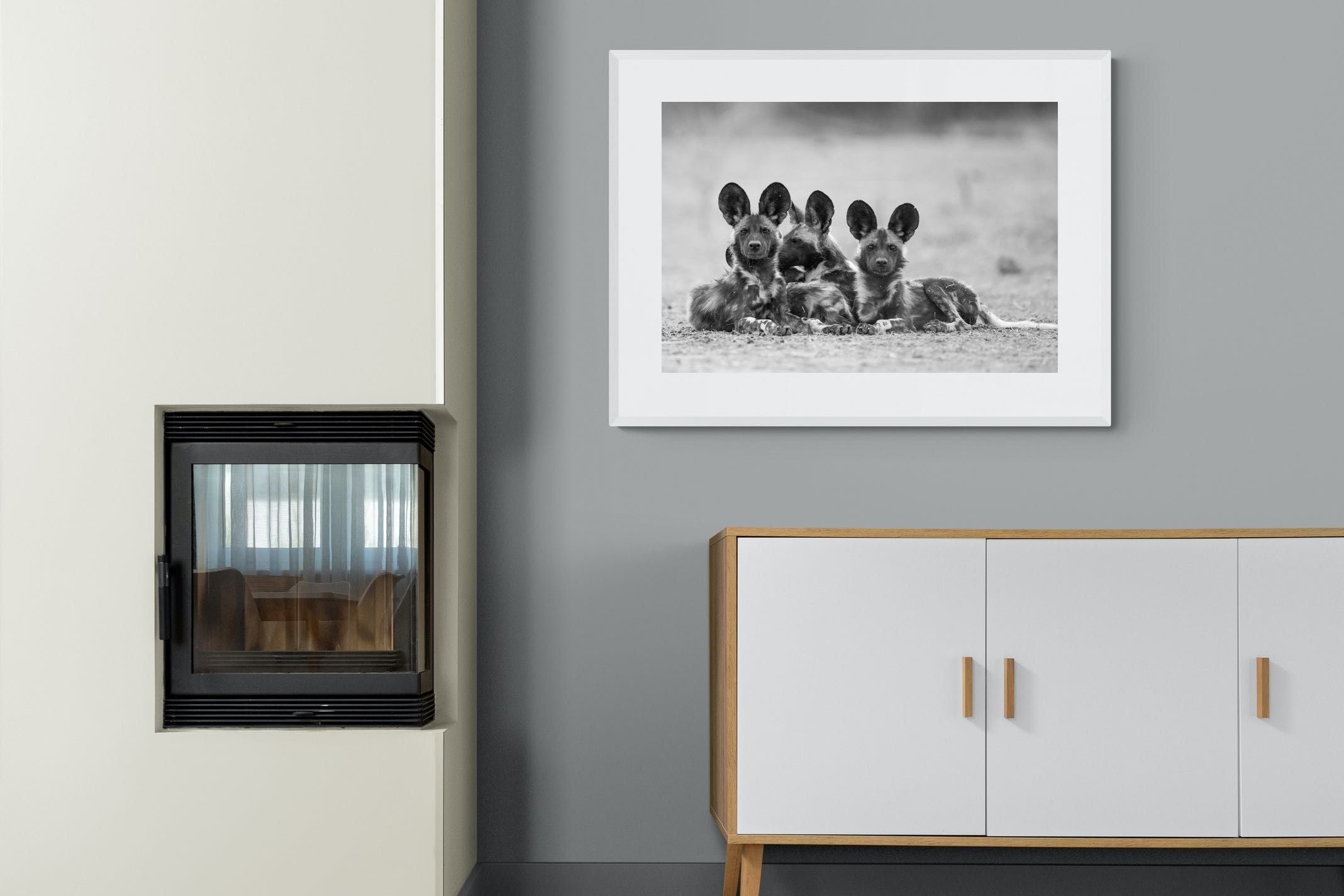 Wild Kin presents three African wild dogs in a beautifully balanced black and white composition. Their alert expressions and distinctive markings create both intimacy and strength. The monochrome palette enhances texture and detail, making this wildlife portrait refined and timeless. Ideal for safari-inspired interiors, modern spaces, studies or nature-led homes wanting understated yet powerful African character.