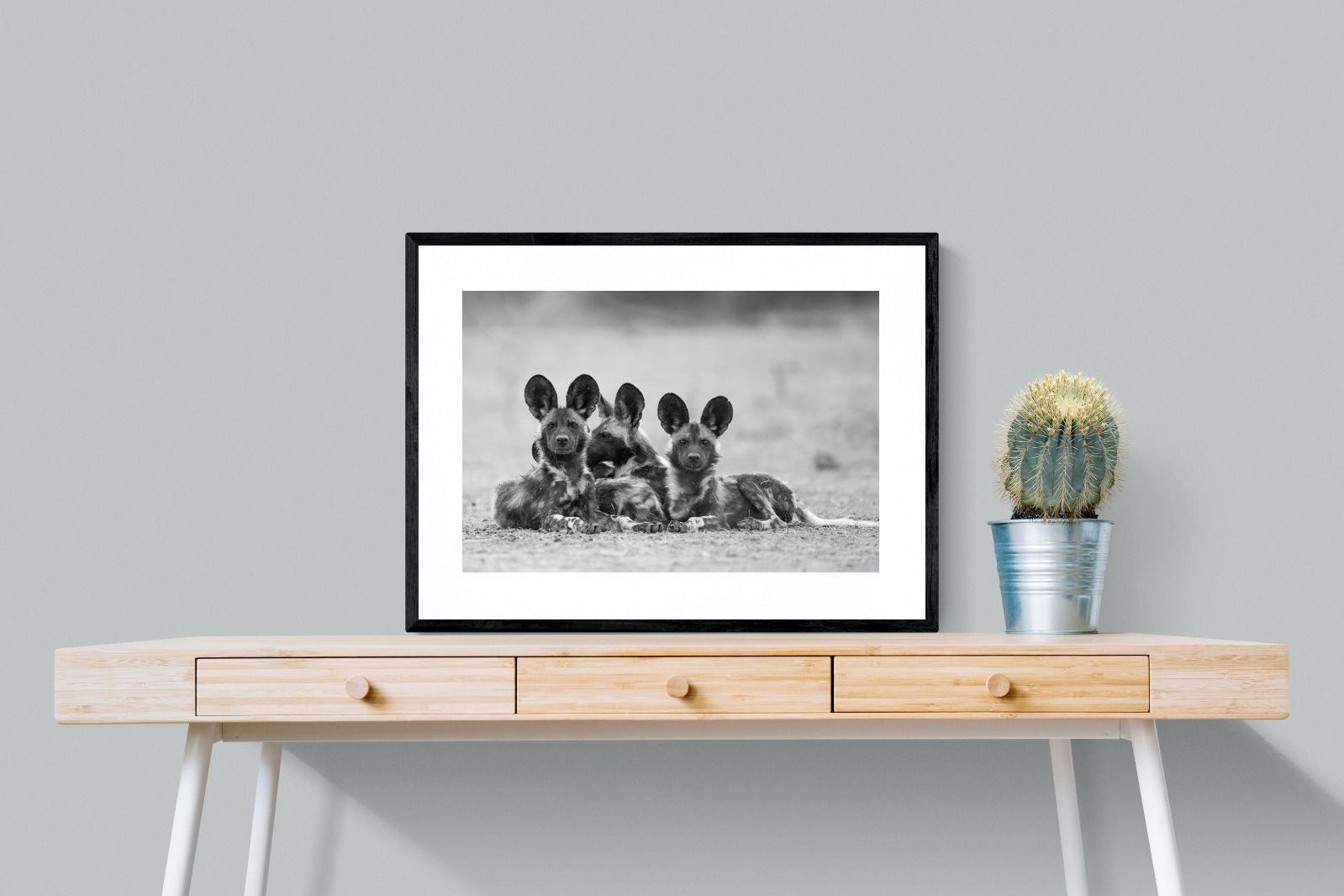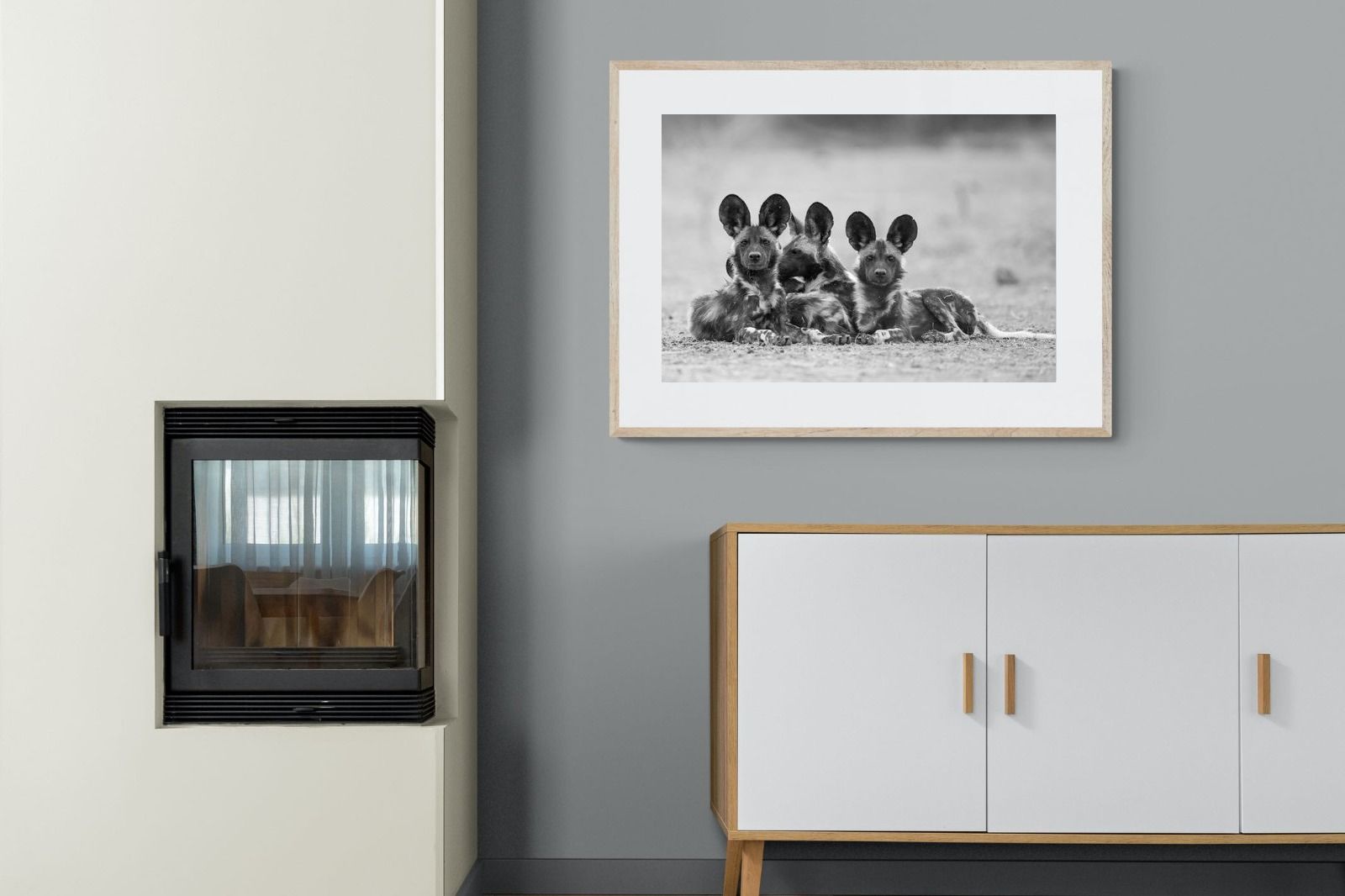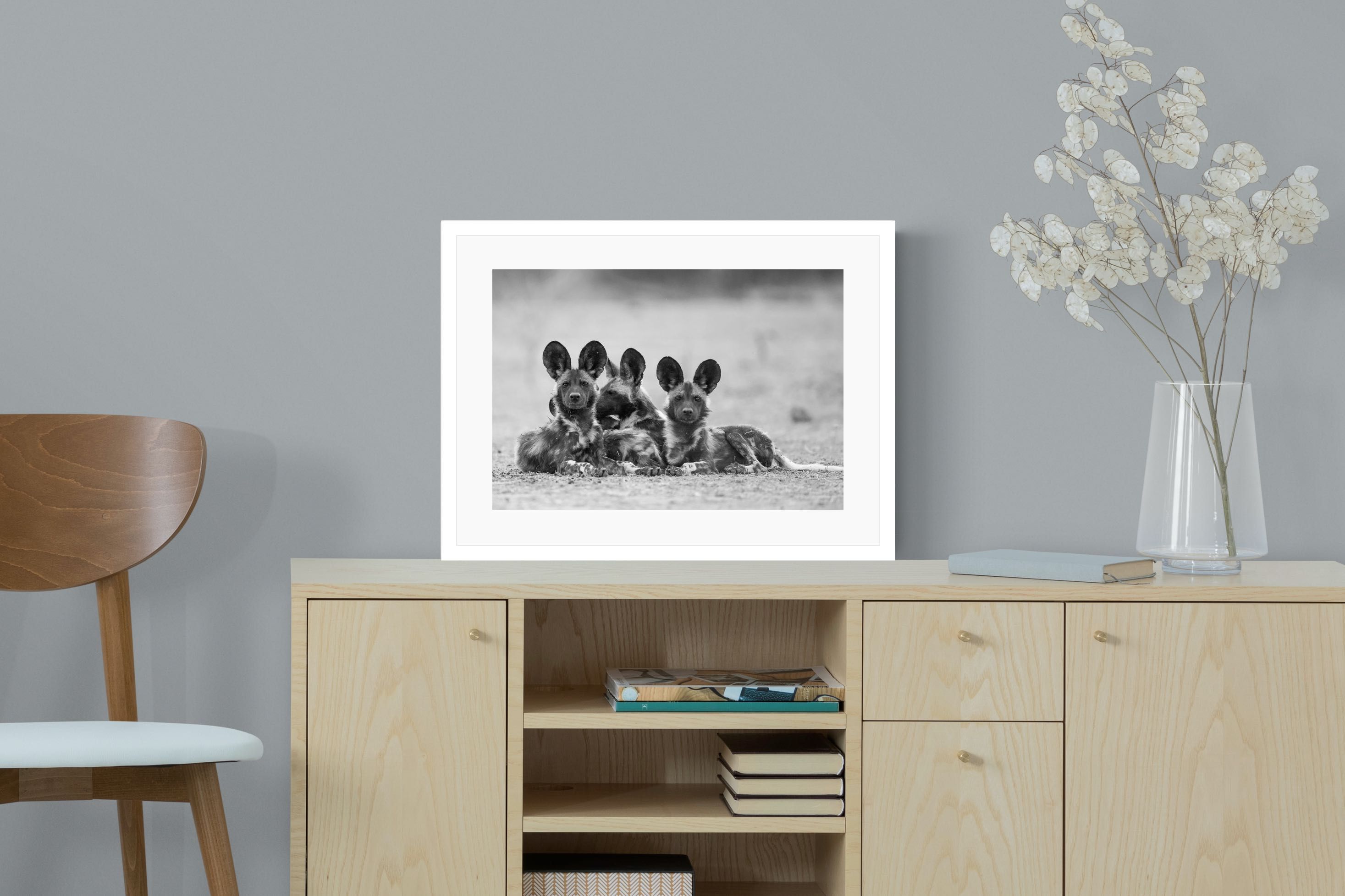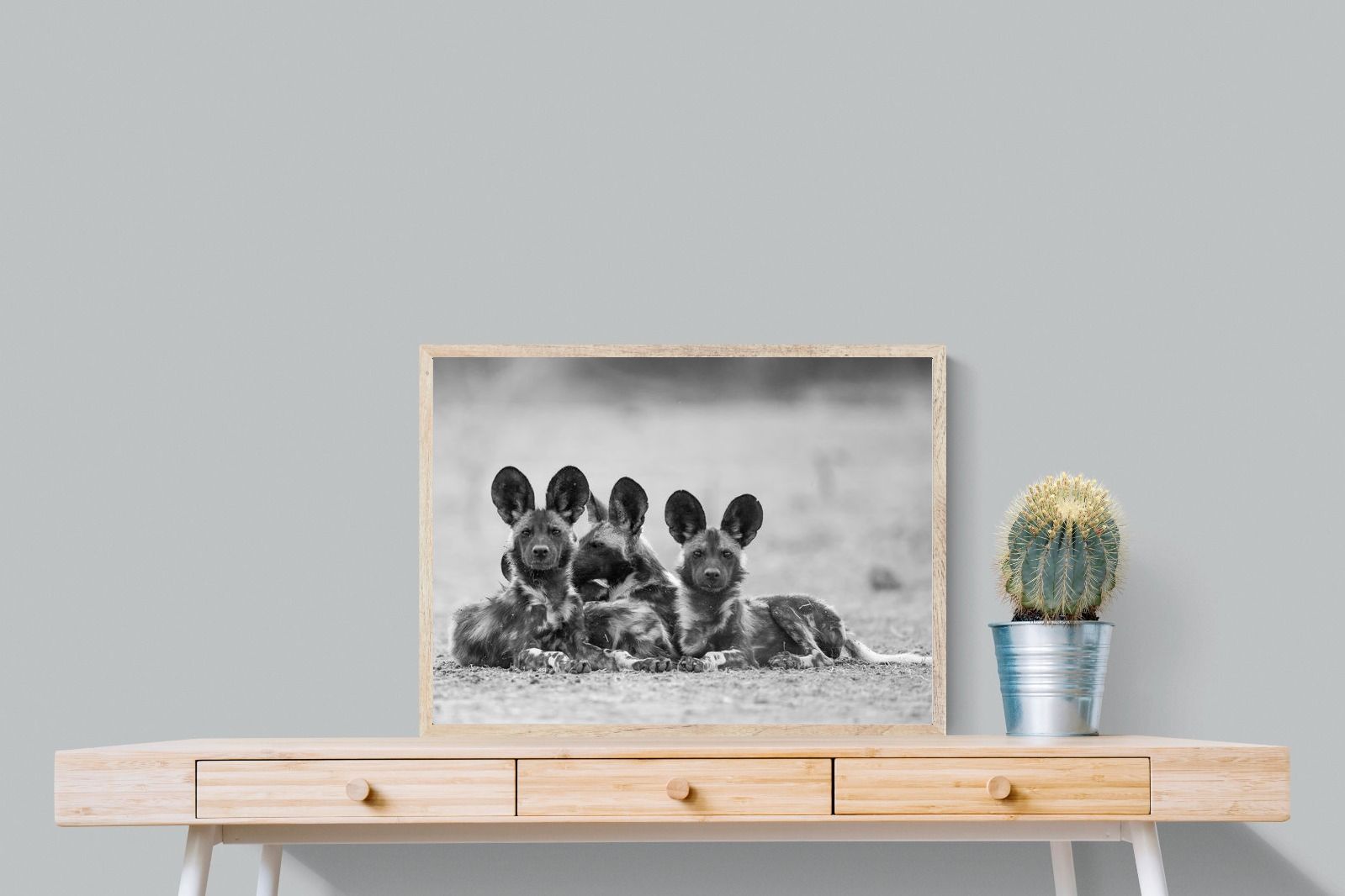 Wild Kin presents three African wild dogs in a beautifully balanced black and white composition. Their alert expressions and distinctive markings create both intimacy and strength. The monochrome palette enhances texture and detail, making this wildlife portrait refined and timeless. Ideal for safari-inspired interiors, modern spaces, studies or nature-led homes wanting understated yet powerful African character.