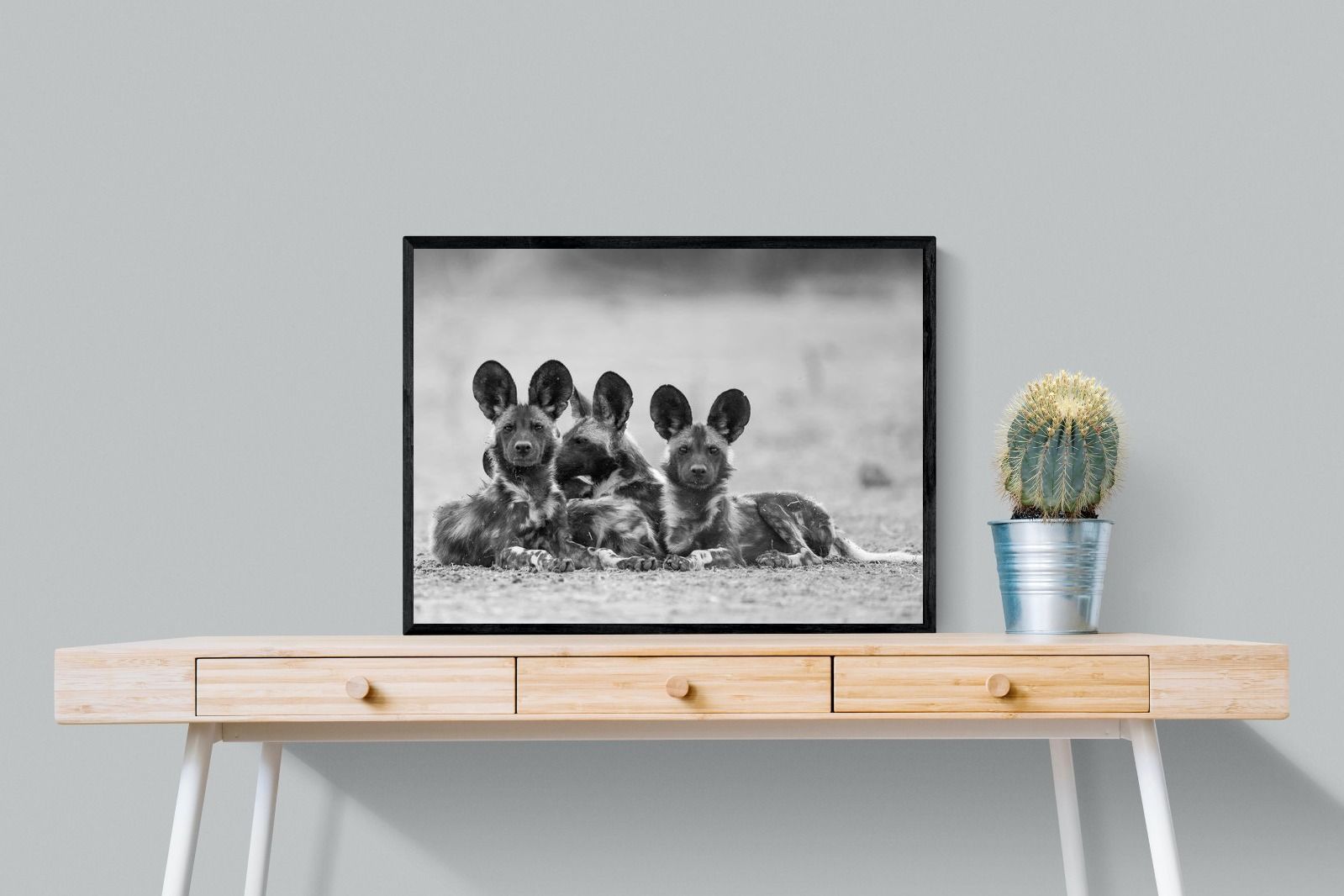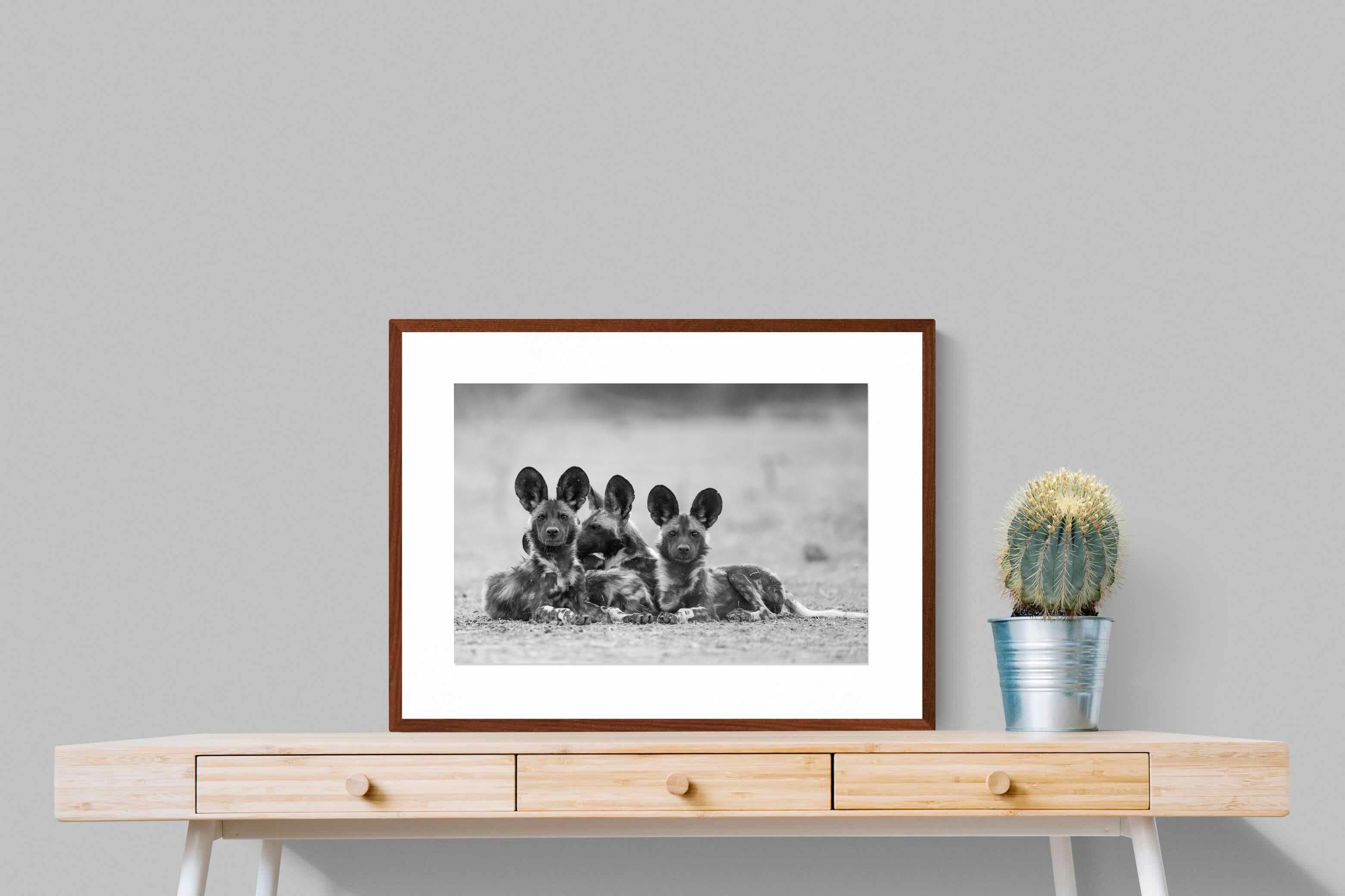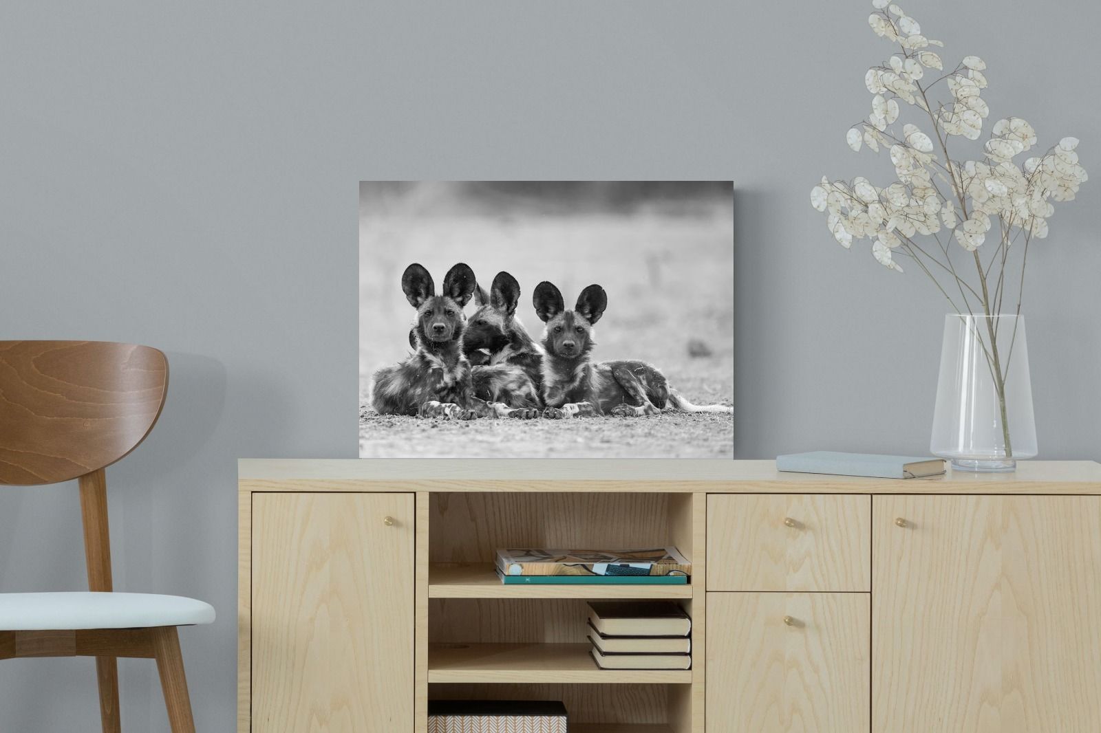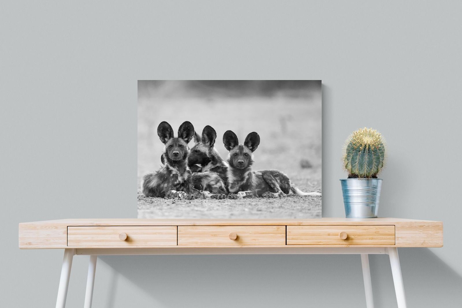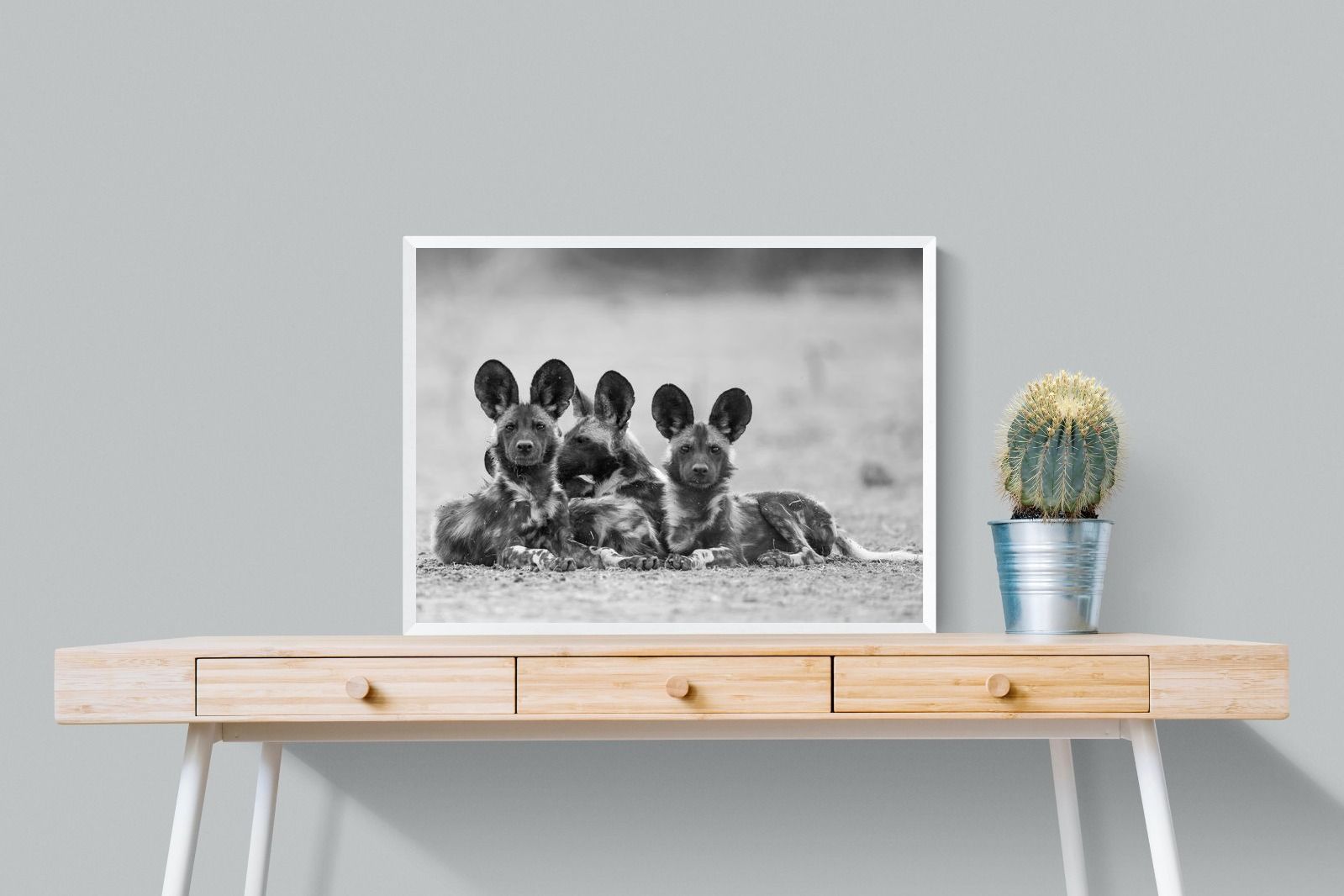 Wild Kin presents three African wild dogs in a beautifully balanced black and white composition. Their alert expressions and distinctive markings create both intimacy and strength. The monochrome palette enhances texture and detail, making this wildlife portrait refined and timeless. Ideal for safari-inspired interiors, modern spaces, studies or nature-led homes wanting understated yet powerful African character.
