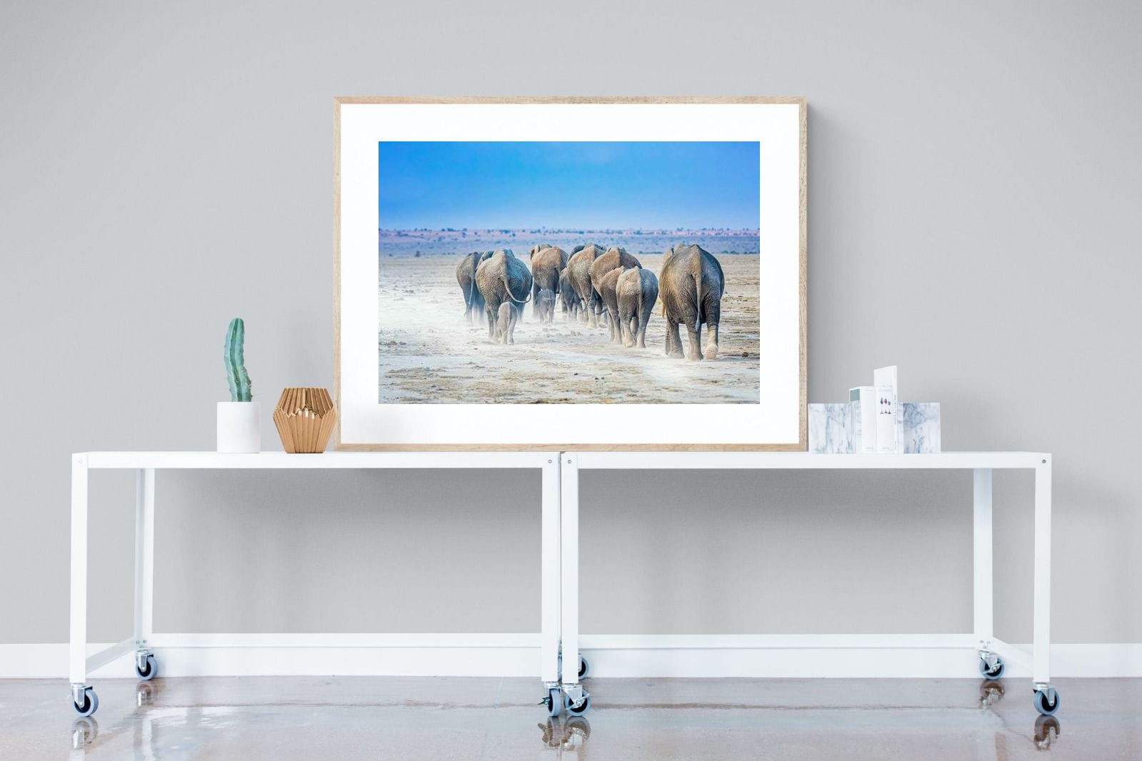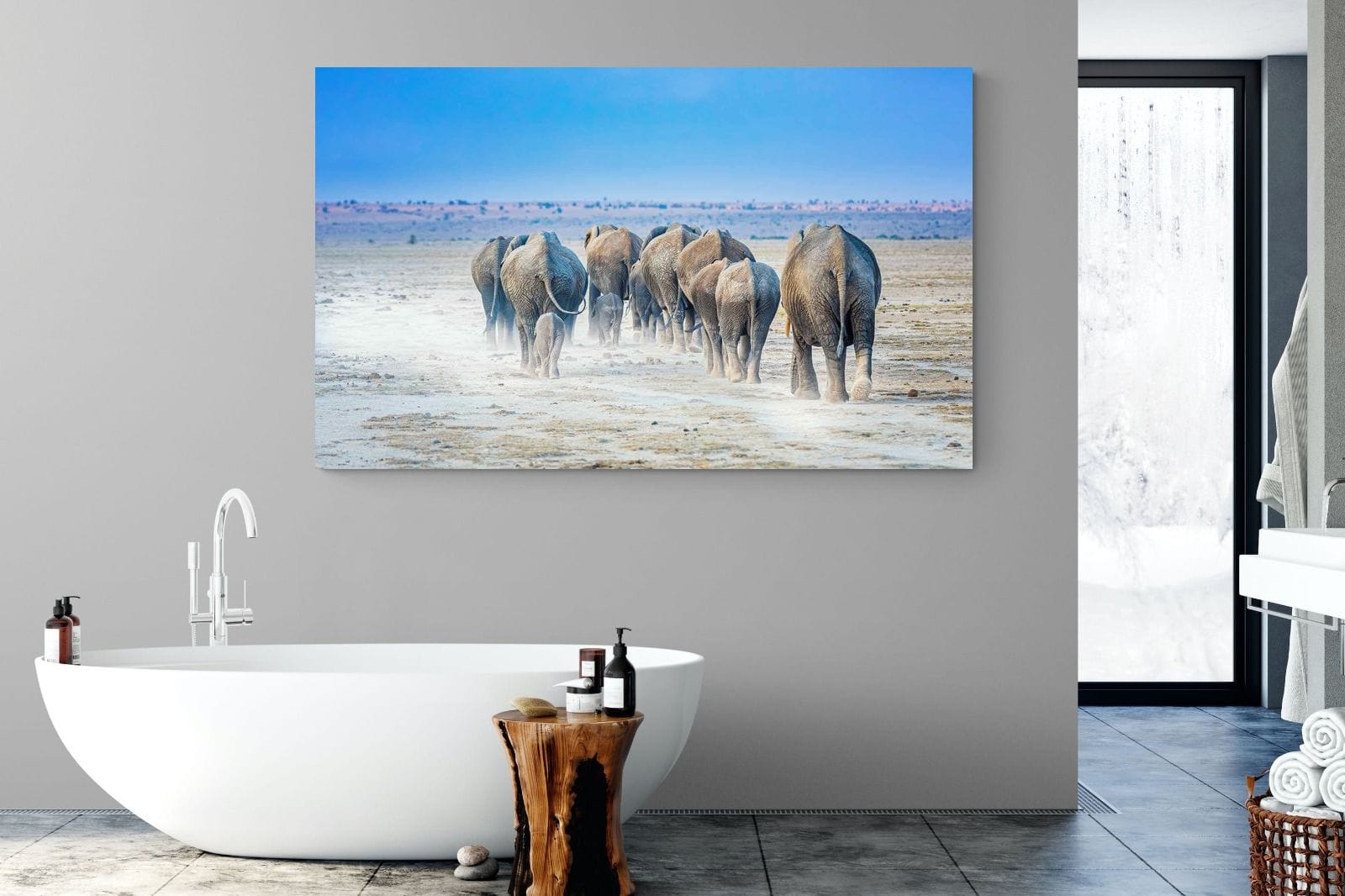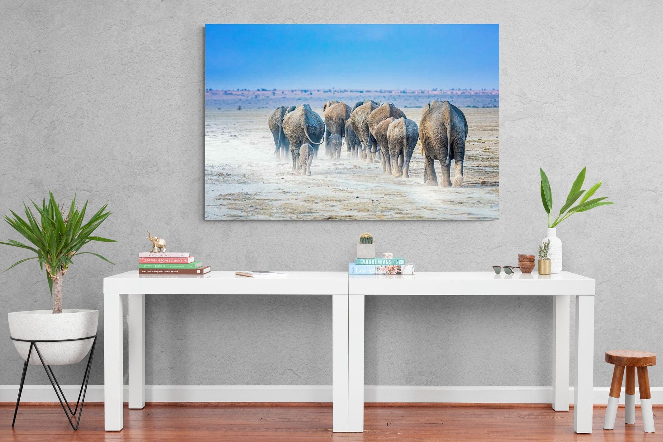 A herd of elephants moves steadily across a sunlit, dust-covered plain, their silhouettes softened by drifting earth beneath their feet. Captured from behind, the composition draws the eye into the distance, emphasising movement, unity, and scale. The muted tones of the landscape contrast with the clear blue sky, creating a clean and expansive feel. Ideal for modern or safari-inspired interiors, this artwork brings warmth, depth, and a quiet sense of journey into the space.