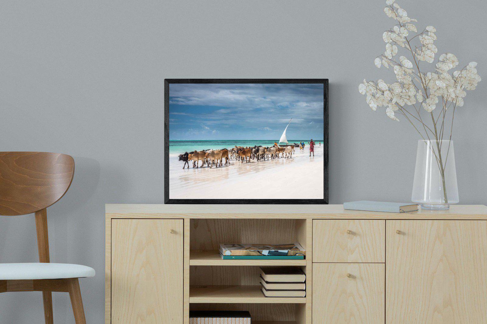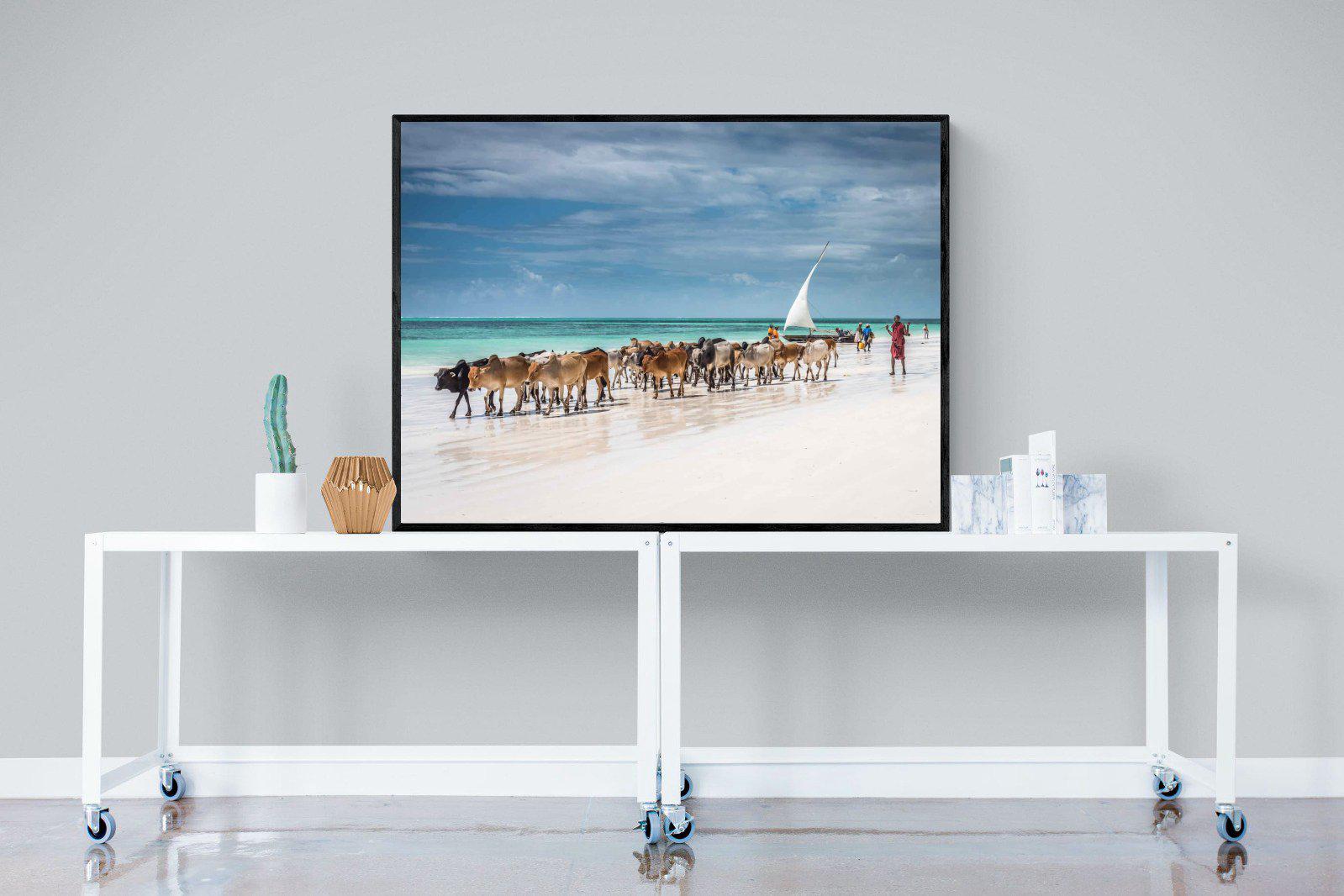 A striking coastal scene captures a herd of cattle moving along a pristine shoreline, framed by turquoise waters and expansive skies. The contrast between land, sea and daily life creates a compelling narrative filled with movement and authenticity. Ideal for coastal, eclectic or globally inspired interiors, this artwork adds warmth, colour and cultural richness to a space. Its wide composition makes it perfect for larger walls, offering a distinctive focal point that blends natural beauty with a sense of place and story.
