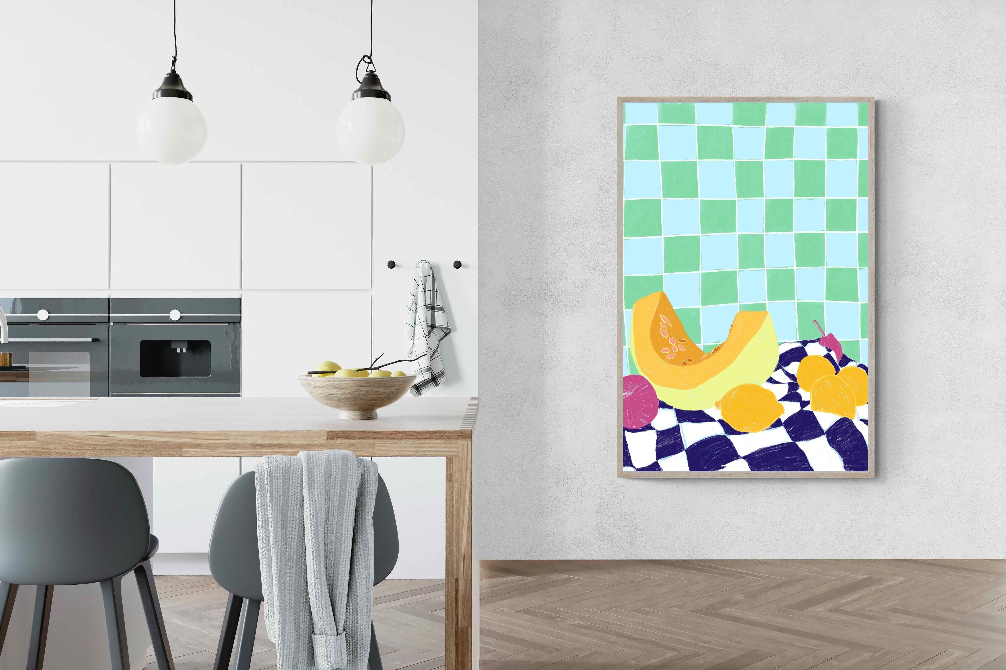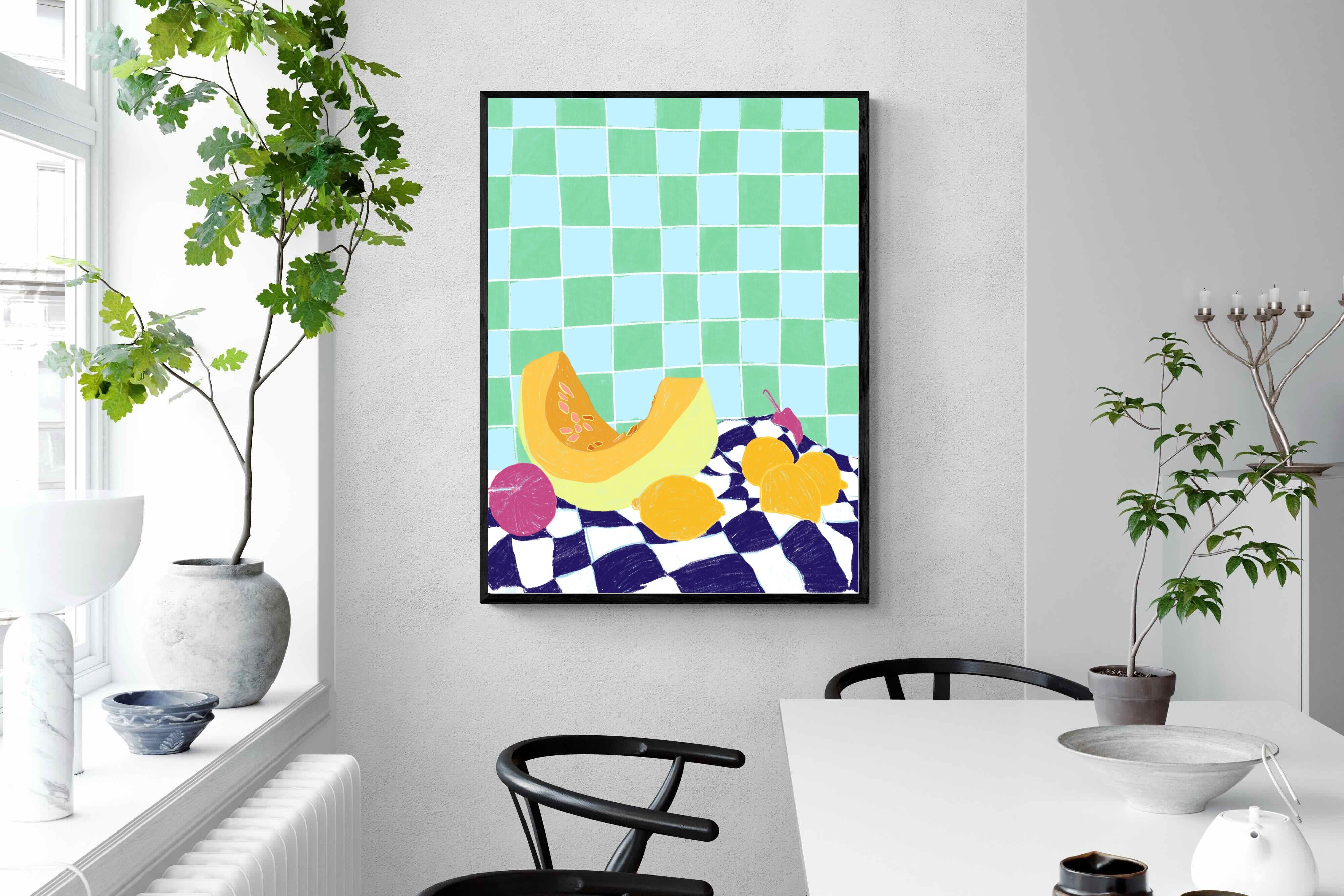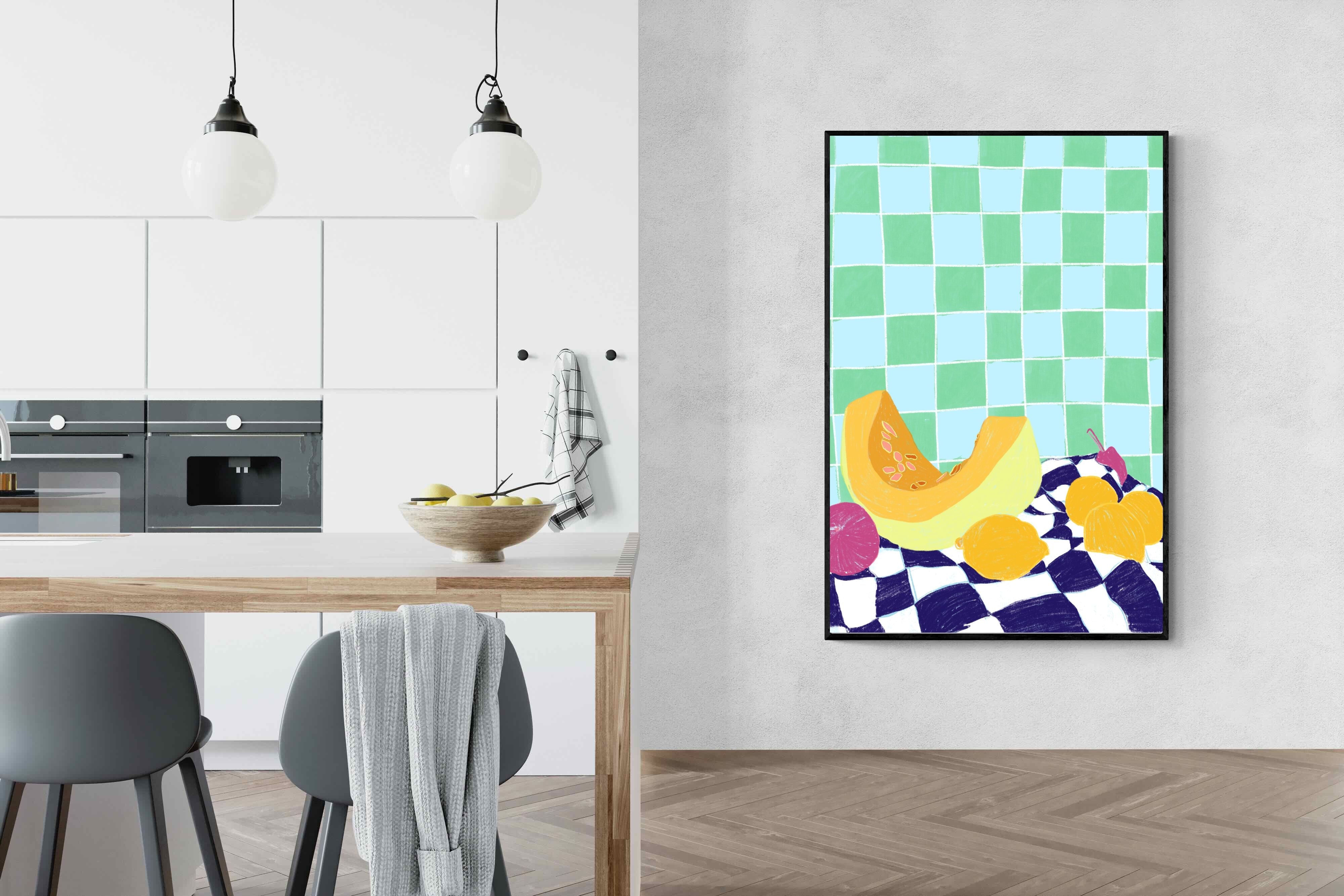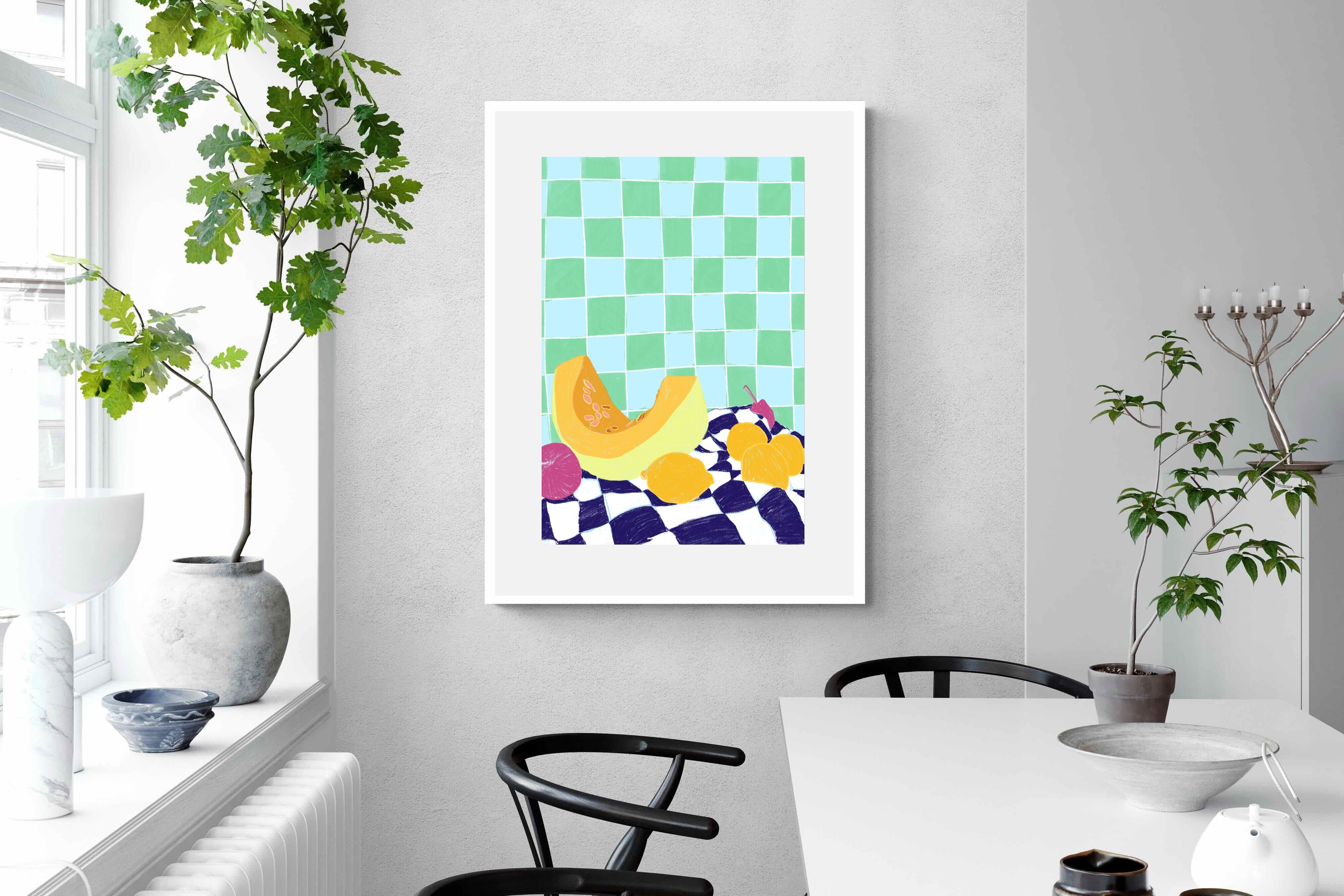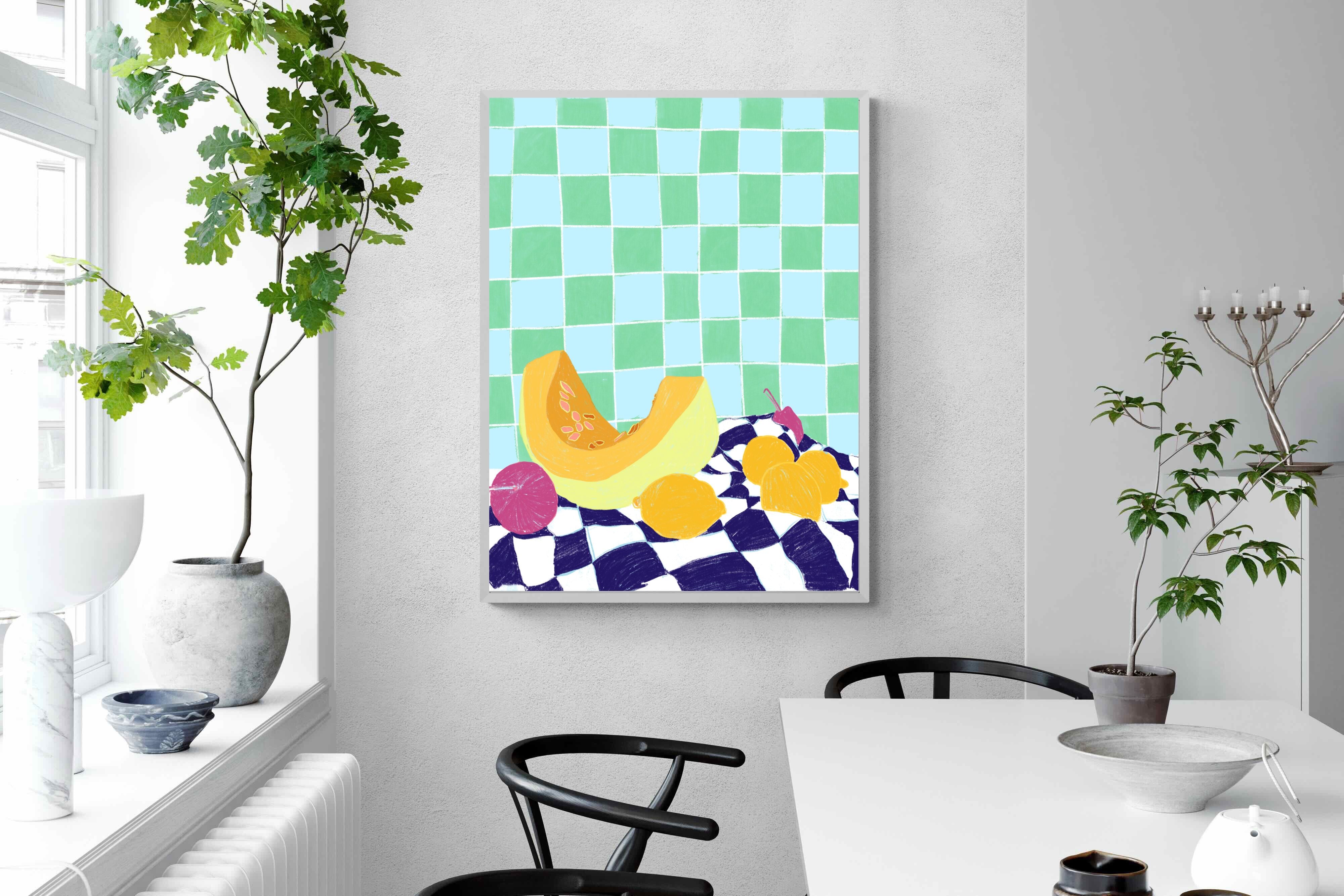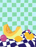 Featuring a vibrant still life of fruits on a checkered cloth against a tiled background, this illustration brings a lively and refreshing feel. Its bright colours and playful composition make it a great choice for contemporary kitchens or dining areas, adding a pop of colour and a cheerful atmosphere.