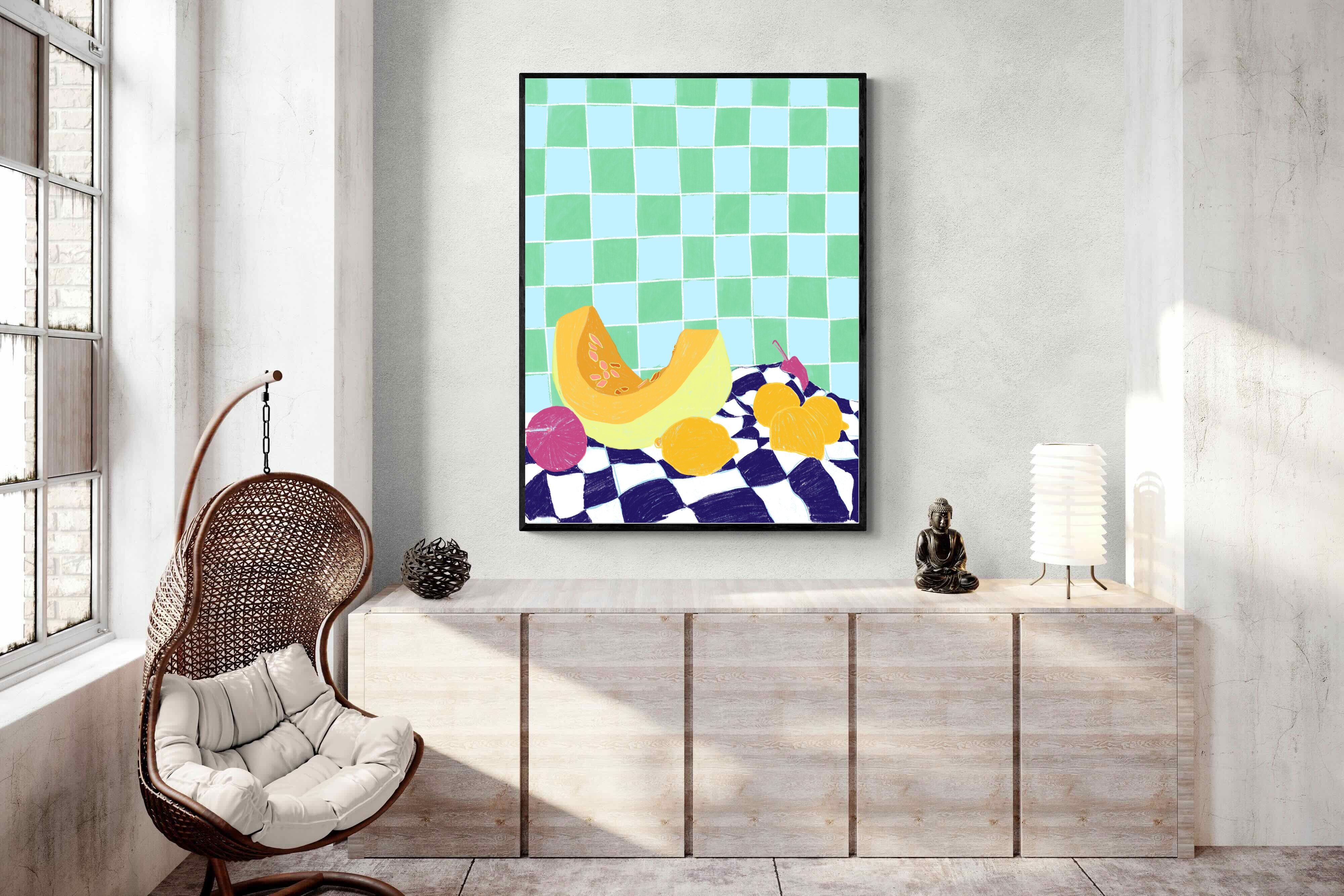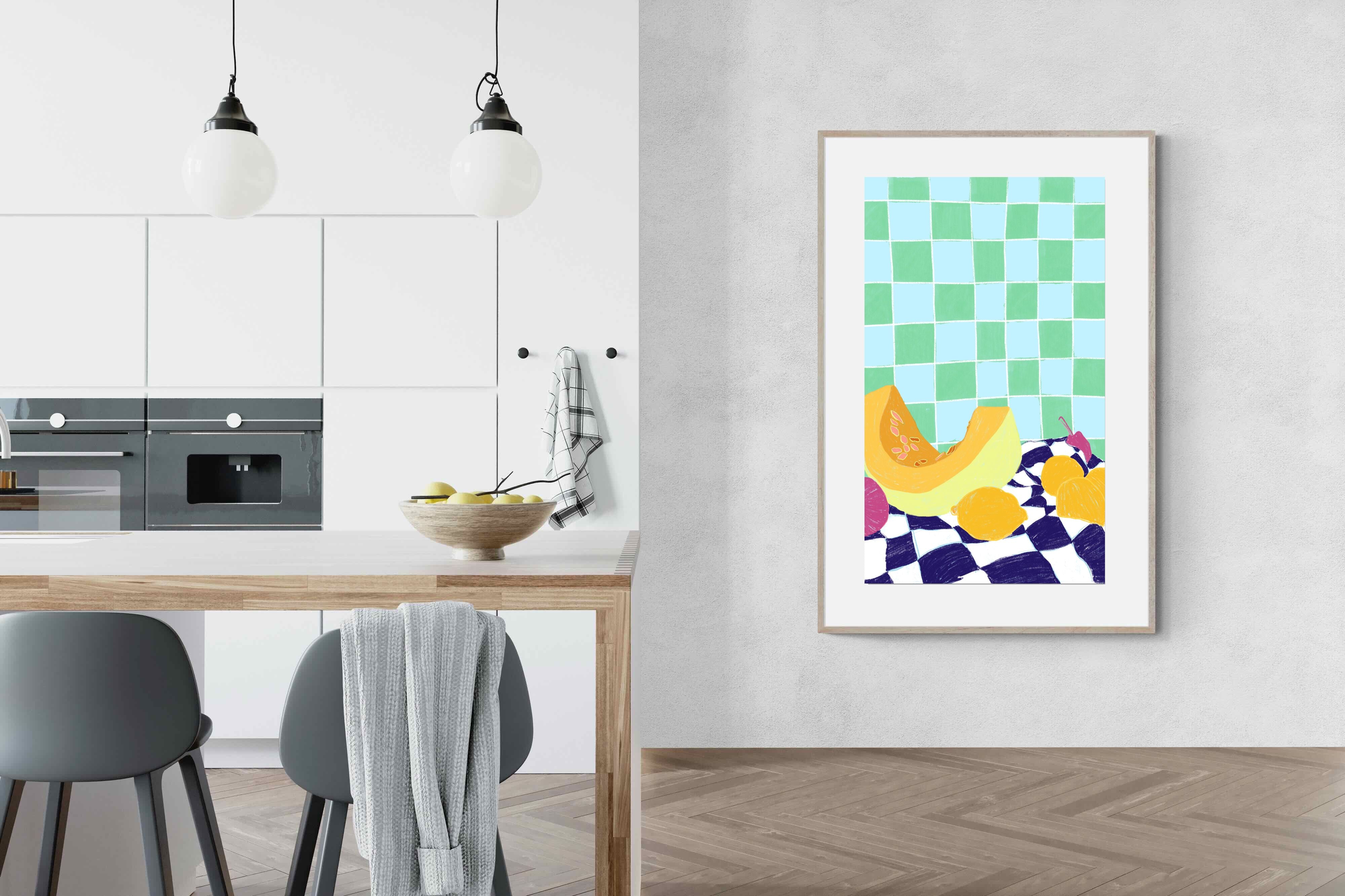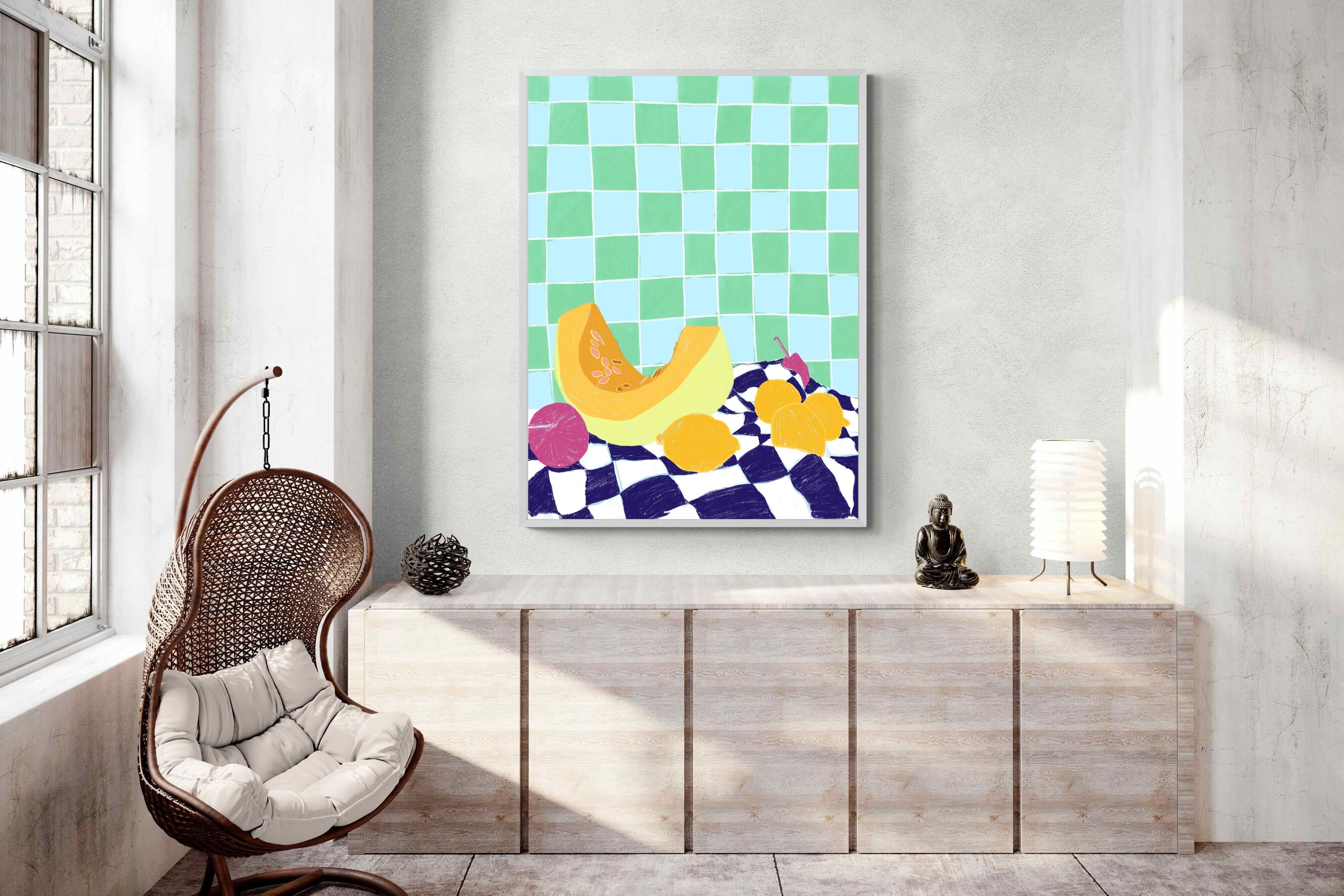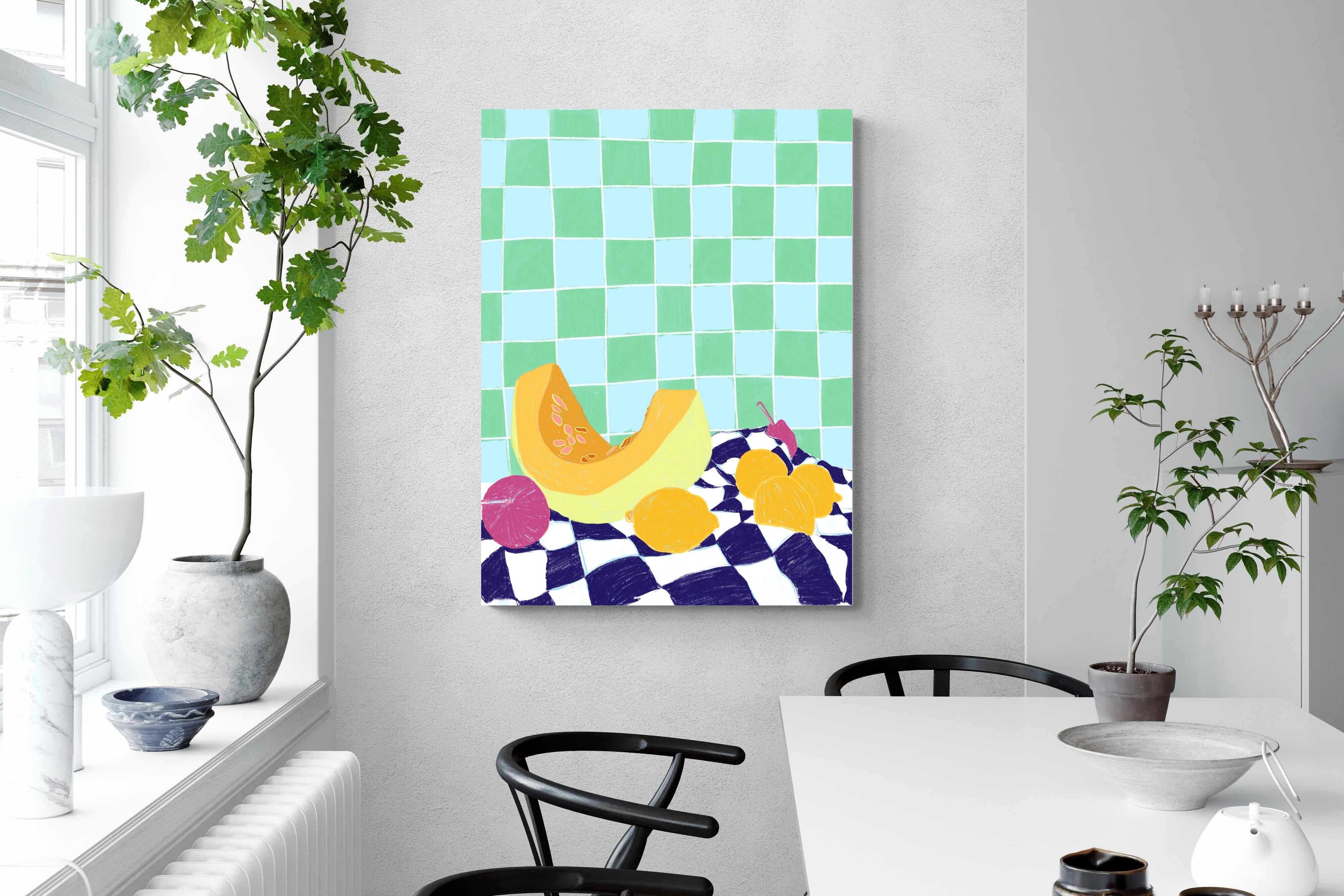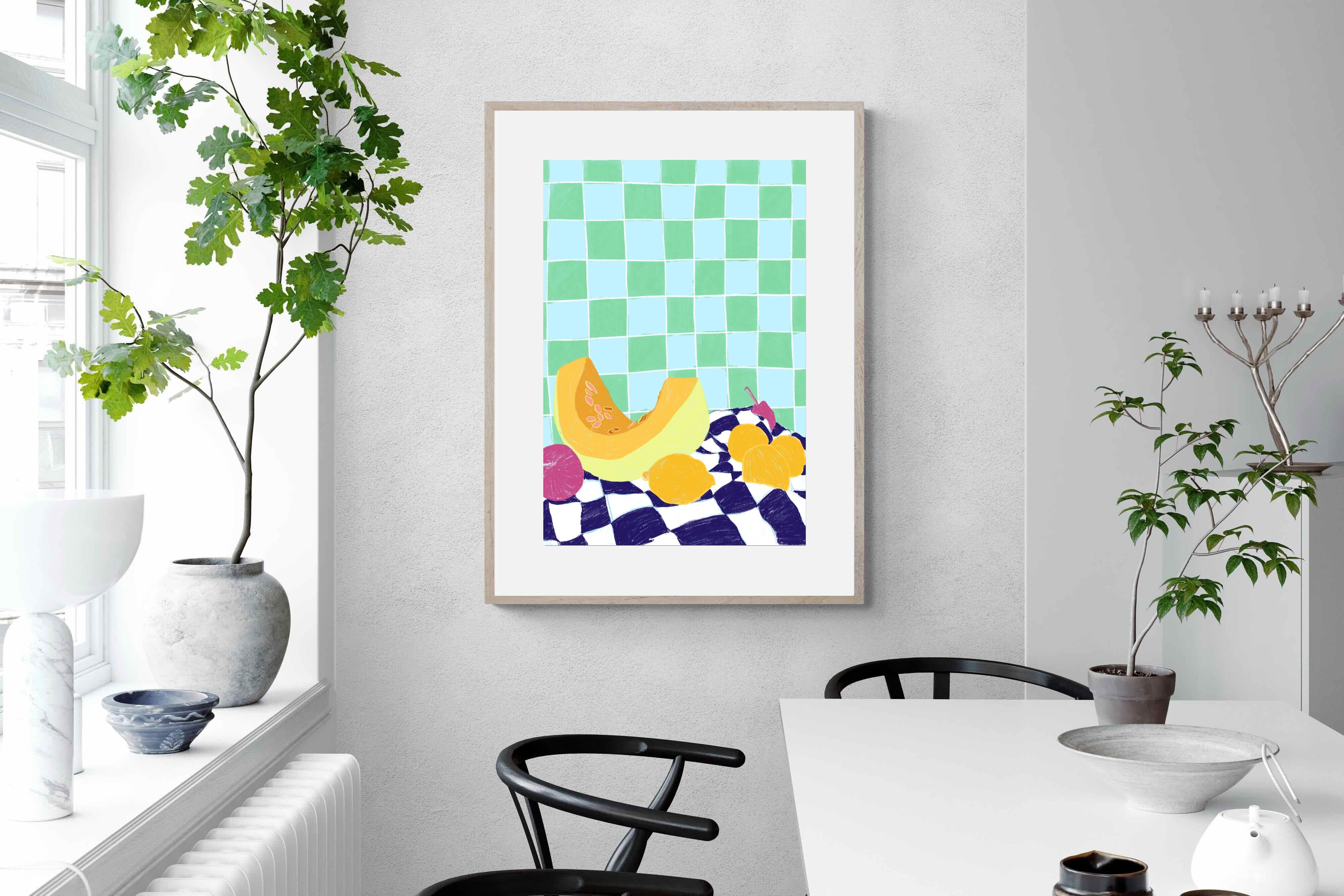 Featuring a vibrant still life of fruits on a checkered cloth against a tiled background, this illustration brings a lively and refreshing feel. Its bright colours and playful composition make it a great choice for contemporary kitchens or dining areas, adding a pop of colour and a cheerful atmosphere.