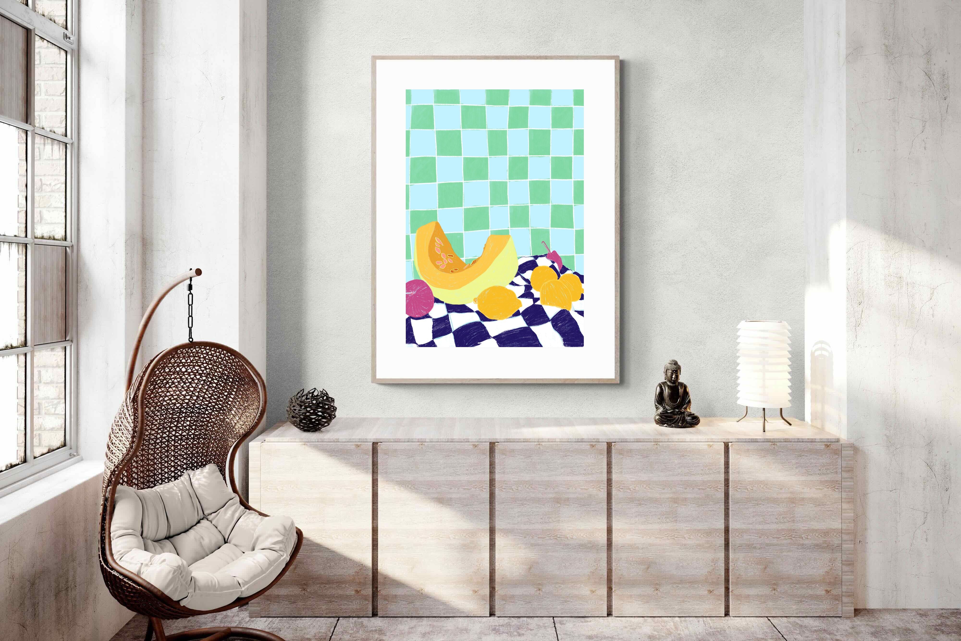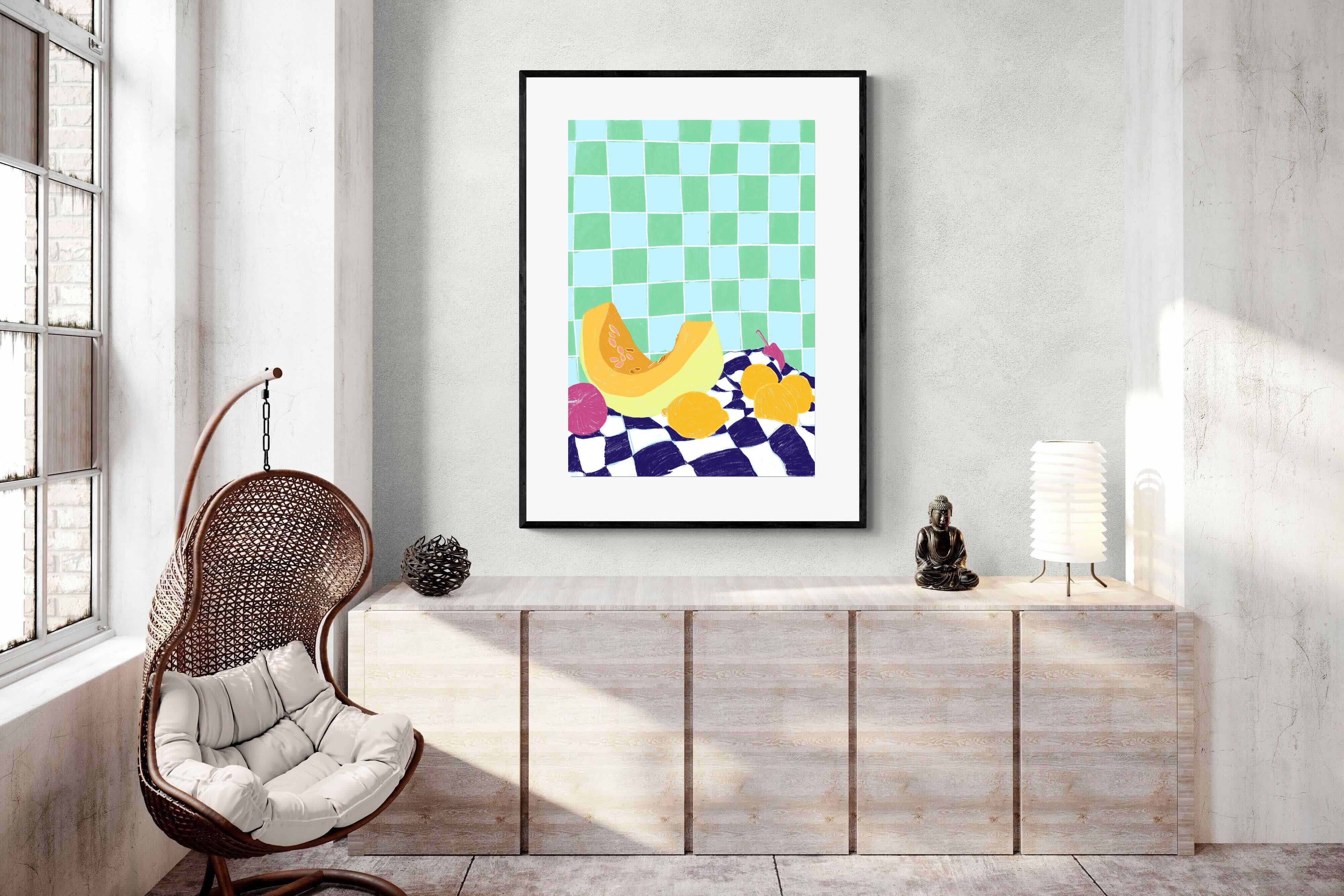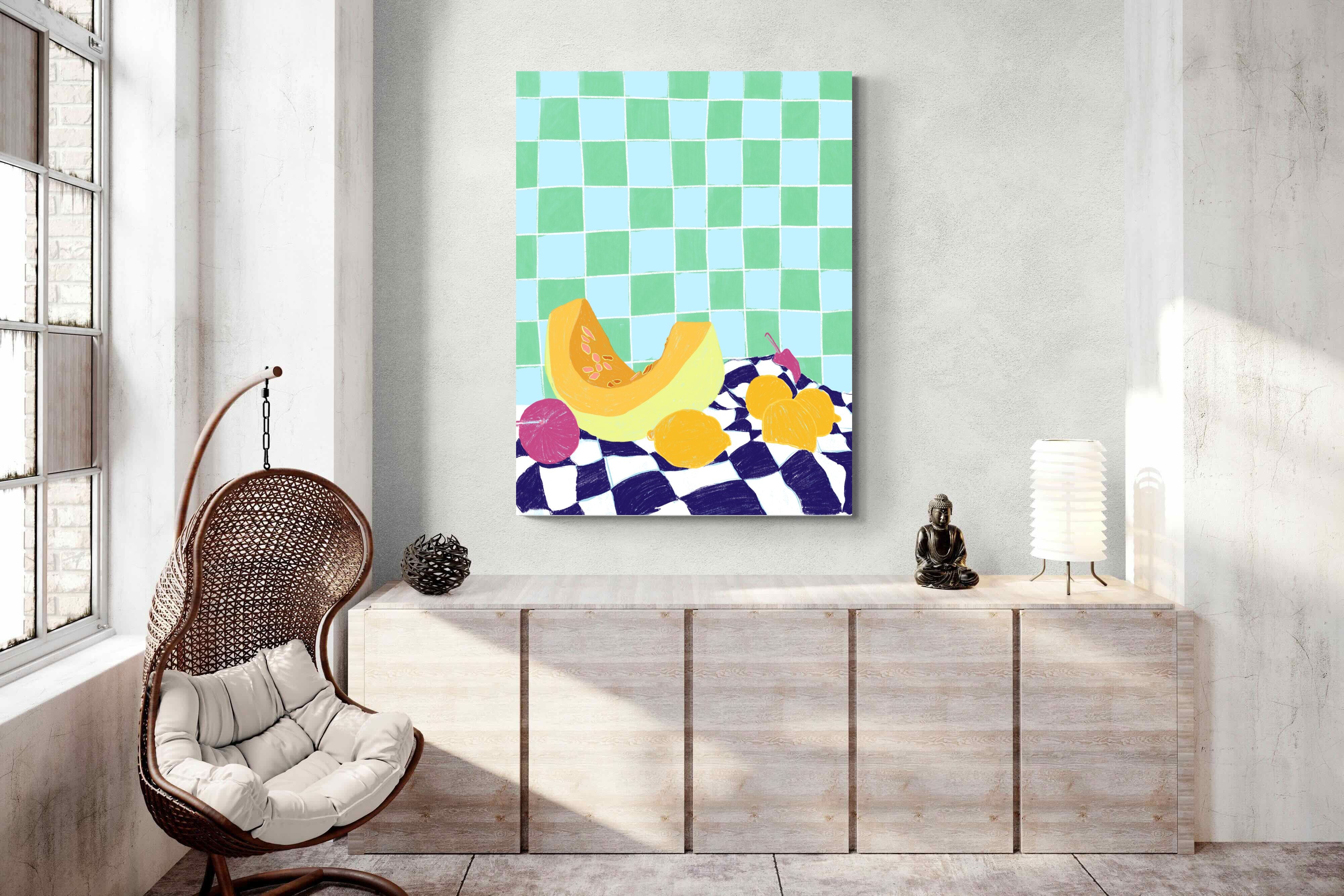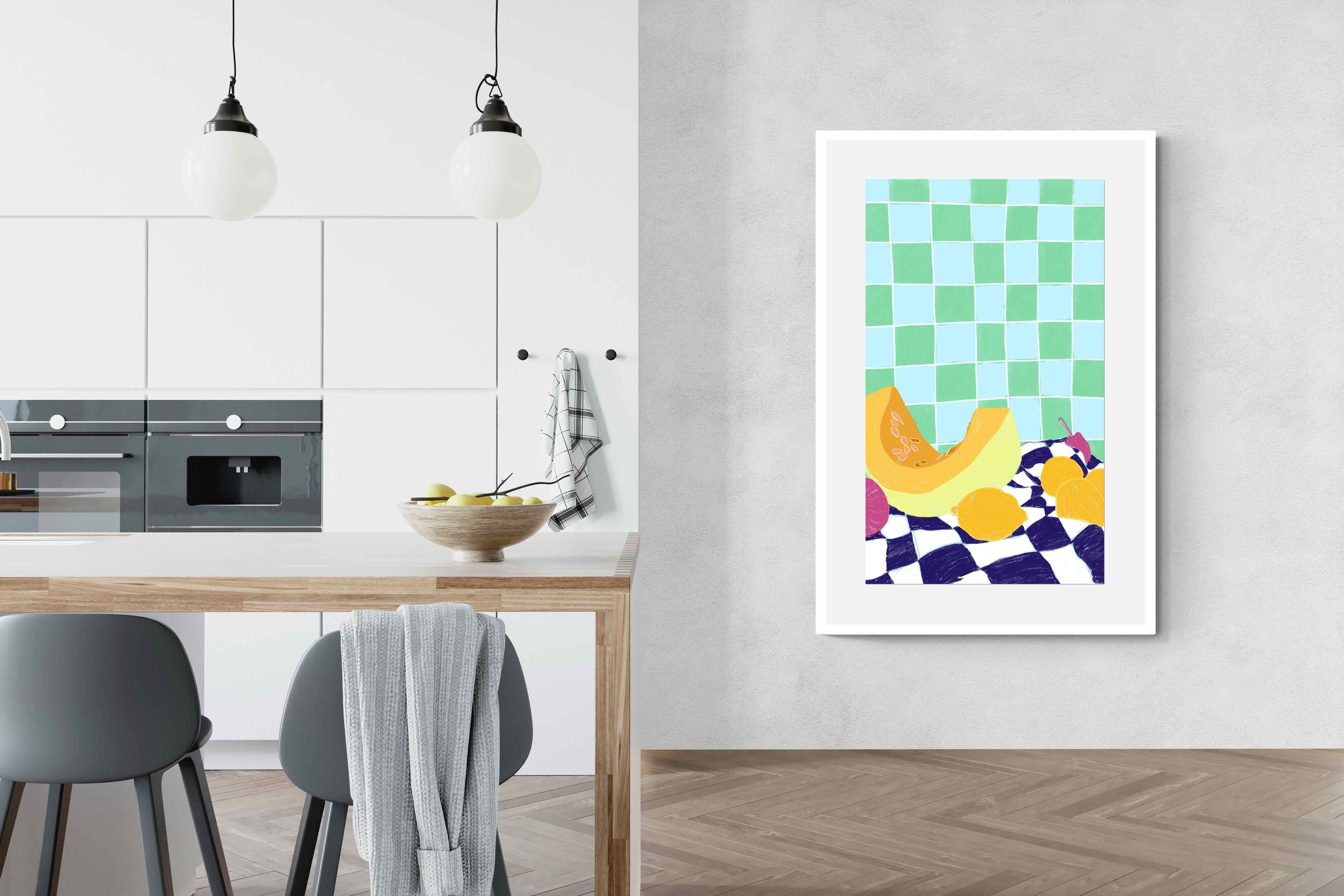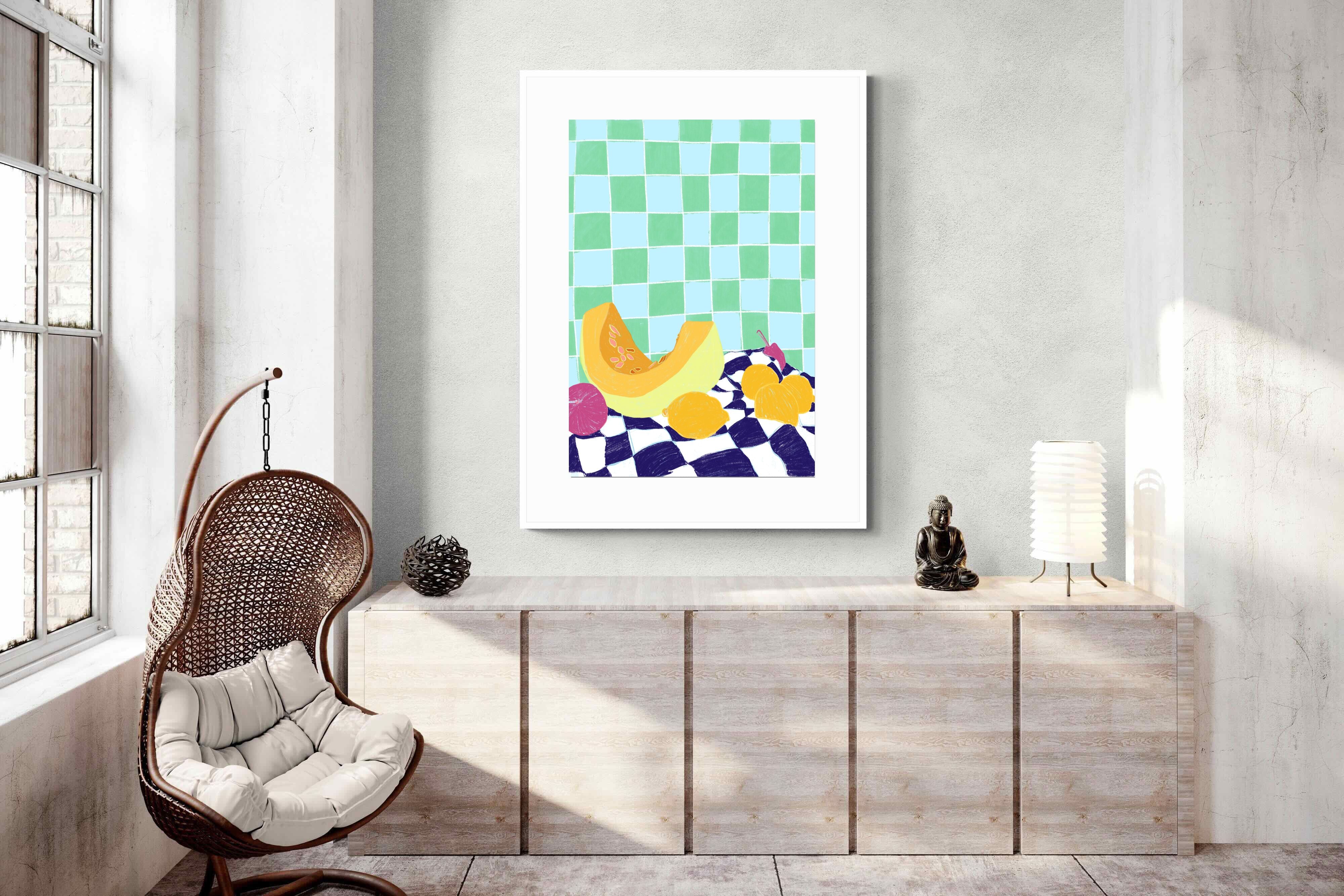 Featuring a vibrant still life of fruits on a checkered cloth against a tiled background, this illustration brings a lively and refreshing feel. Its bright colours and playful composition make it a great choice for contemporary kitchens or dining areas, adding a pop of colour and a cheerful atmosphere.