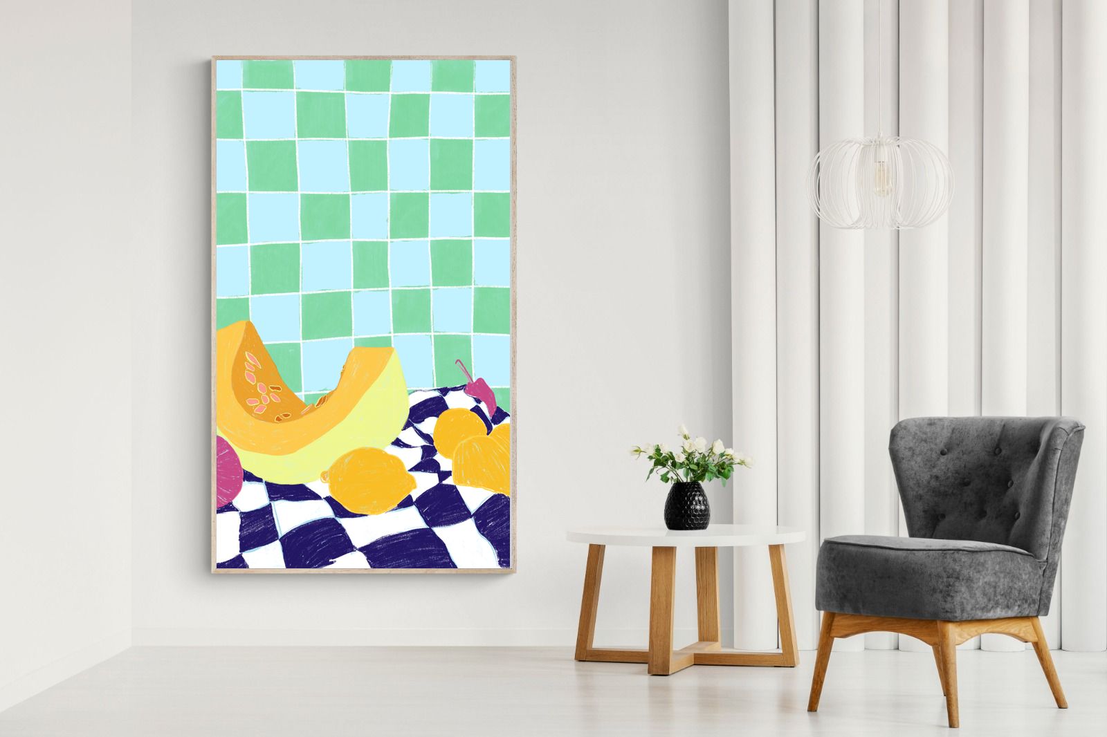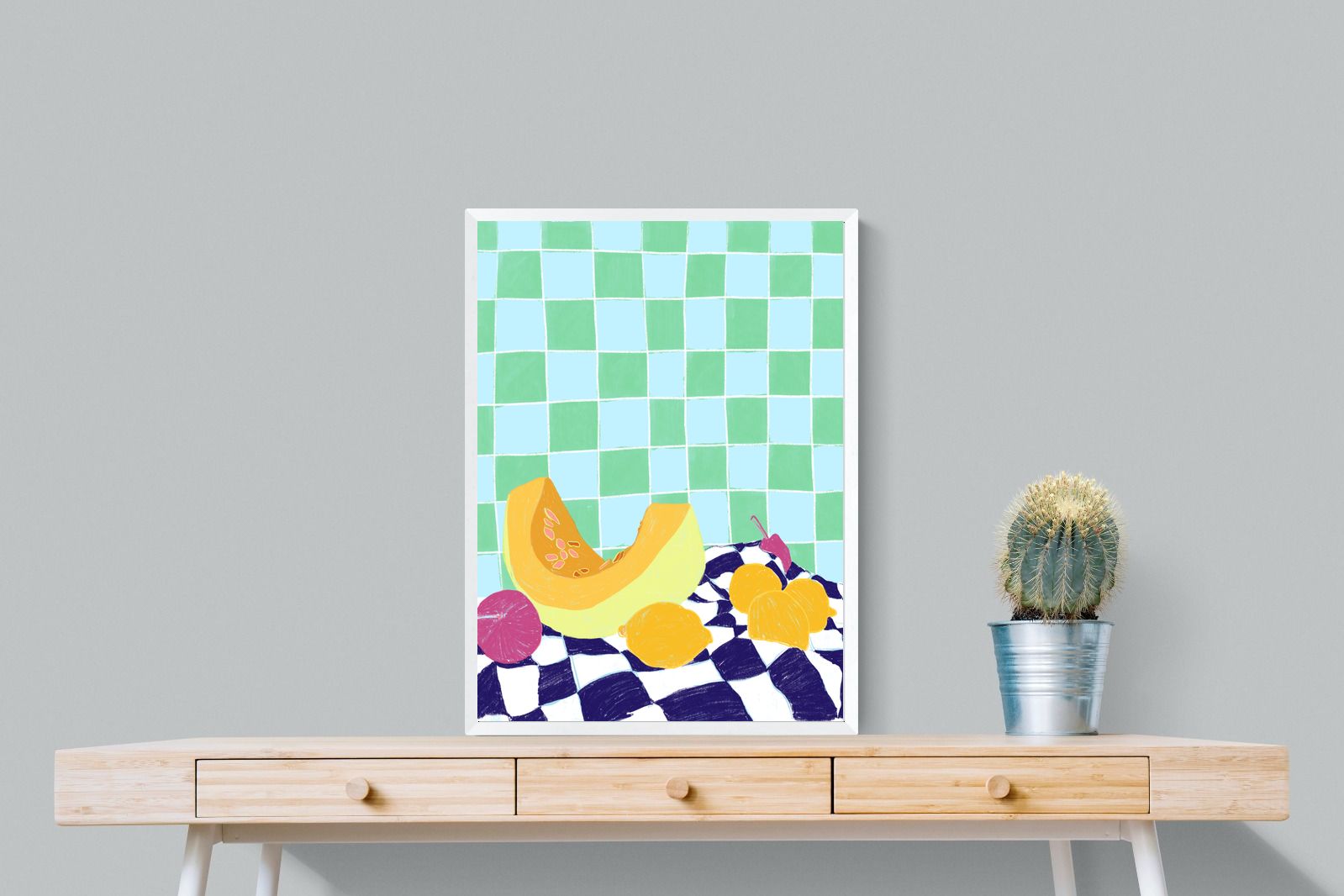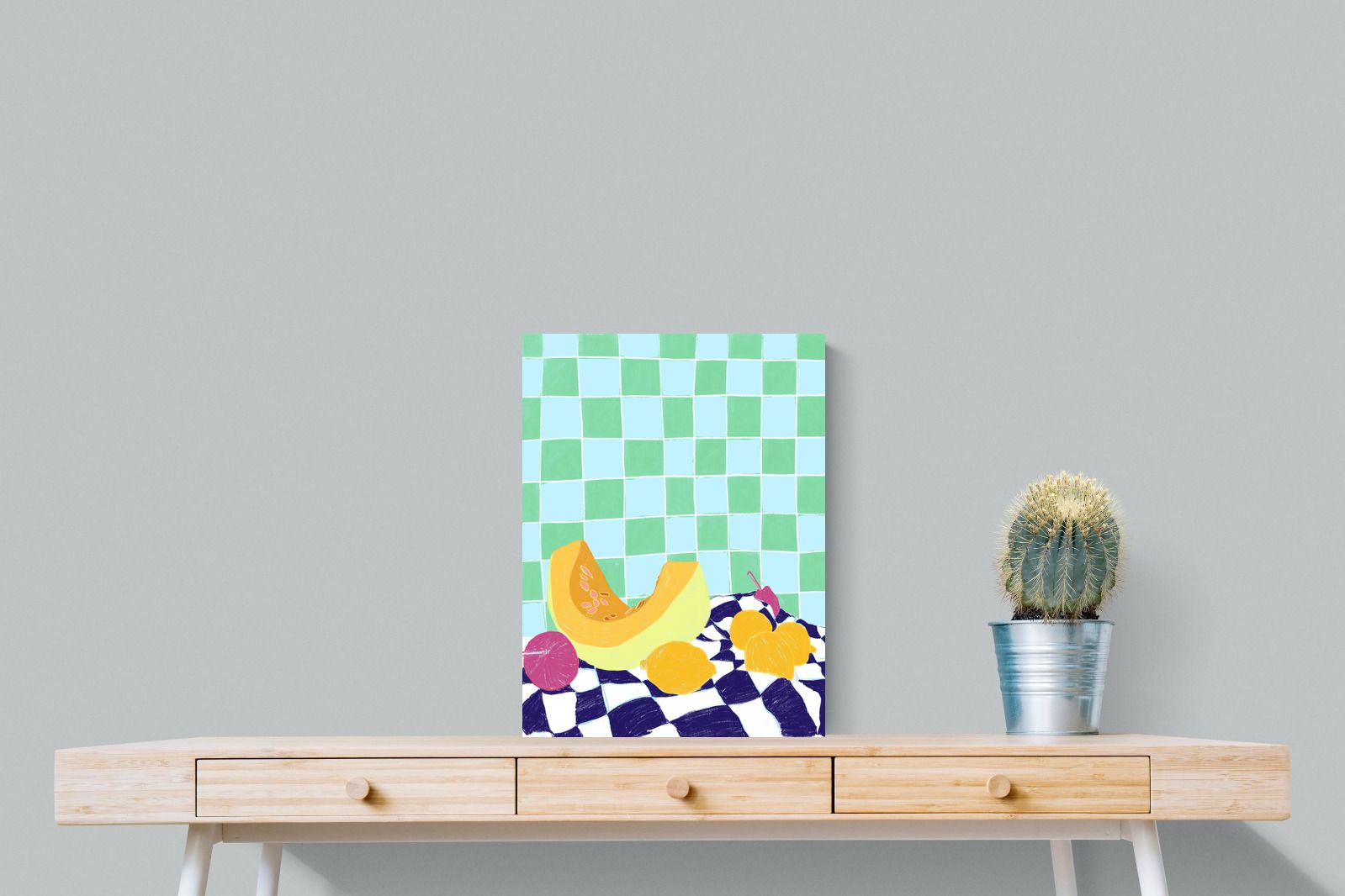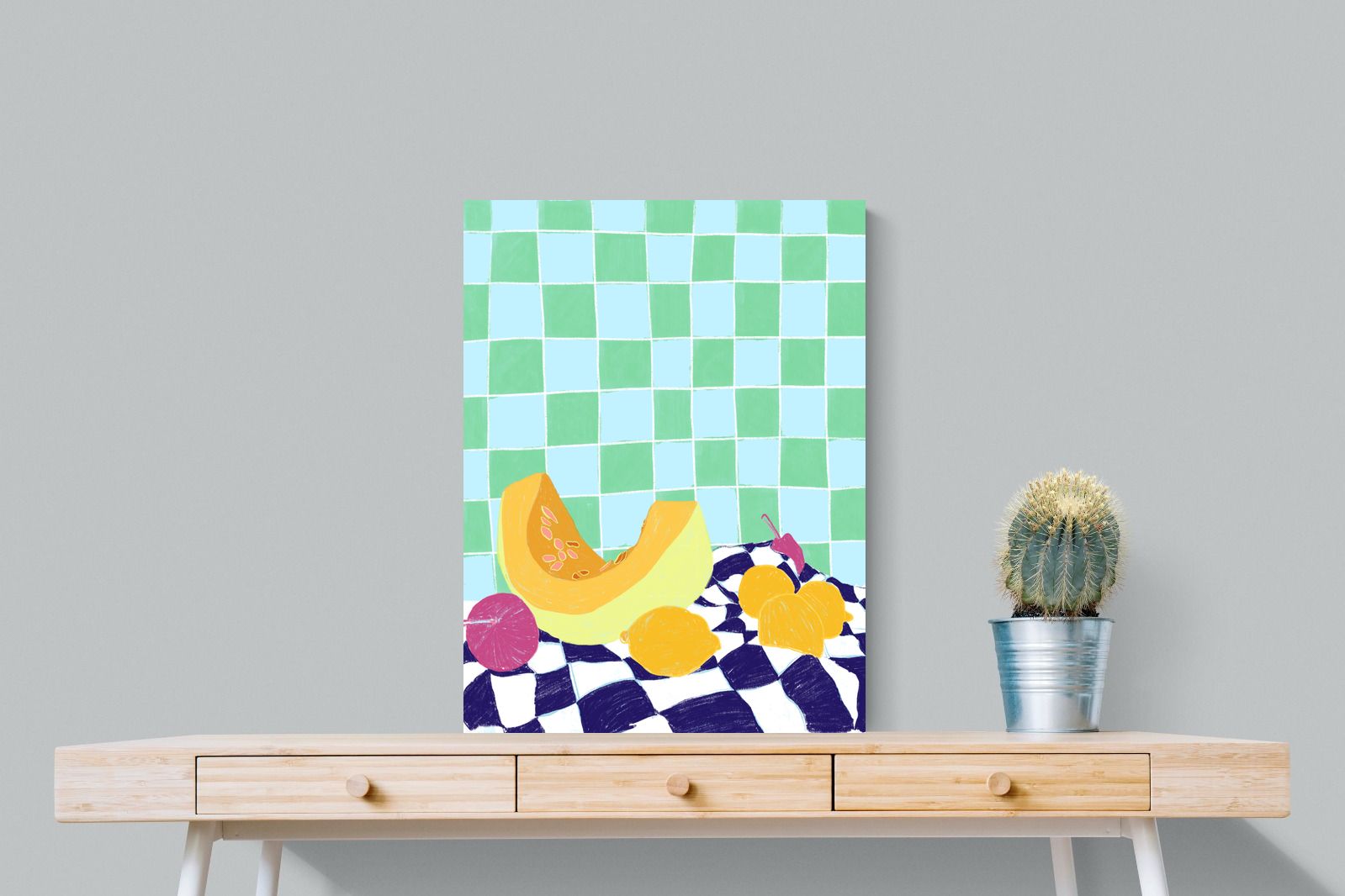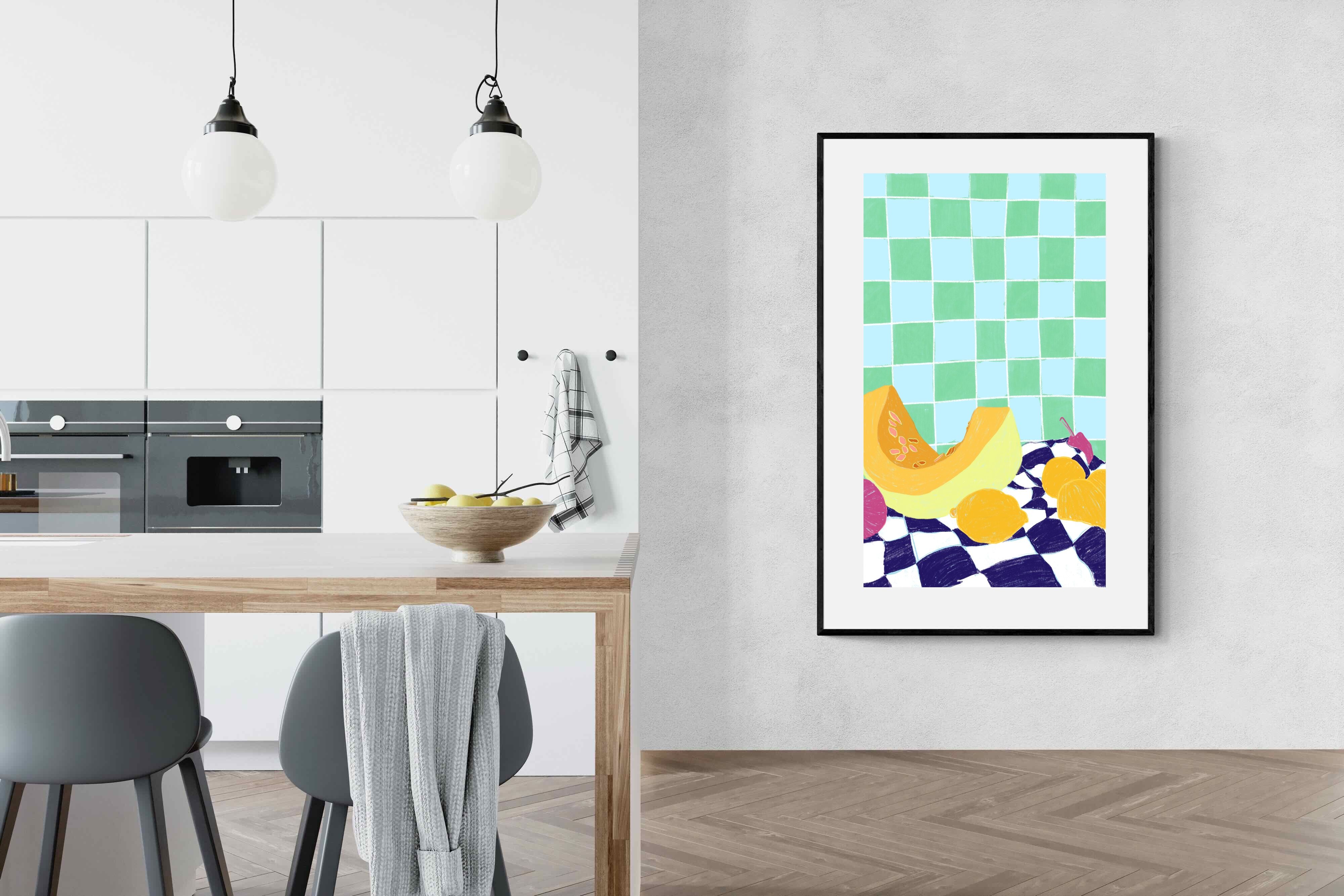 Featuring a vibrant still life of fruits on a checkered cloth against a tiled background, this illustration brings a lively and refreshing feel. Its bright colours and playful composition make it a great choice for contemporary kitchens or dining areas, adding a pop of colour and a cheerful atmosphere.