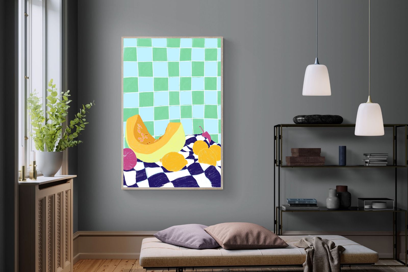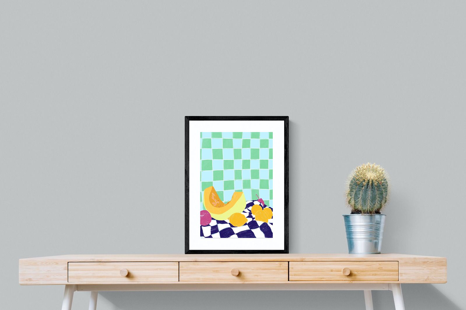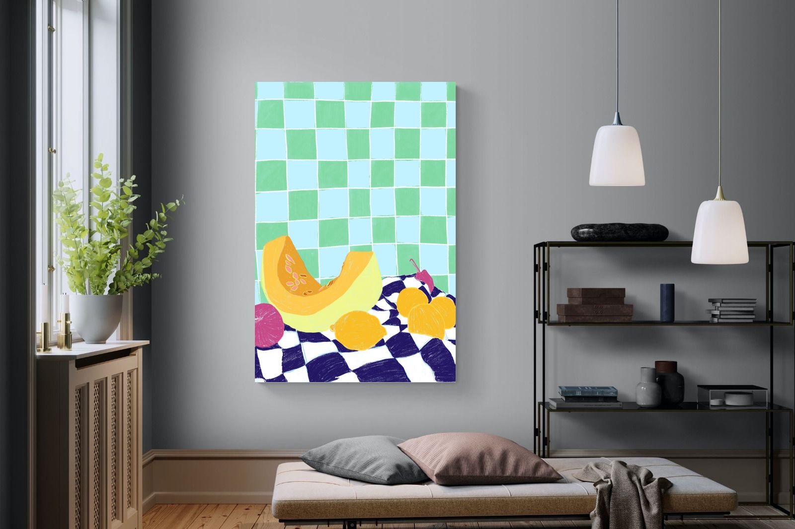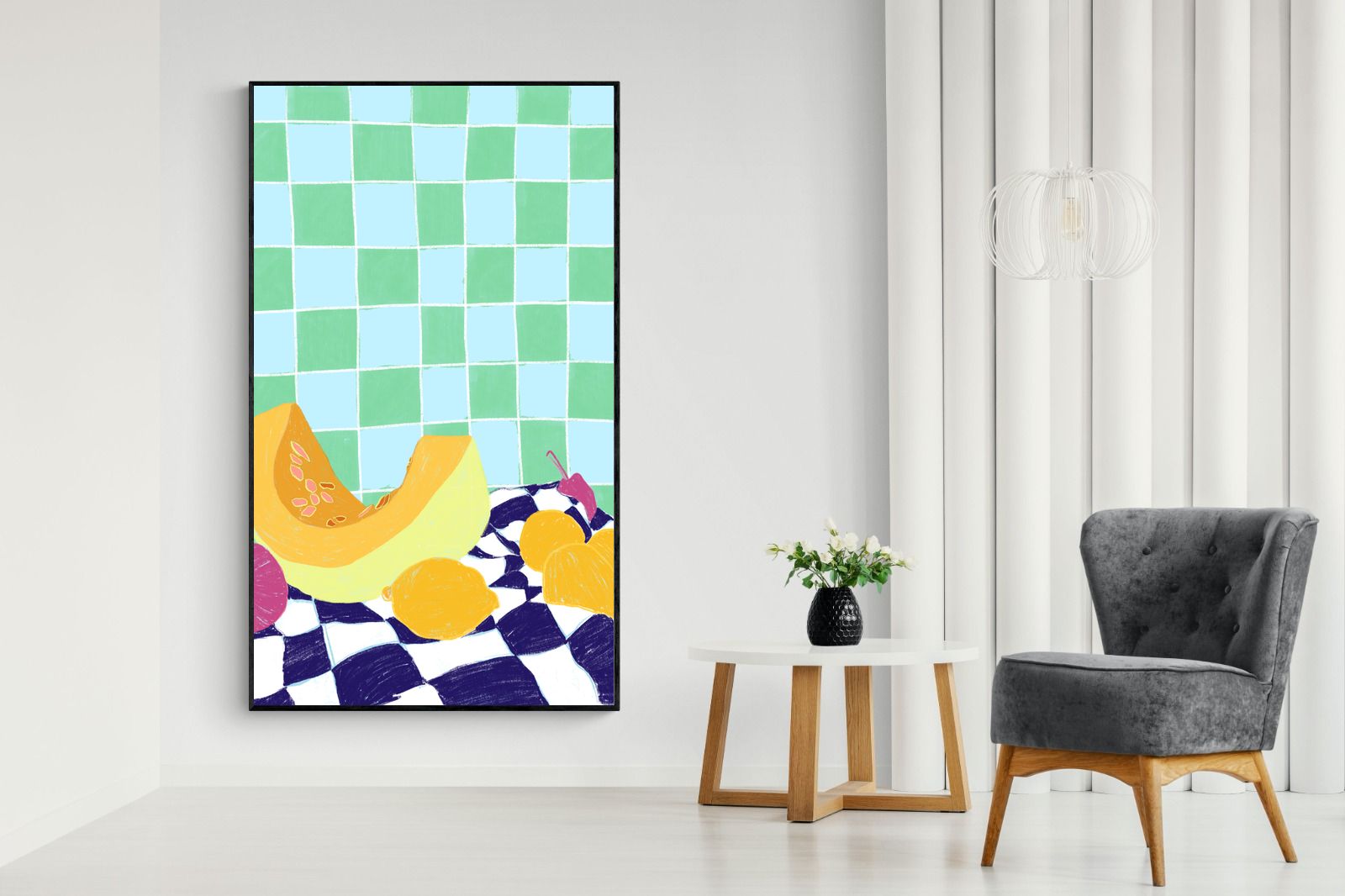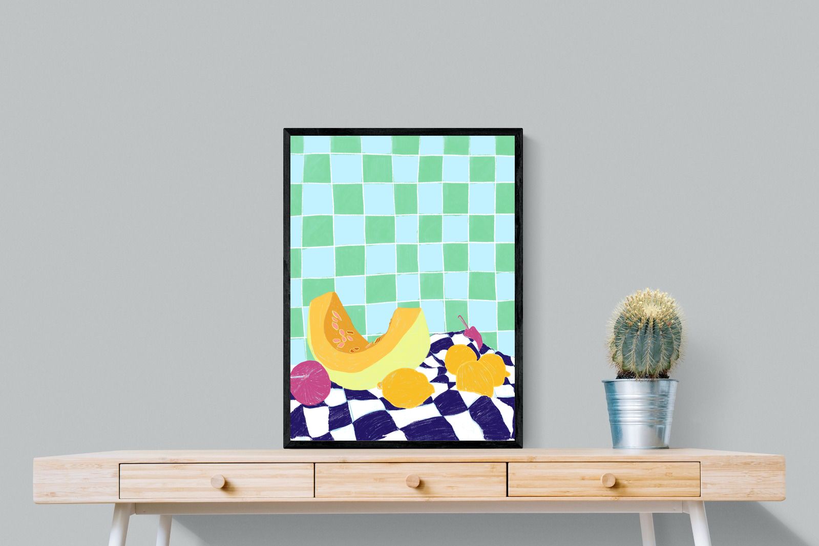 Featuring a vibrant still life of fruits on a checkered cloth against a tiled background, this illustration brings a lively and refreshing feel. Its bright colours and playful composition make it a great choice for contemporary kitchens or dining areas, adding a pop of colour and a cheerful atmosphere.