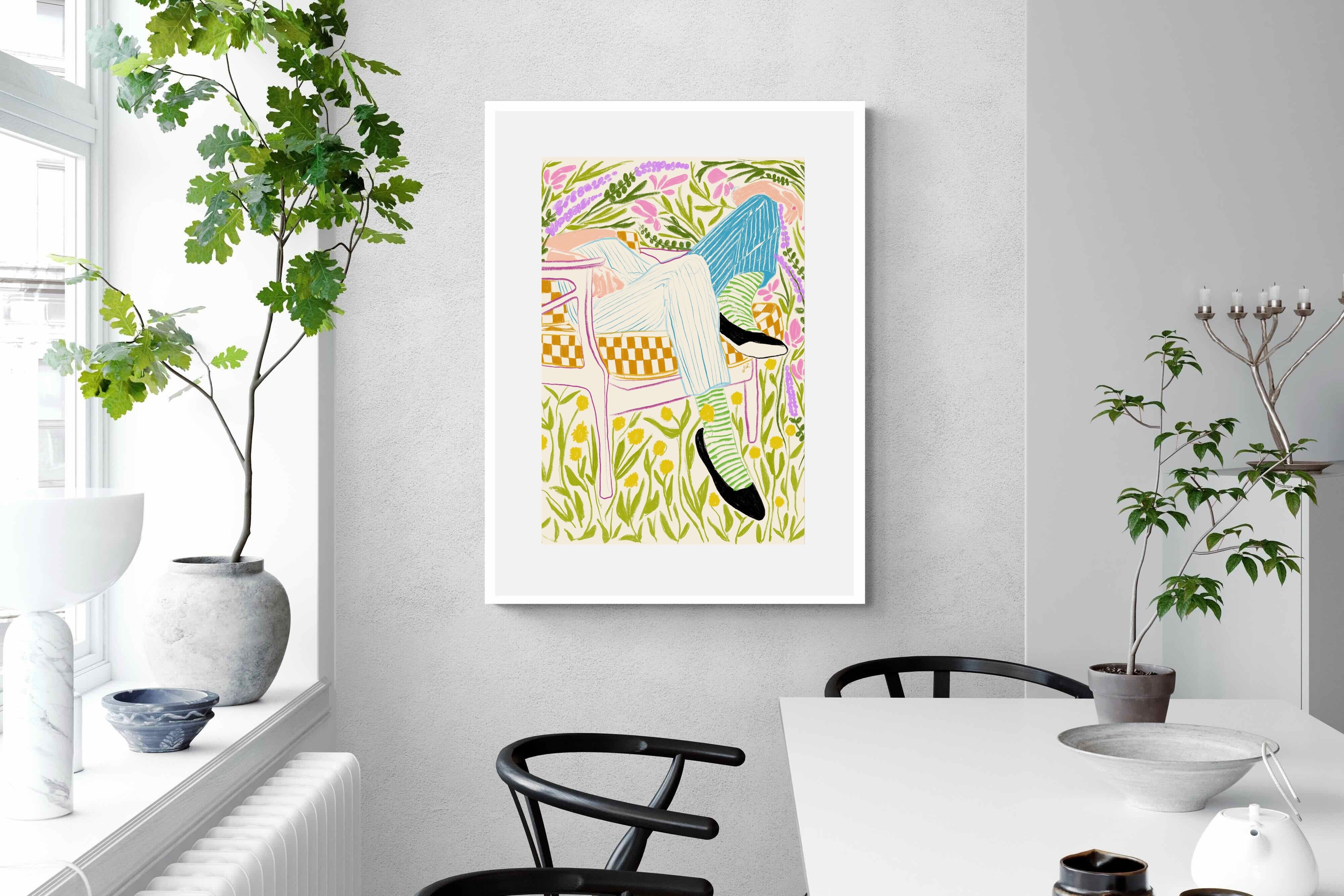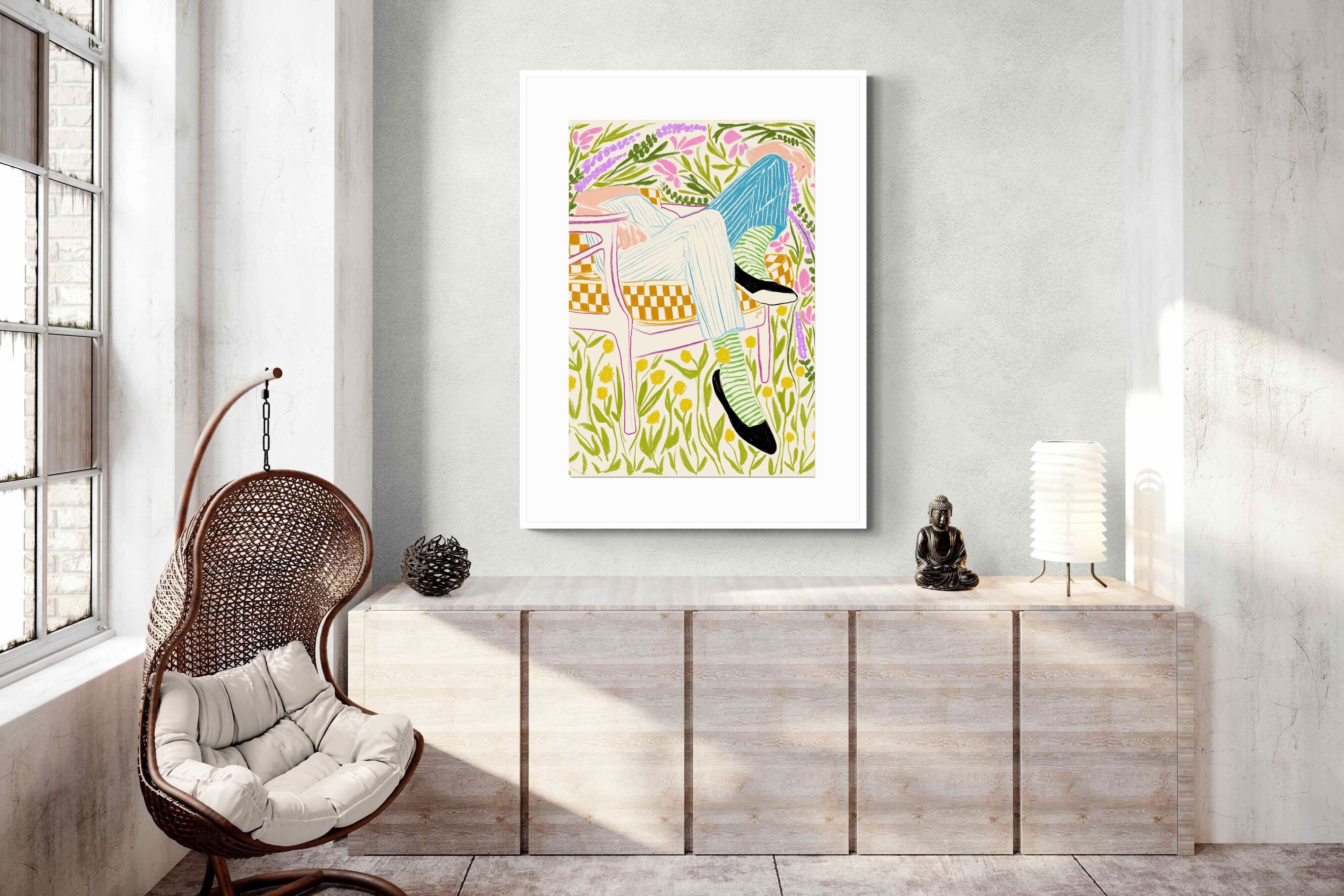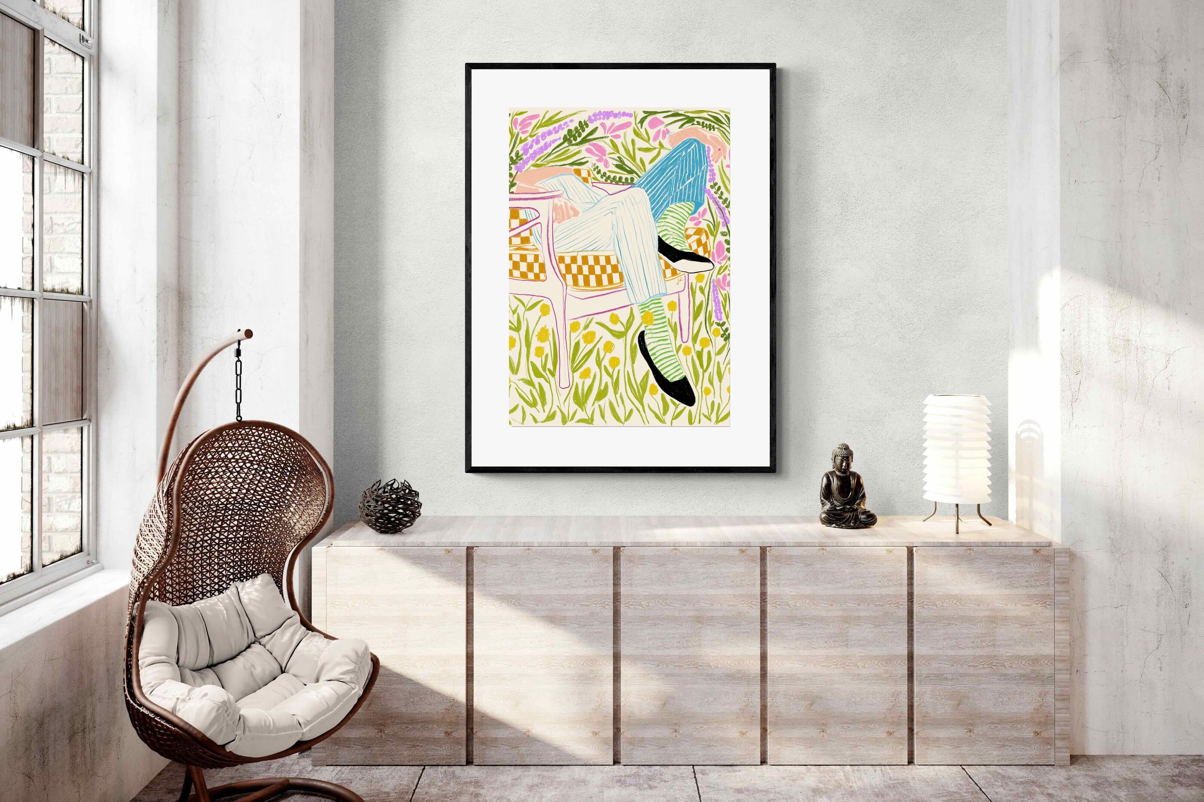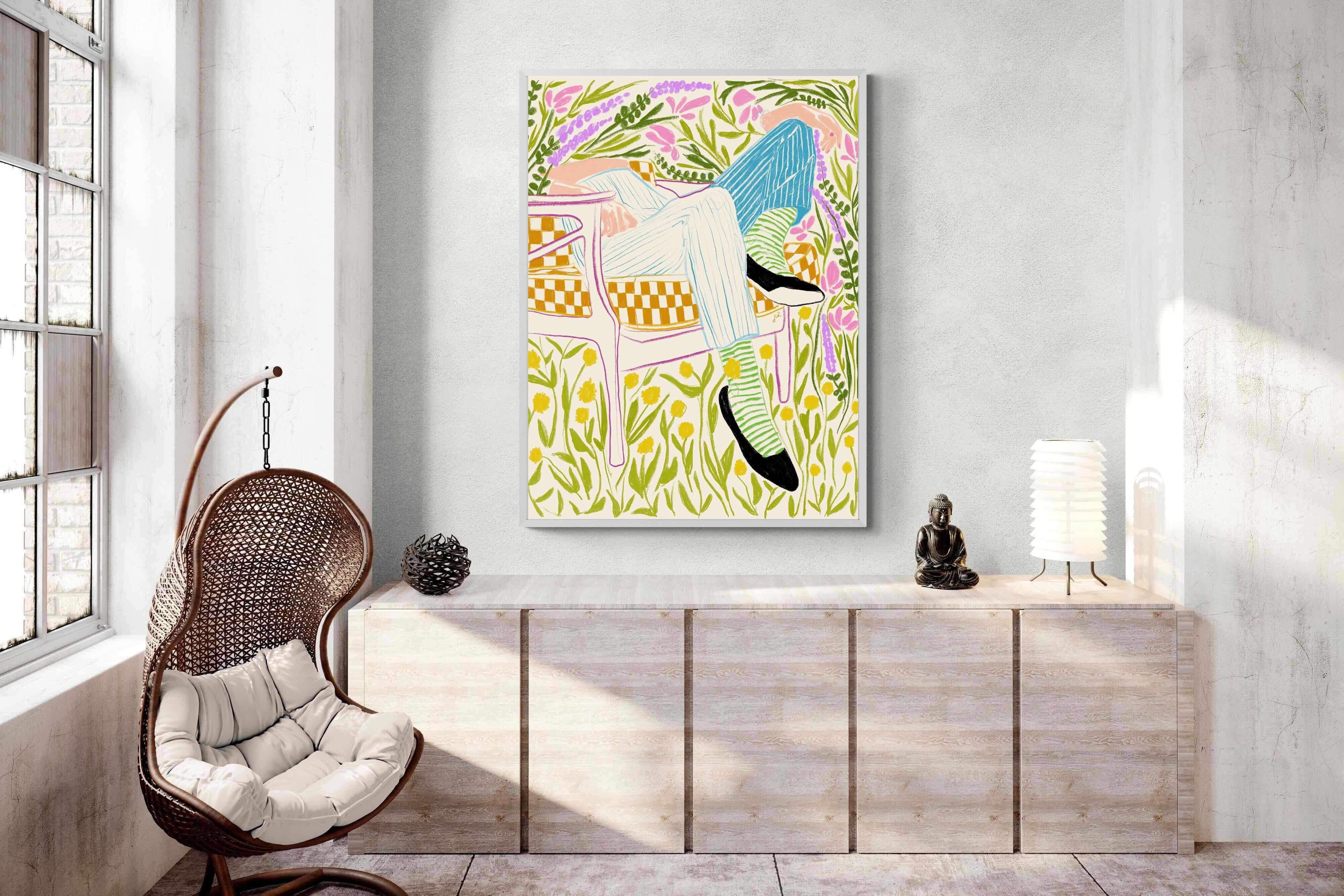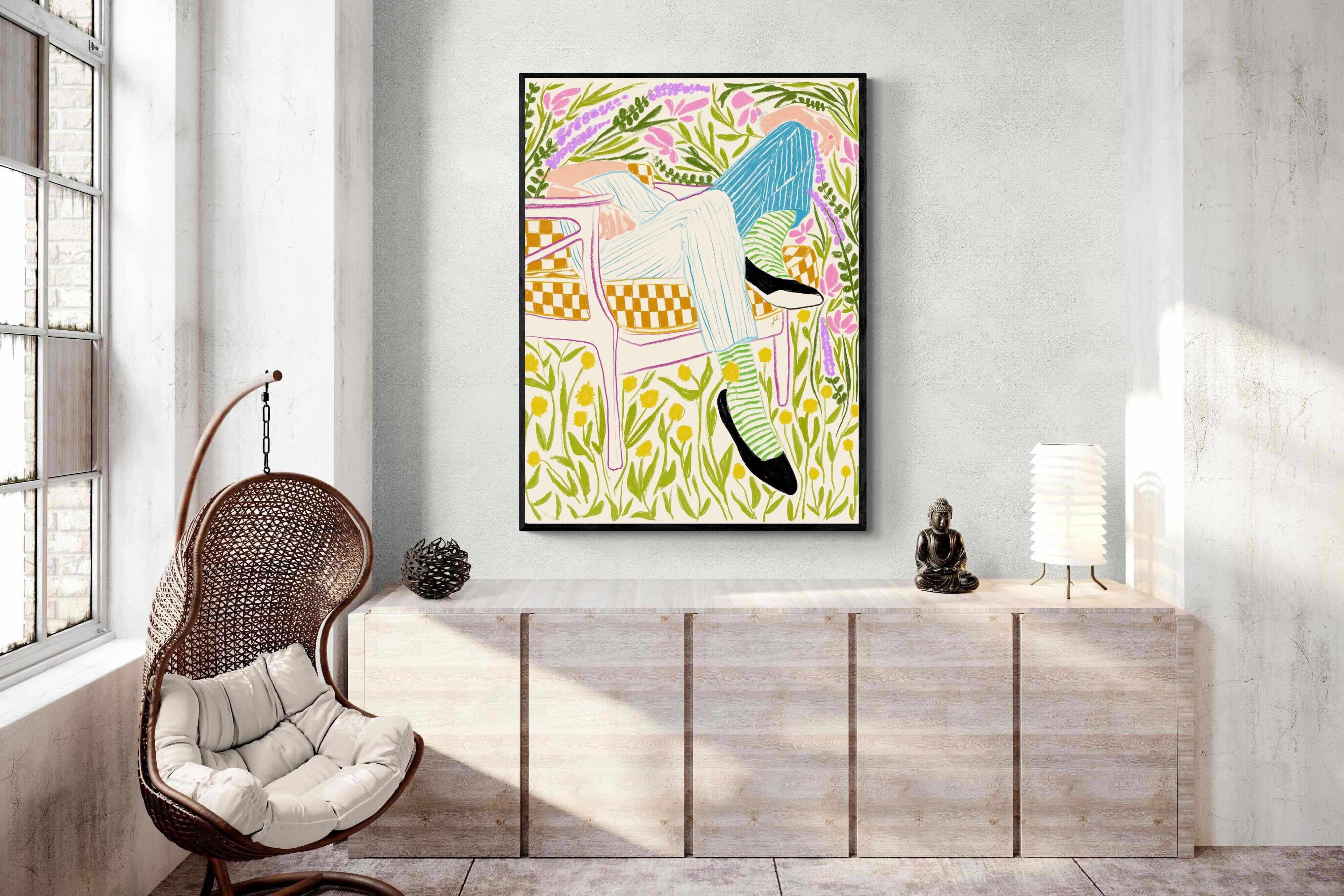 This vibrant artwork features a relaxed figure reclining in a chair amidst a lush, floral backdrop. The colourful, sketch-like lines and patterns create a whimsical and tranquil atmosphere. This piece would be a great addition to a contemporary home, particularly in a living room or bedroom, bringing a sense of relaxation and joy. Its playful and intricate design can add visual interest and a touch of nature to the space.