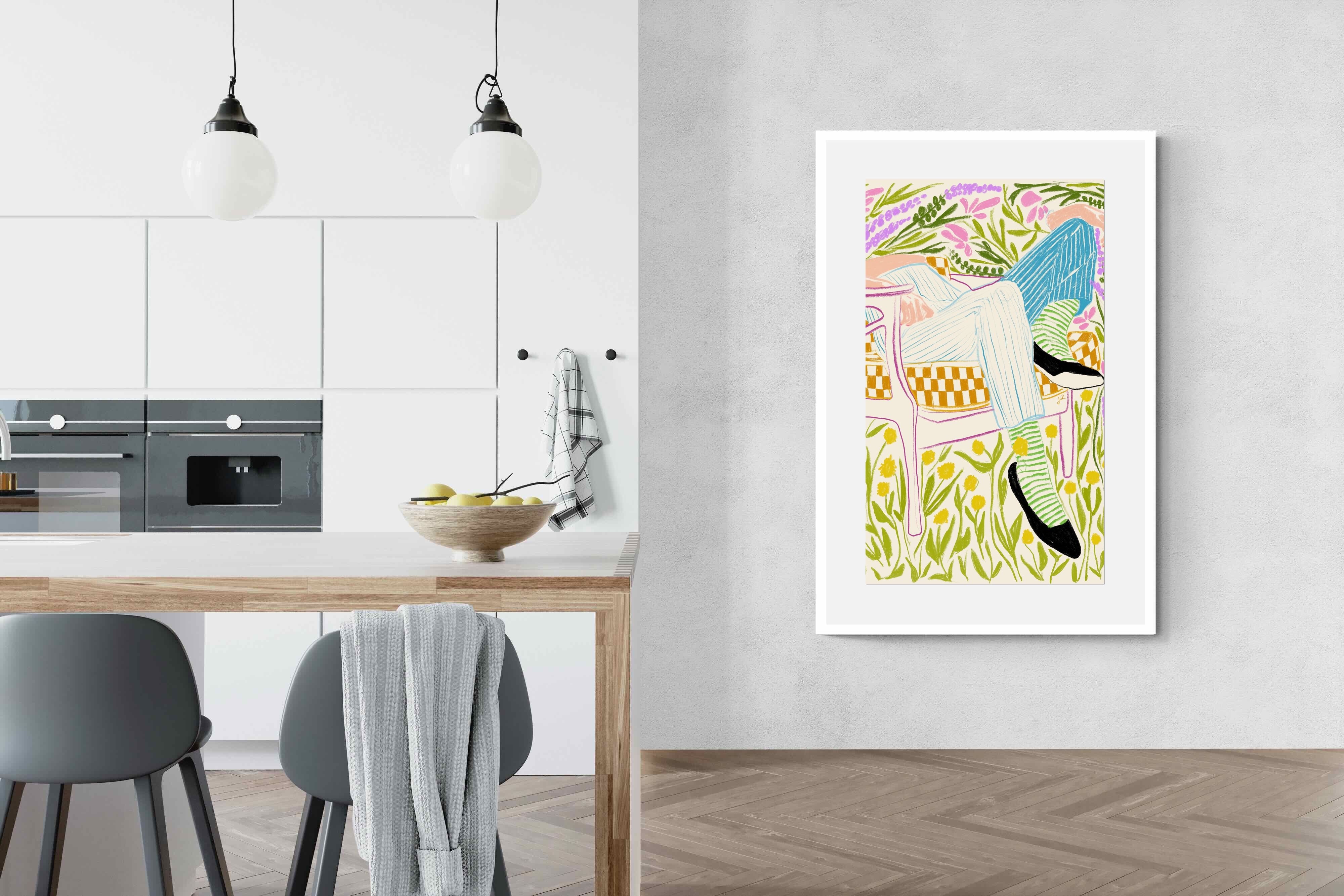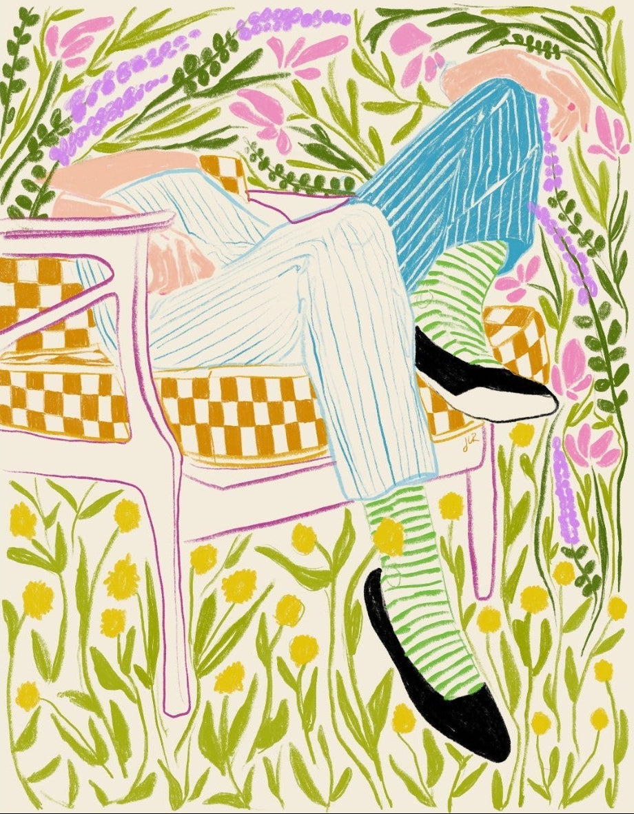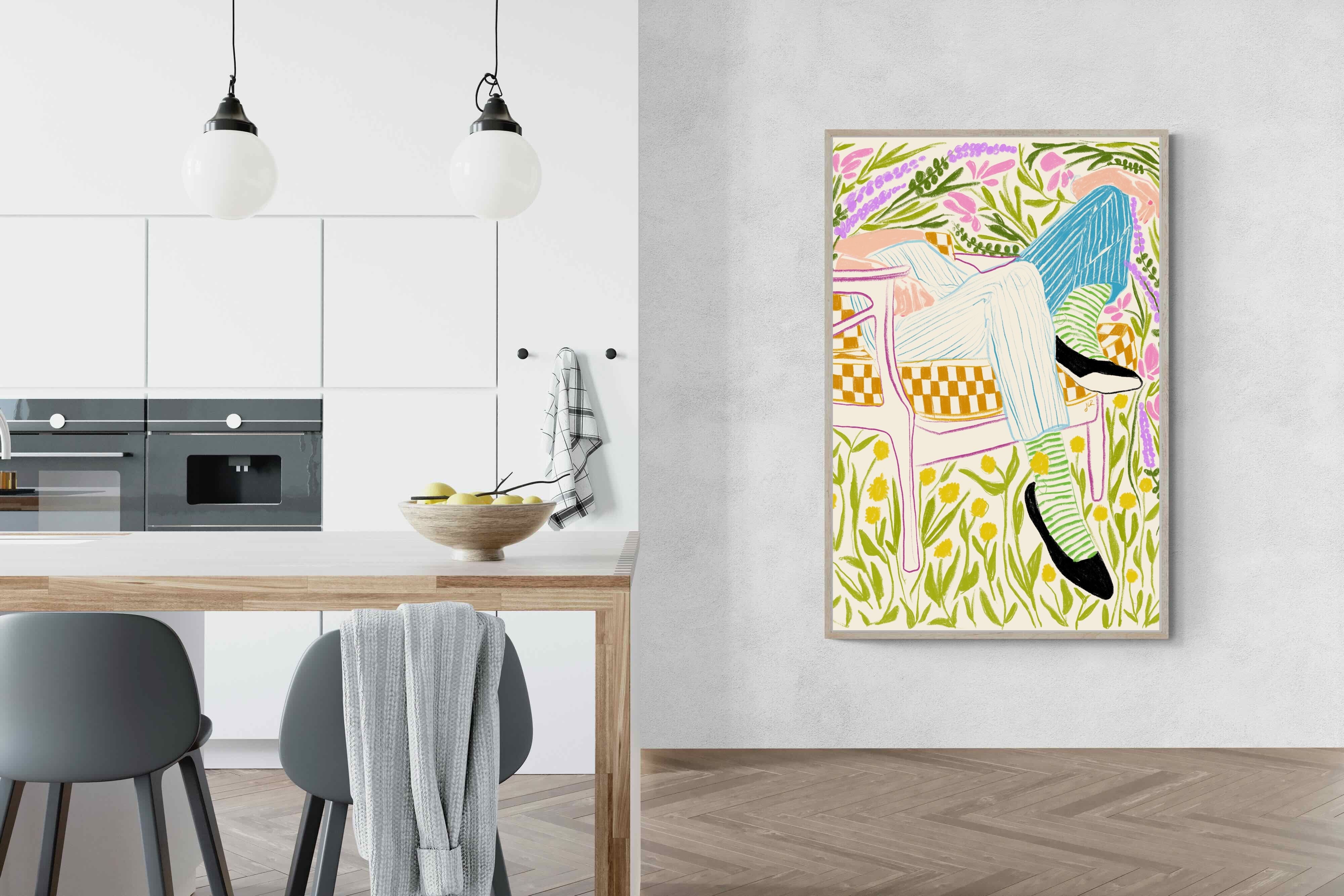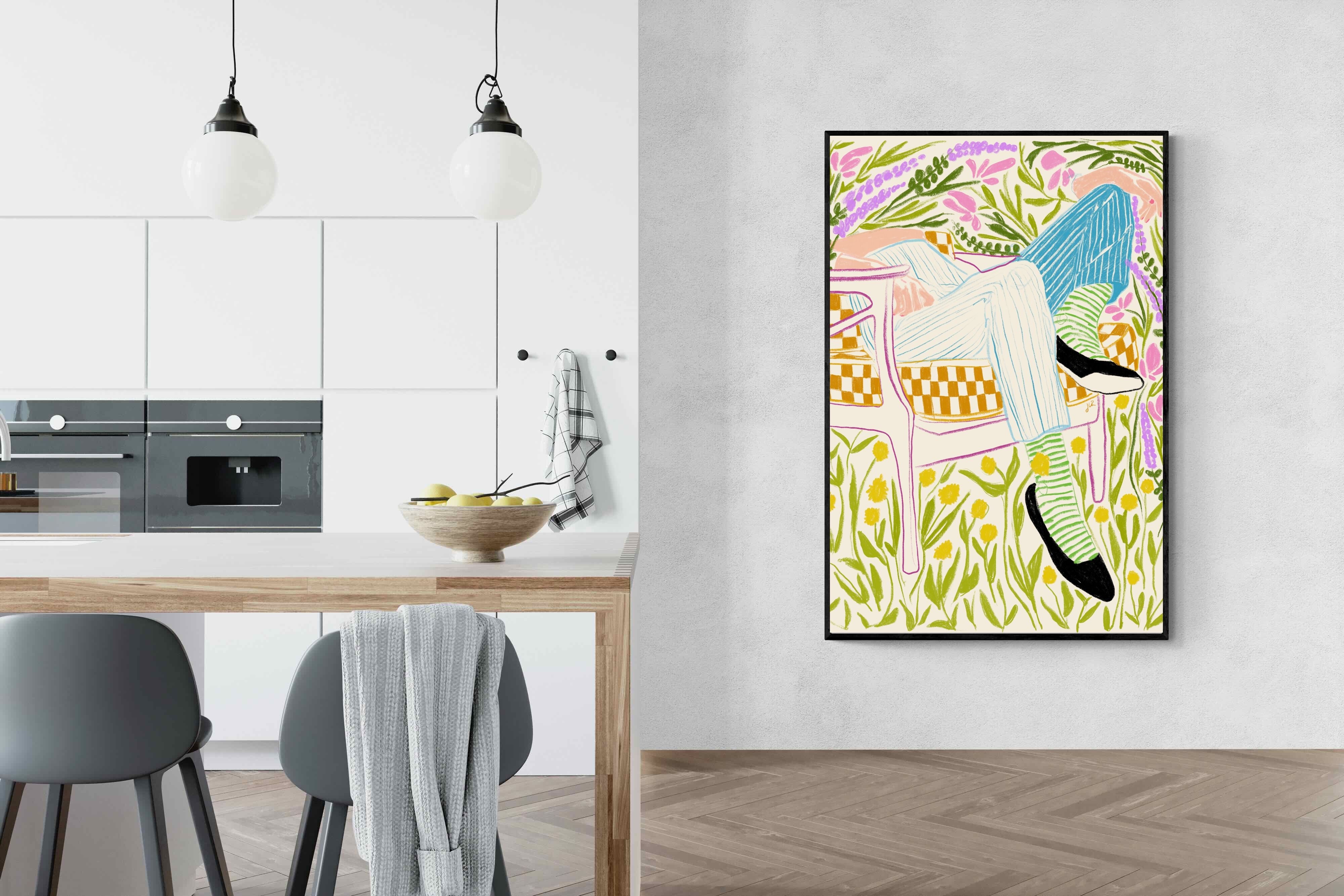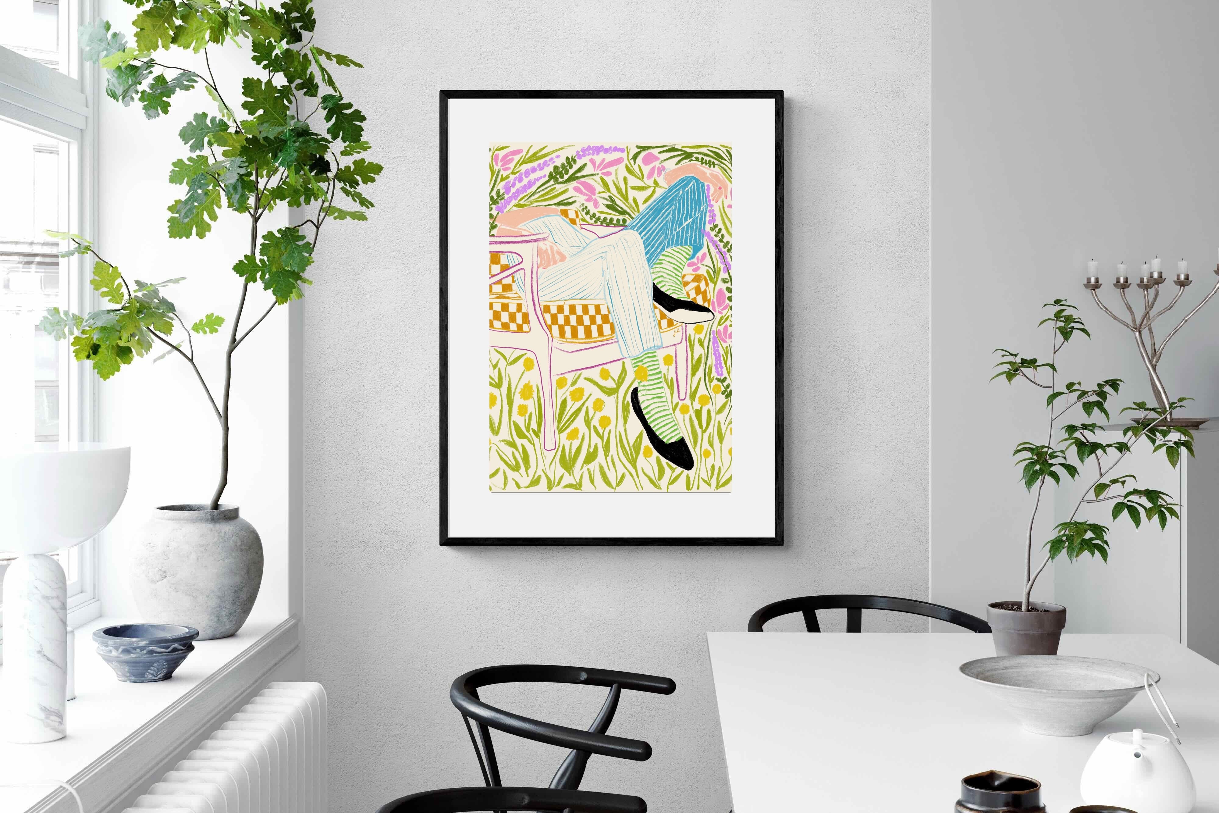 This vibrant artwork features a relaxed figure reclining in a chair amidst a lush, floral backdrop. The colourful, sketch-like lines and patterns create a whimsical and tranquil atmosphere. This piece would be a great addition to a contemporary home, particularly in a living room or bedroom, bringing a sense of relaxation and joy. Its playful and intricate design can add visual interest and a touch of nature to the space.