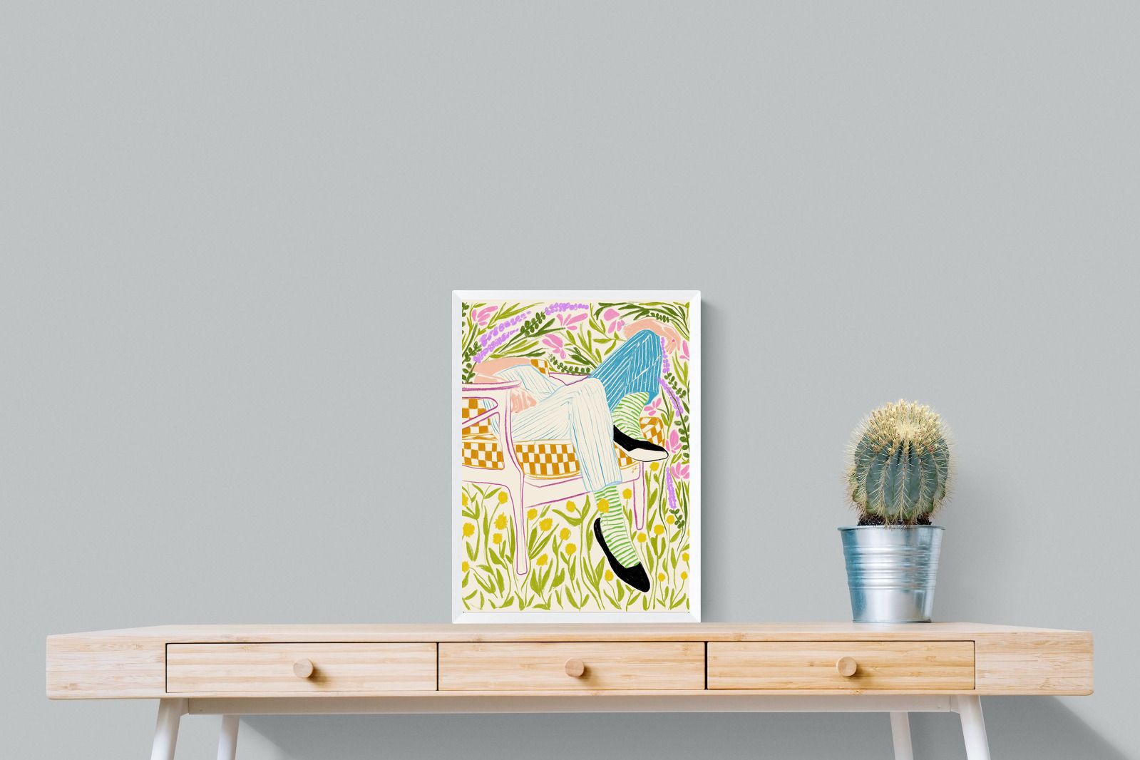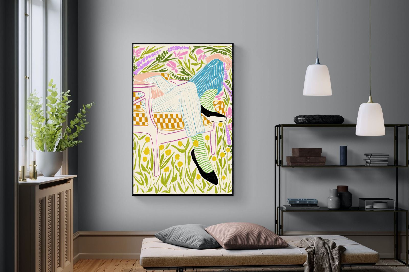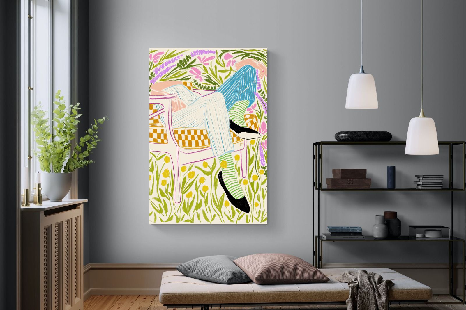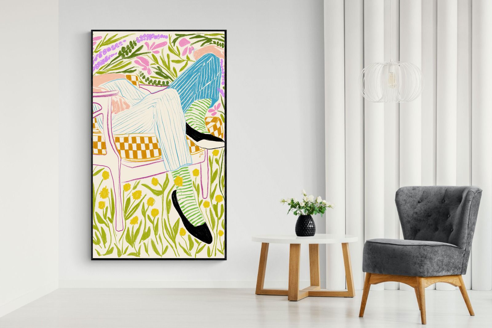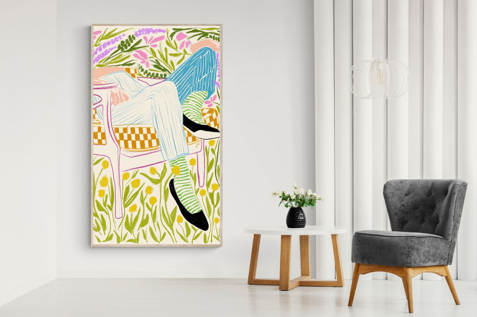 This vibrant artwork features a relaxed figure reclining in a chair amidst a lush, floral backdrop. The colourful, sketch-like lines and patterns create a whimsical and tranquil atmosphere. This piece would be a great addition to a contemporary home, particularly in a living room or bedroom, bringing a sense of relaxation and joy. Its playful and intricate design can add visual interest and a touch of nature to the space.