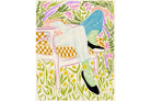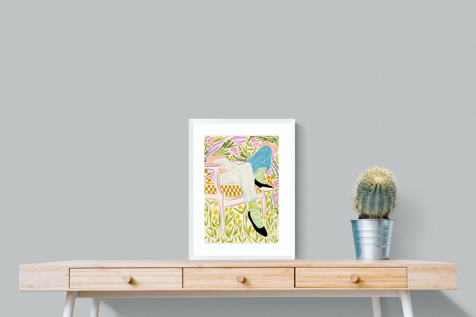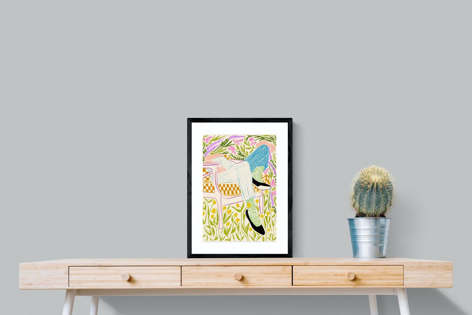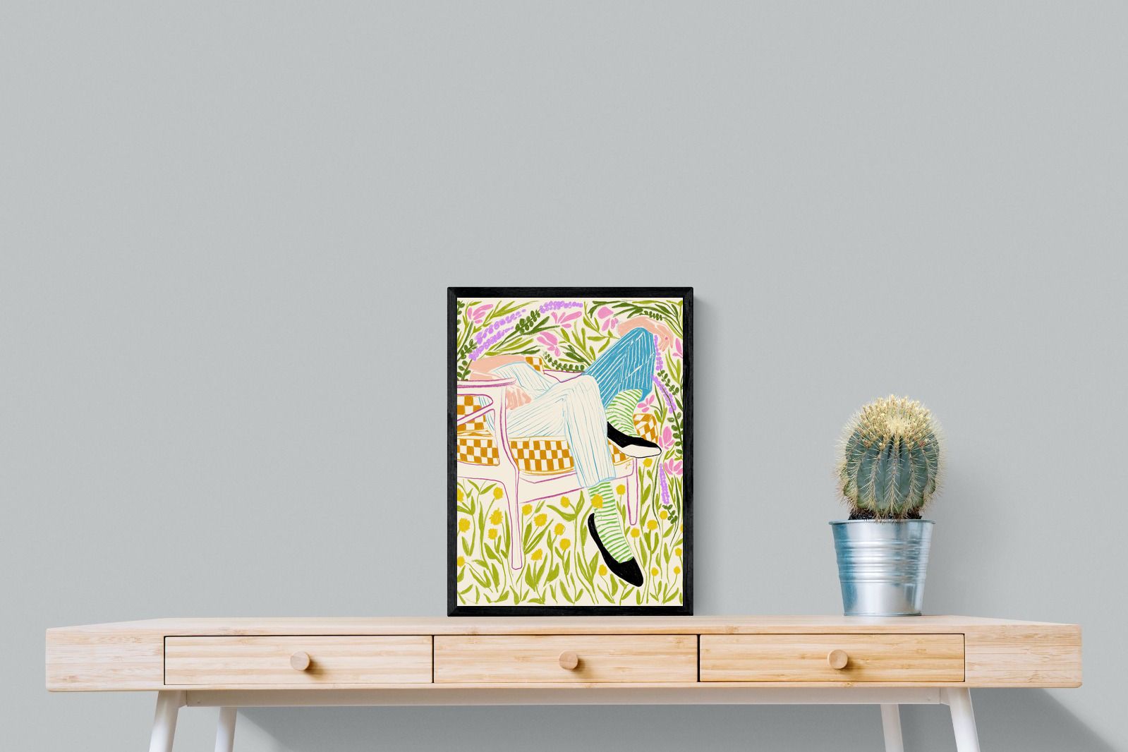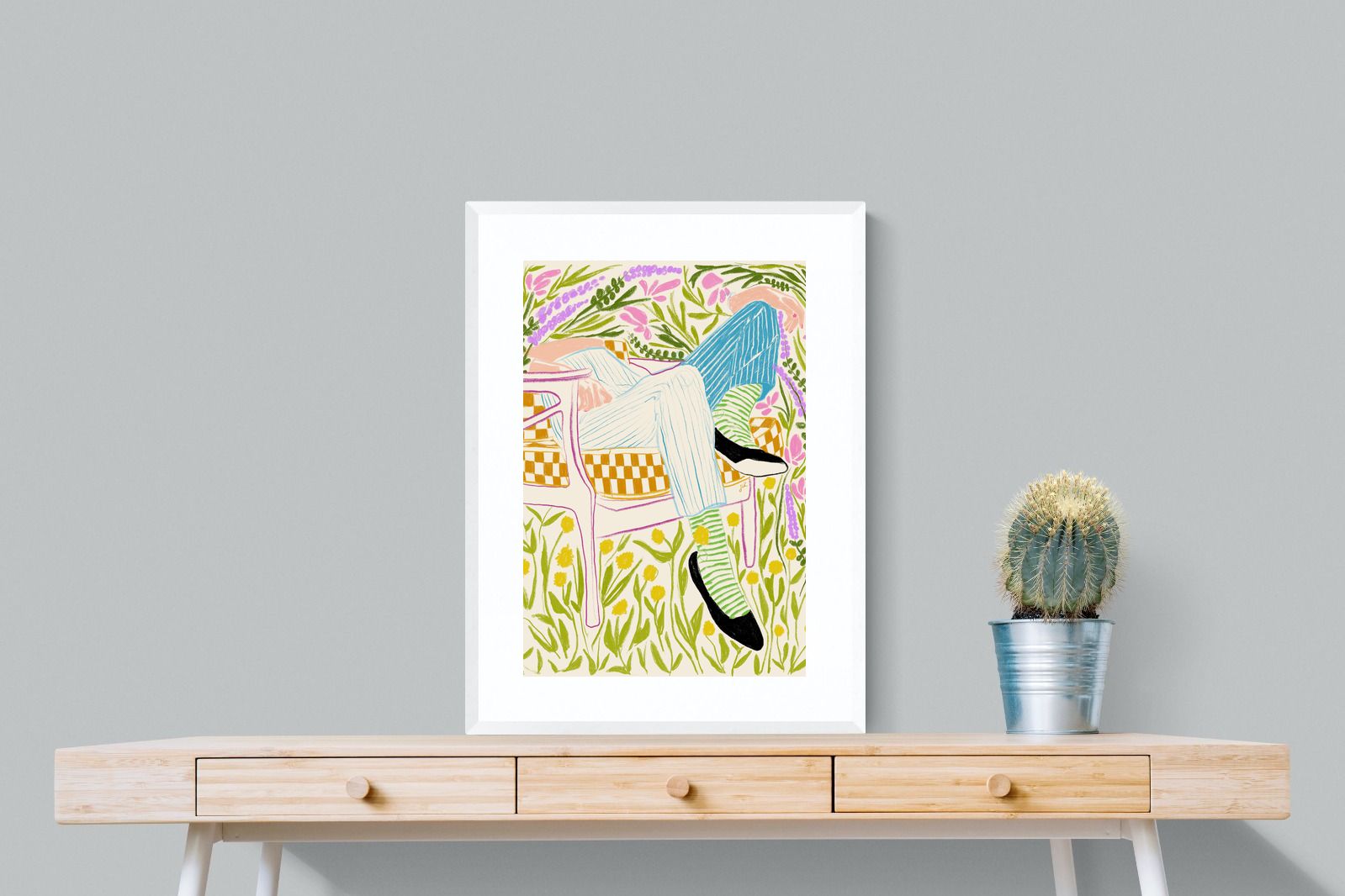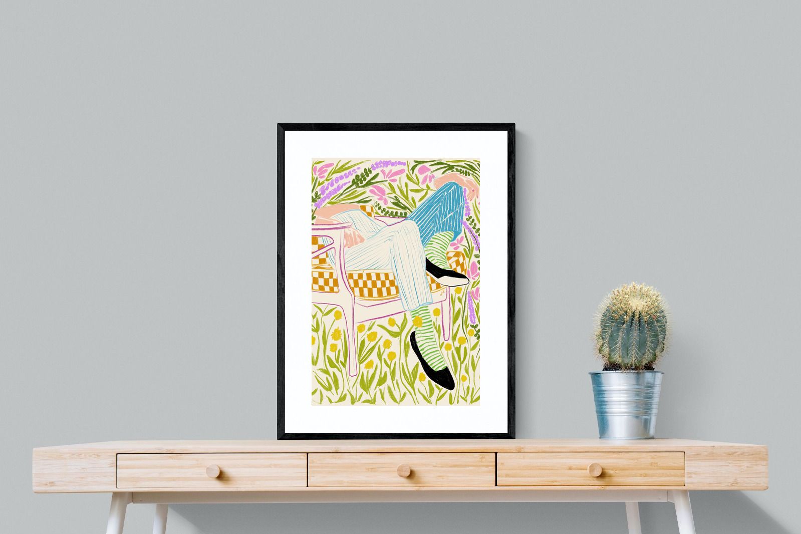 This vibrant artwork features a relaxed figure reclining in a chair amidst a lush, floral backdrop. The colourful, sketch-like lines and patterns create a whimsical and tranquil atmosphere. This piece would be a great addition to a contemporary home, particularly in a living room or bedroom, bringing a sense of relaxation and joy. Its playful and intricate design can add visual interest and a touch of nature to the space.