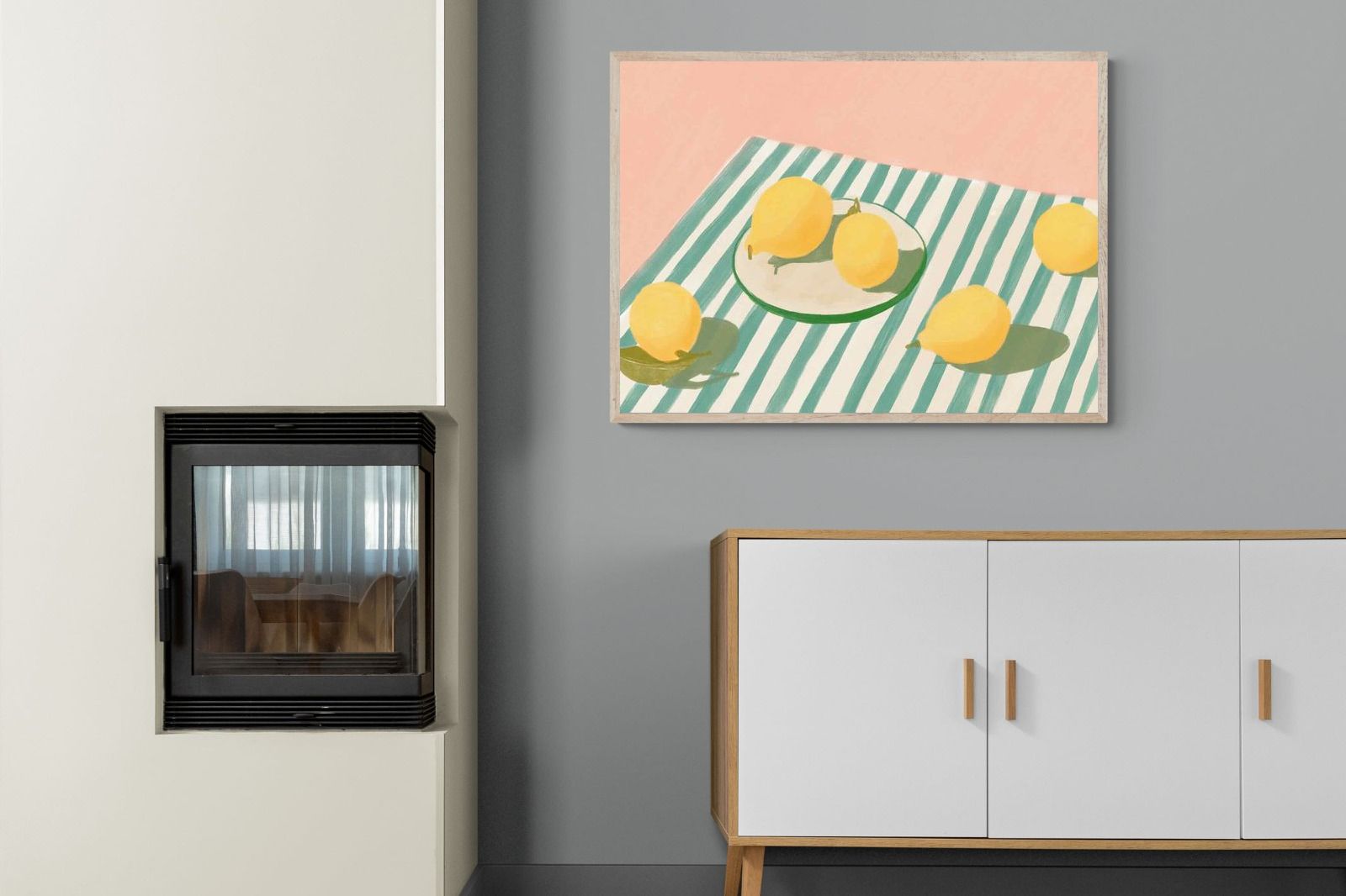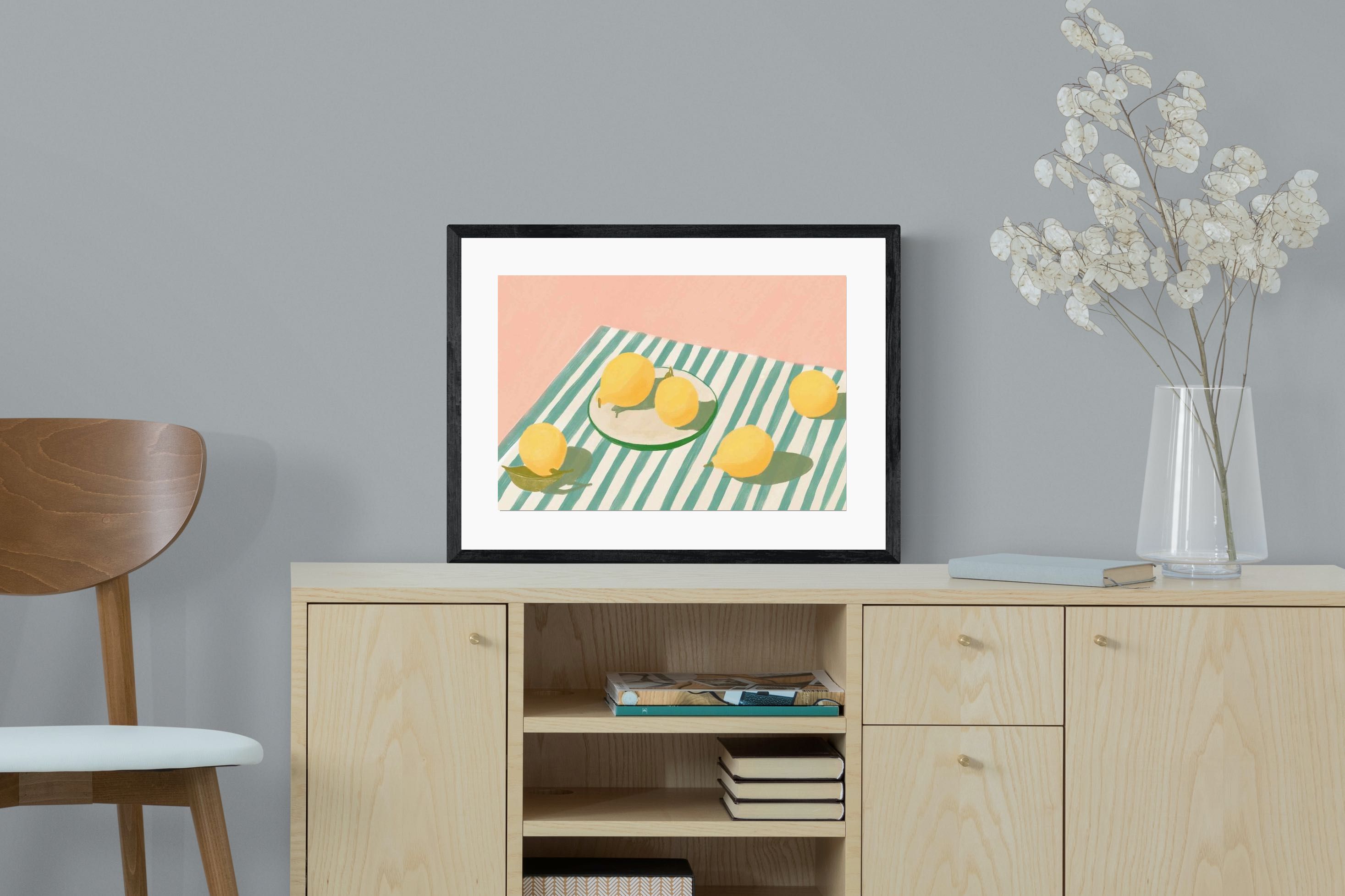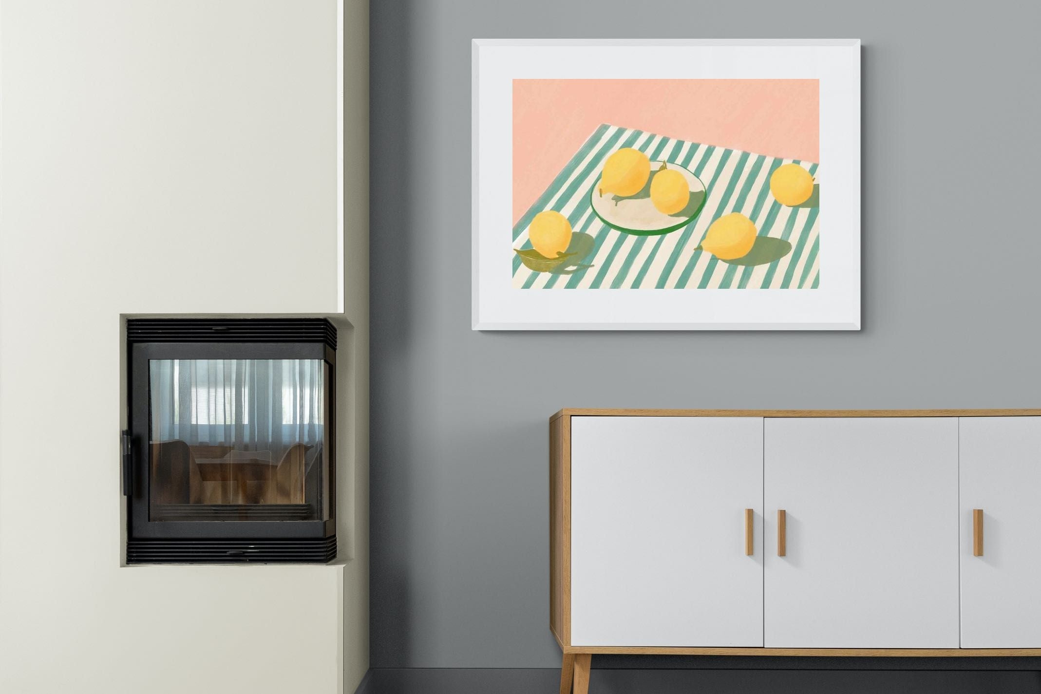 This illustration presents a minimalist still life of bright yellow lemons on a striped green-and-white cloth, set against a soft pink background. The simple, clean lines and pastel colours evoke a sense of calm and freshness. This artwork would be a great addition to a contemporary home, bringing a touch of natural beauty and vibrant colour to the space. Its soothing palette and serene composition make it perfect for creating a relaxed and inviting atmosphere.