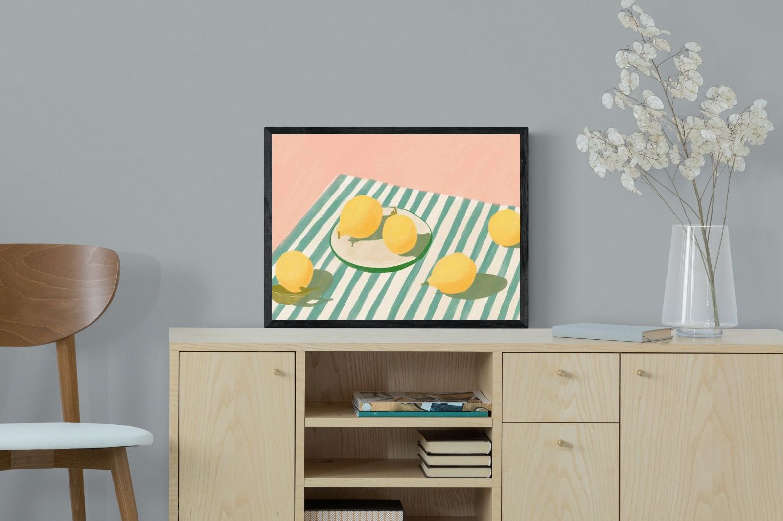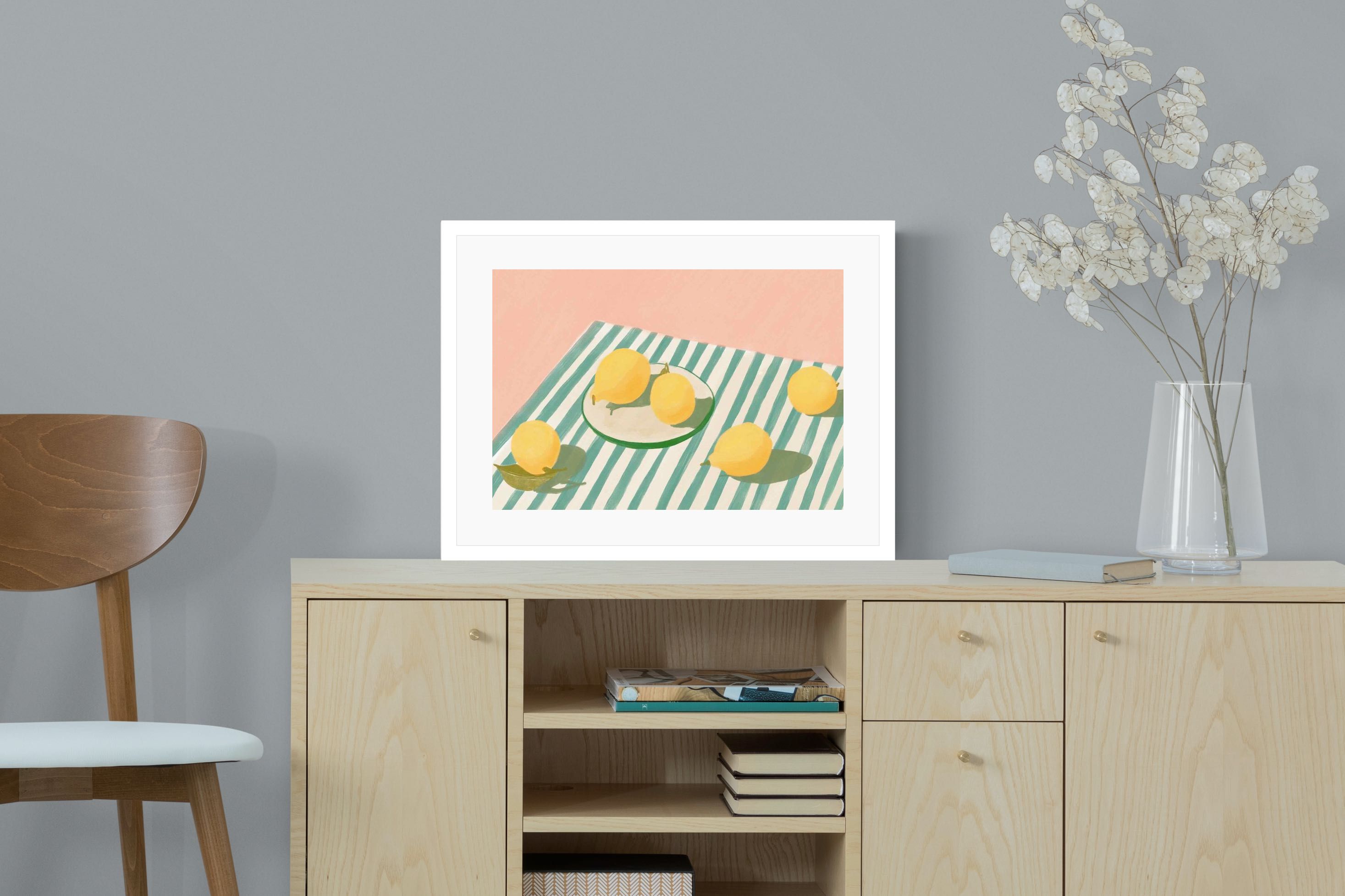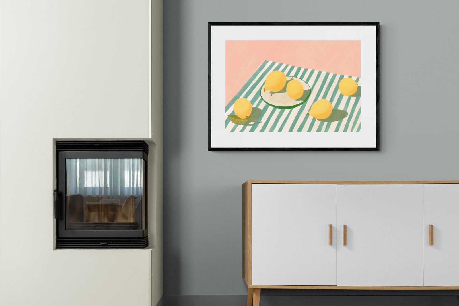 This illustration presents a minimalist still life of bright yellow lemons on a striped green-and-white cloth, set against a soft pink background. The simple, clean lines and pastel colours evoke a sense of calm and freshness. This artwork would be a great addition to a contemporary home, bringing a touch of natural beauty and vibrant colour to the space. Its soothing palette and serene composition make it perfect for creating a relaxed and inviting atmosphere.