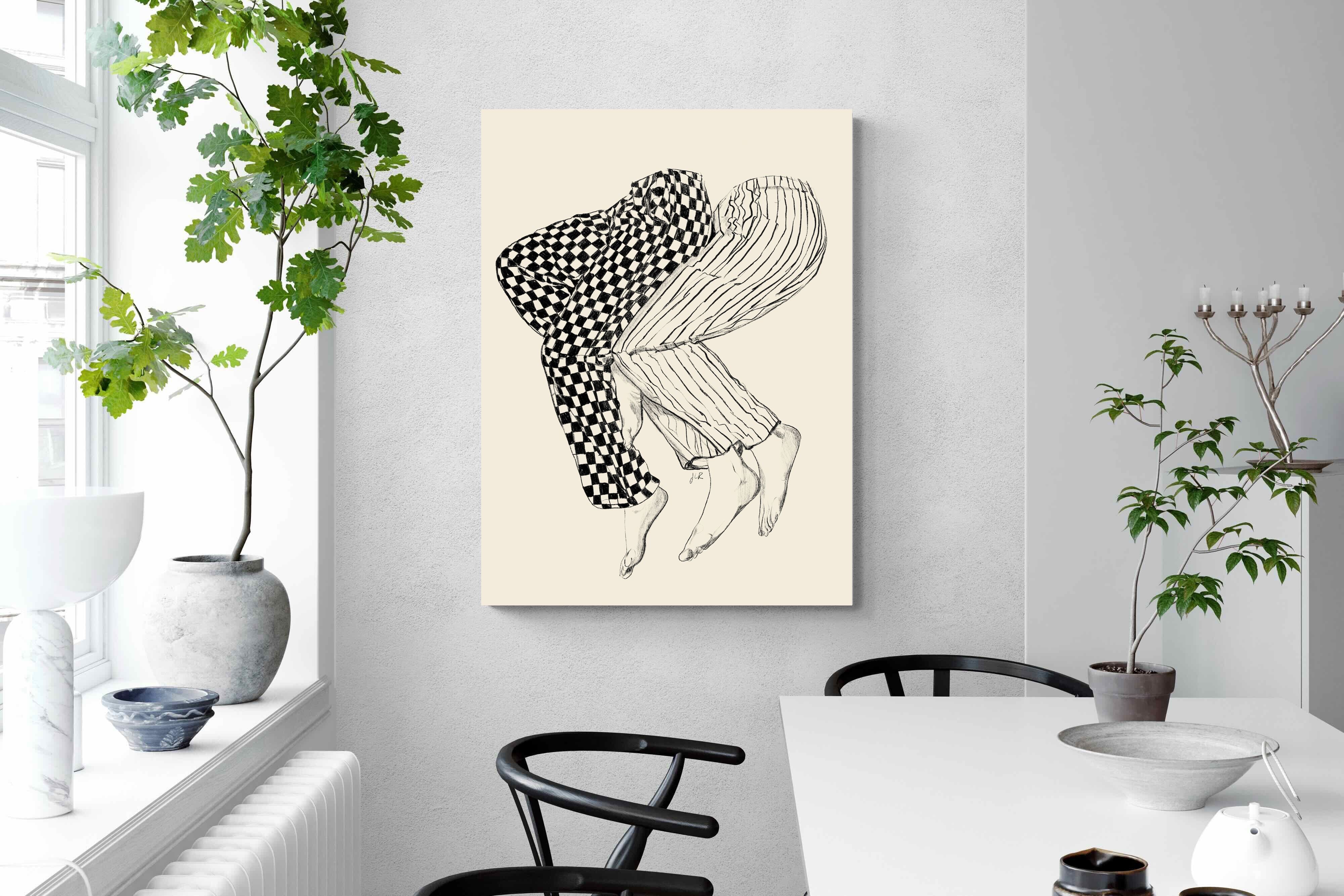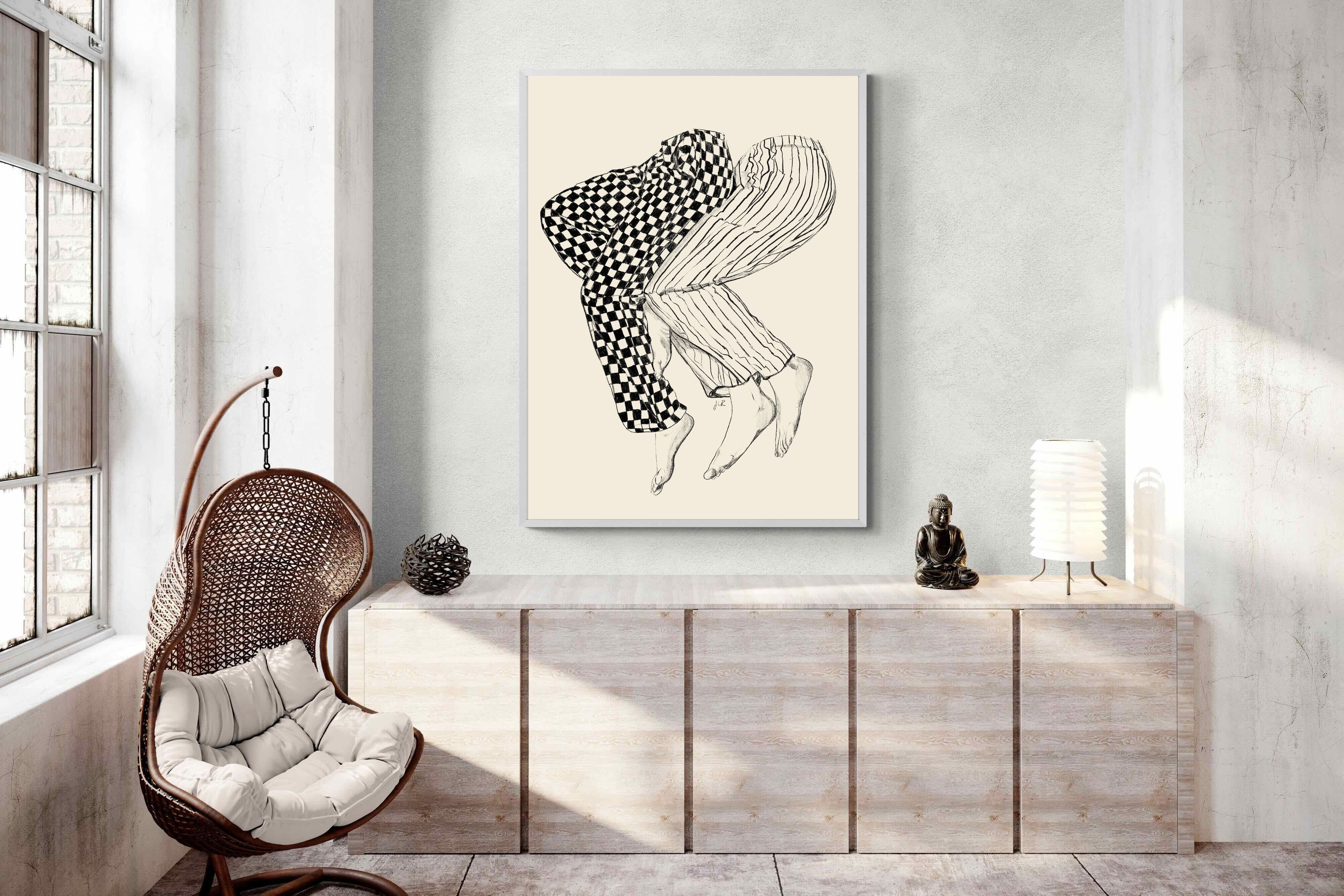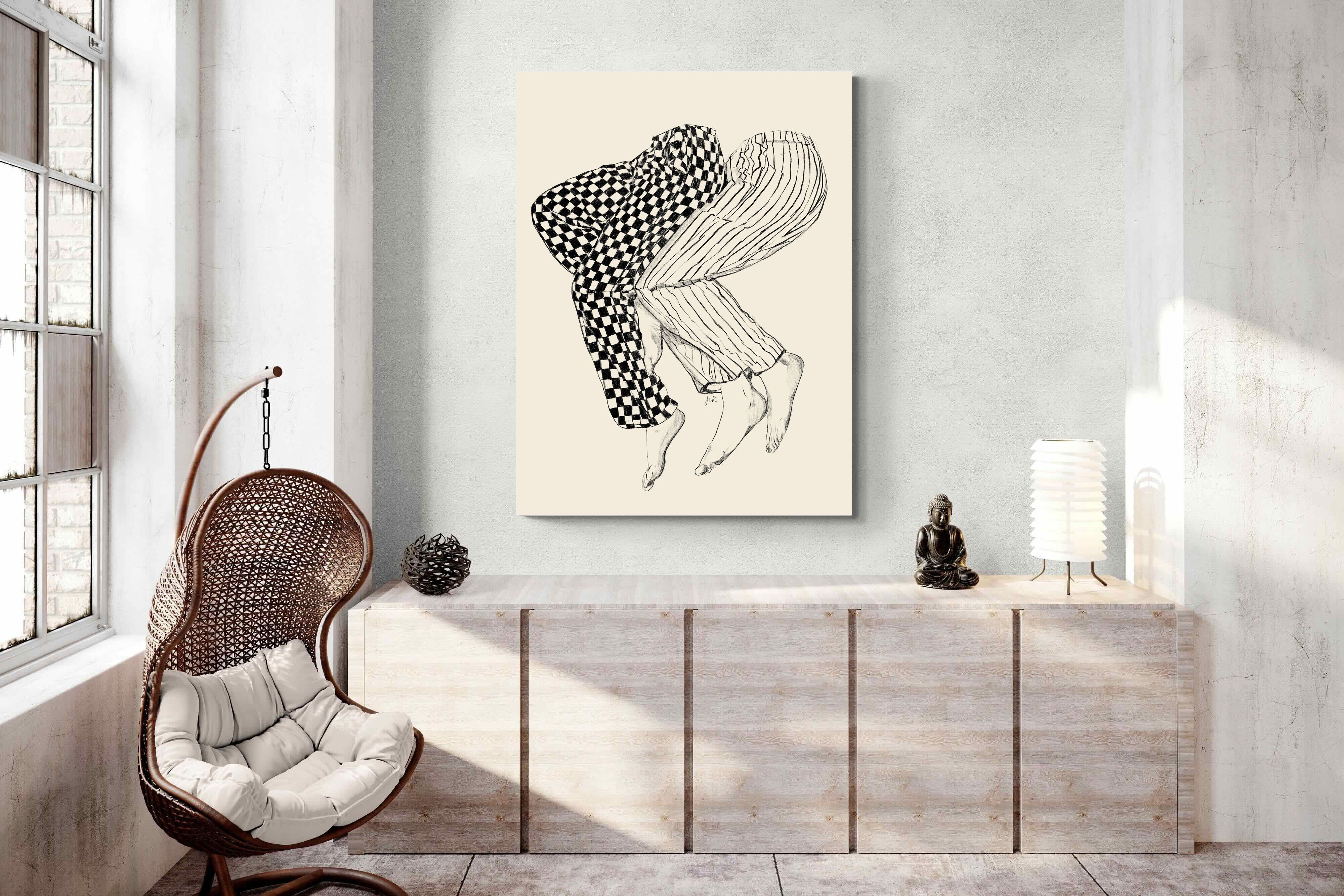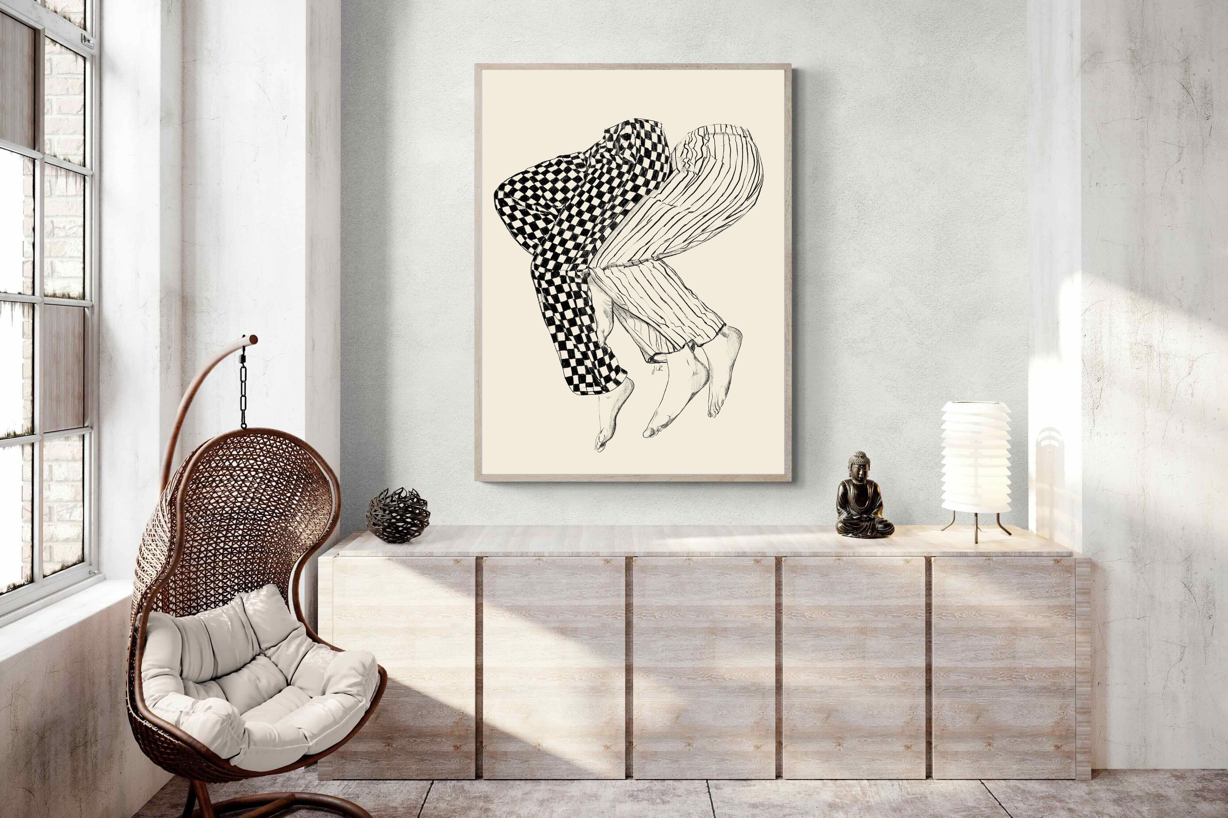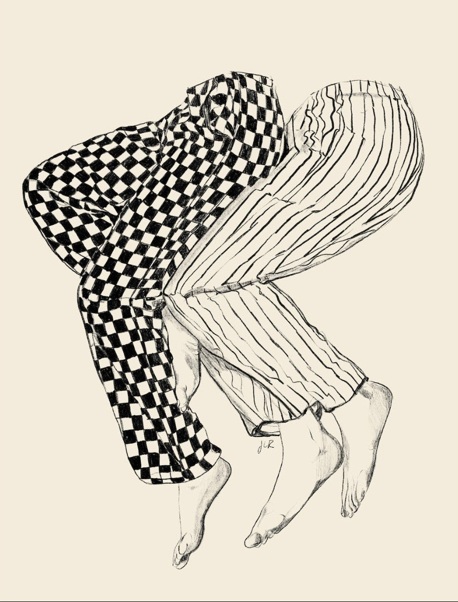 This illustration features a playful depiction of two intertwined pairs of legs in checked and striped pyjamas, creating a whimsical and cozy vibe. Its blend of patterns and simplicity would make it a charming addition to a contemporary home, adding a touch of warmth and lightheartedness to the decor, perfect for a bedroom or a relaxed living space.