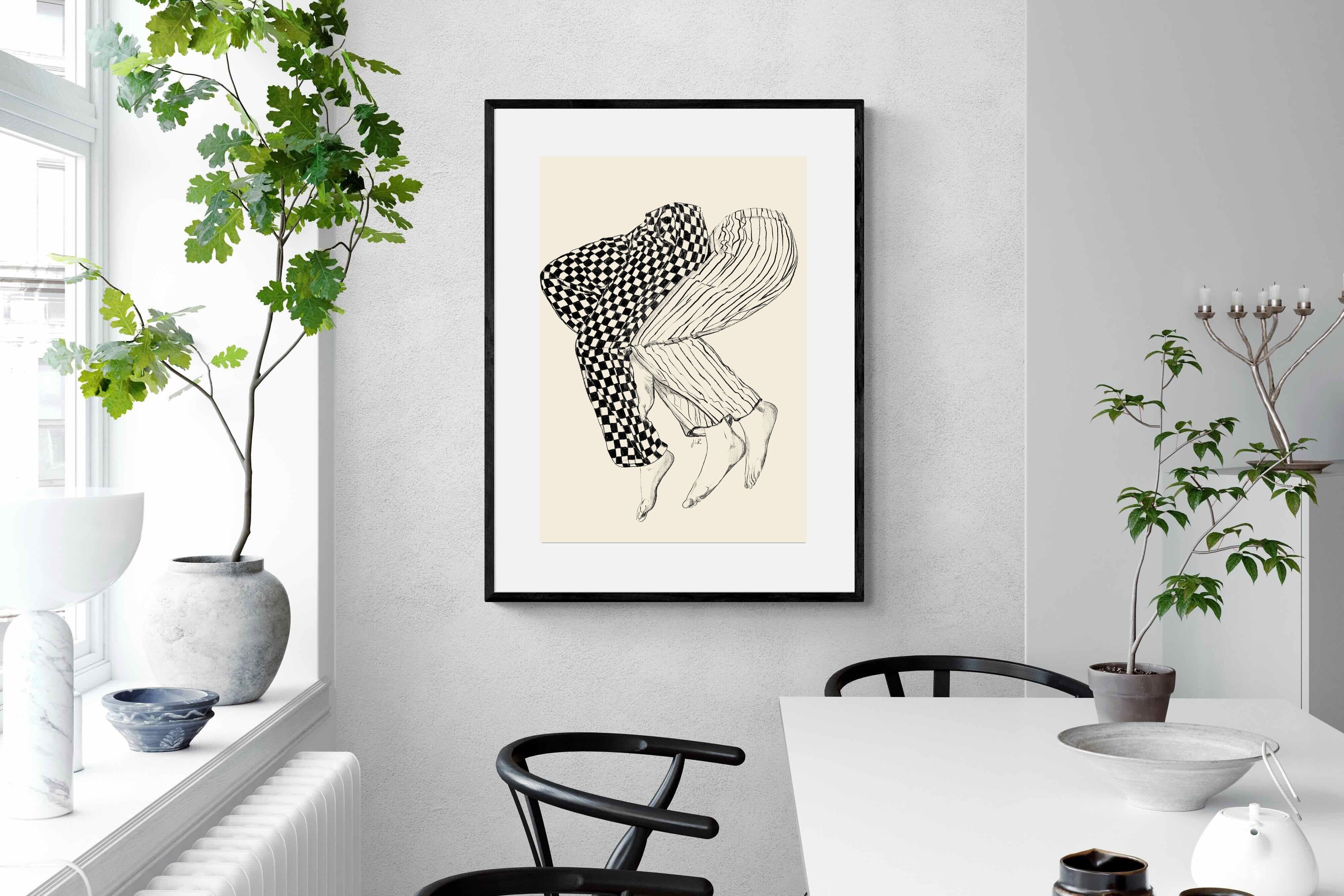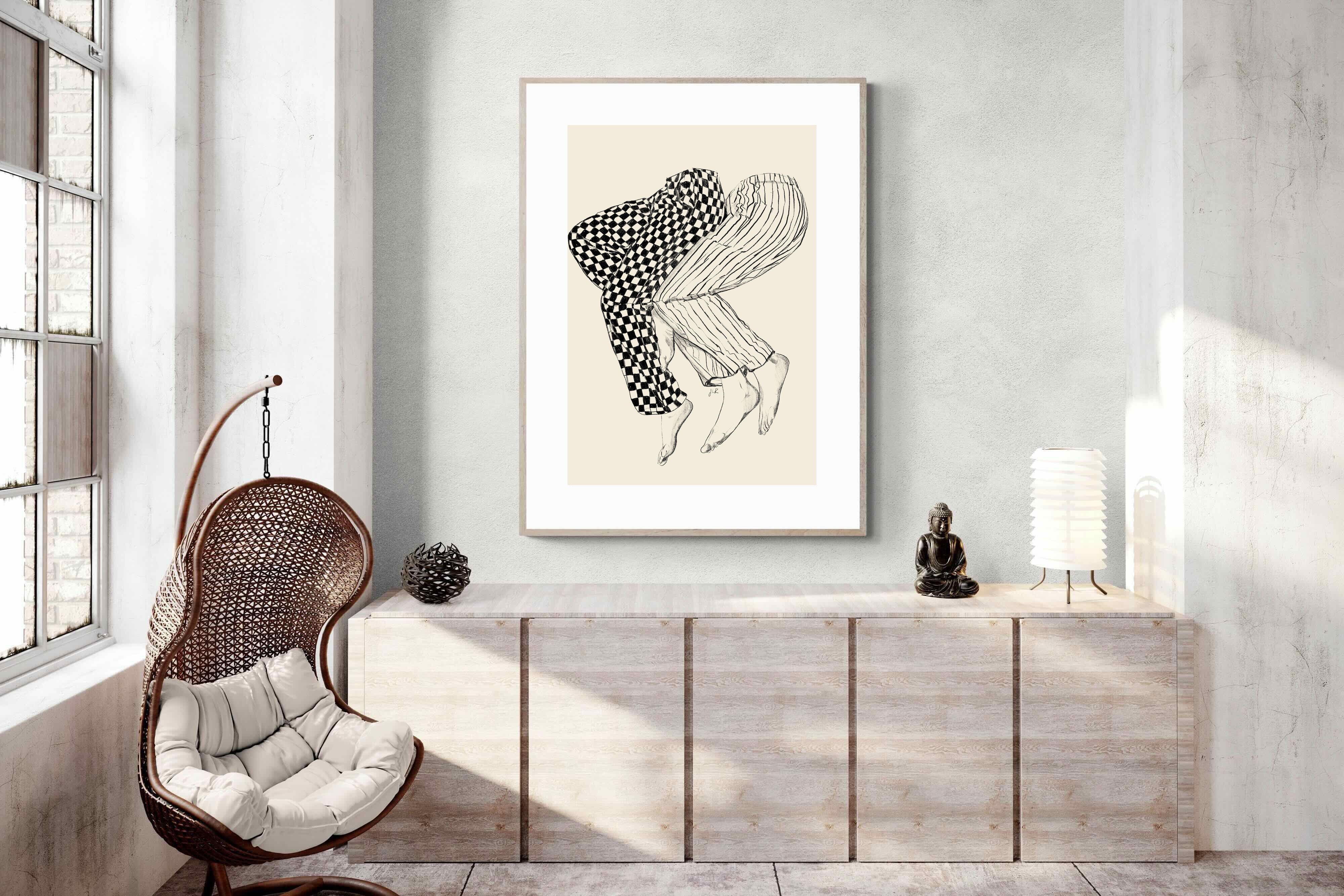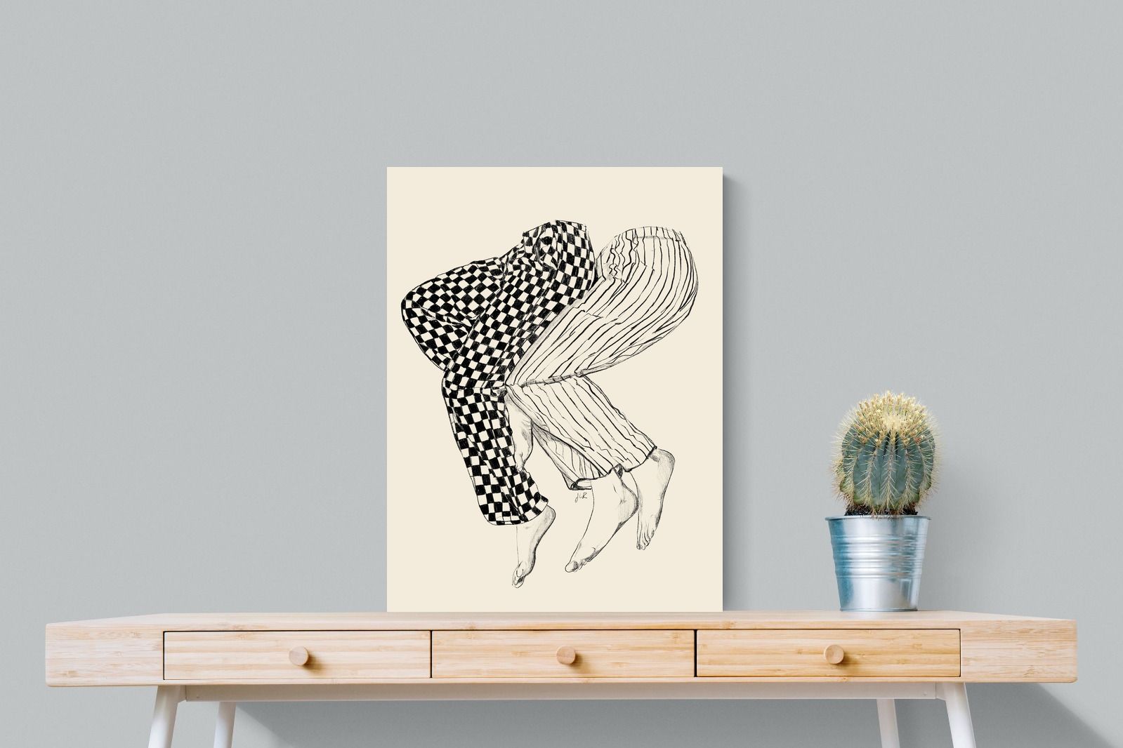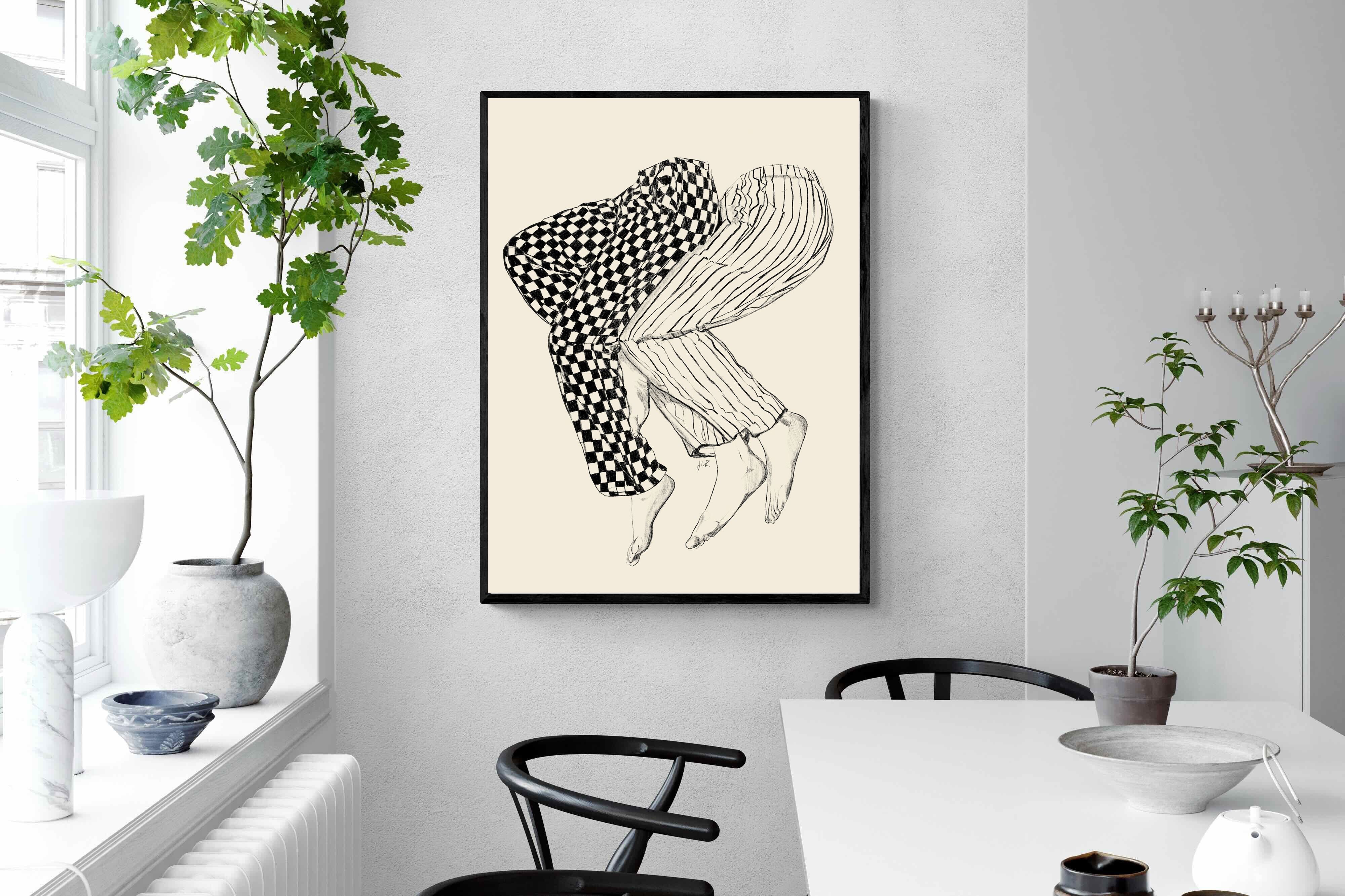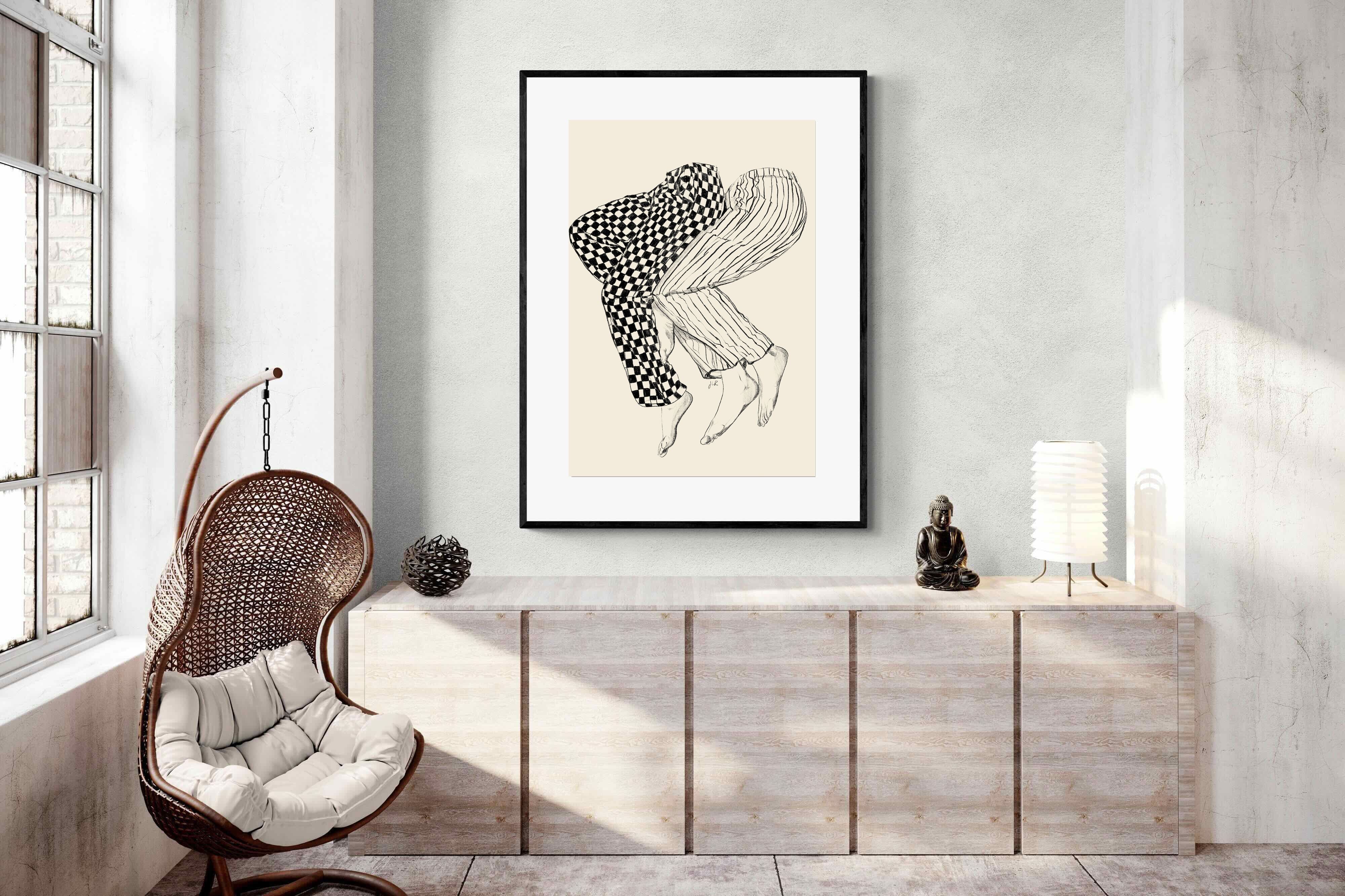 This illustration features a playful depiction of two intertwined pairs of legs in checked and striped pyjamas, creating a whimsical and cozy vibe. Its blend of patterns and simplicity would make it a charming addition to a contemporary home, adding a touch of warmth and lightheartedness to the decor, perfect for a bedroom or a relaxed living space.