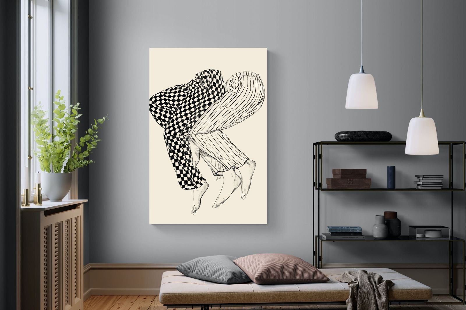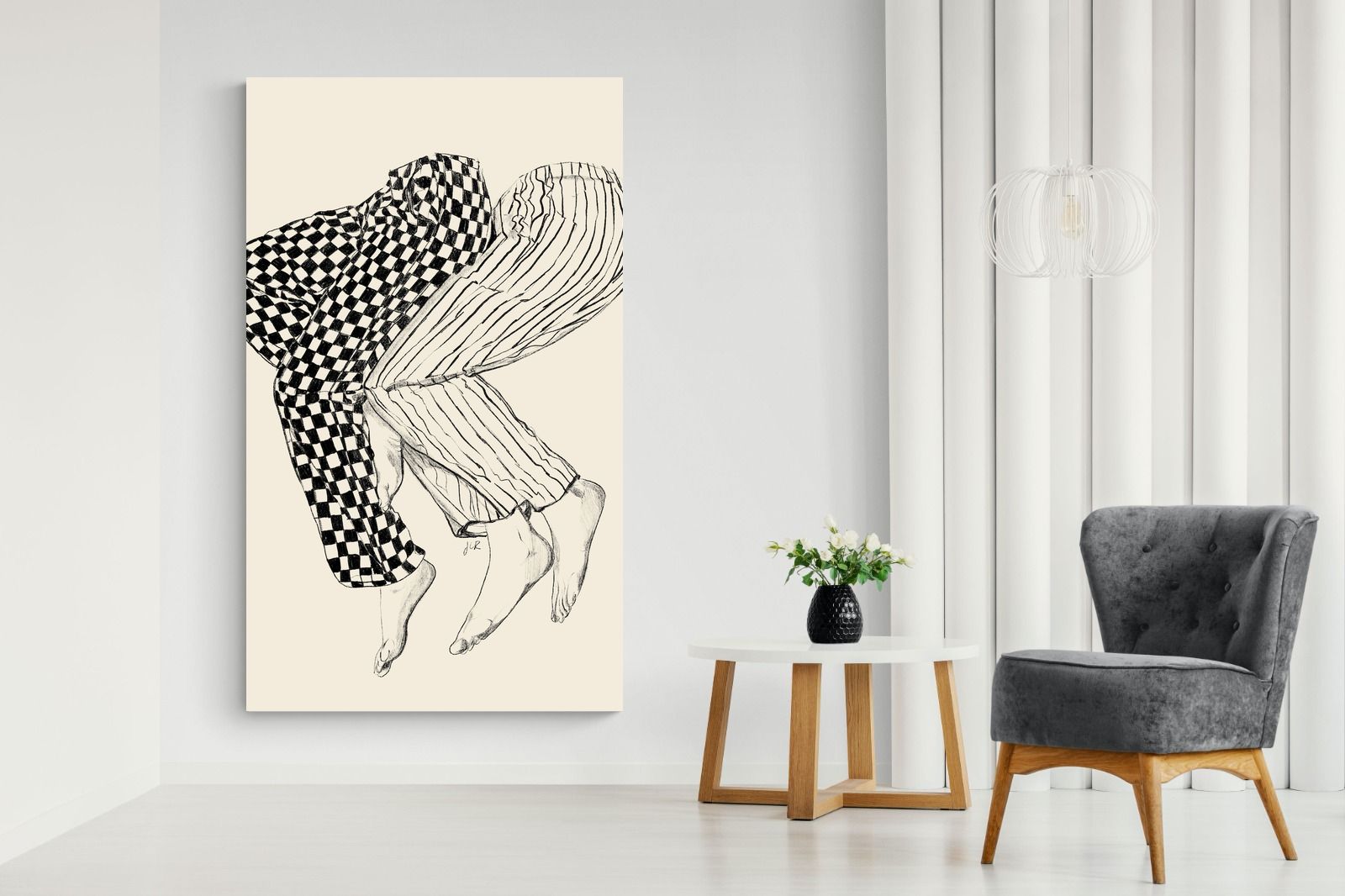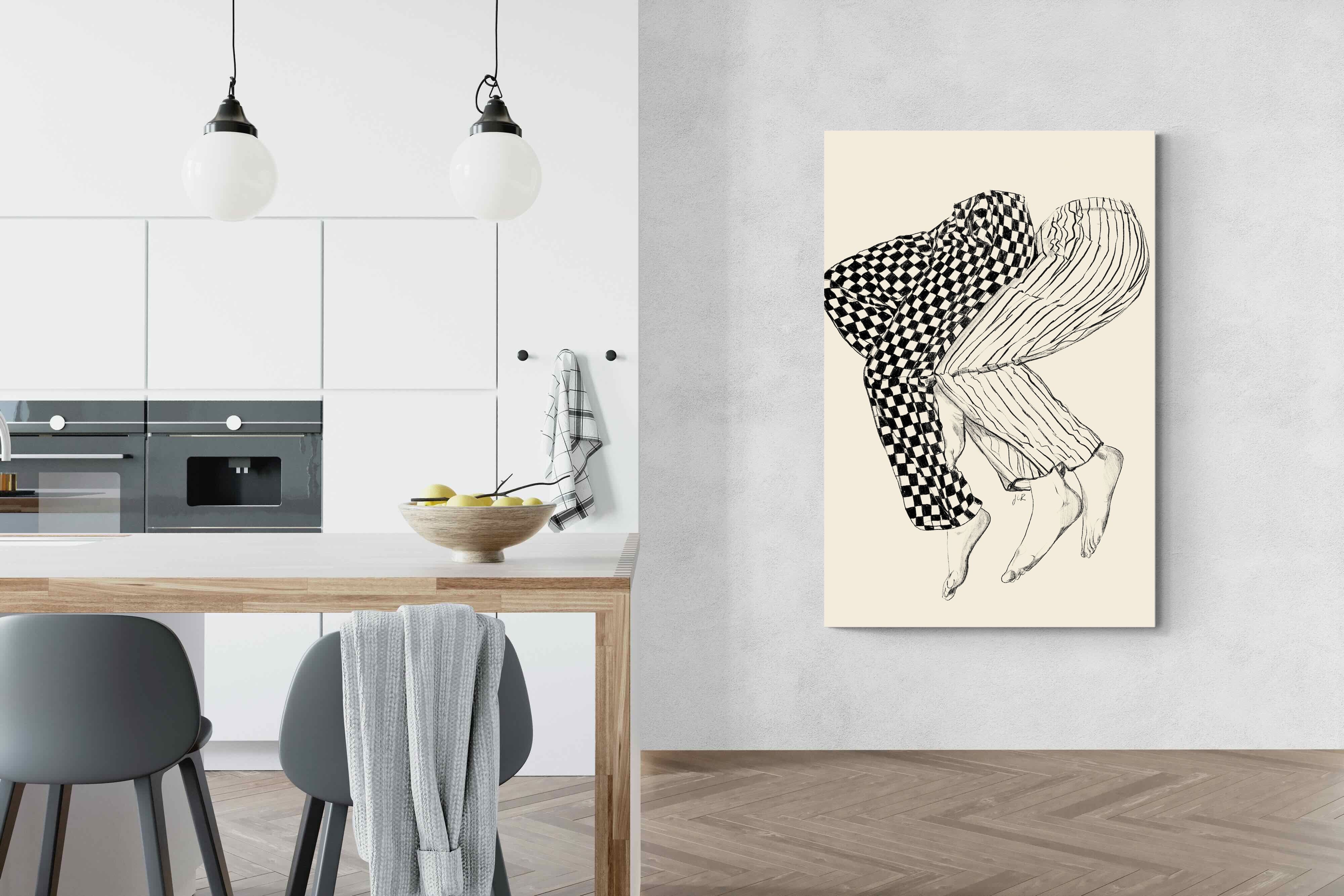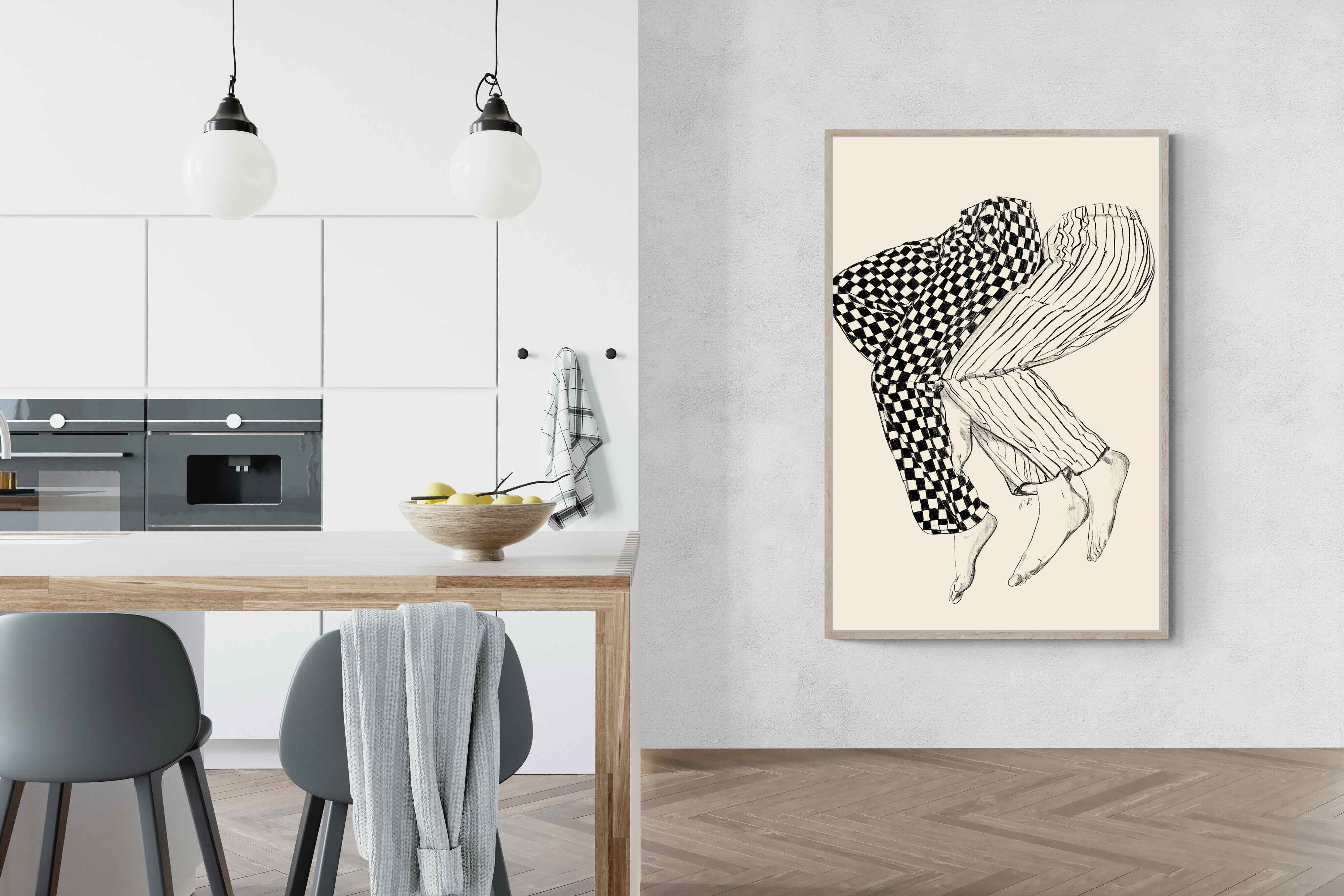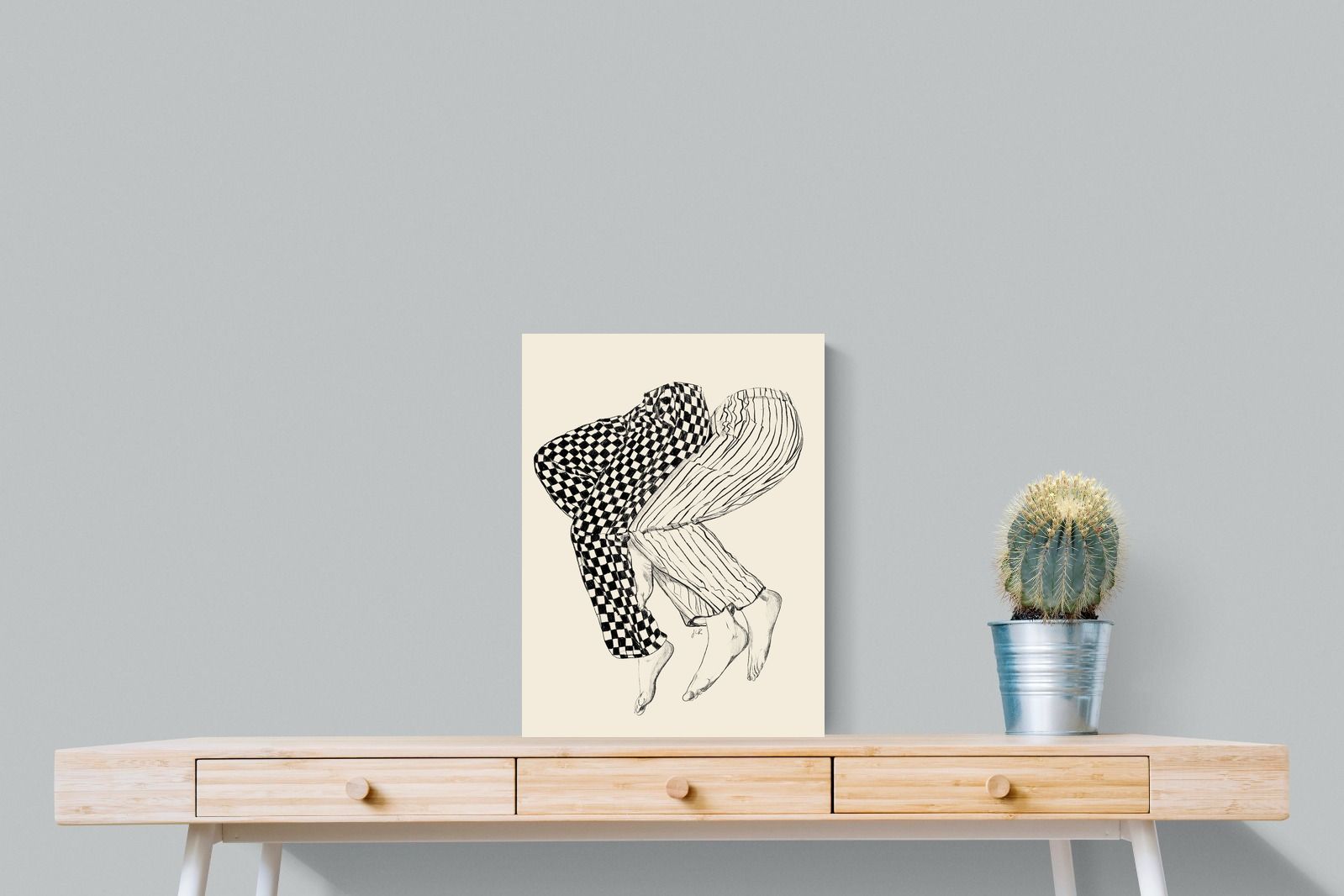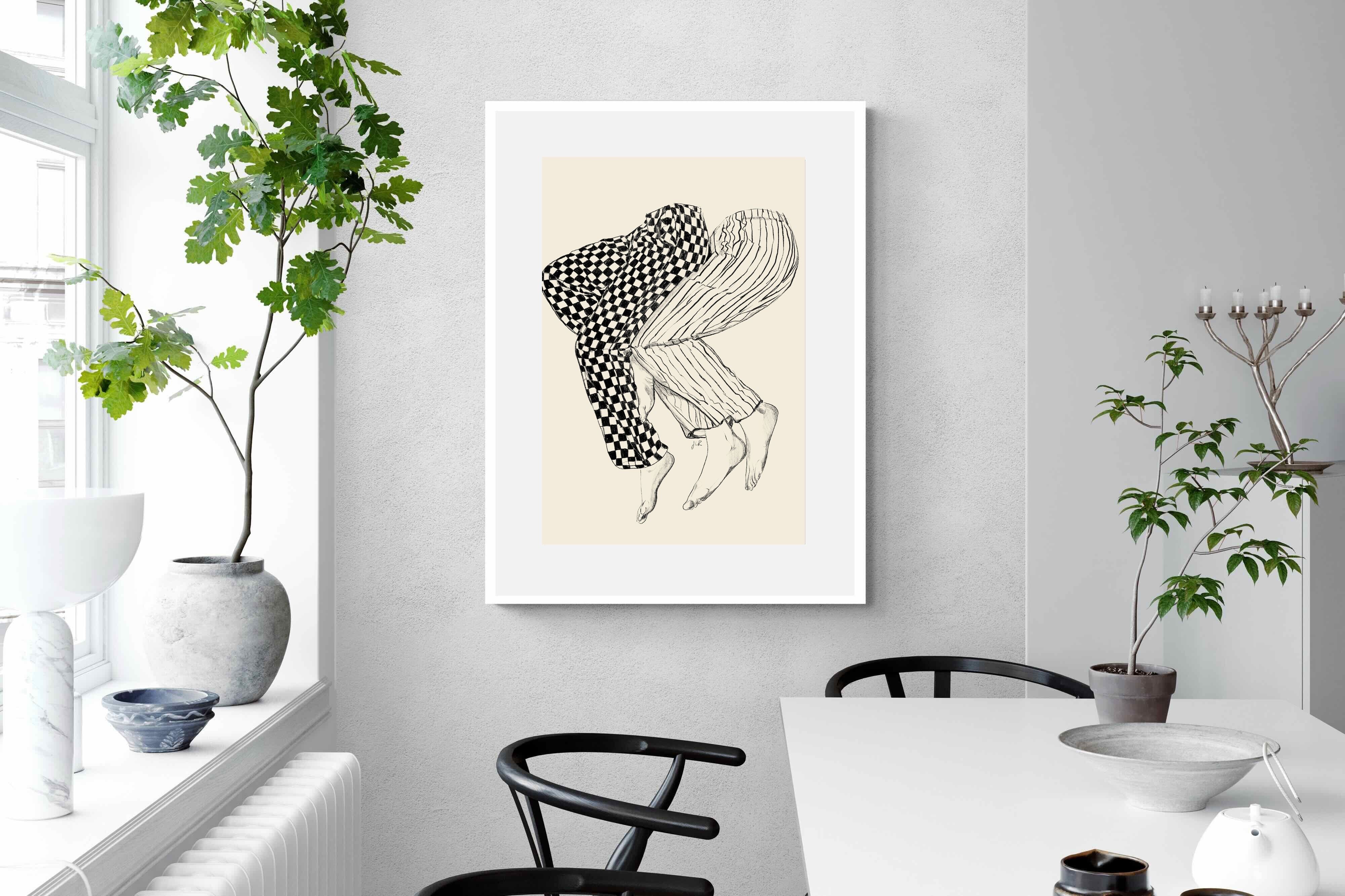 This illustration features a playful depiction of two intertwined pairs of legs in checked and striped pyjamas, creating a whimsical and cozy vibe. Its blend of patterns and simplicity would make it a charming addition to a contemporary home, adding a touch of warmth and lightheartedness to the decor, perfect for a bedroom or a relaxed living space.