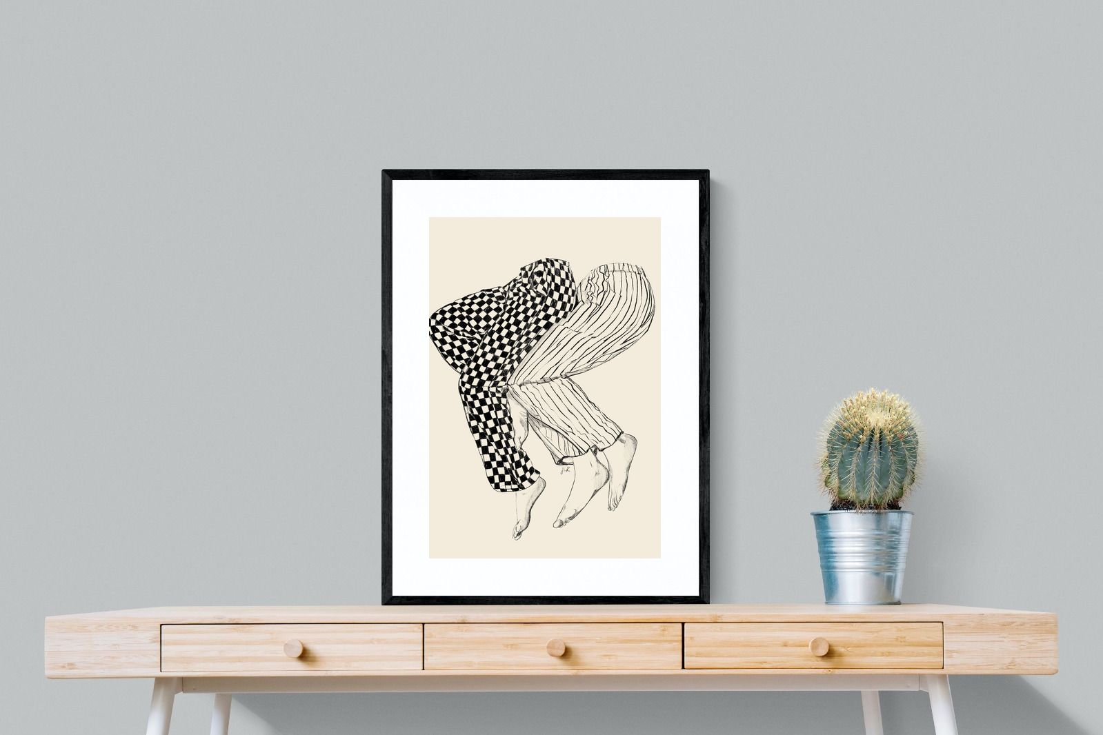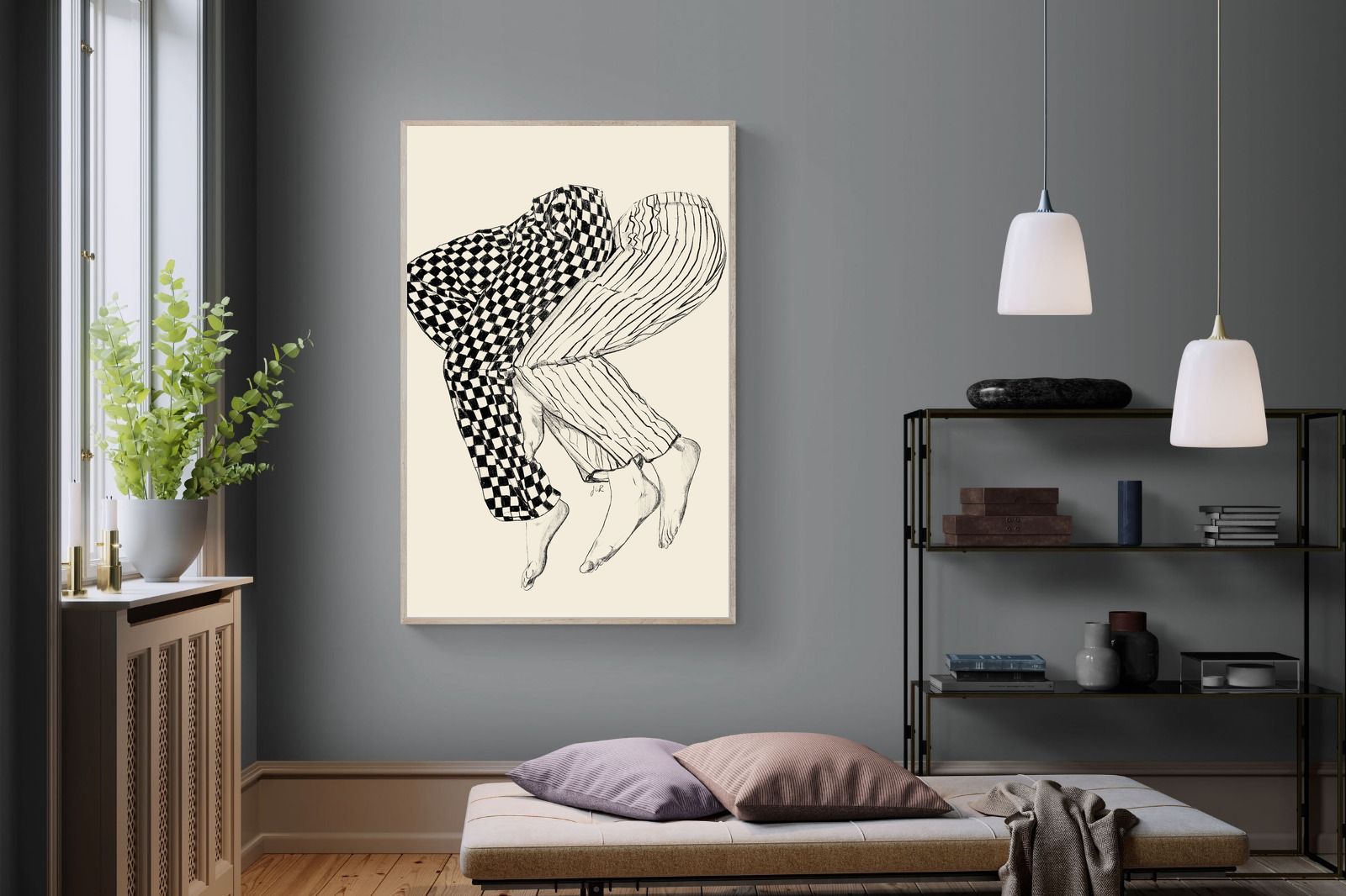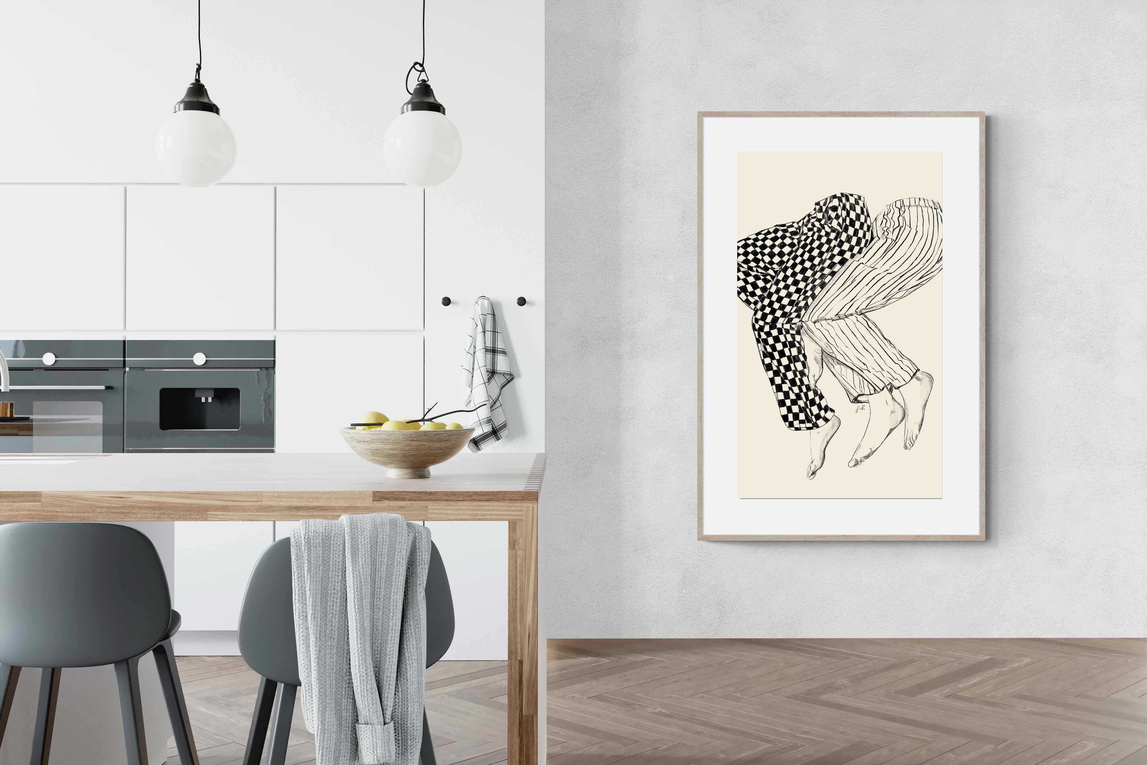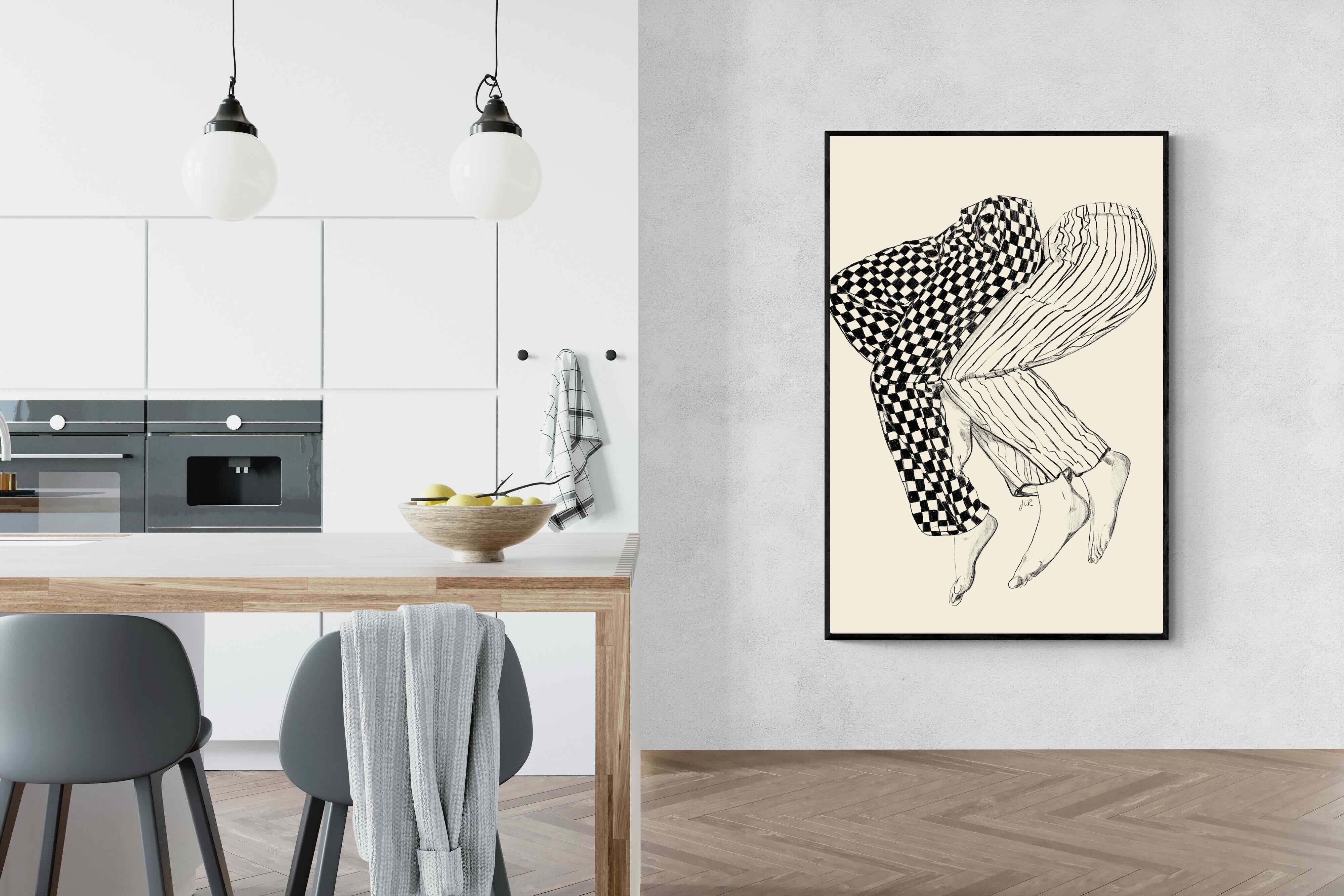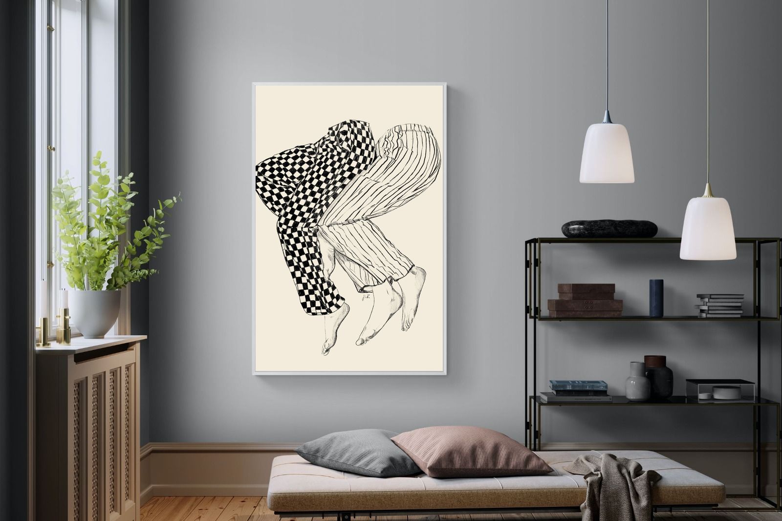 This illustration features a playful depiction of two intertwined pairs of legs in checked and striped pyjamas, creating a whimsical and cozy vibe. Its blend of patterns and simplicity would make it a charming addition to a contemporary home, adding a touch of warmth and lightheartedness to the decor, perfect for a bedroom or a relaxed living space.