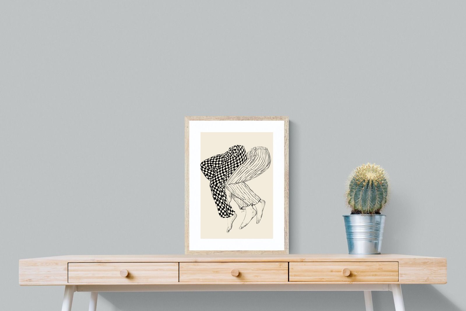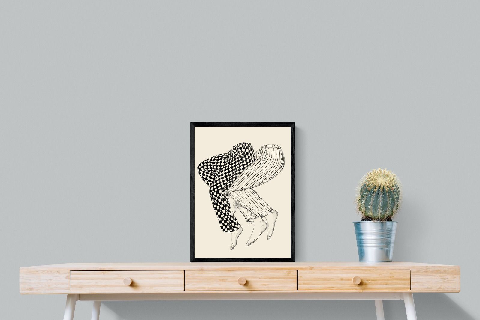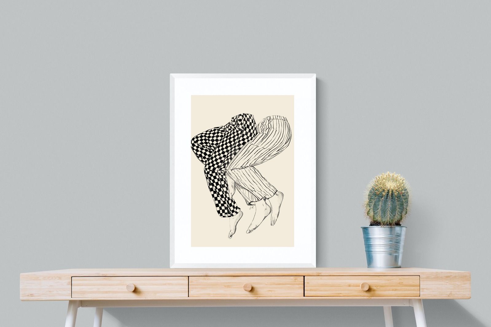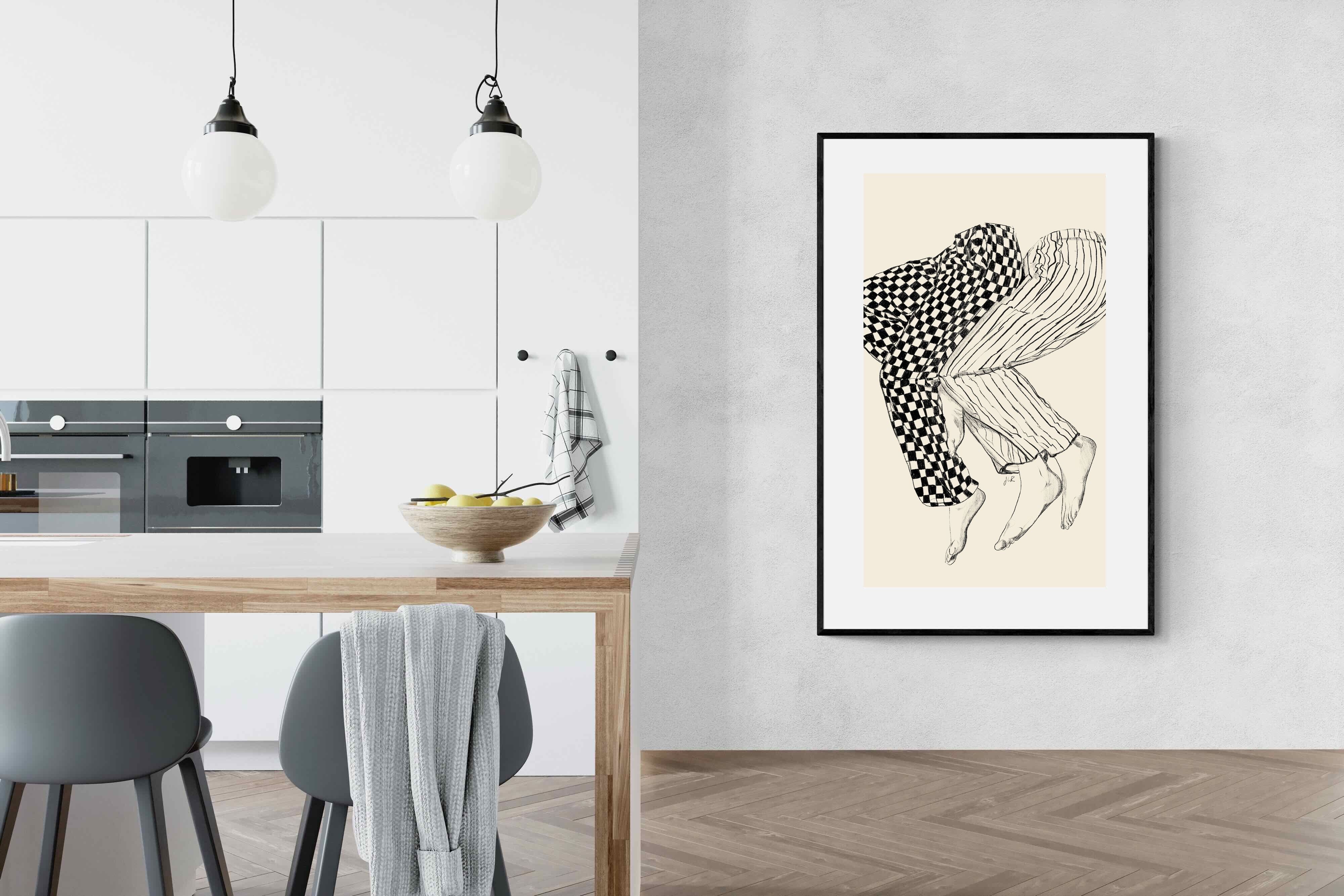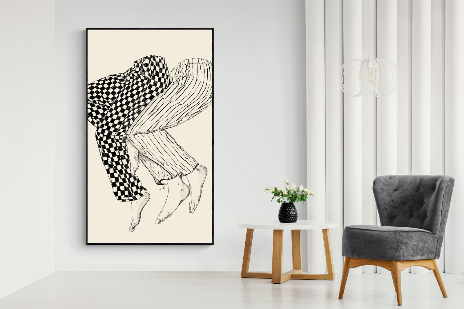 This illustration features a playful depiction of two intertwined pairs of legs in checked and striped pyjamas, creating a whimsical and cozy vibe. Its blend of patterns and simplicity would make it a charming addition to a contemporary home, adding a touch of warmth and lightheartedness to the decor, perfect for a bedroom or a relaxed living space.