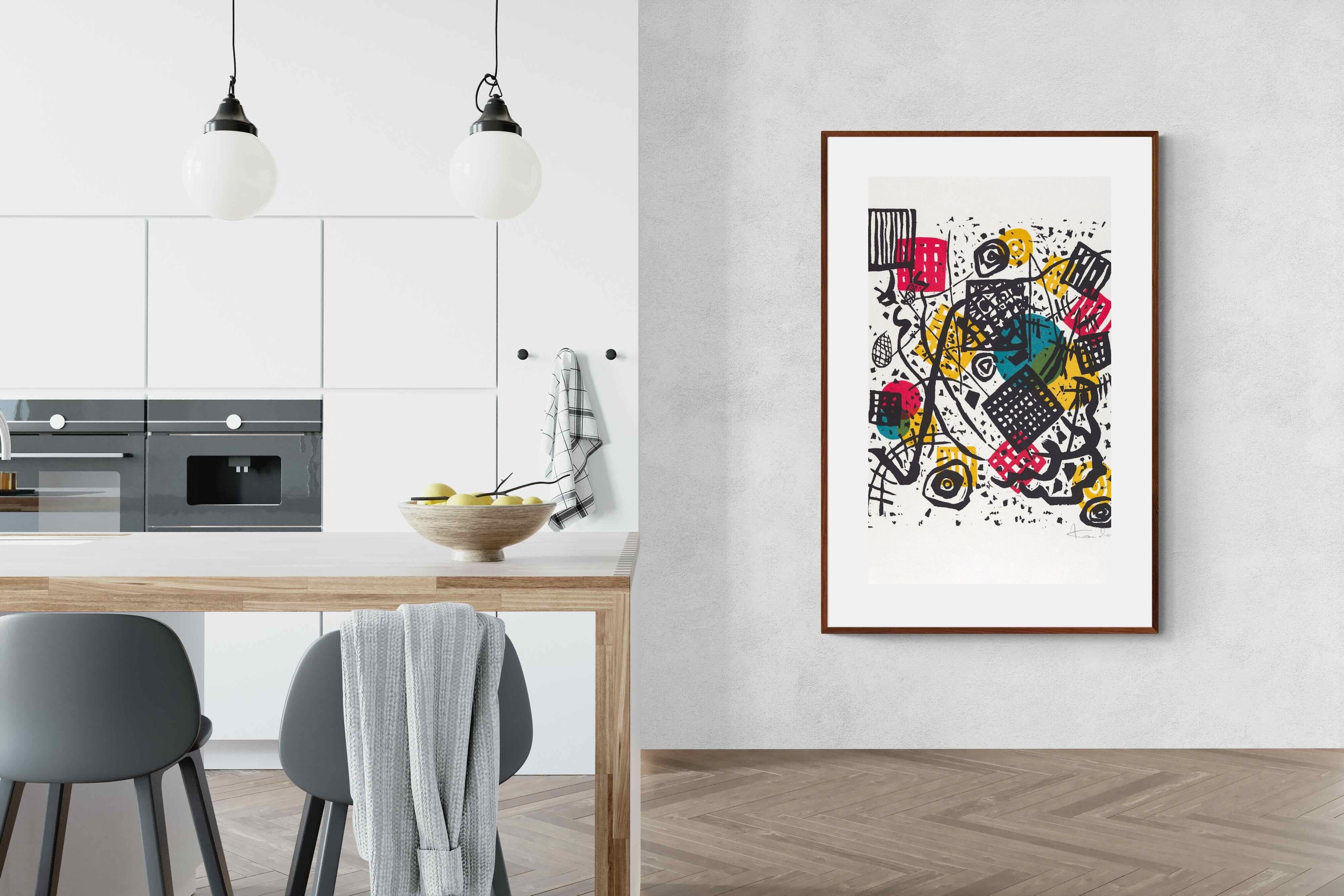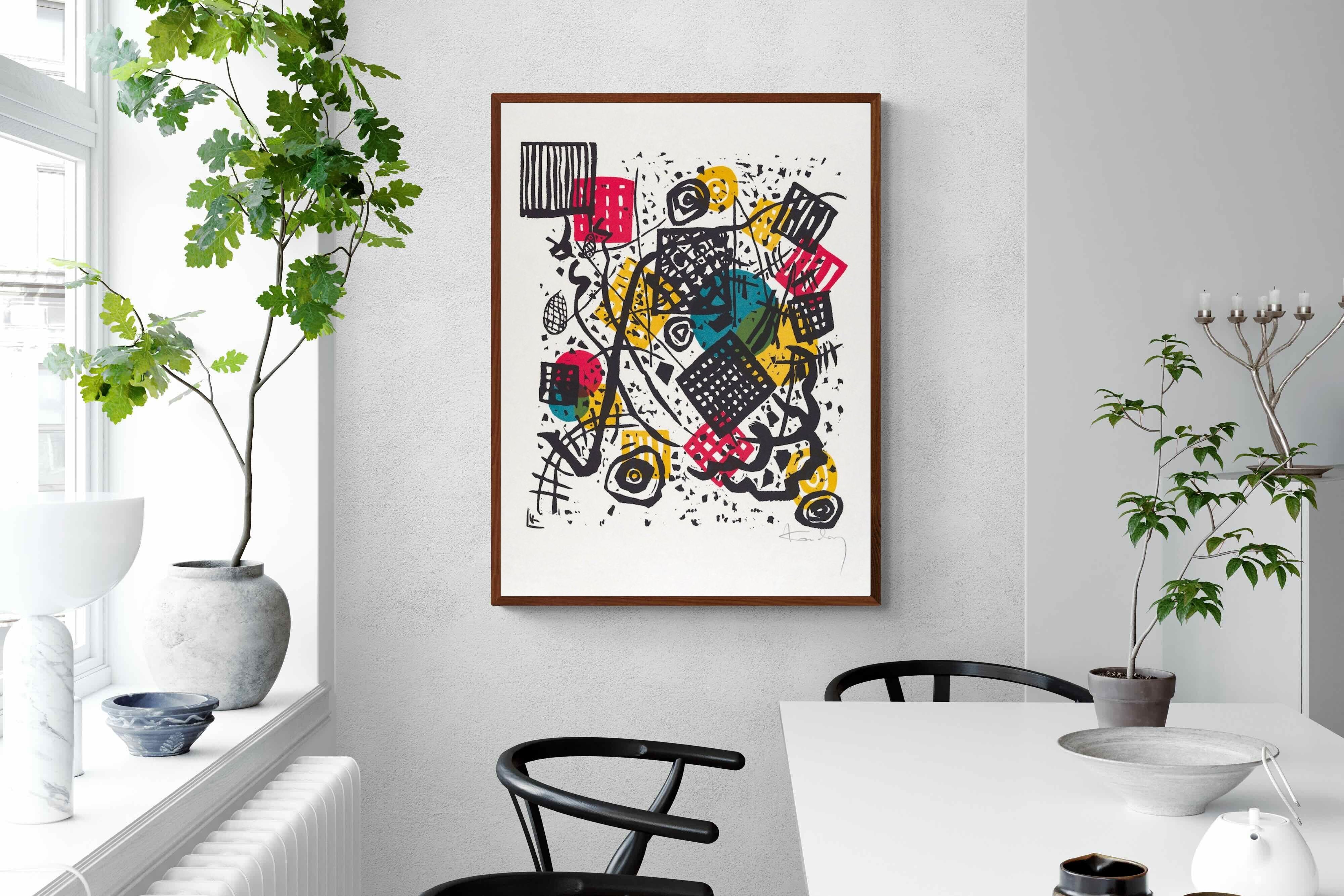 Published, shortly after Kandinsky began teaching at the Bauhaus, as part of his 1922 portfolio which includes four prints each in etching, woodcut, and lithography. As the artist explains in the portfolio's introduction, each technique was chosen for its unique character: etching is characterised by its precision and appropriateness to the study of lines; woodcut is marked by the interplay of foreground and background, and the richness of textures; lithography combines a range of markings and colors to produce an image that most closely approximates a painting.