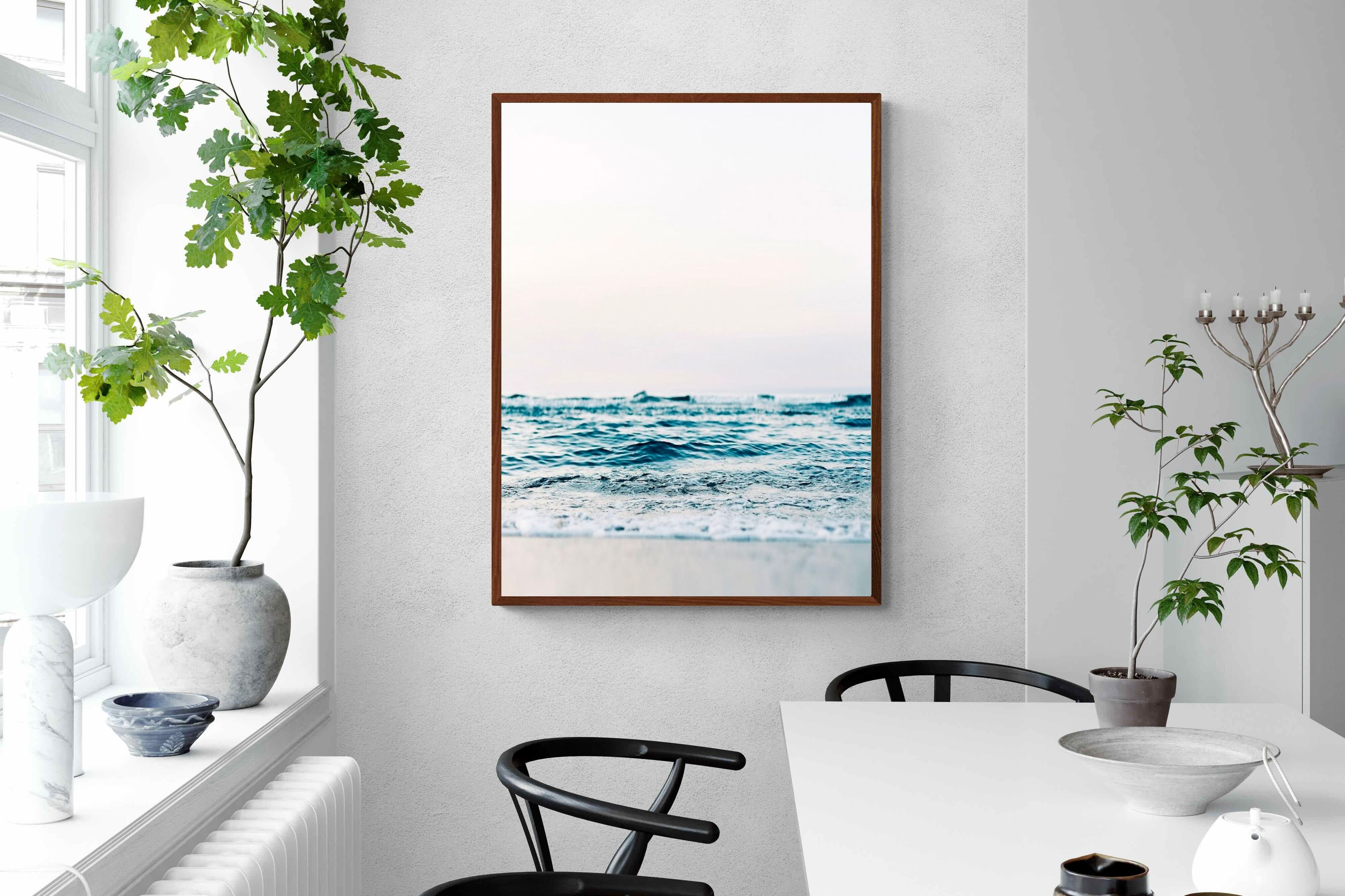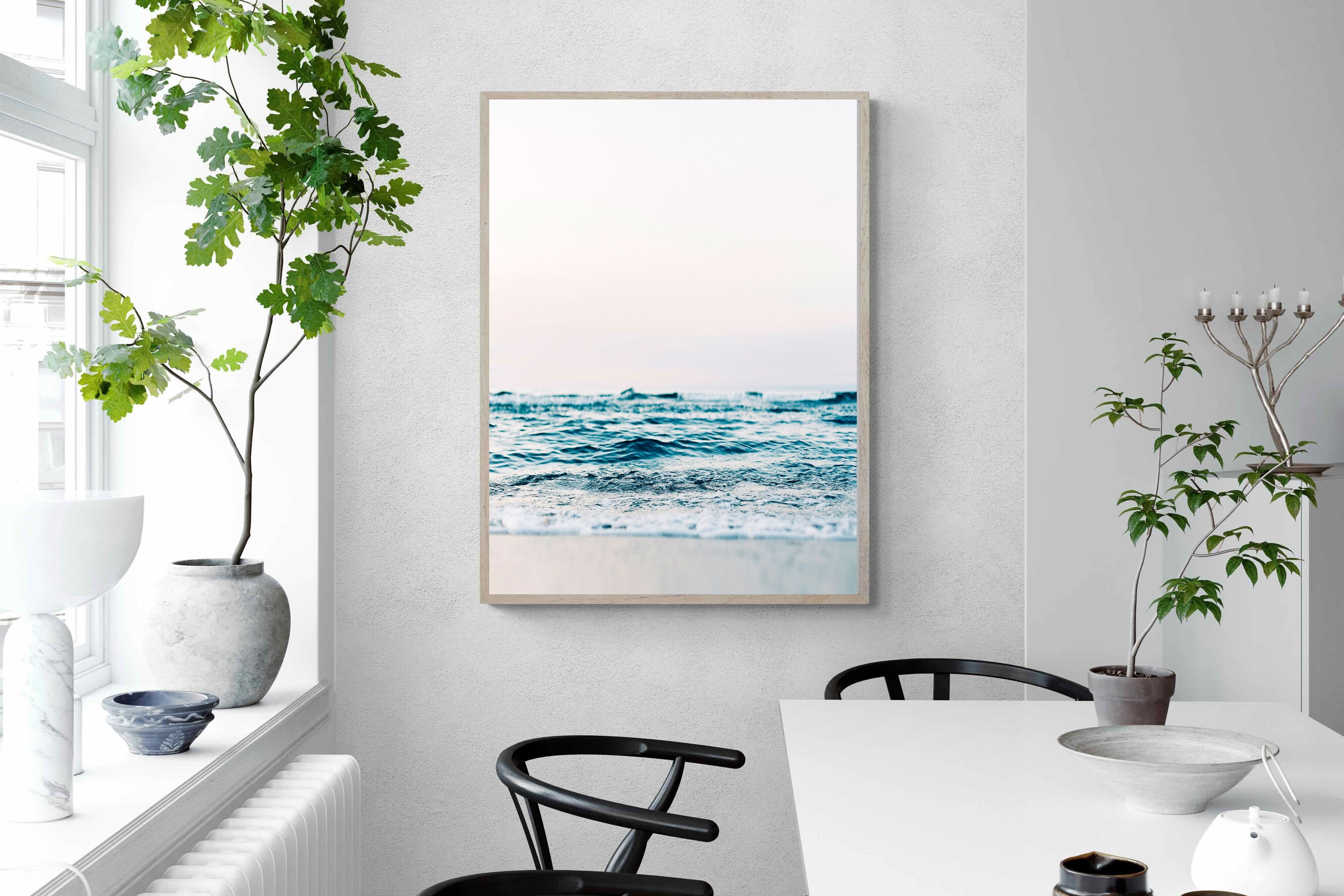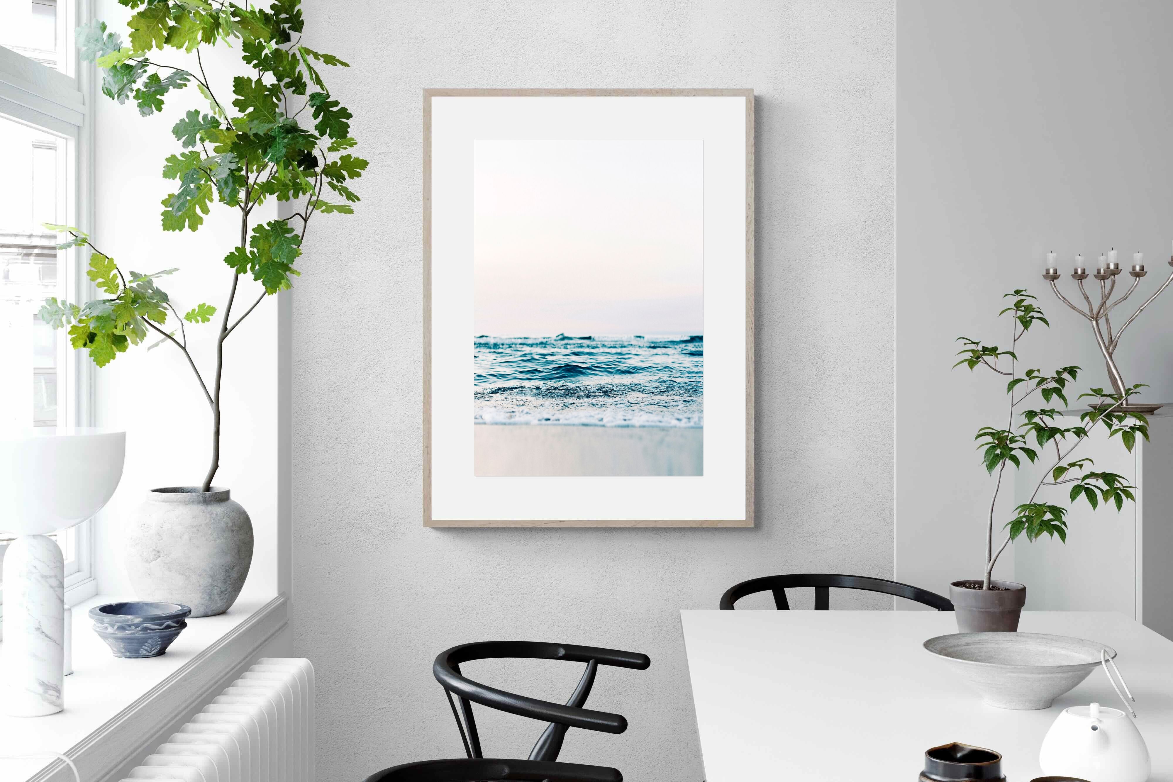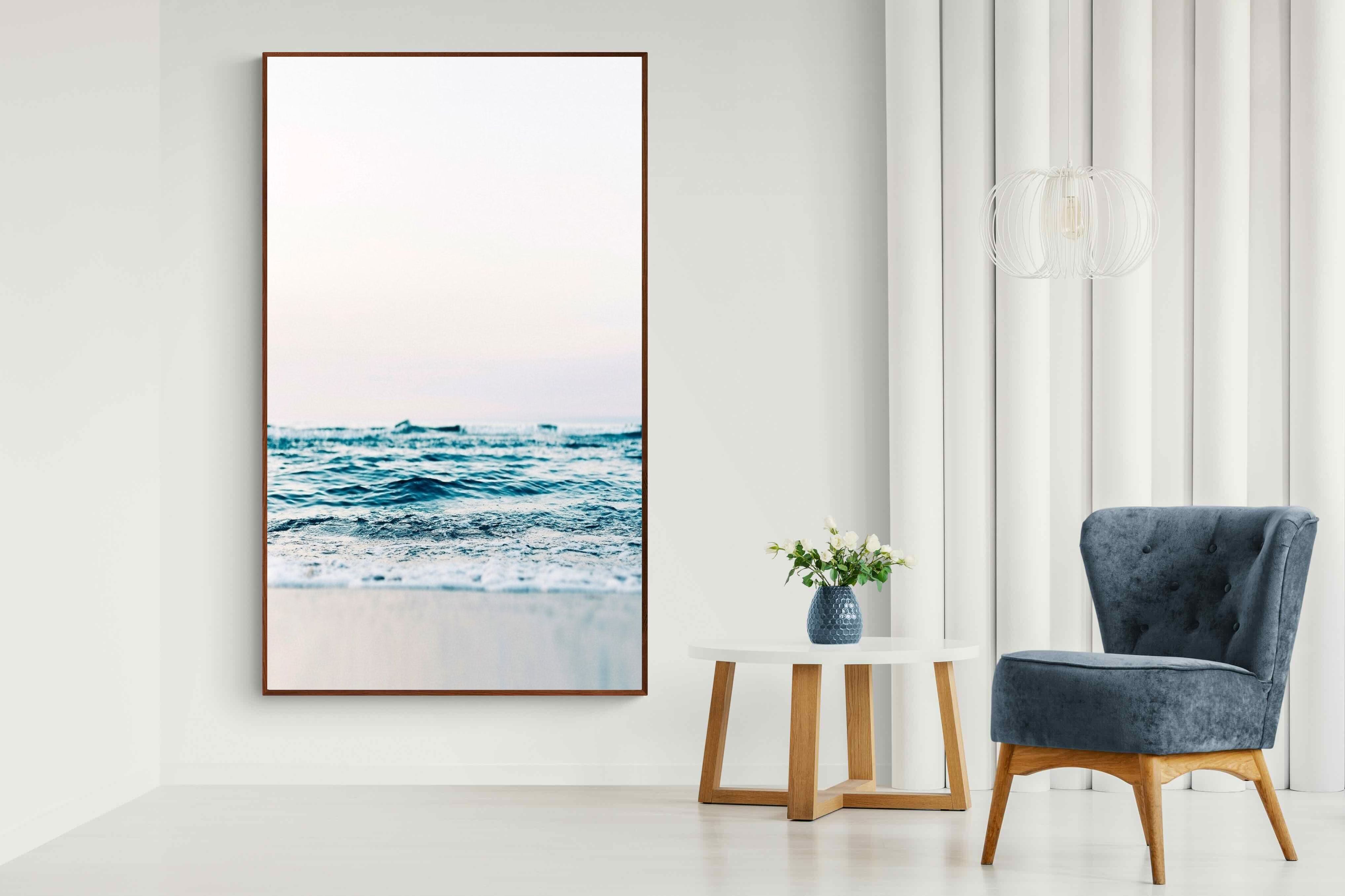 Capturing the gentle motion of ocean waves as they meet the shore, this piece highlights the timeless beauty of the sea. The subtle gradations of blues and whites symbolise peace and continuity, offering a soothing visual experience. Perfect for modern interiors, it brings a touch of nature indoors, enhancing the room's tranquility and elegance.