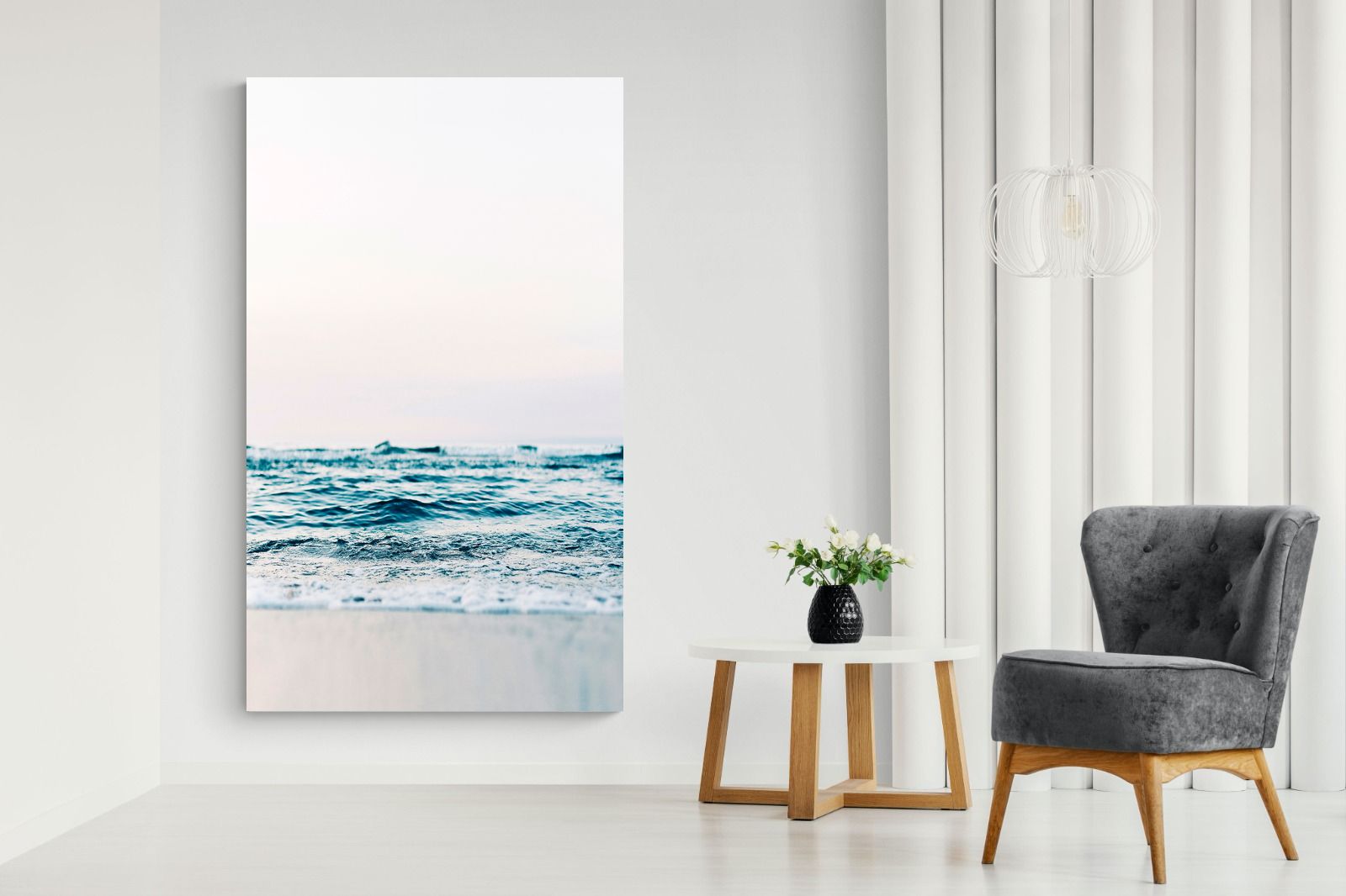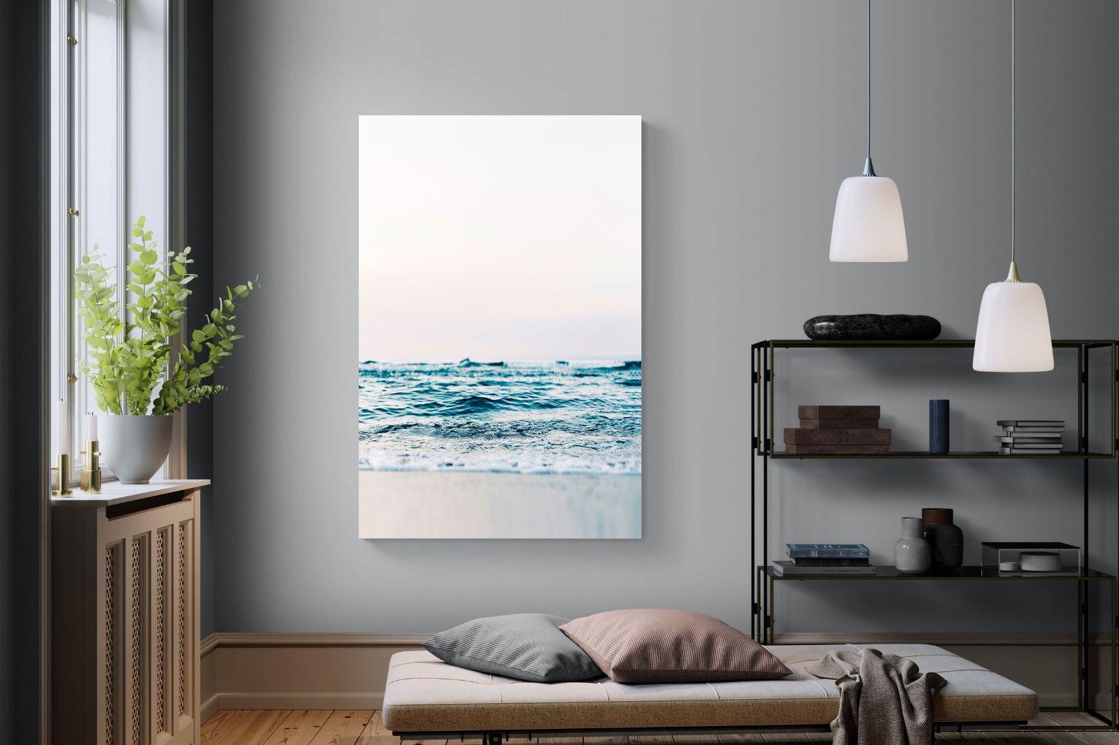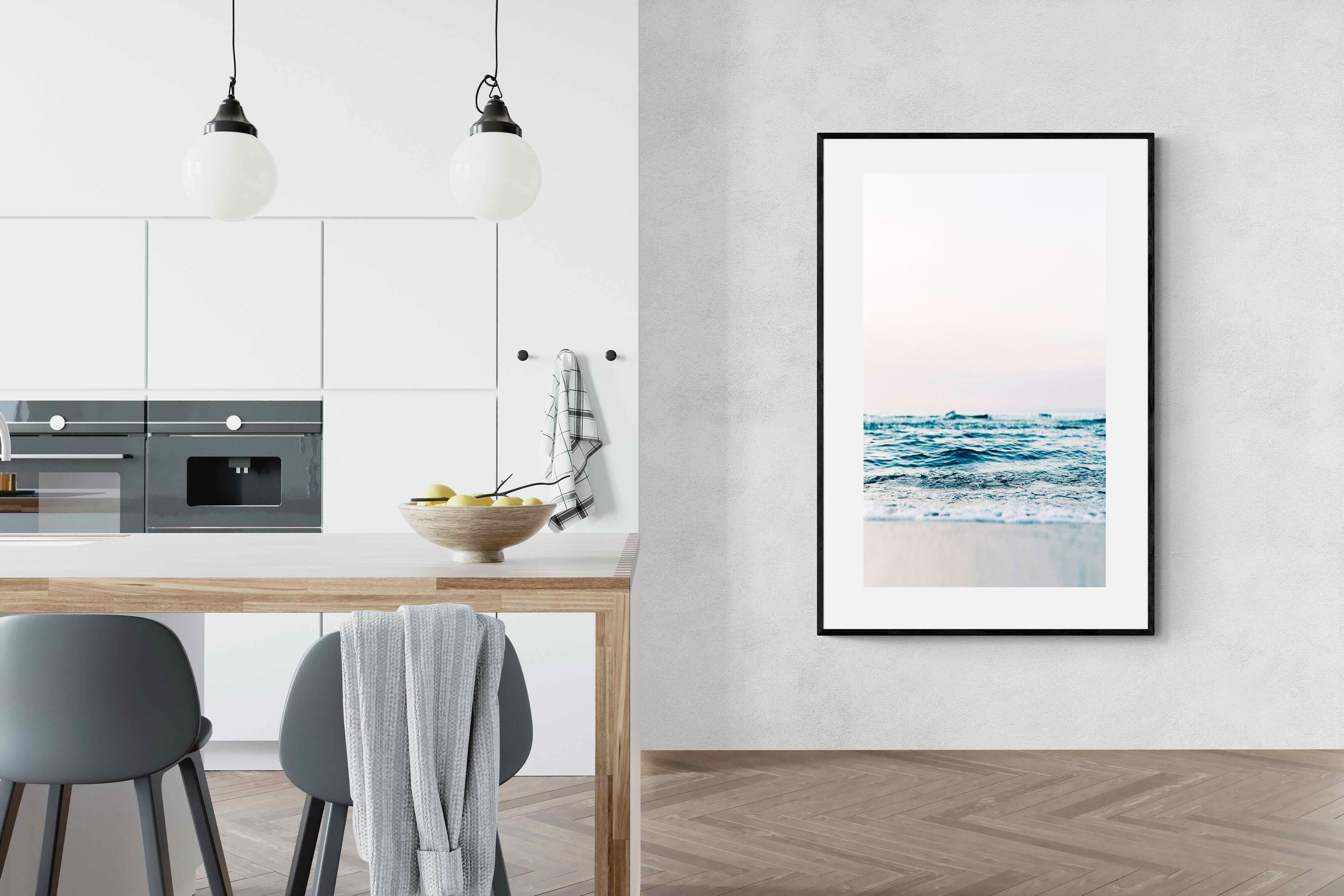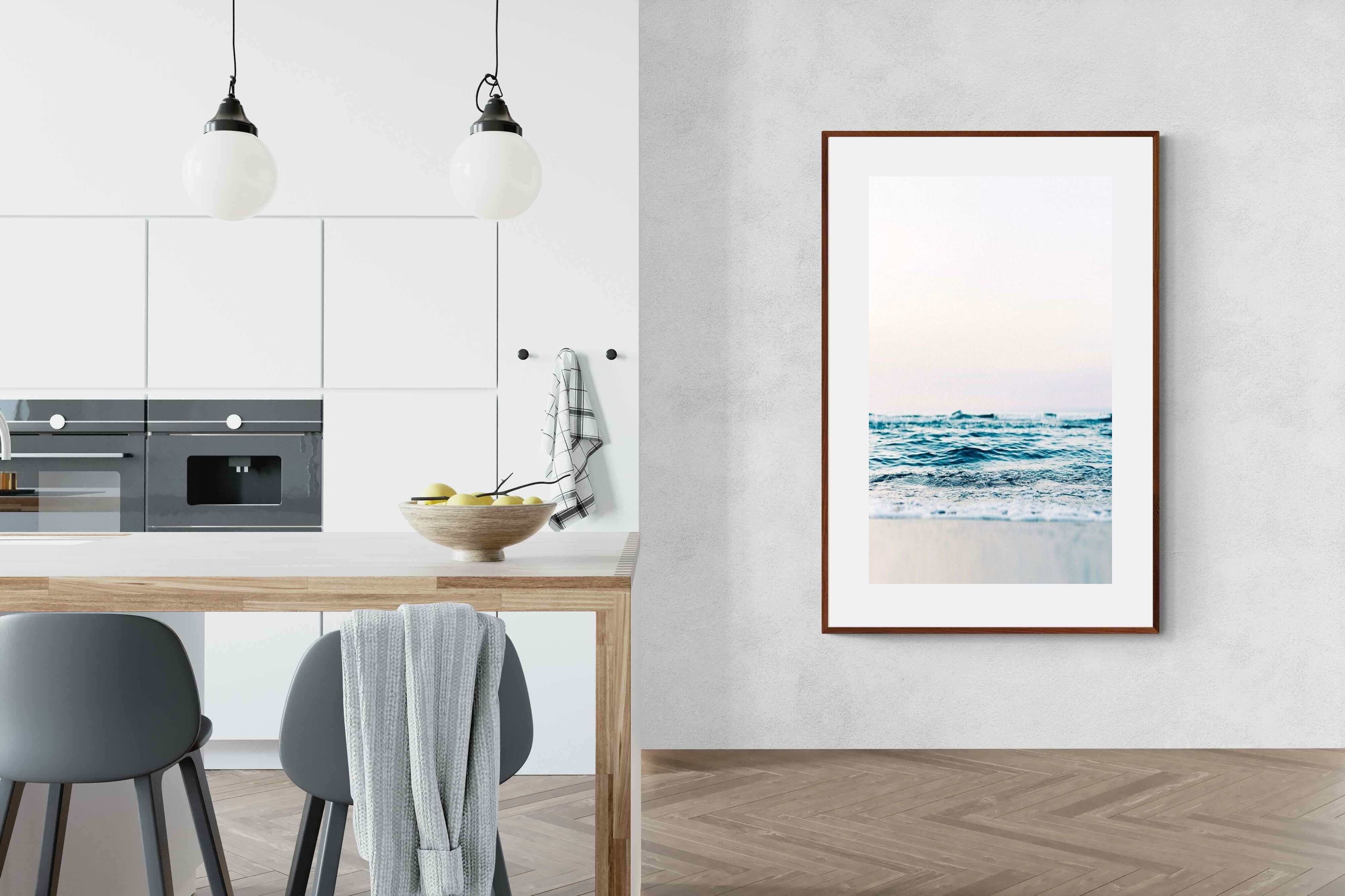 Capturing the gentle motion of ocean waves as they meet the shore, this piece highlights the timeless beauty of the sea. The subtle gradations of blues and whites symbolise peace and continuity, offering a soothing visual experience. Perfect for modern interiors, it brings a touch of nature indoors, enhancing the room's tranquility and elegance.