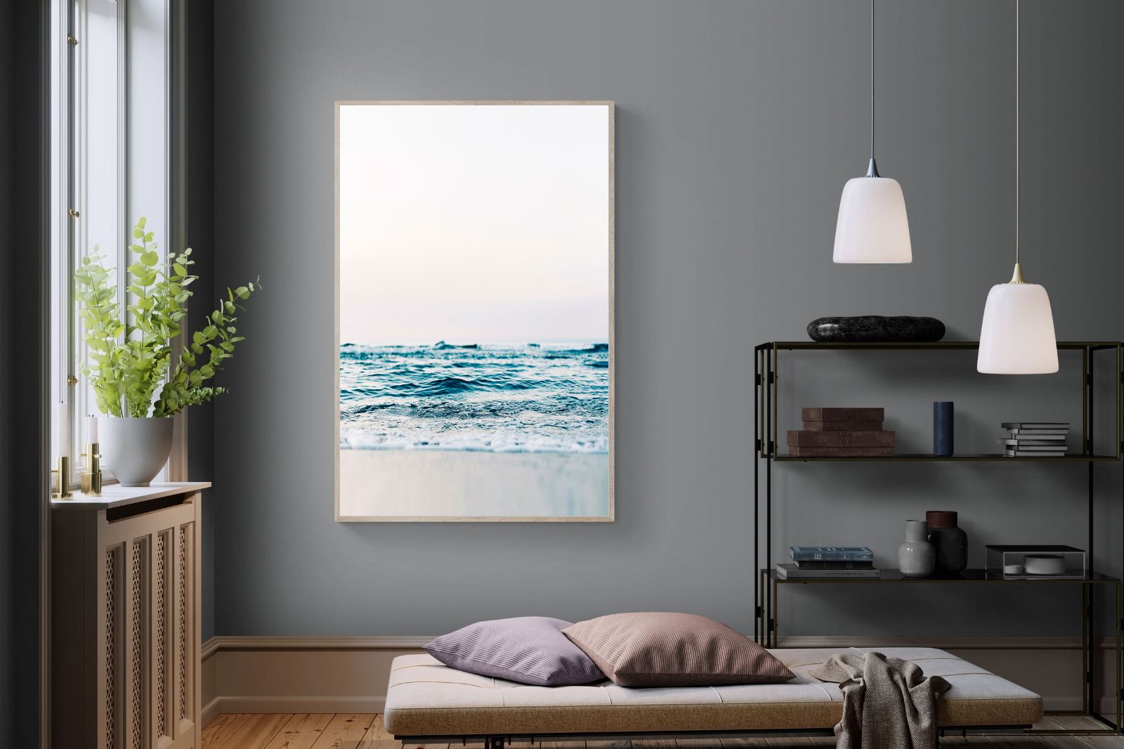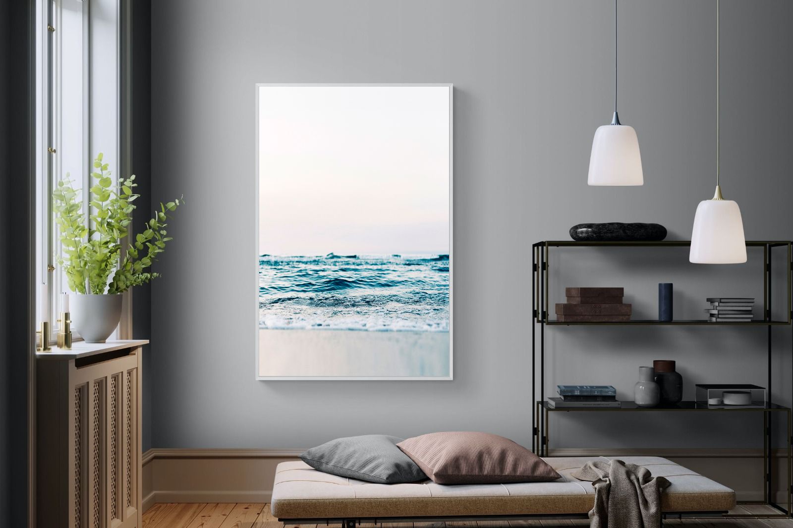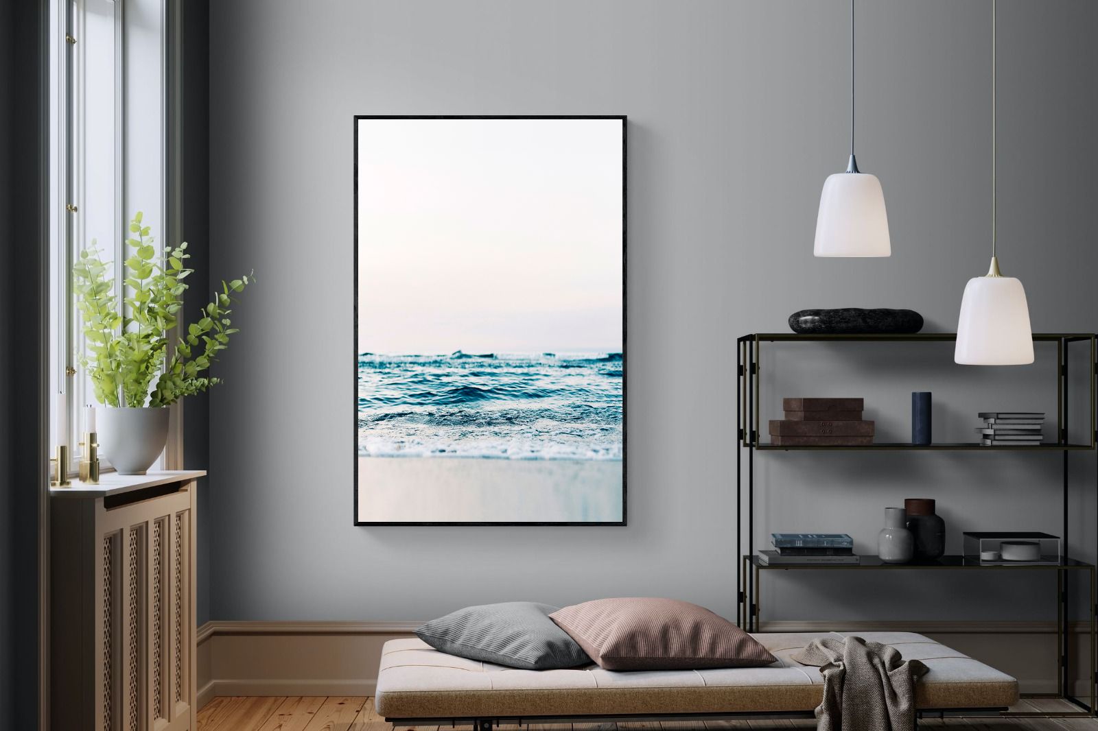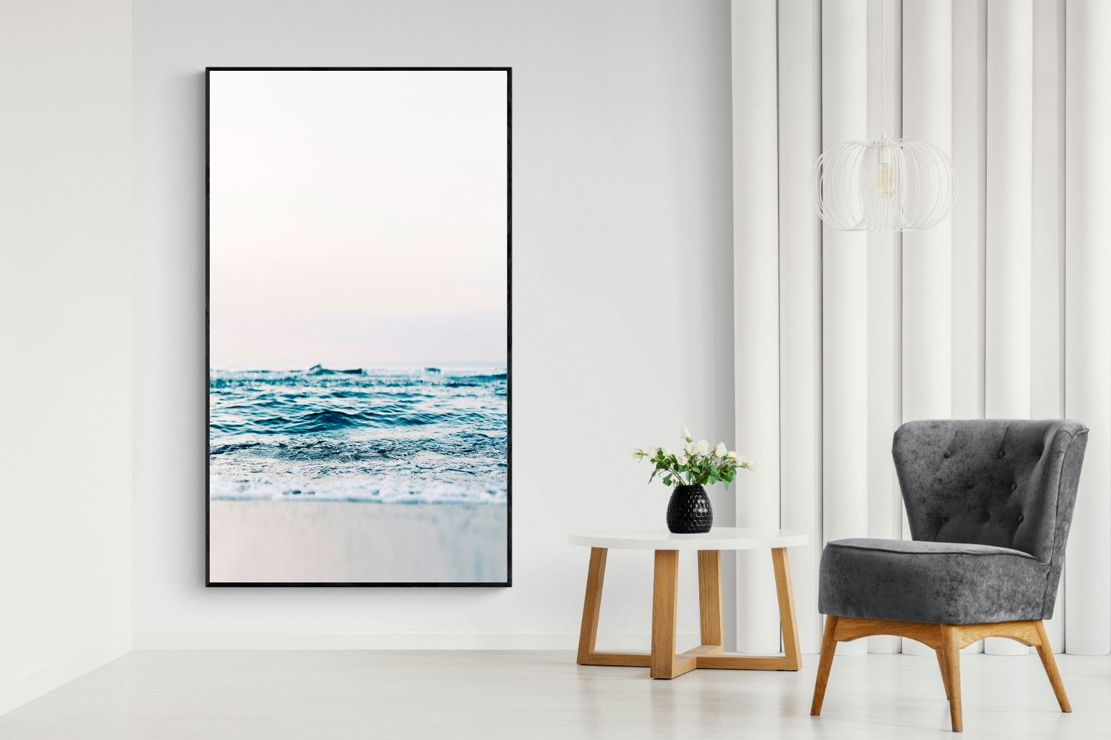 Capturing the gentle motion of ocean waves as they meet the shore, this piece highlights the timeless beauty of the sea. The subtle gradations of blues and whites symbolise peace and continuity, offering a soothing visual experience. Perfect for modern interiors, it brings a touch of nature indoors, enhancing the room's tranquility and elegance.